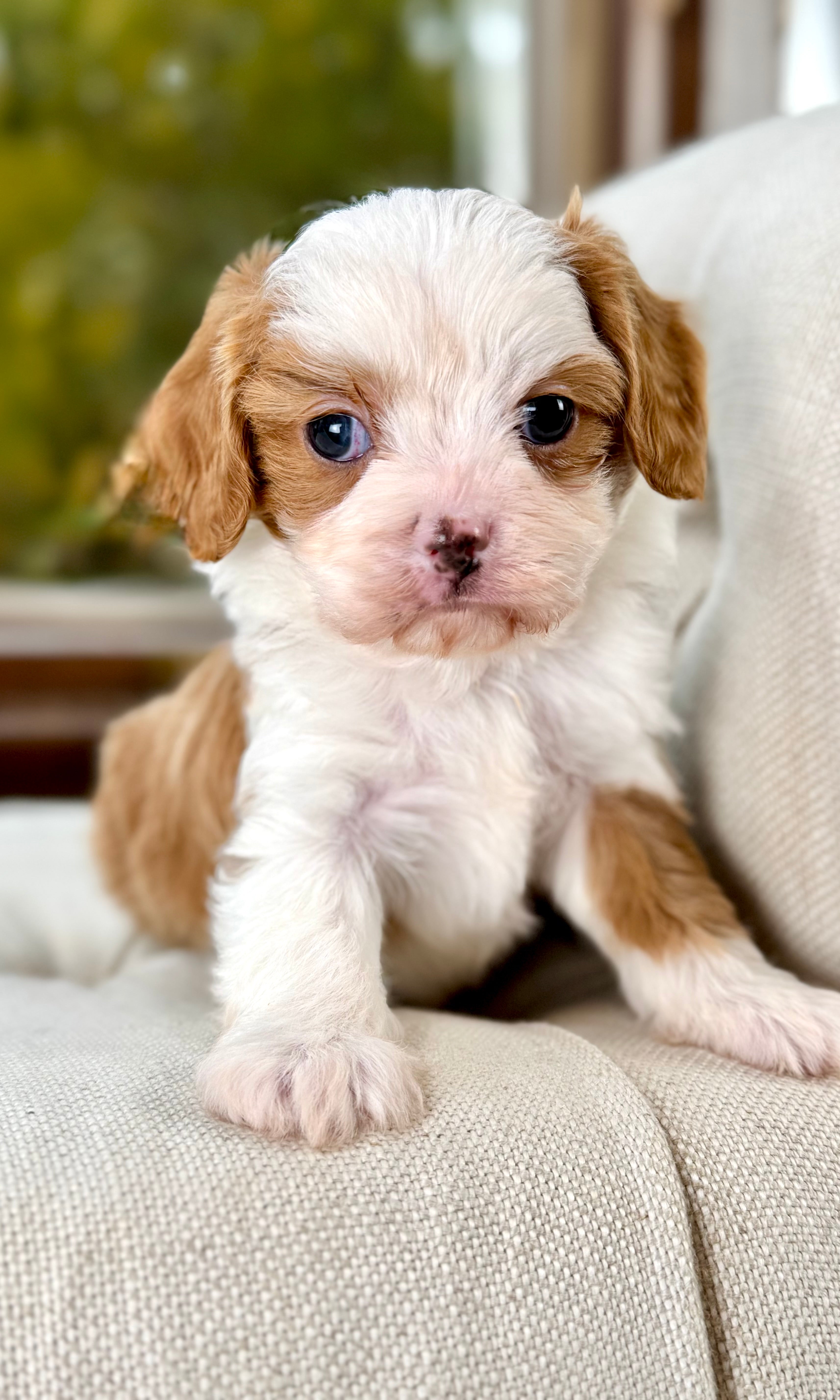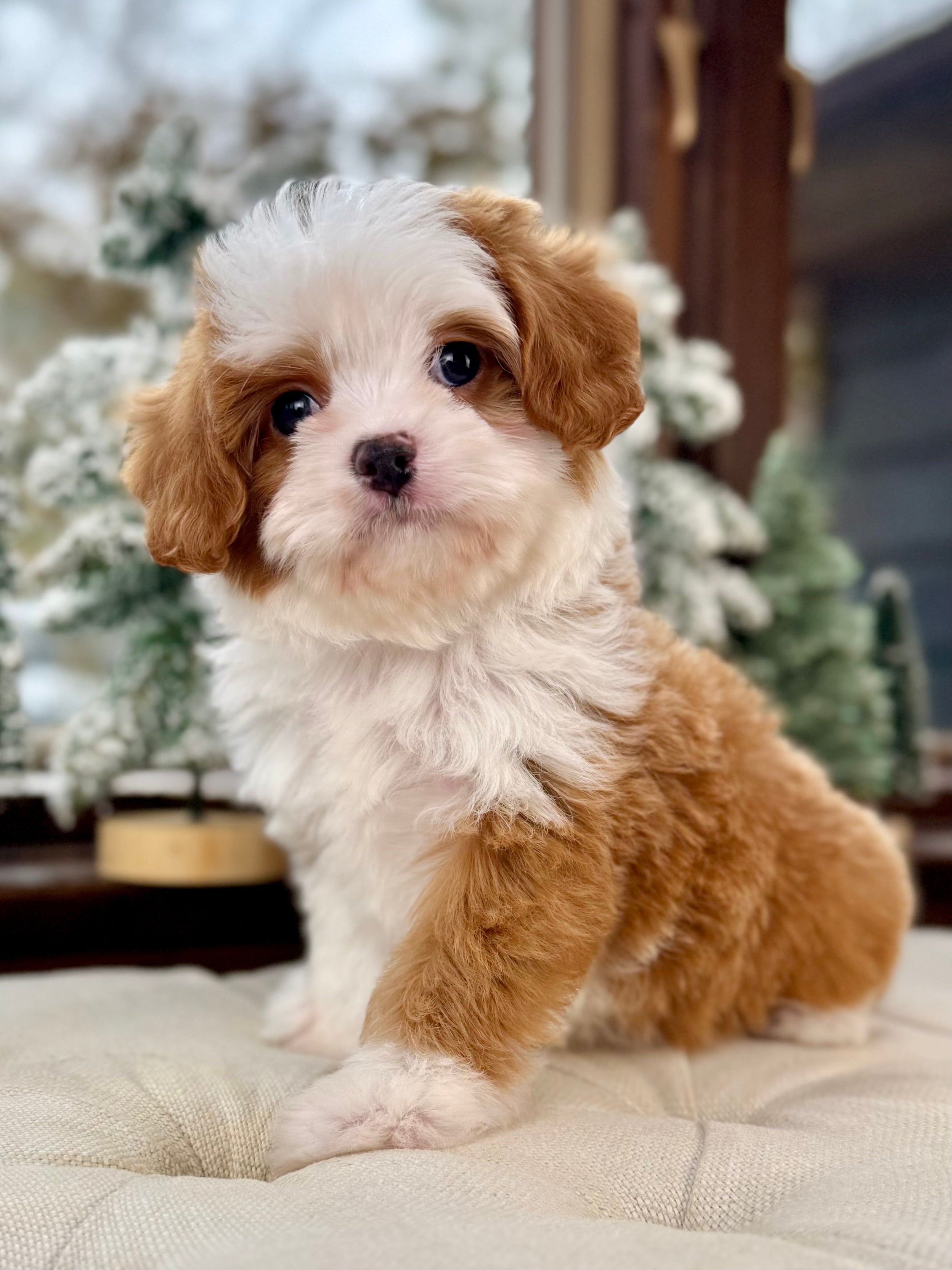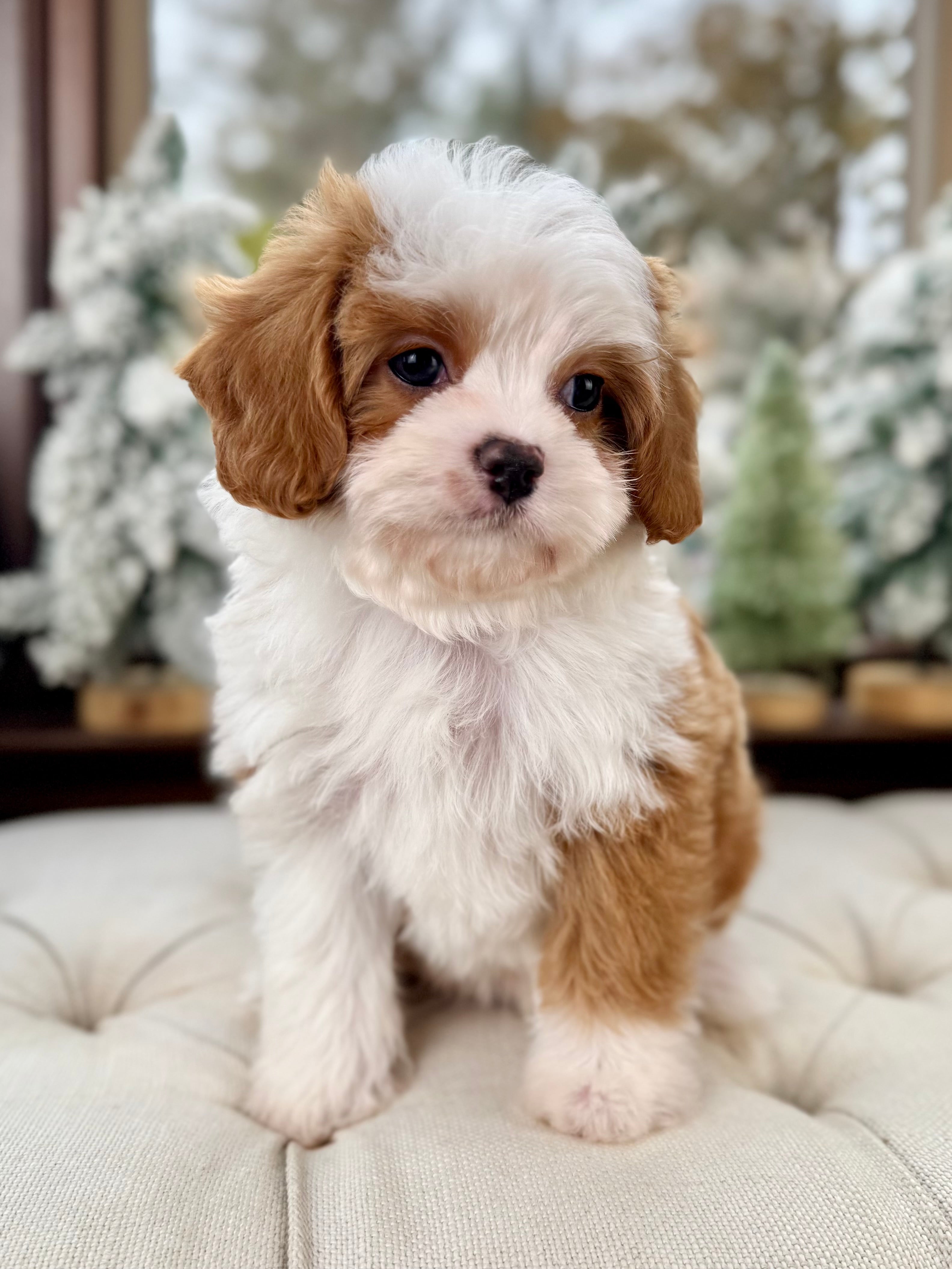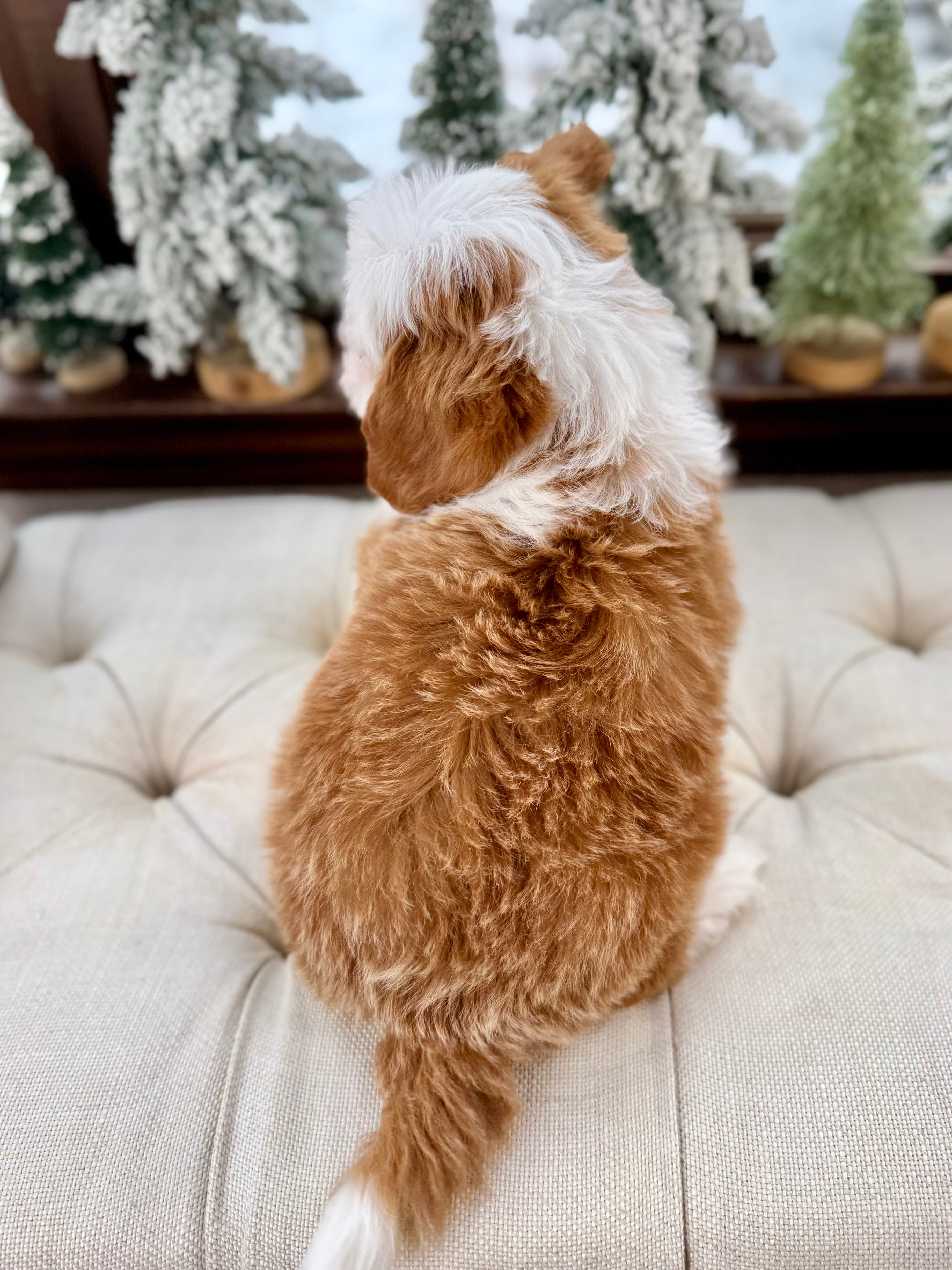 Acorn is 5 weeks, 2.1 lbs and growing. Acorn was born October 3rd and is ready to go home November 28 - December 1! Β  He has a beautiful red tuxedo wavy non-shedding coat. Acorn is a sweet natured little boy who is curious and learning to explore his world. Expected adult weight is 8-12 lbs full grown. The mother, Valentine, is a 14 lb King Charles Cavalier Spaniel, and the father, Bernard, is a 7 lb Miniature Poodel. Both parents have undergone genetic health testing to ensure healthy and strong puppies.