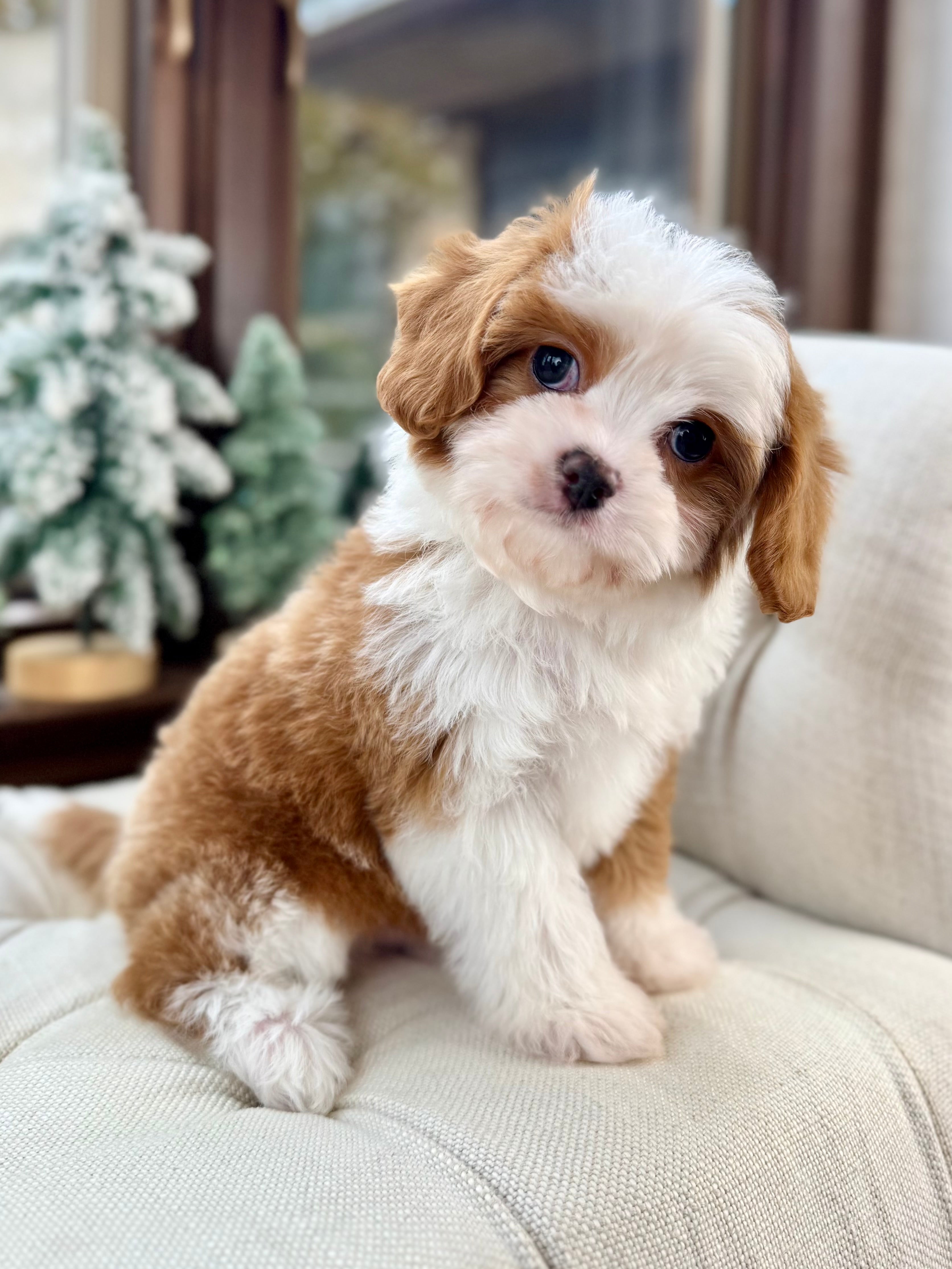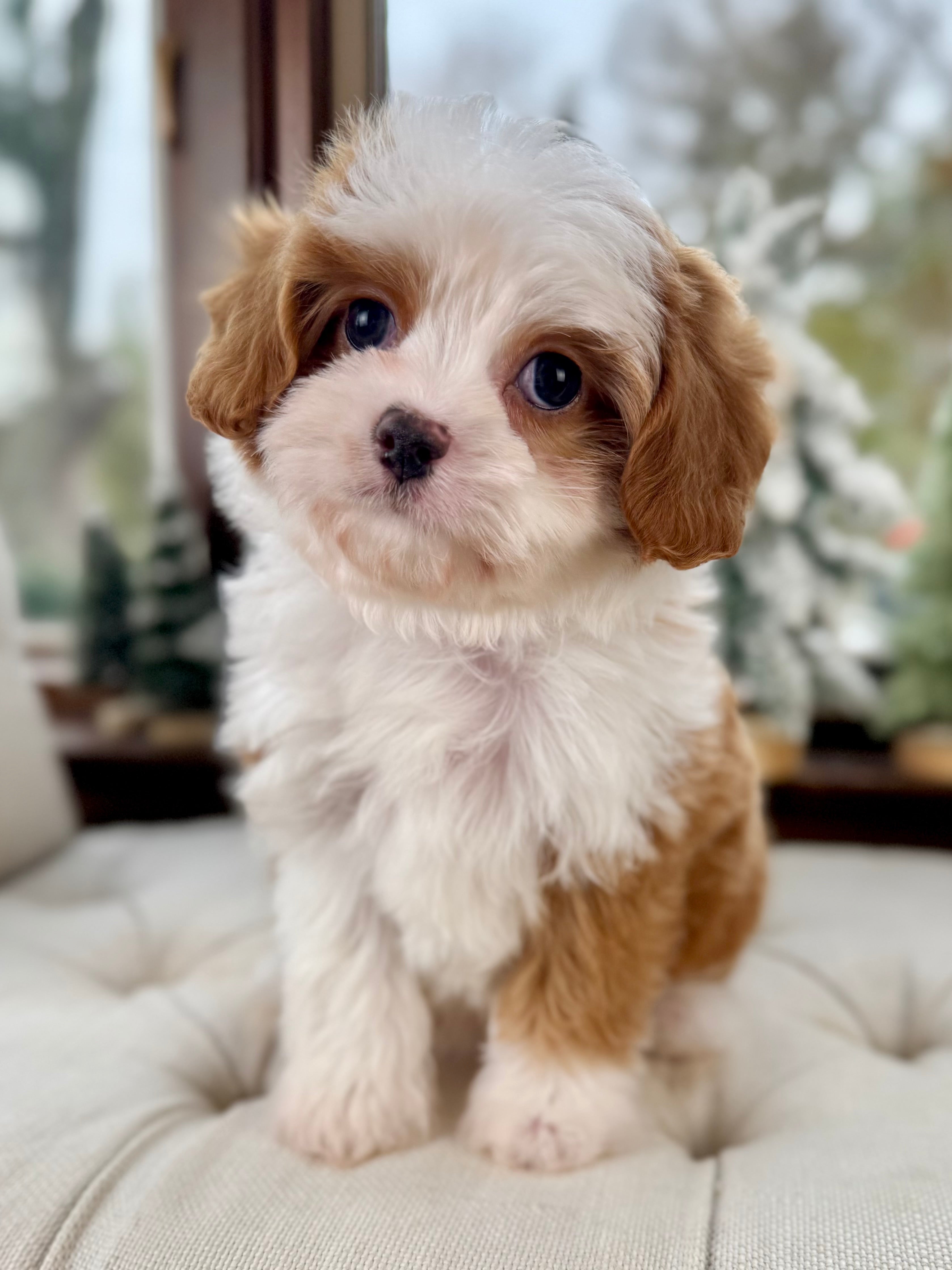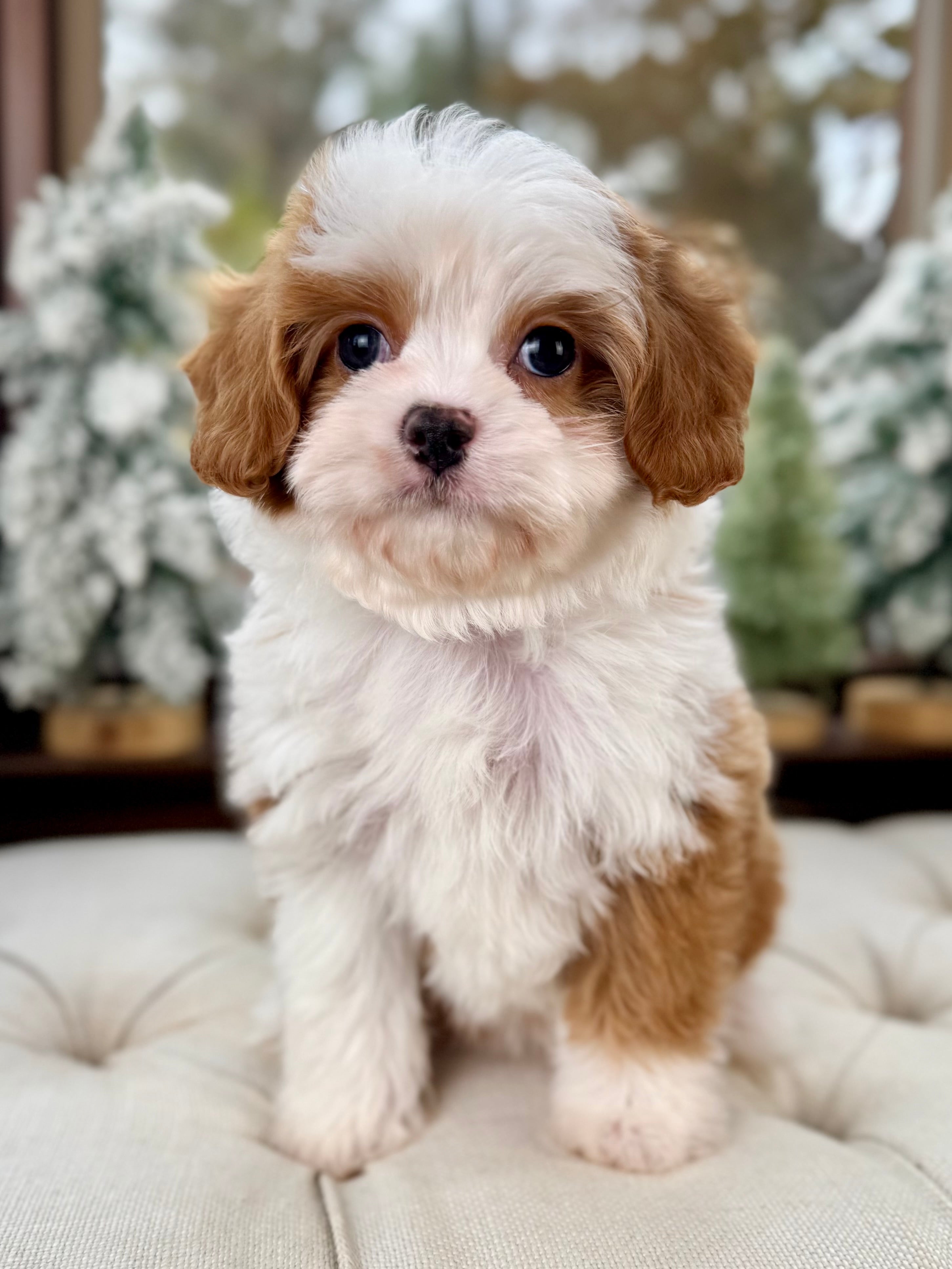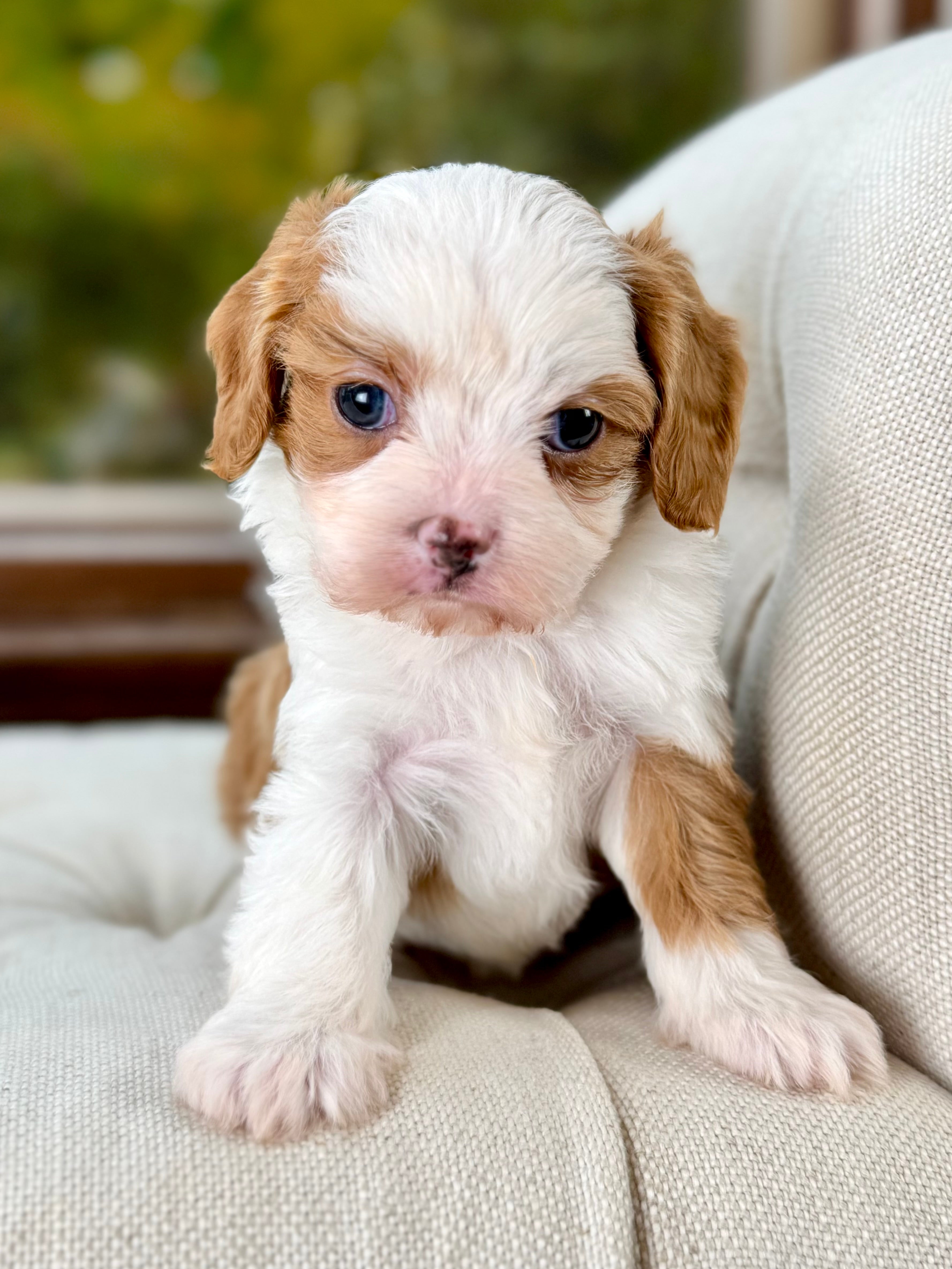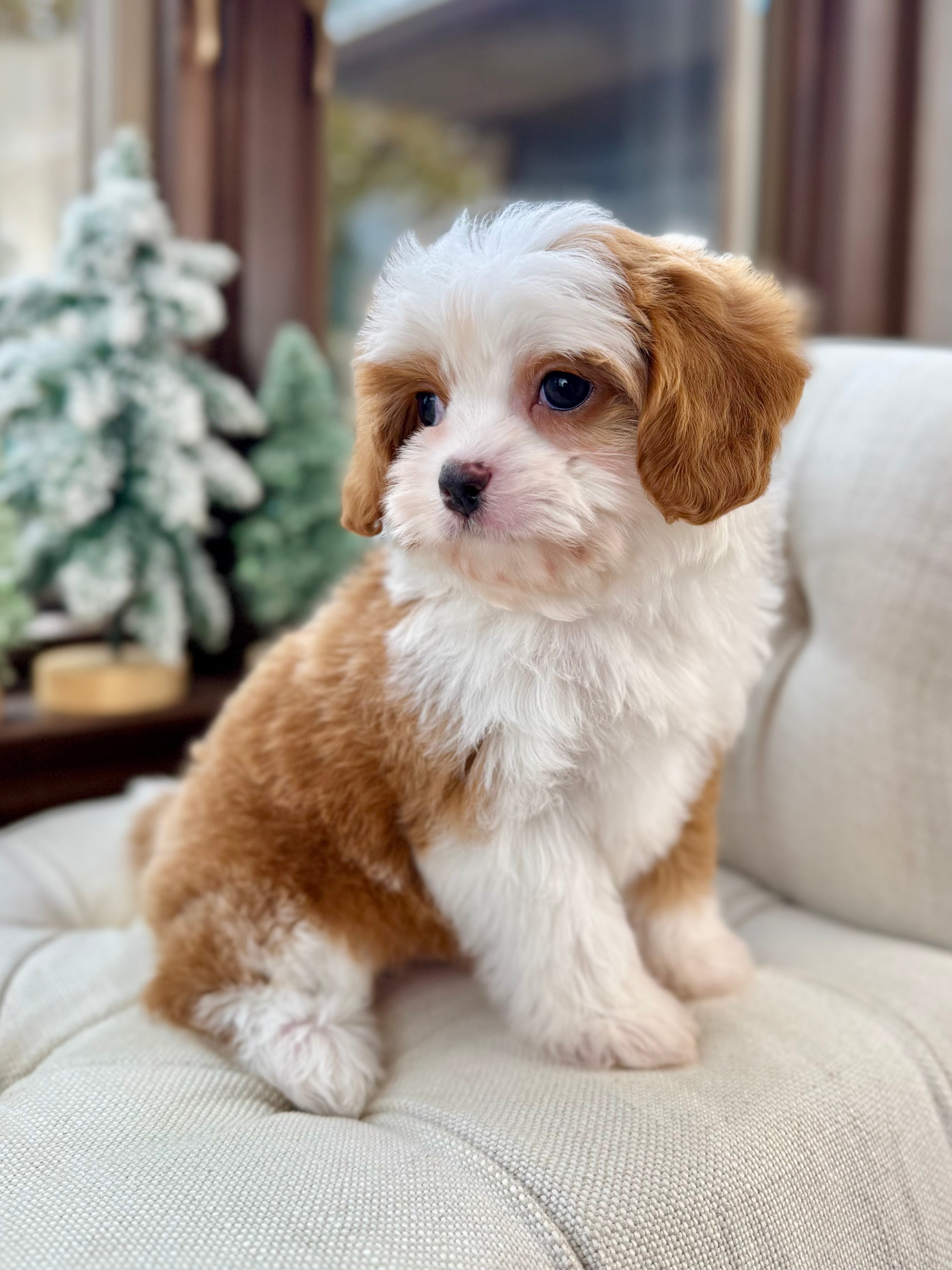 Acorn is 5 weeks, 2.1 lbs and growing. Acorn was born October 3rd and is ready to go home November 28 - December 1! Β  He has a beautiful red tuxedo wavy non-shedding coat. Acorn is a sweet natured little boy who is curious and learning to explore his world. Expected adult weight is 8-12 lbs full grown. The mother, Valentine, is a 14 lb King Charles Cavalier Spaniel, and the father, Bernard, is a 7 lb Miniature Poodel. Both parents have undergone genetic health testing to ensure healthy and strong puppies.