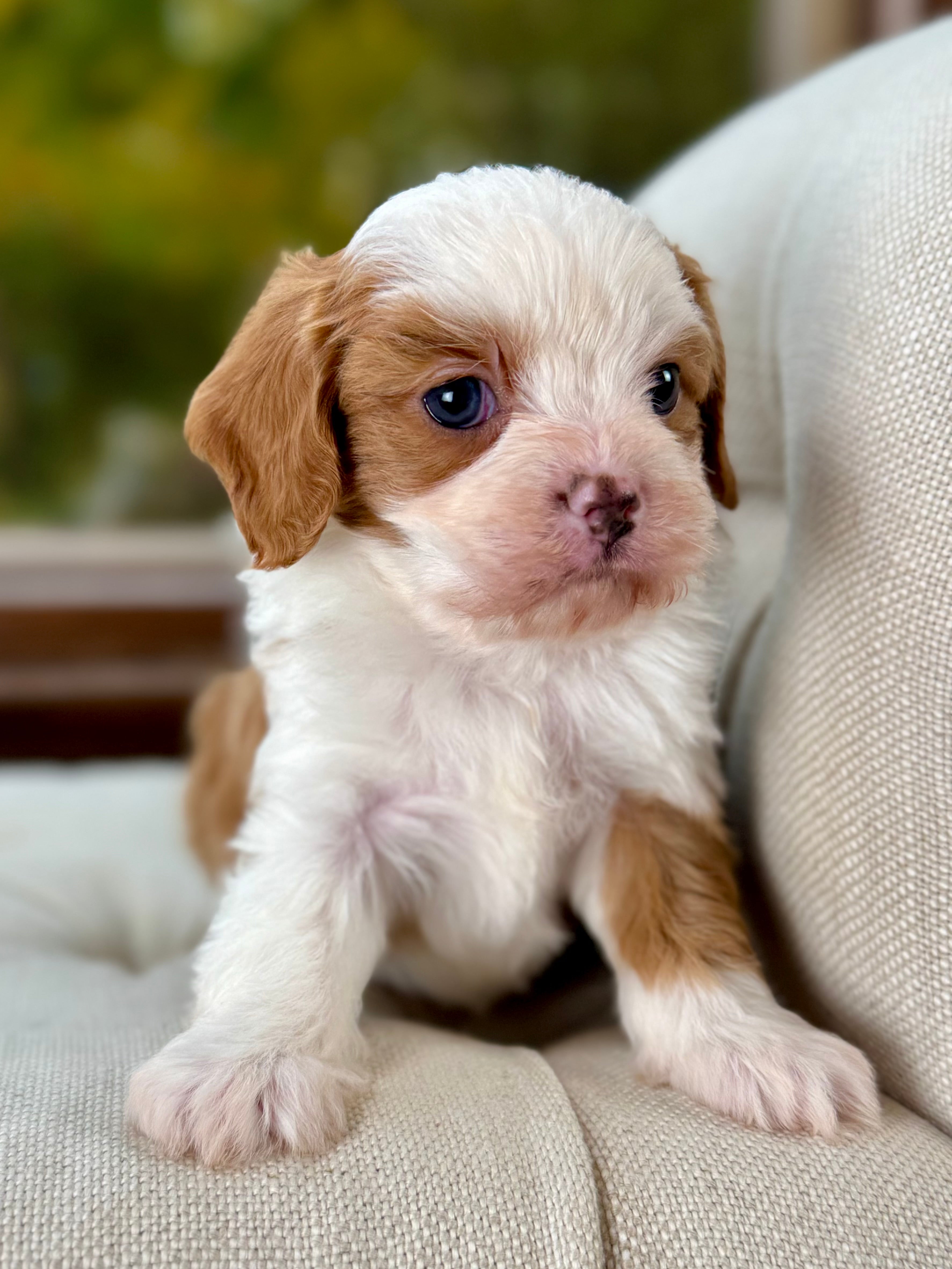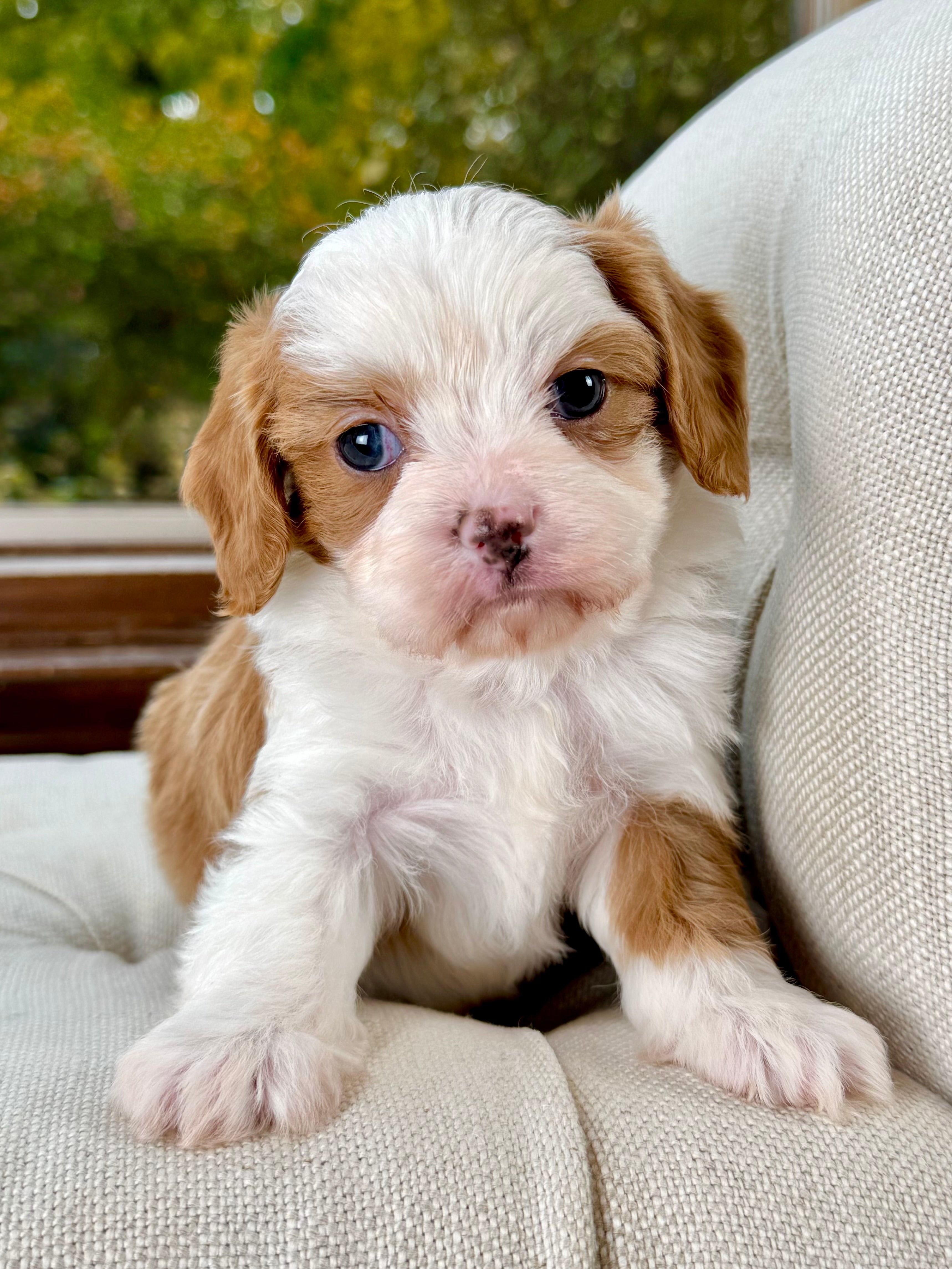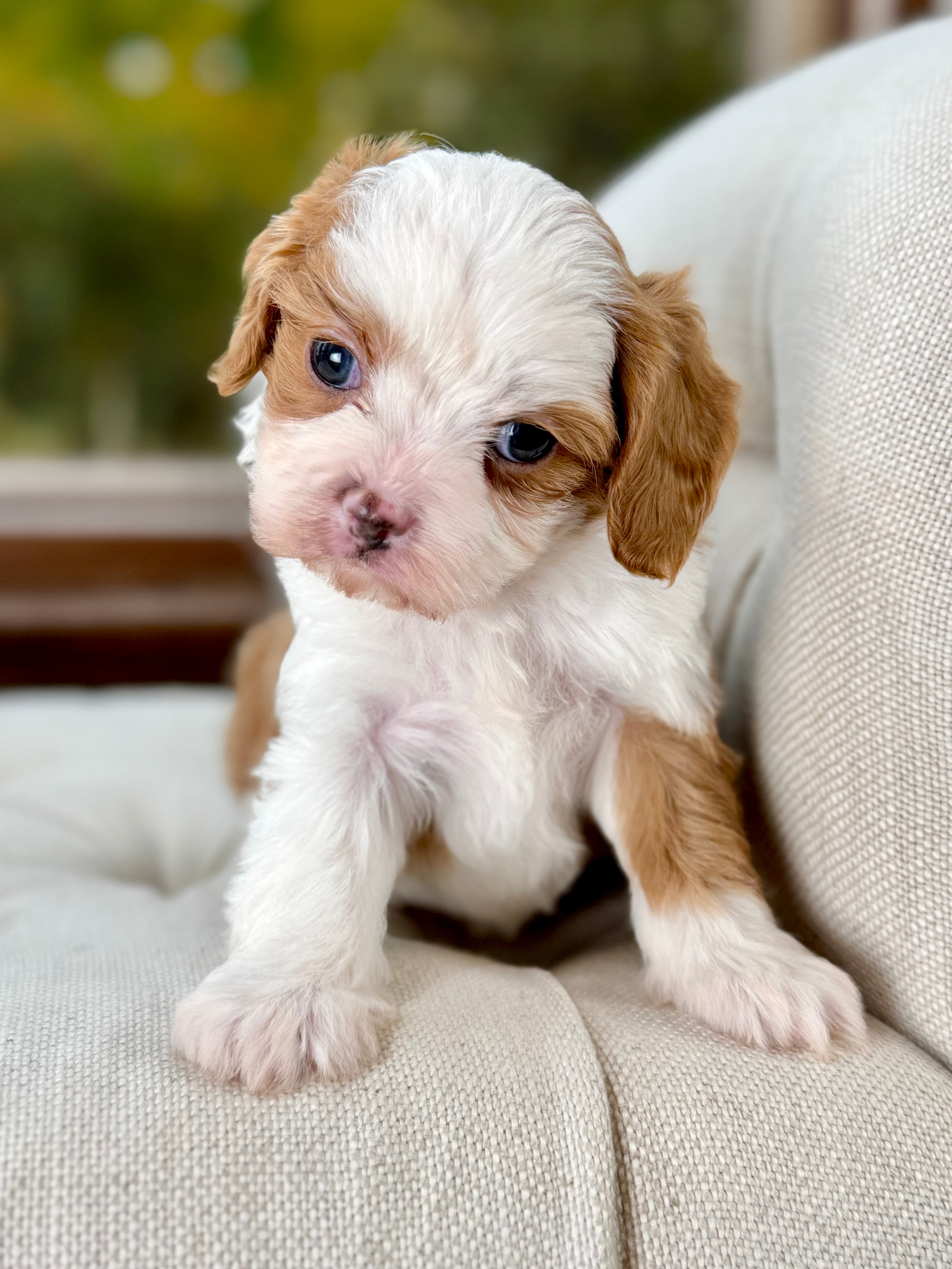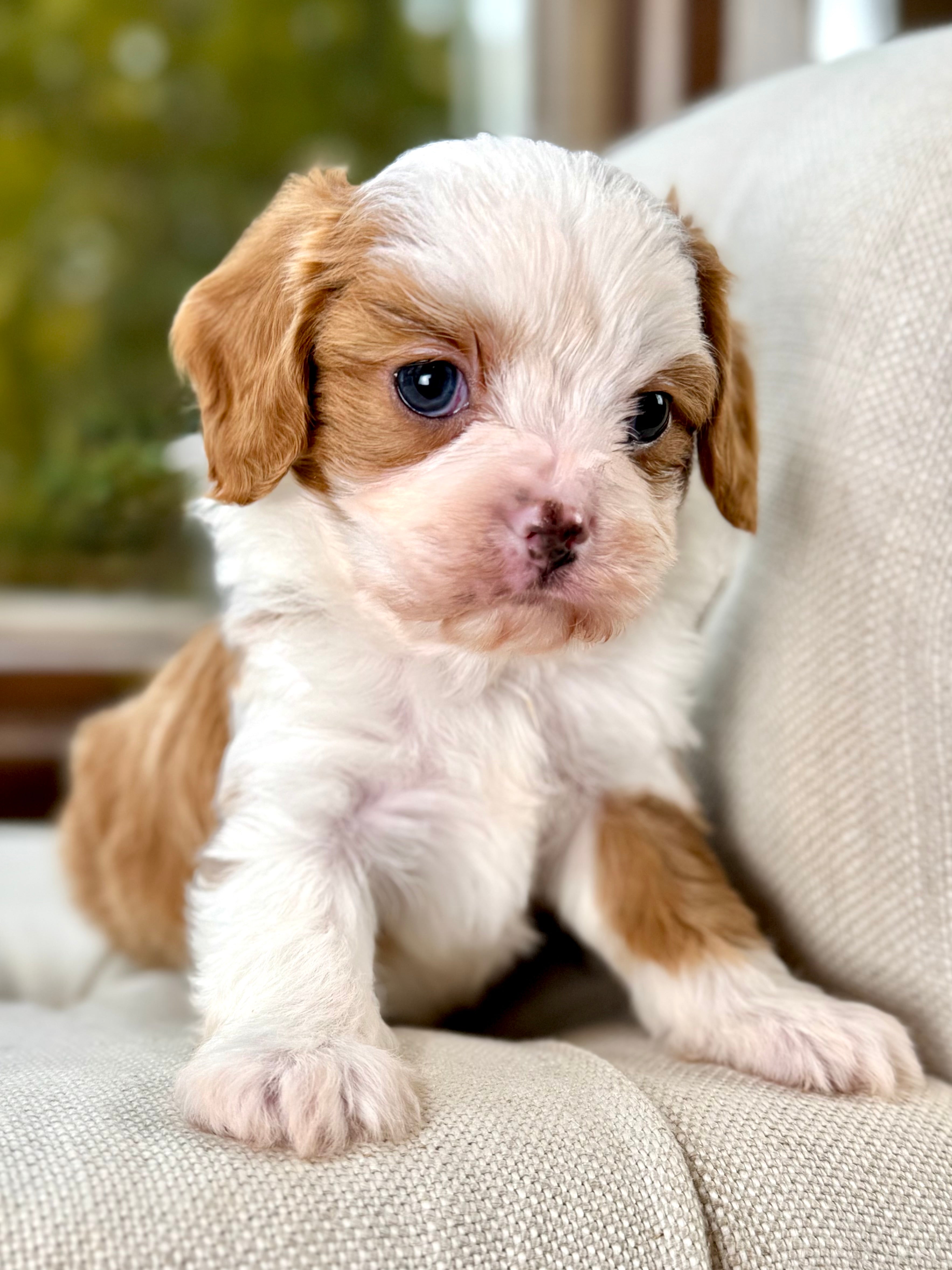 Acorn is 5 weeks, 2.1 lbs and growing. Acorn was born October 3rd and is ready to go home November 28 - December 1! Β  He has a beautiful red tuxedo wavy non-shedding coat. Acorn is a sweet natured little boy who is curious and learning to explore his world. Expected adult weight is 8-12 lbs full grown. The mother, Valentine, is a 14 lb King Charles Cavalier Spaniel, and the father, Bernard, is a 7 lb Miniature Poodel. Both parents have undergone genetic health testing to ensure healthy and strong puppies.