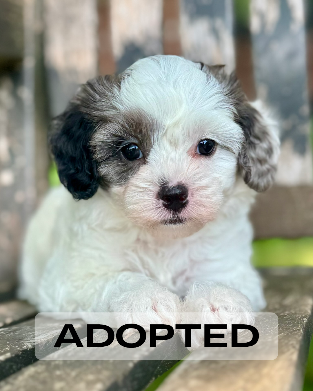 Alfie is 7 weeks, 2.6 lbs and growing. Β Alfie was born May 23rd and is ready to go home July 18th - 24th! He has a gorgeous wavy, non-shedding coat in a striking white Merle Parti pattern.Β Alfie is a calm, affectionate little boy with a gentle, human-focused nature. Heβs great with kids, loves to snuggle, and is growing more curious each day as he explores the world around him. Expected adult weight is 8-12 lbs full grown. The mother, Bambi, is a 14 lb redΒ Cavapoo, and the father, Bernard, is a 7 lb Merle Poodle. Both parents have undergone genetic health testing to ensure healthy and strong puppies.