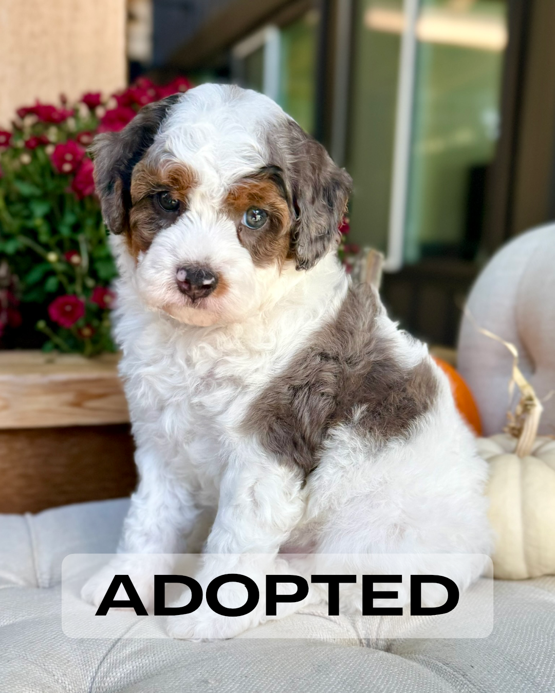 Arlo is a 7-week-old F1b Cavapoo with a soft, Blue Merle Tri curly coat and a calm, affectionate personality. He’s a happy little boy who enjoys exploring his surroundings but is always content to settle in for cuddles. Born on August 19th and currently weighing 4.7 lbs, Arlo is expected to be 14–20 lbs full grown. His mom, Mya, is a 14 lb Poodle and his dad, Theodore, is a 18 lb Cavapoo—both genetically health tested to ensure strong, healthy puppies.