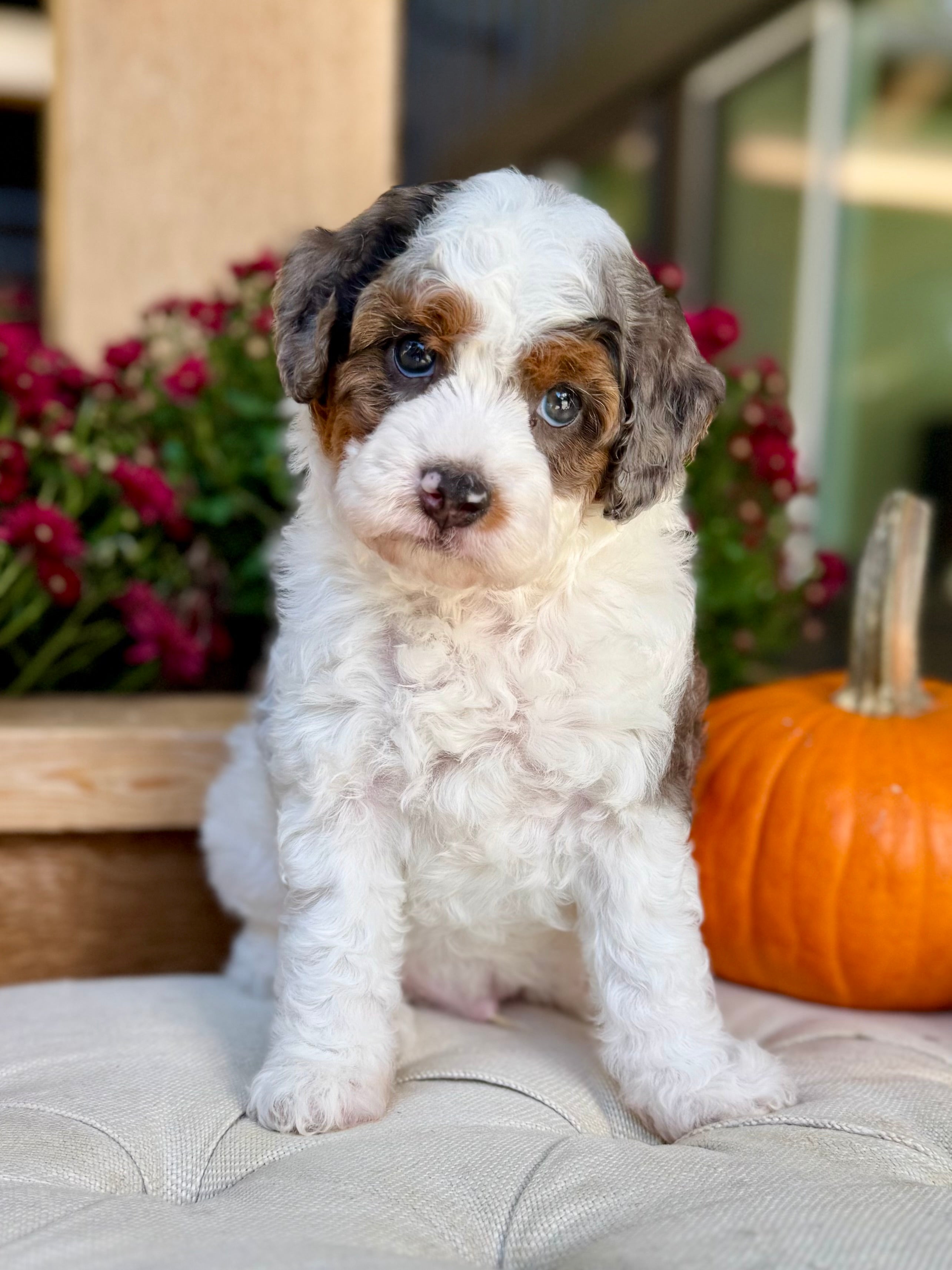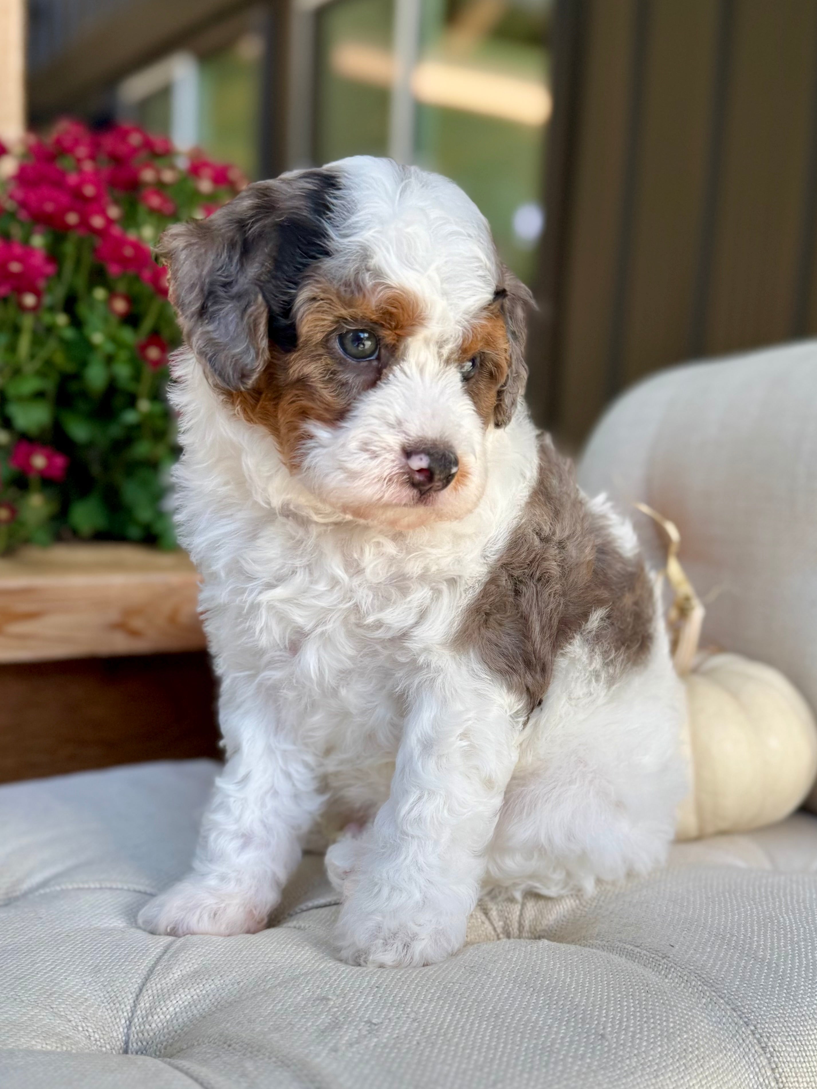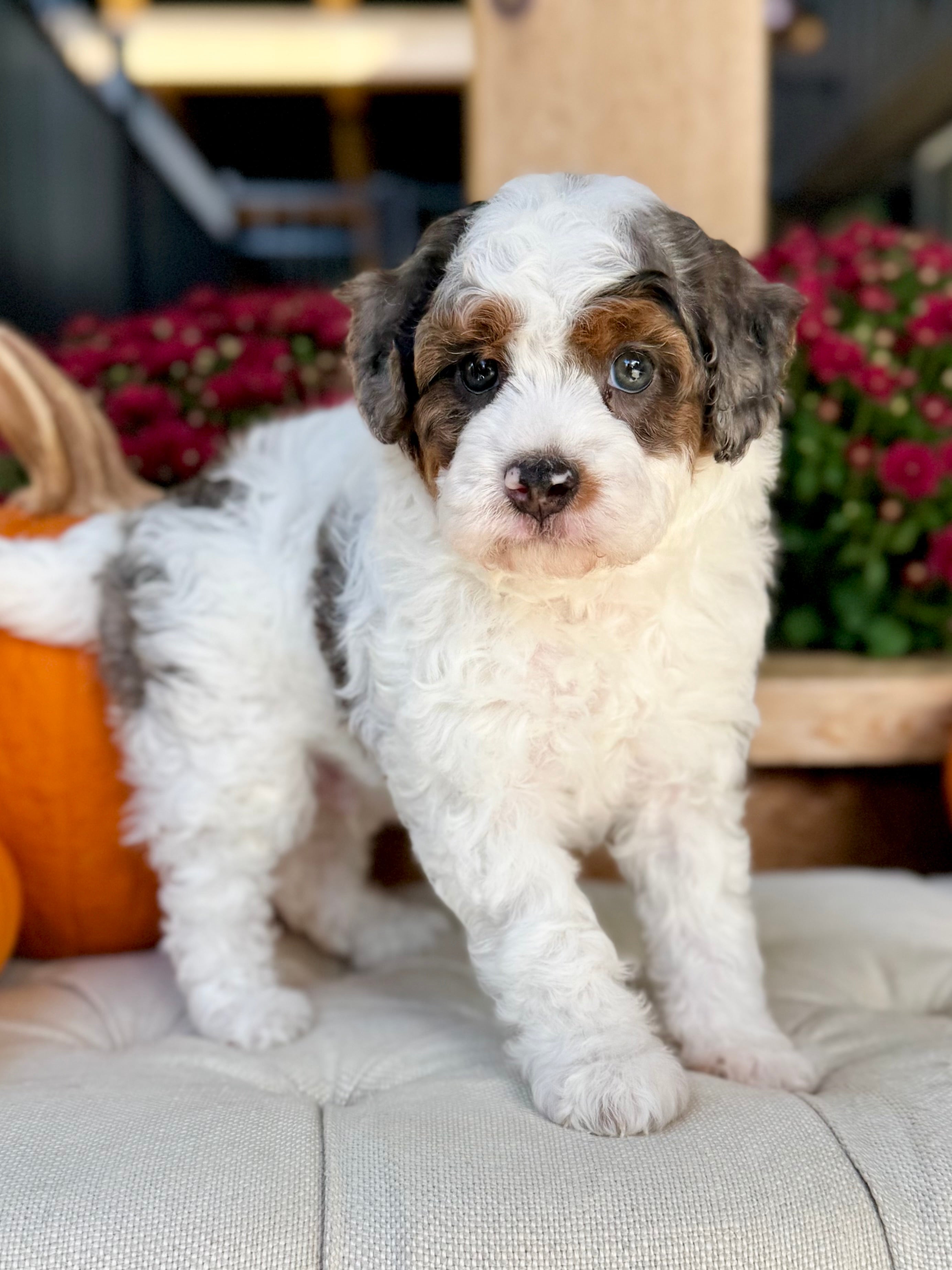 Arlo is a 7-week-old F1b Cavapoo with a soft, Blue Merle Tri curly coat and a calm, affectionate personality. He’s a happy little boy who enjoys exploring his surroundings but is always content to settle in for cuddles. Born on August 19th and currently weighing 4.7 lbs, Arlo is expected to be 14–18 lbs full grown. His mom, Mya, is a 14 lb Poodle and his dad, Theodore, is a 18 lb Cavapoo—both genetically health tested to ensure strong, healthy puppies.
