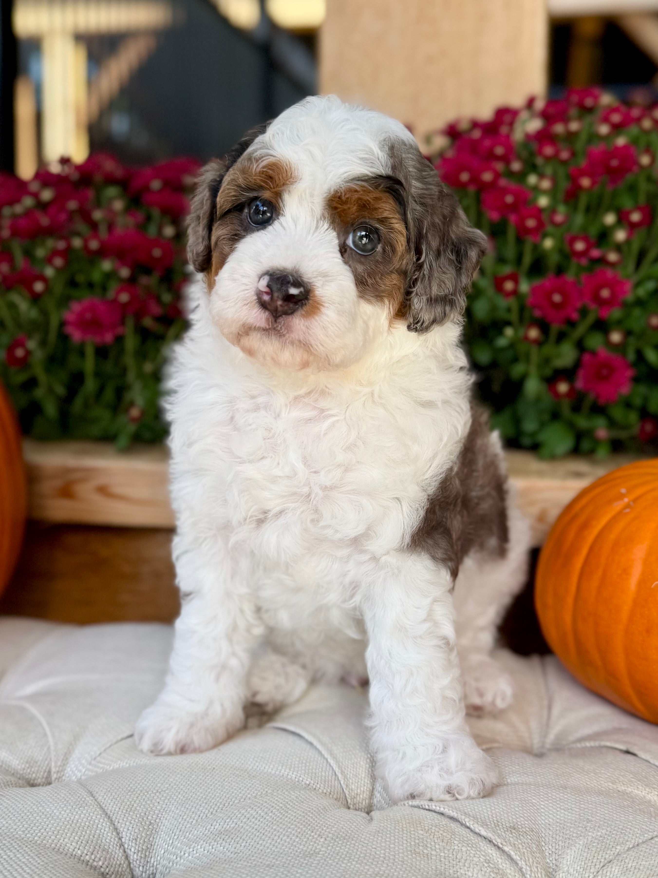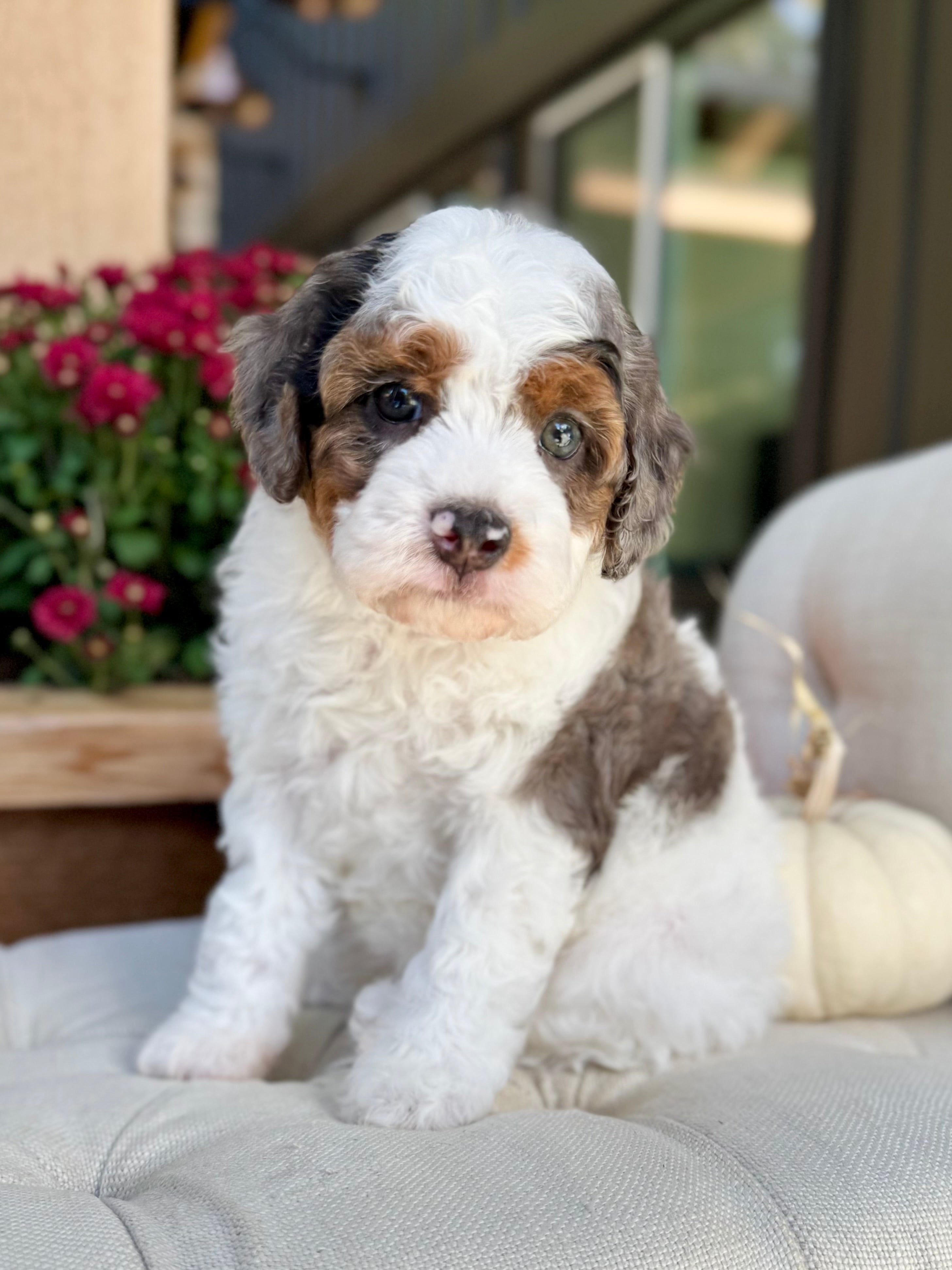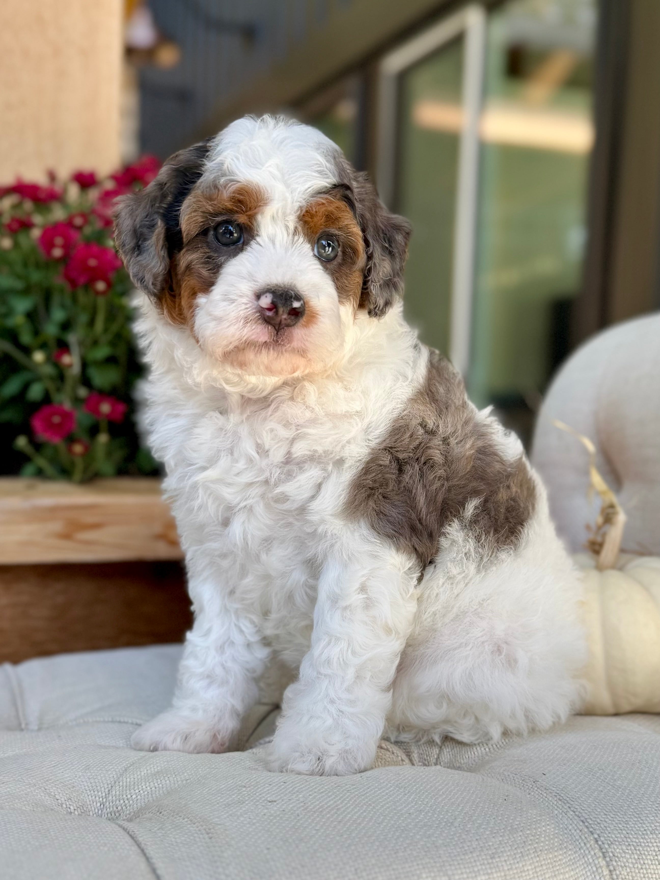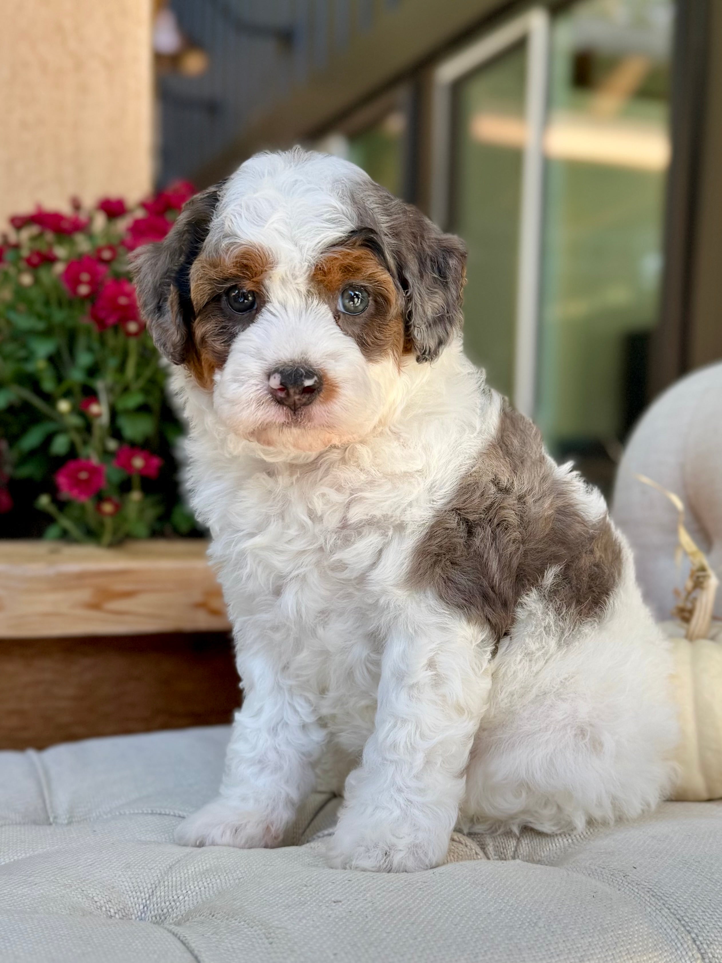 Arlo is a 7-week-old F1b Cavapoo with a soft, Blue Merle Tri curly coat and a calm, affectionate personality. He’s a happy little boy who enjoys exploring his surroundings but is always content to settle in for cuddles. Born on August 19th and currently weighing 4.7 lbs, Arlo is expected to be 14–18 lbs full grown. His mom, Mya, is a 14 lb Poodle and his dad, Theodore, is a 18 lb Cavapoo—both genetically health tested to ensure strong, healthy puppies.