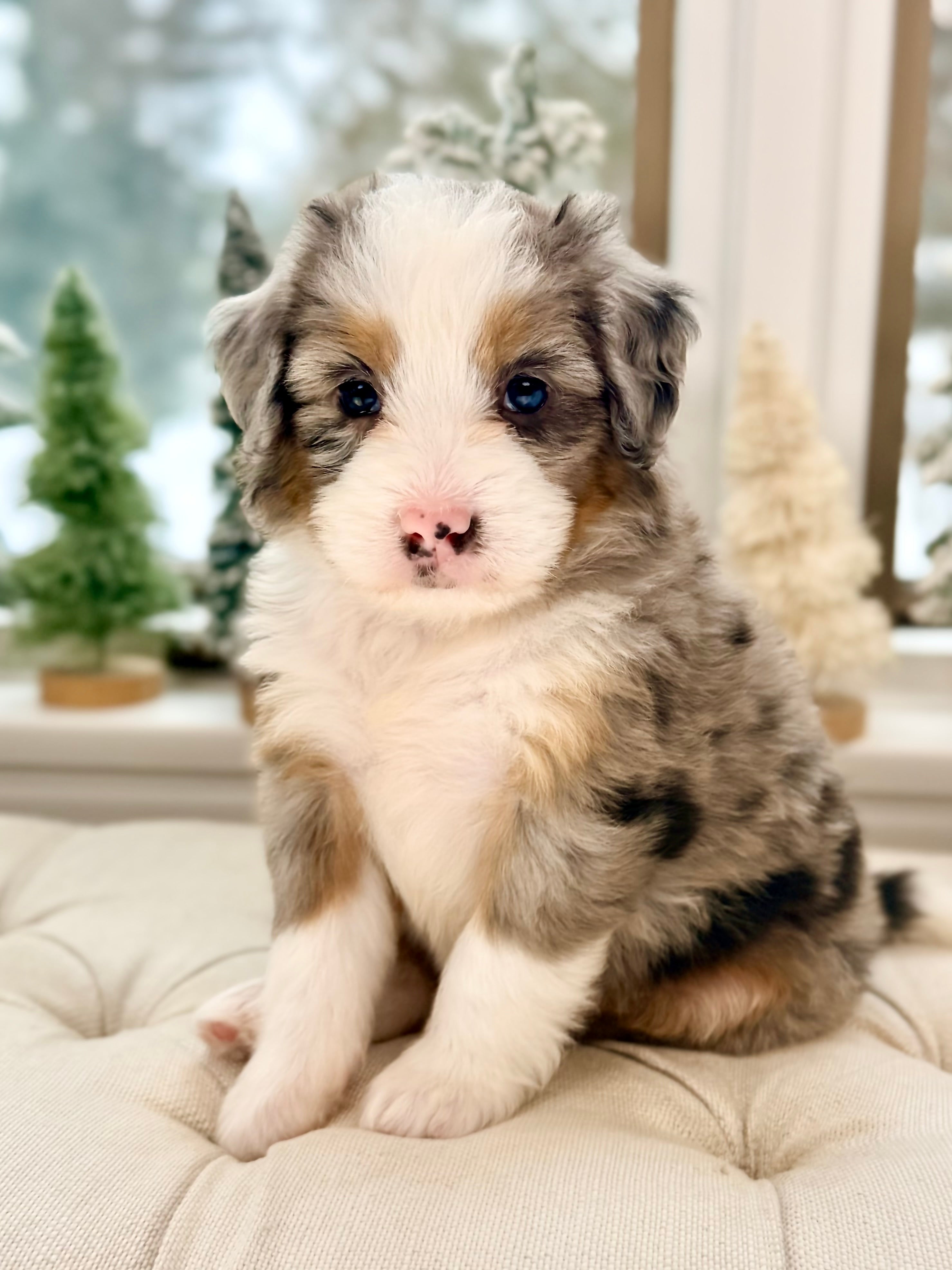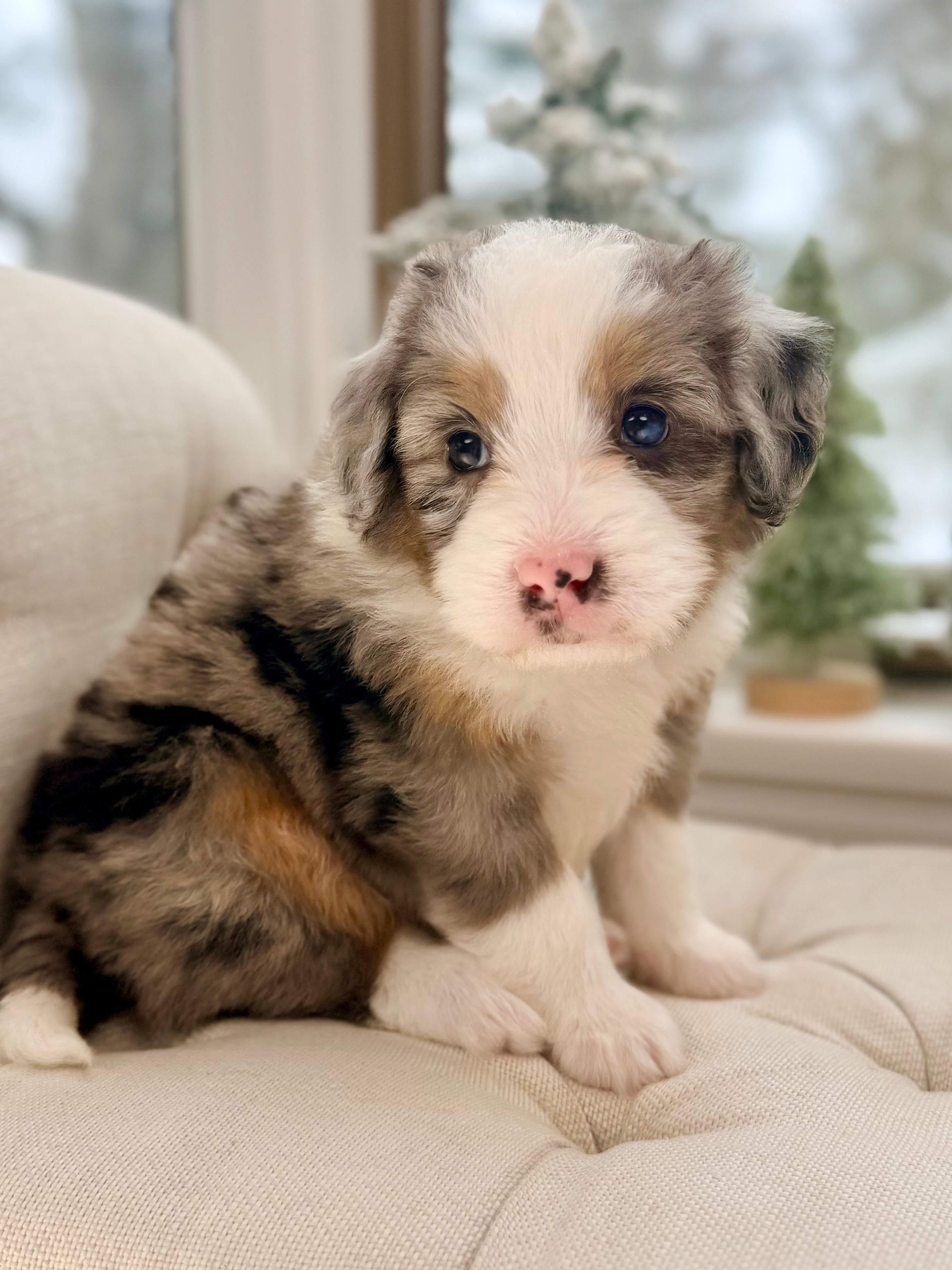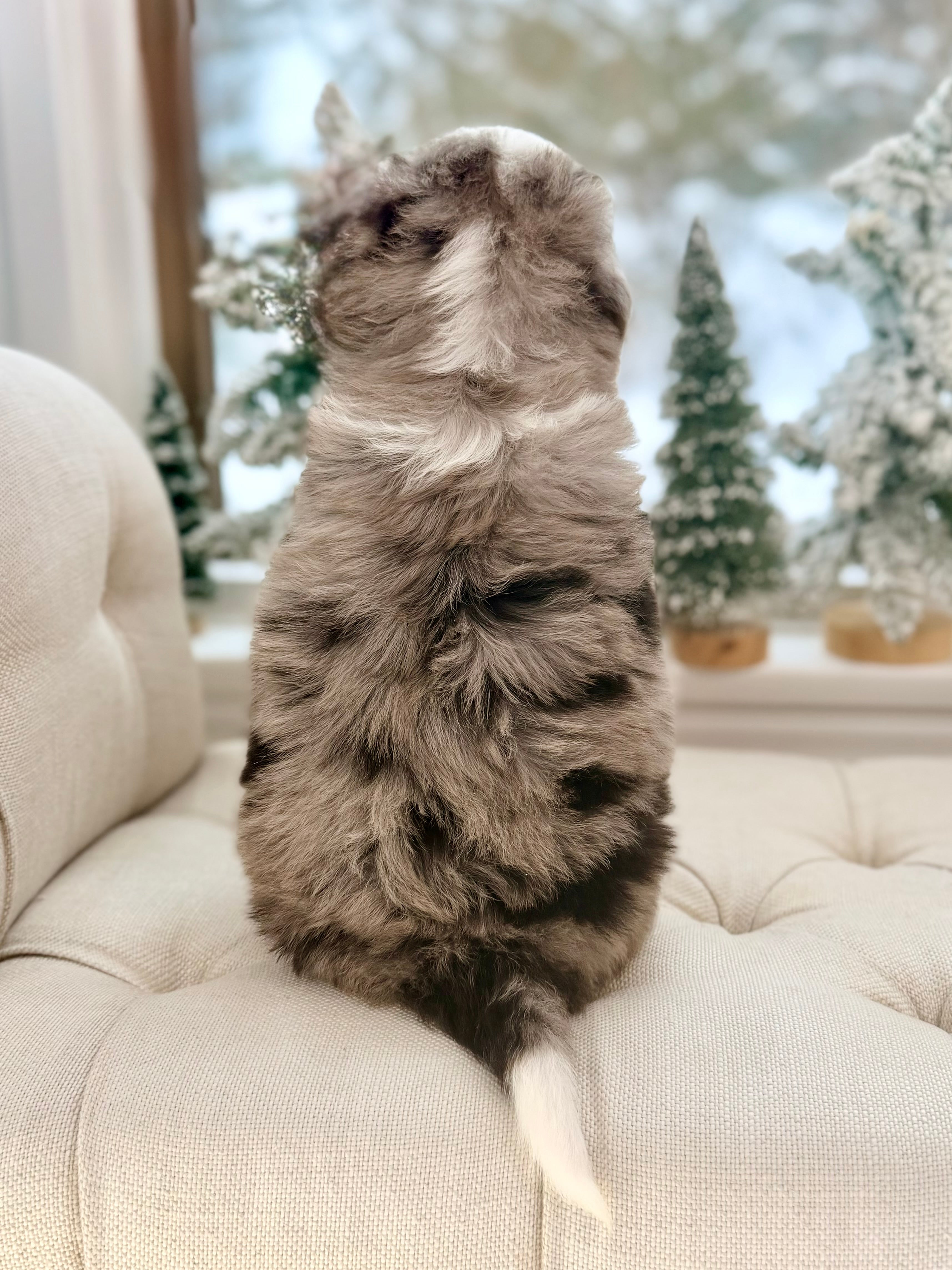 Daisy is currently 8 weeks old and weighs 4.6 lbs. She has a striking blue merle tri phantom coat with a soft, wavy texture and a loving, social personality. Daisy is people-focused, affectionate, and enjoys both playful moments and cozy downtime.