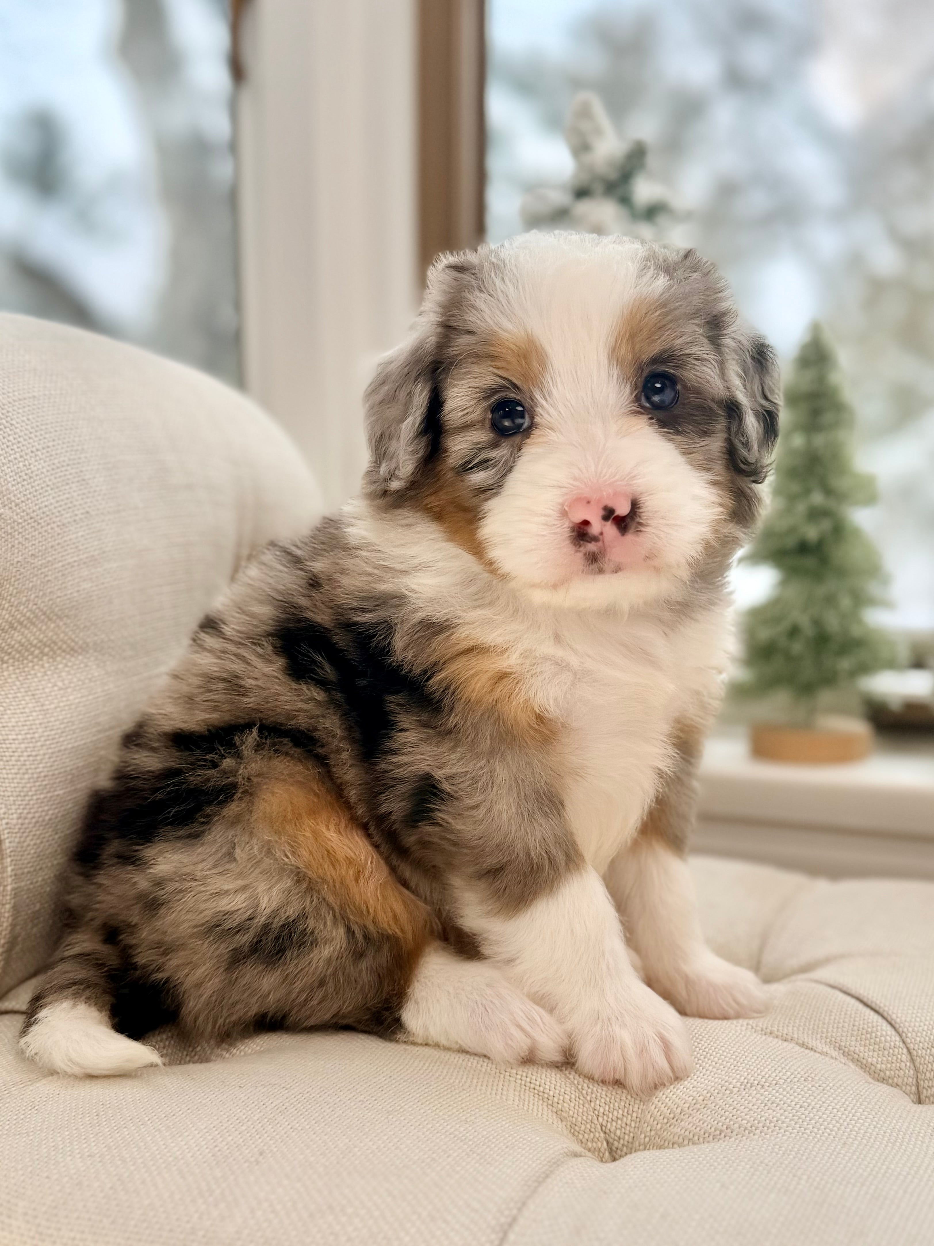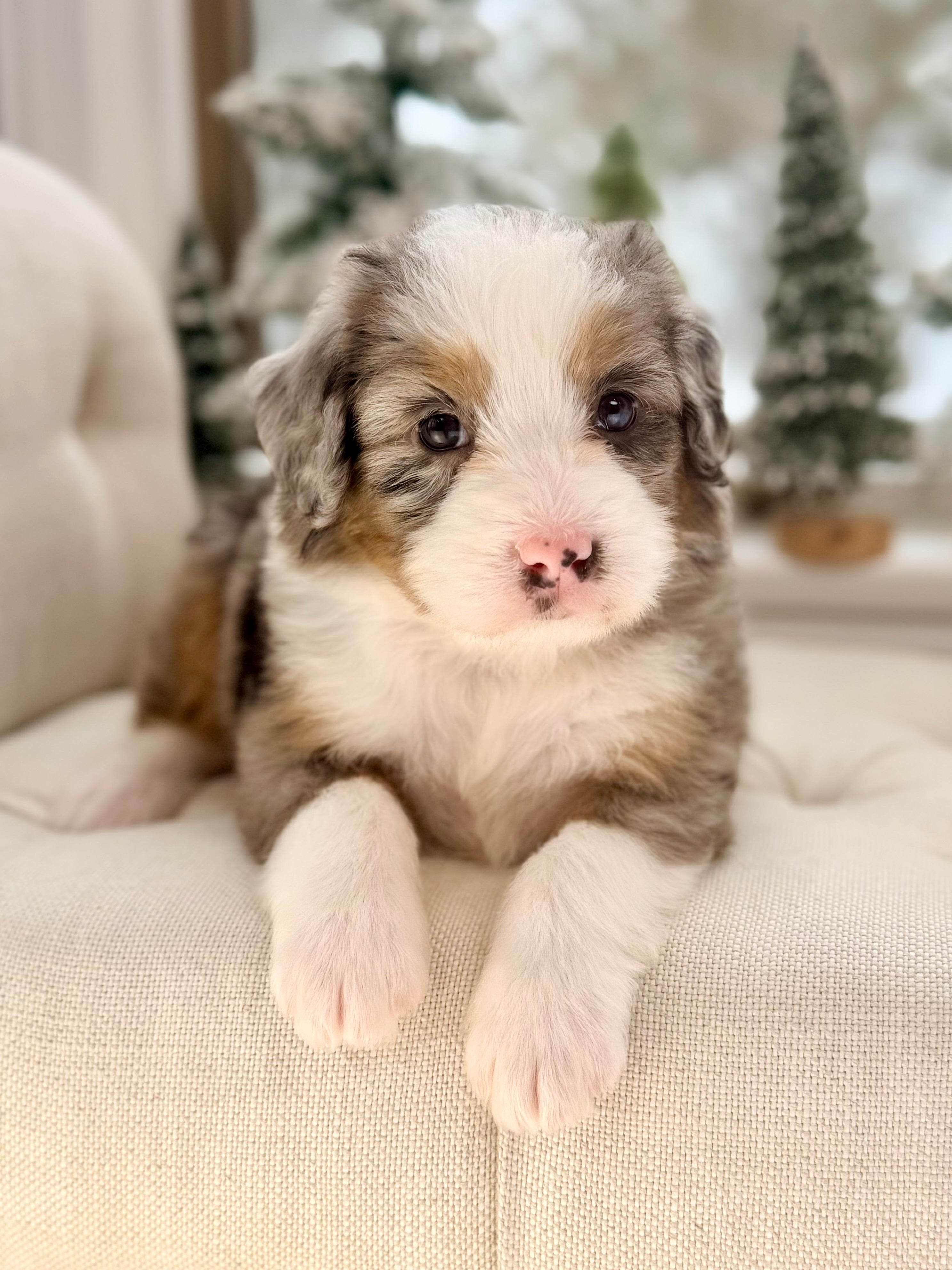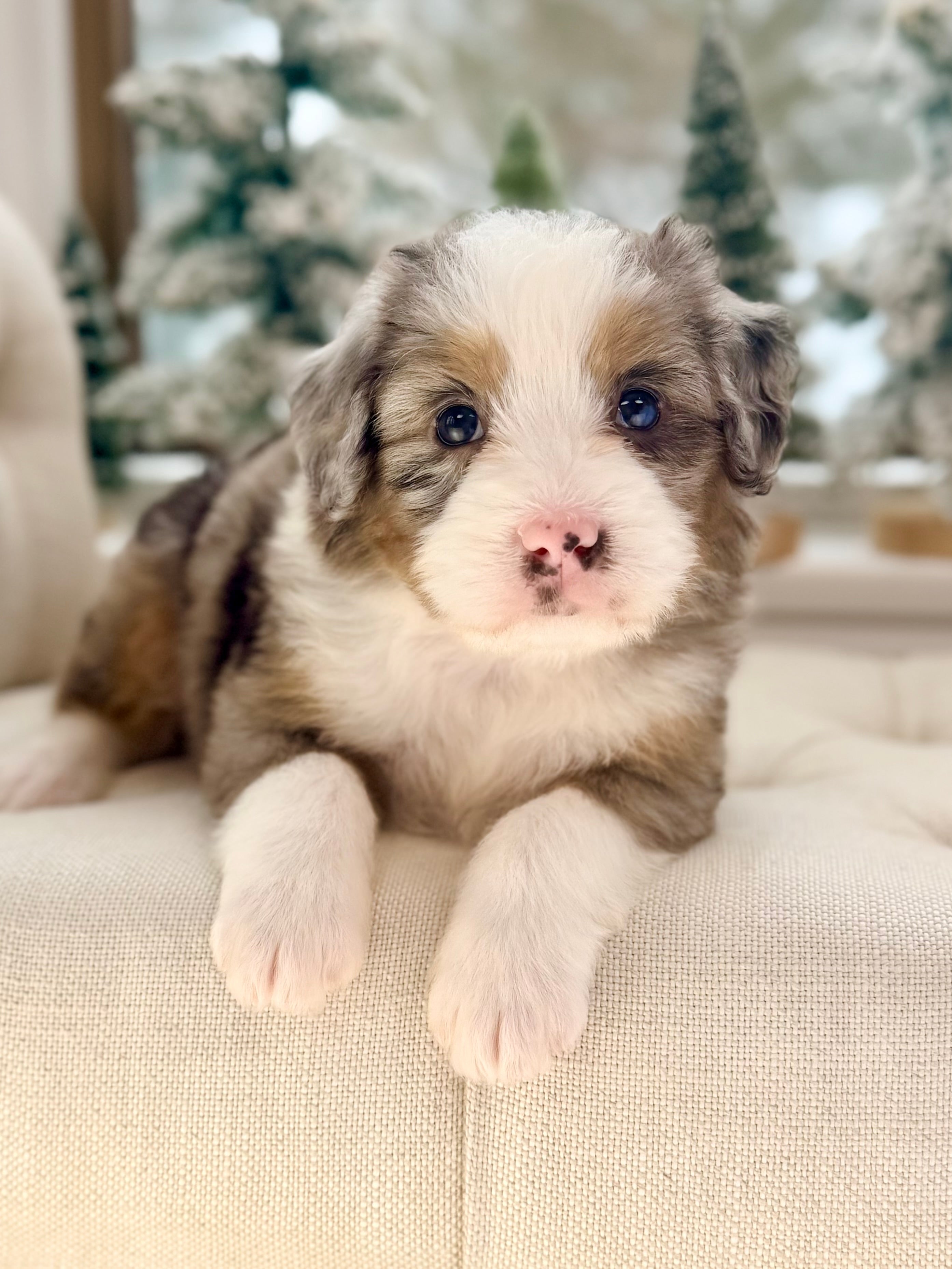 Daisy is currently 8 weeks old and weighs 4.6 lbs. She has a striking blue merle tri phantom coat with a soft, wavy texture and a loving, social personality. Daisy is people-focused, affectionate, and enjoys both playful moments and cozy downtime.