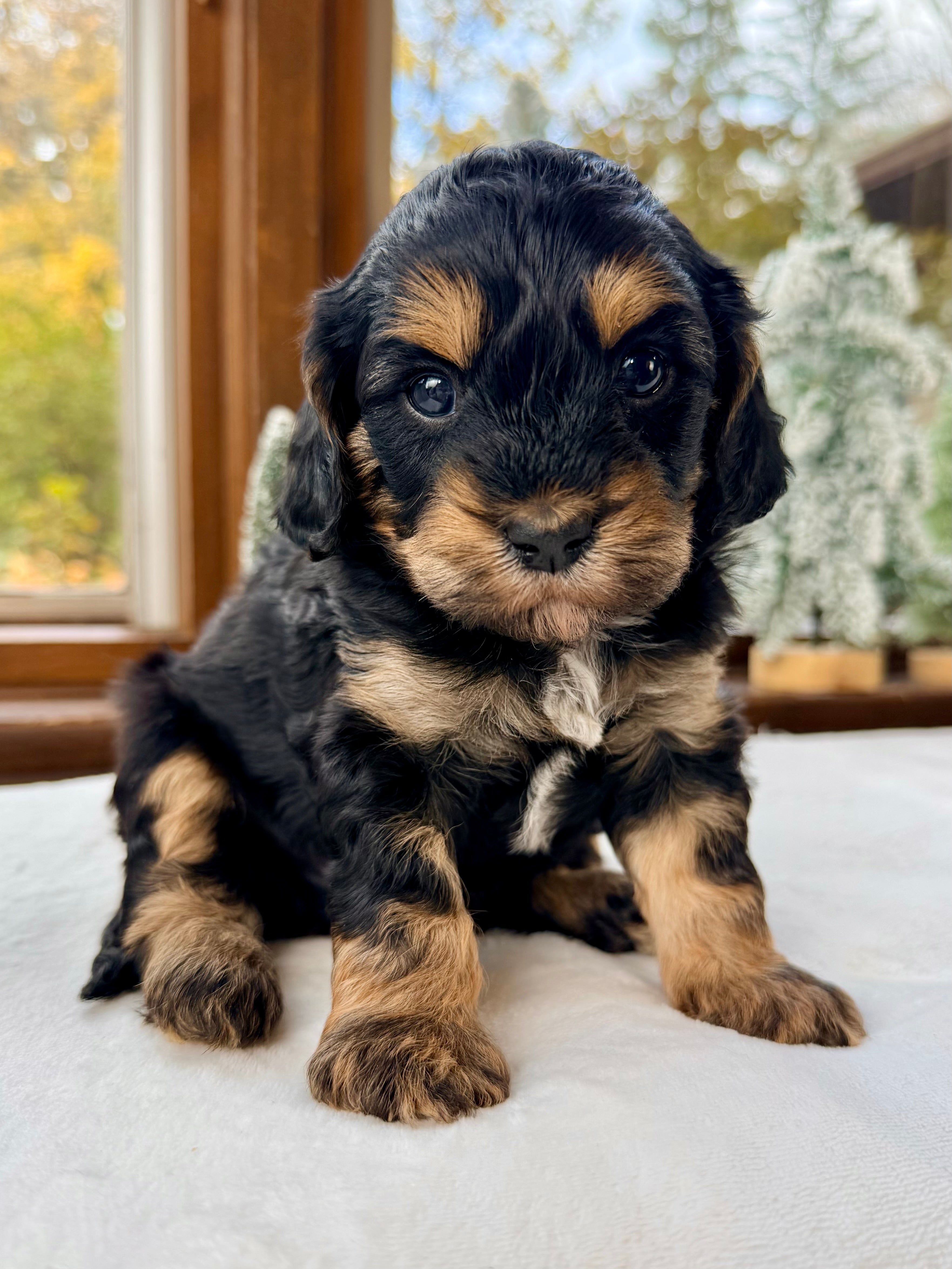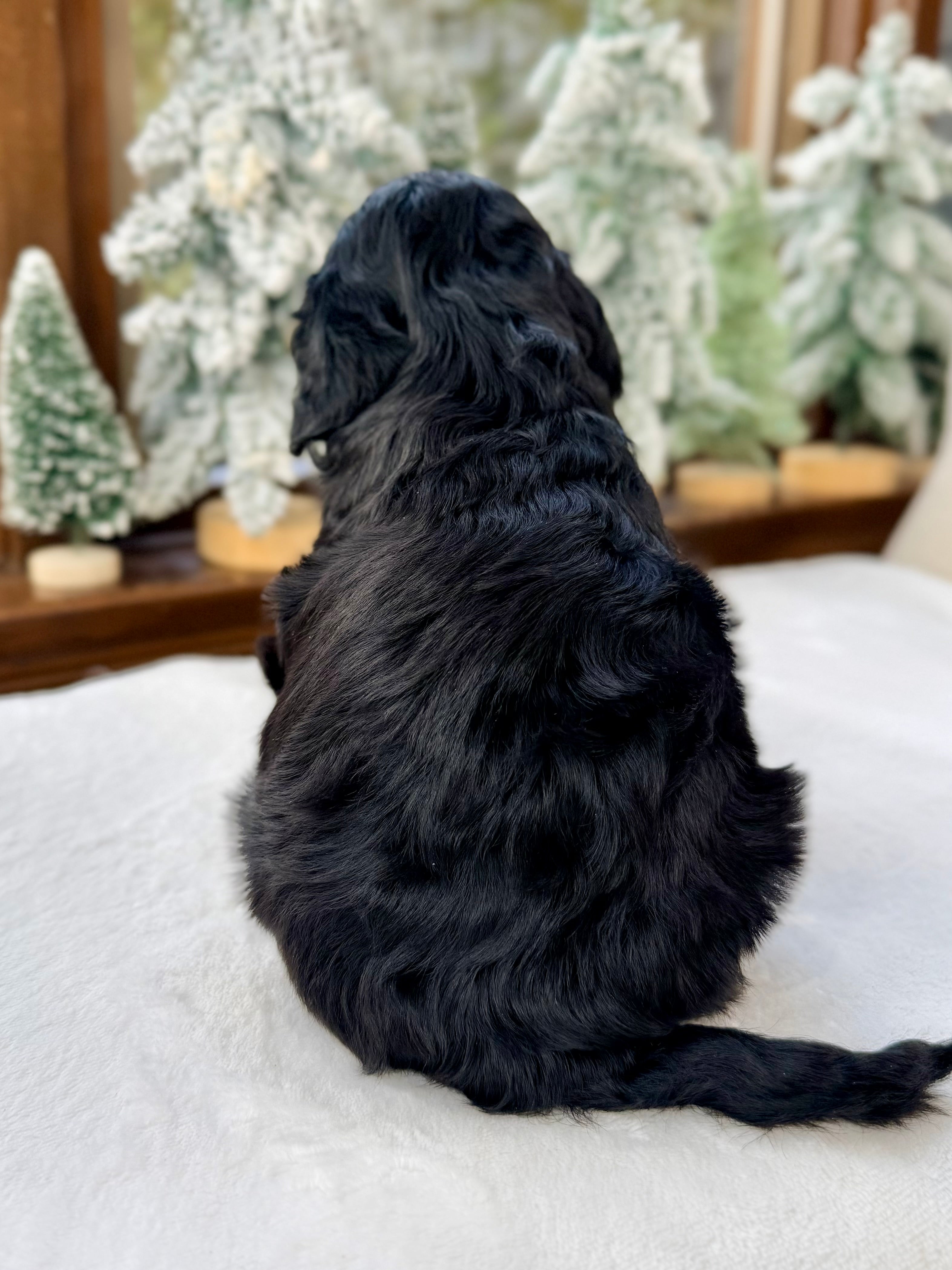 Bean is currently 6 weeks old and 2.9 lbs. He has a handsome black phantom wavy coat and a fun, people-oriented personality. Heβs playful, confident, and always excited to explore new things.