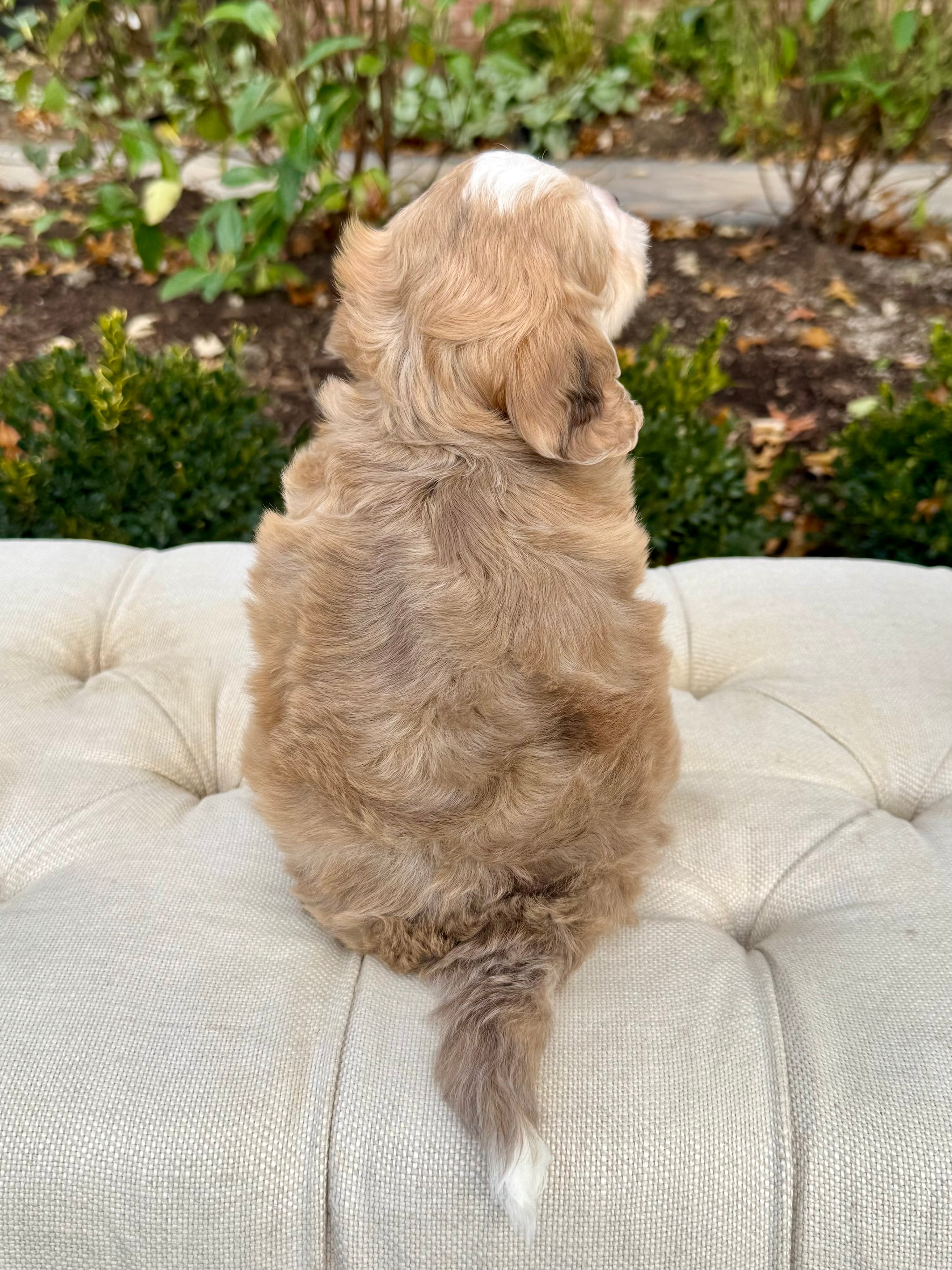 Biscuit is 6 weeks, 3.2 lbs and growing. Biscuit was born September 27th and is ready to go home November 22-25! Β  He has a beautiful chestnut sable tuxedo wavy non-shedding coat. Biscuit is a sweet natured little boy who is curious and learning to explore his world. Expected adult weight is 12-16 lbs full grown. The mother, Starlight, is a 12 lb King Charles Cavalier Spaniel, and the father, Bernard, is a 7 lb Miniature Poodel. Both parents have undergone genetic health testing to ensure healthy and strong puppies.