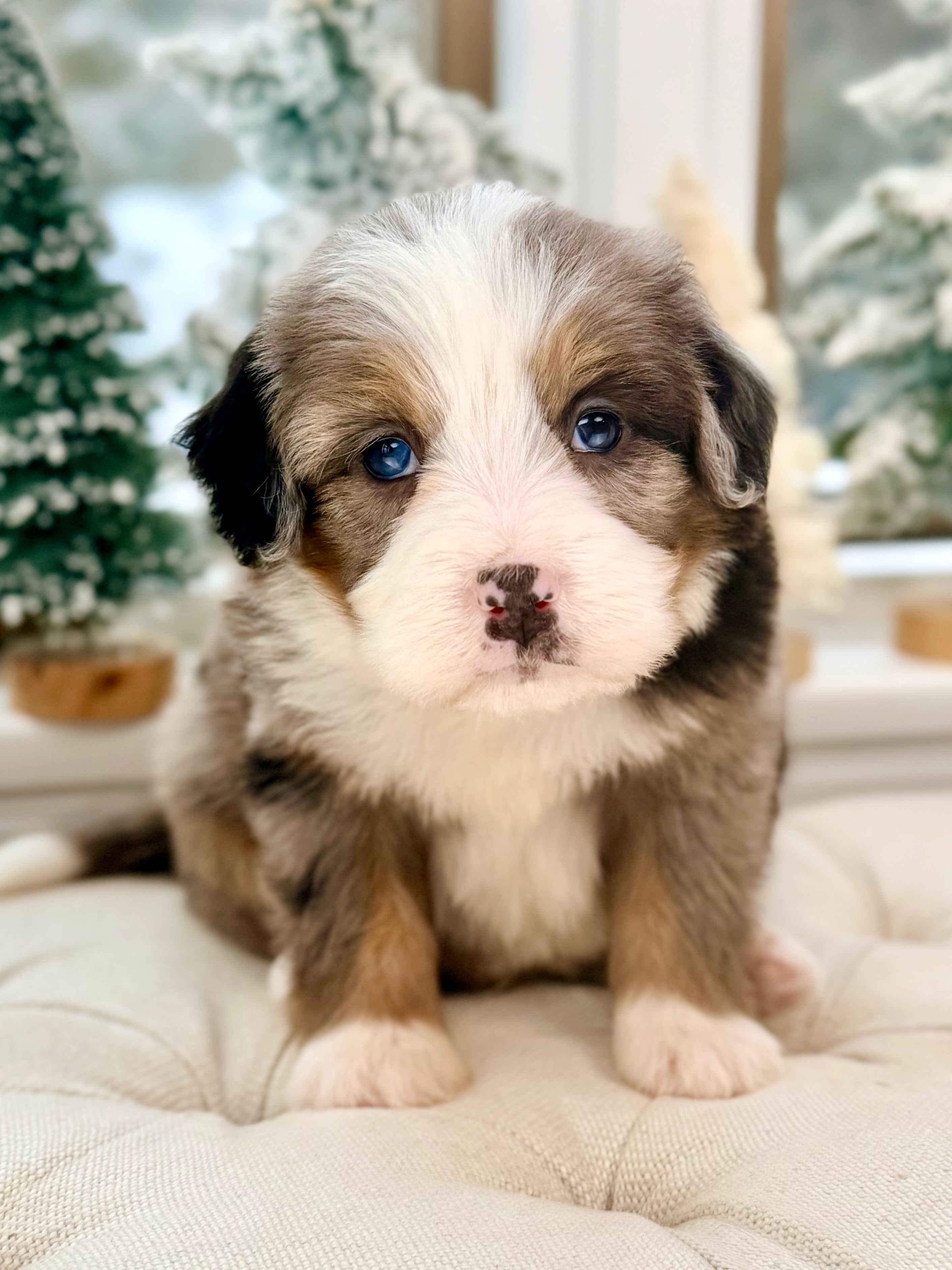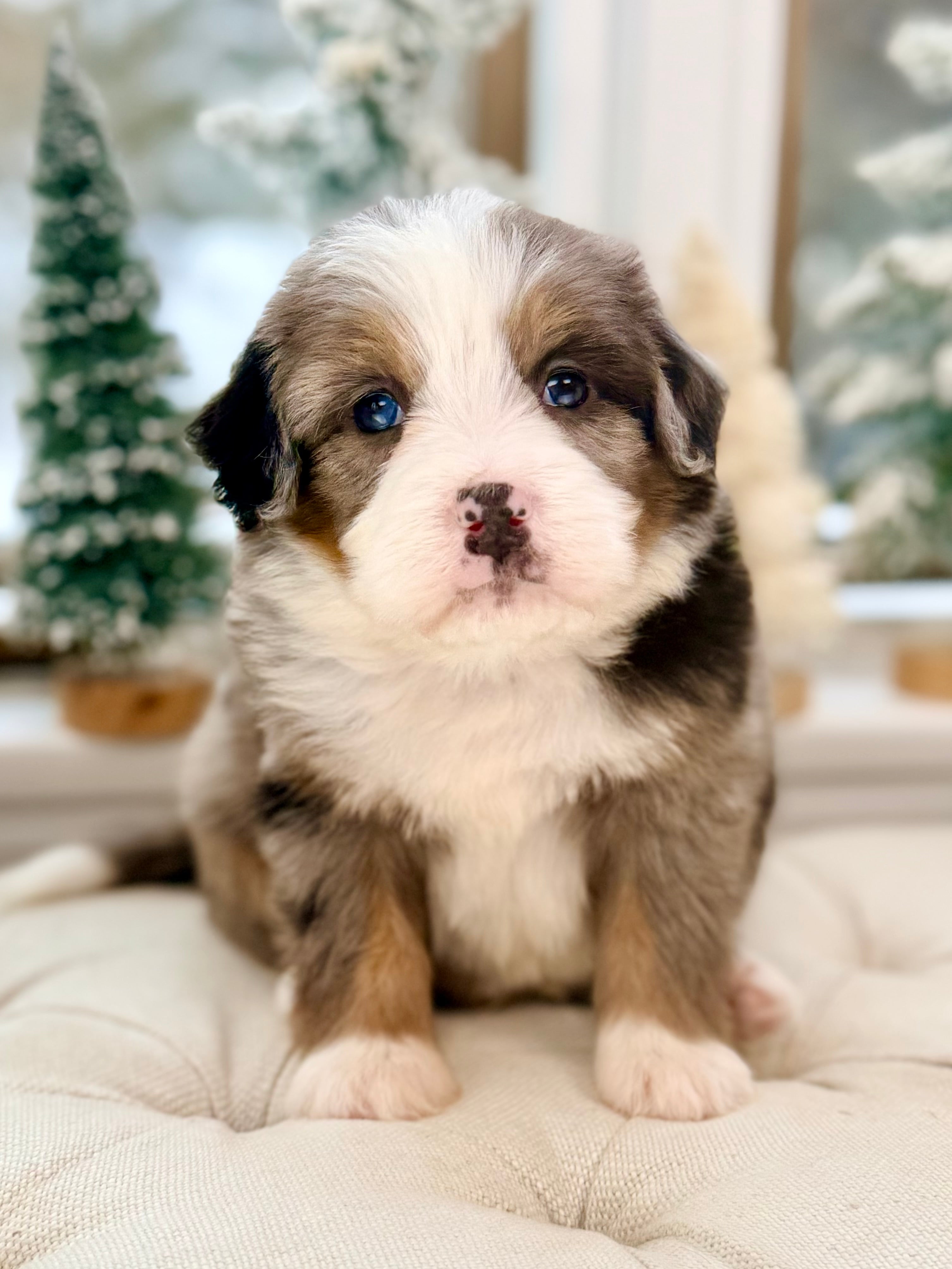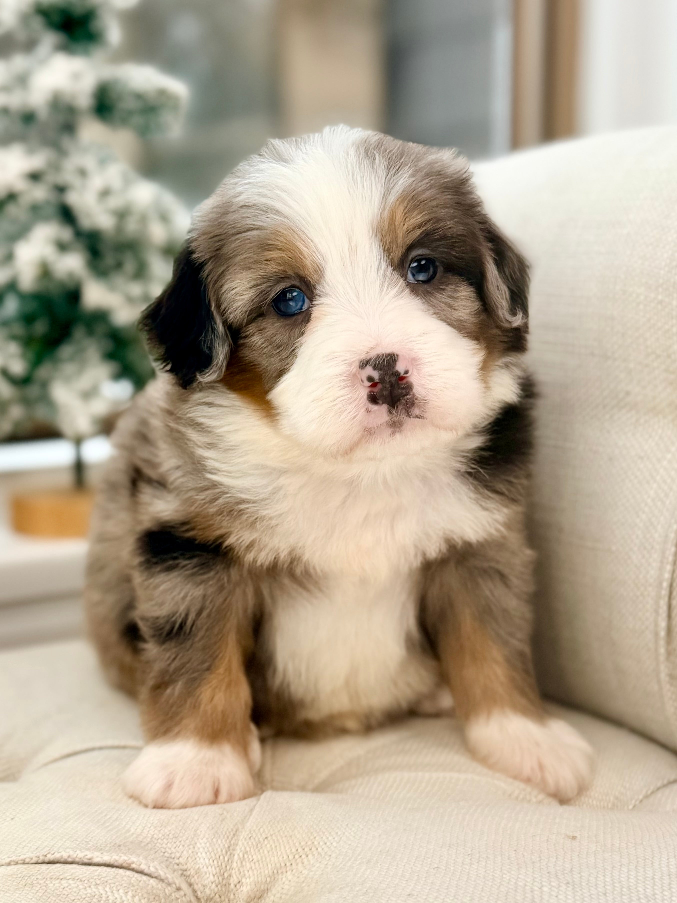 Charlie is currently 8 weeks old and weighs 3.7 lbs. He has a handsome blue merle tri phantom coat with a soft, wavy texture and a sweet, playful personality. Charlie is affectionate, people-focused, and loves interactive play followed by cuddle time.