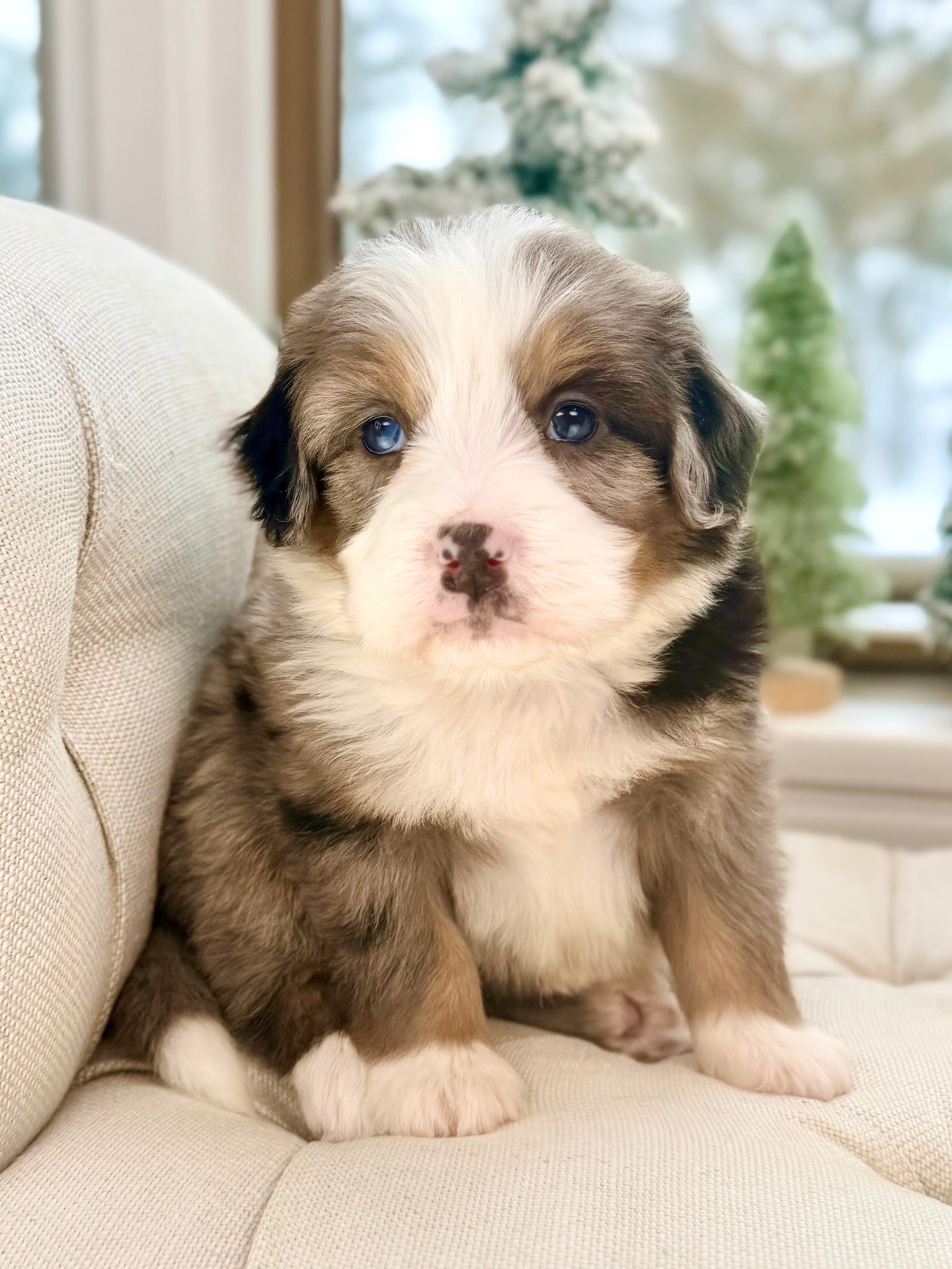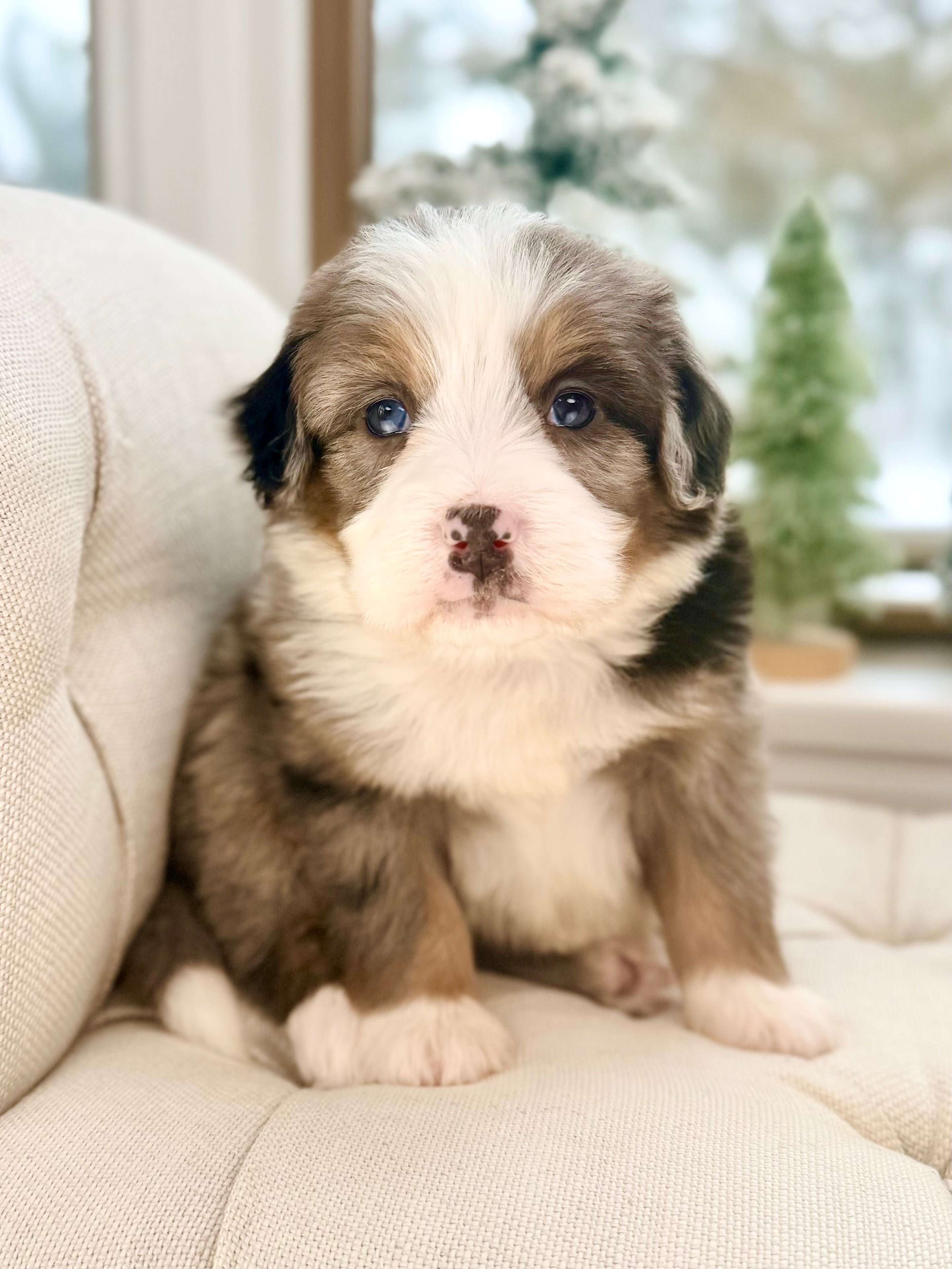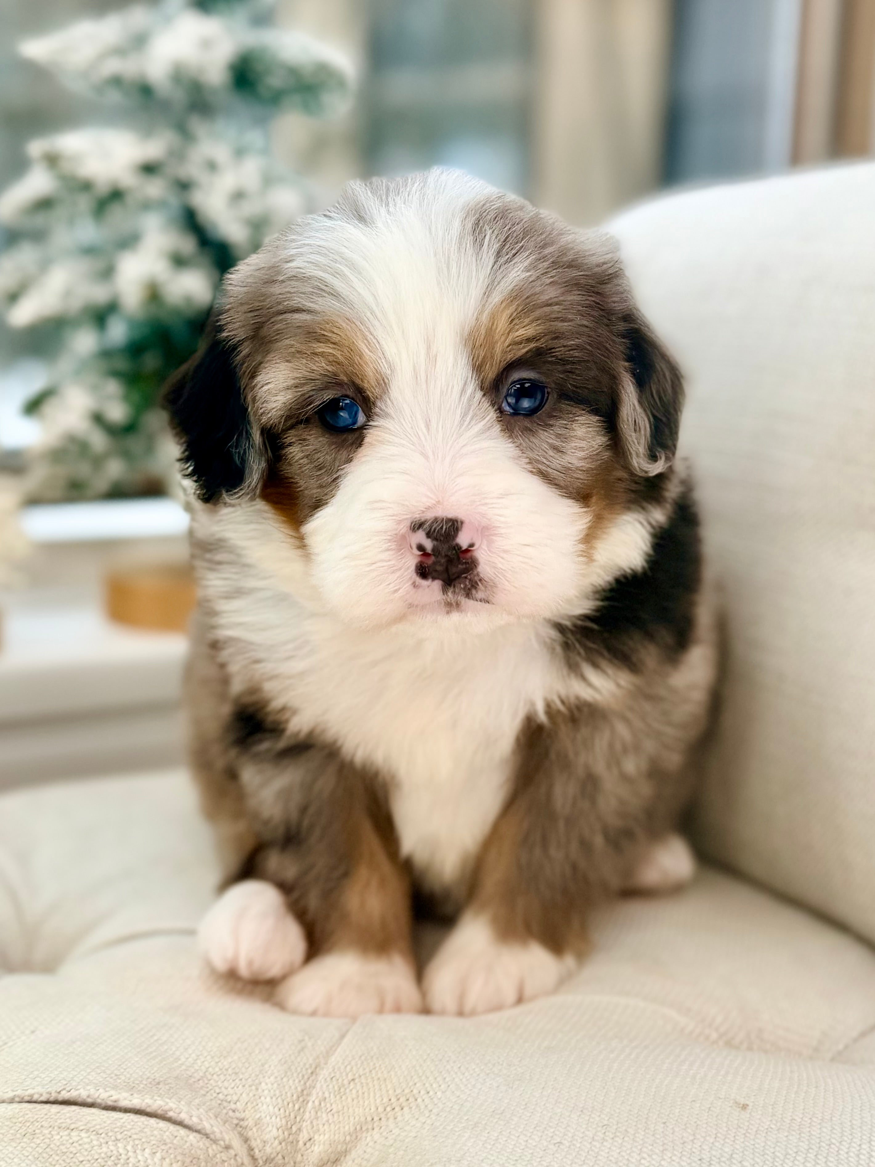 Charlie is currently 8 weeks old and weighs 3.7 lbs. He has a handsome blue merle tri phantom coat with a soft, wavy texture and a sweet, playful personality. Charlie is affectionate, people-focused, and loves interactive play followed by cuddle time.