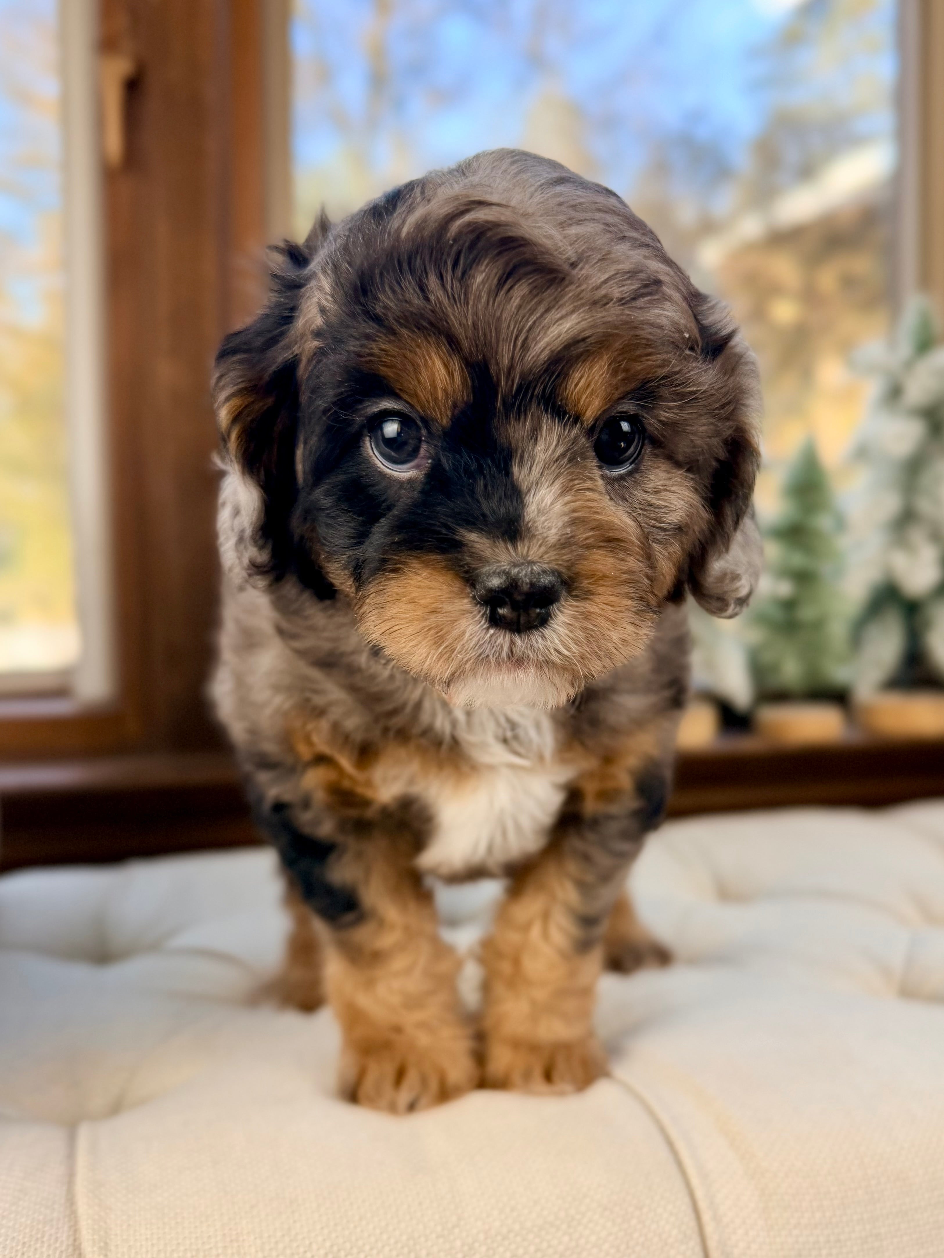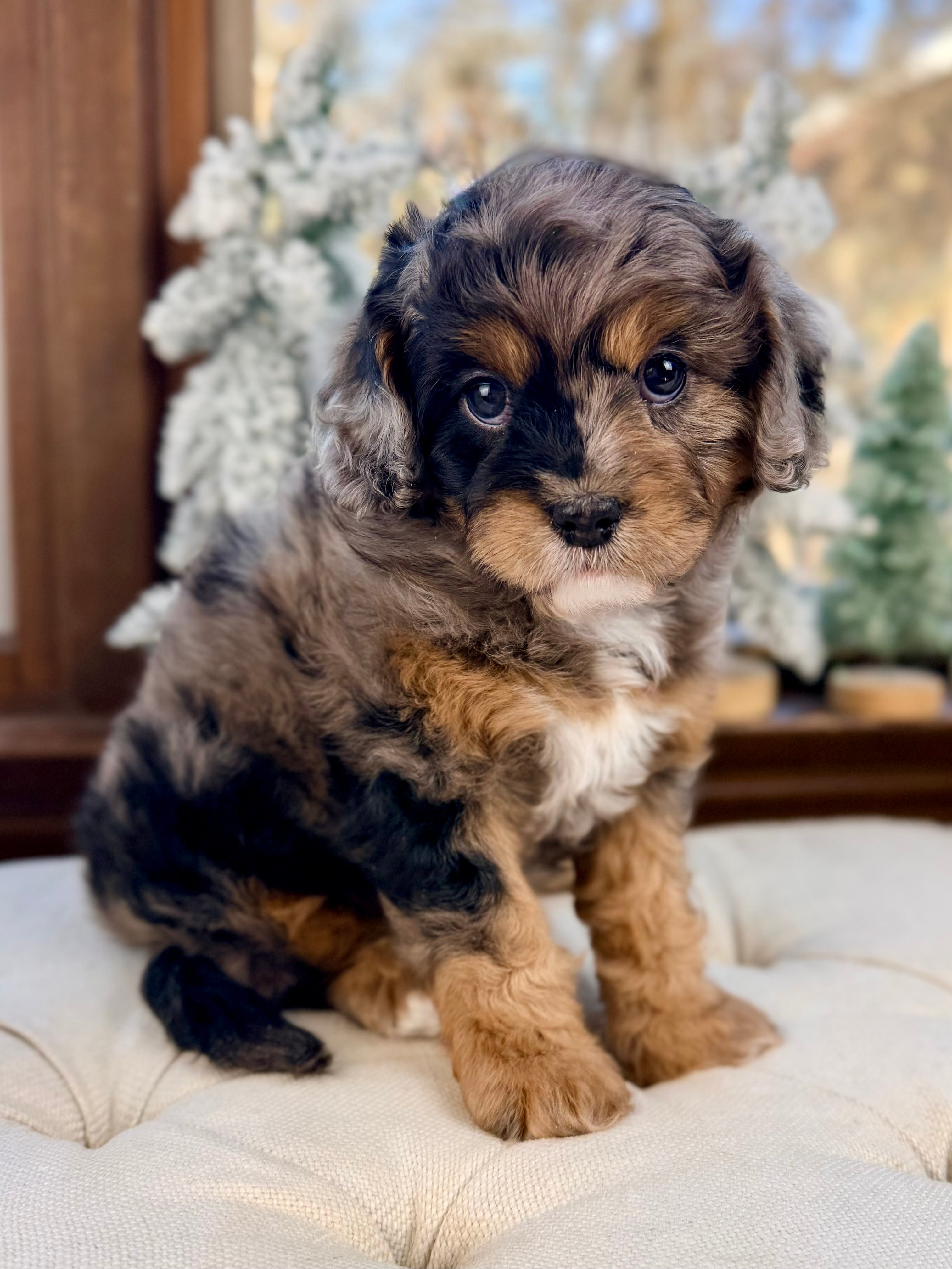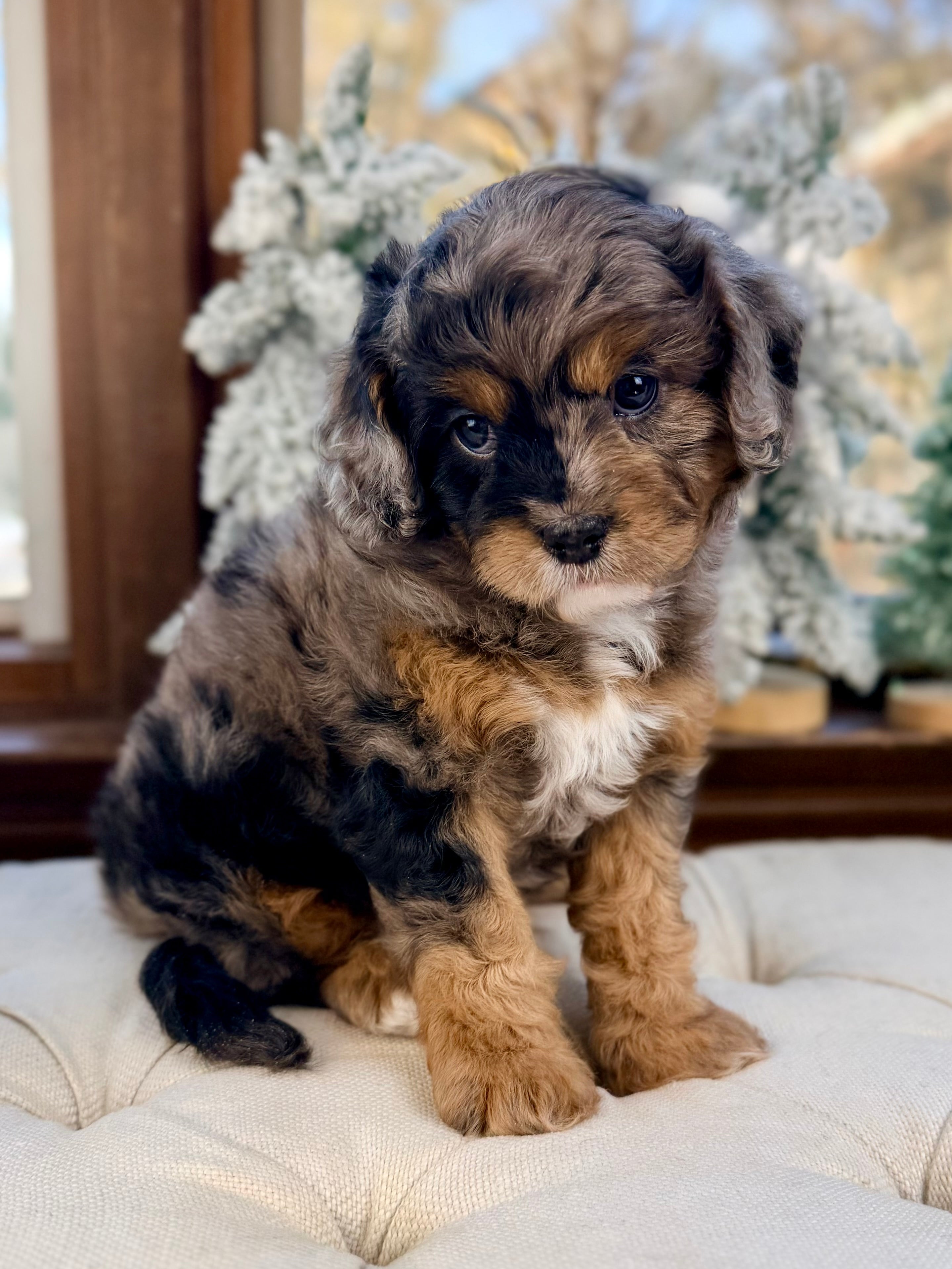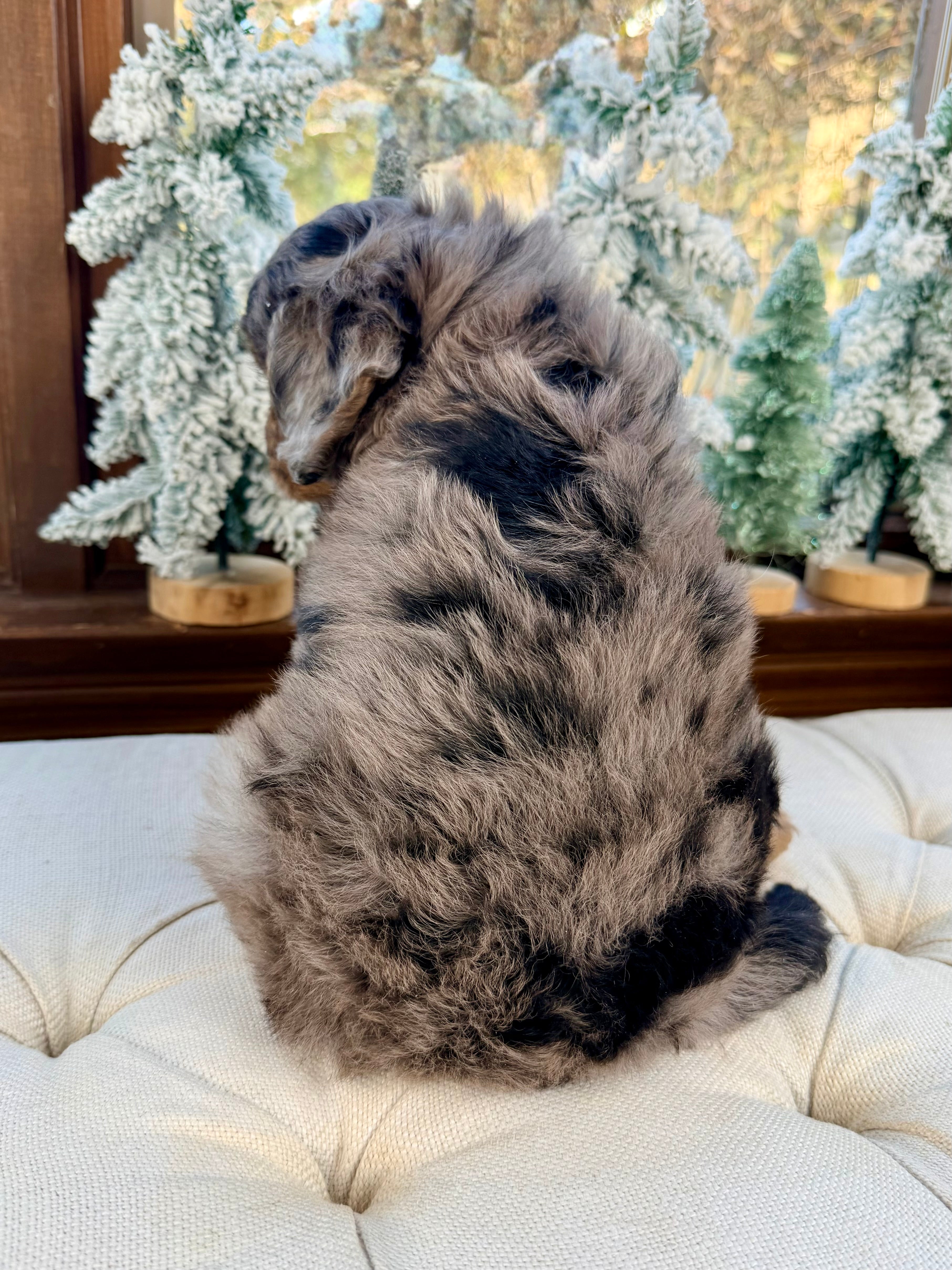 Claus is currently 7 weeks old and 4.8 lbs. He matches his brother with a beautiful blue merle tri/phantom wavy, non-shedding coat. Claus has a loving, playful personality and enjoys being close to people, cuddling, and gentle playtime.