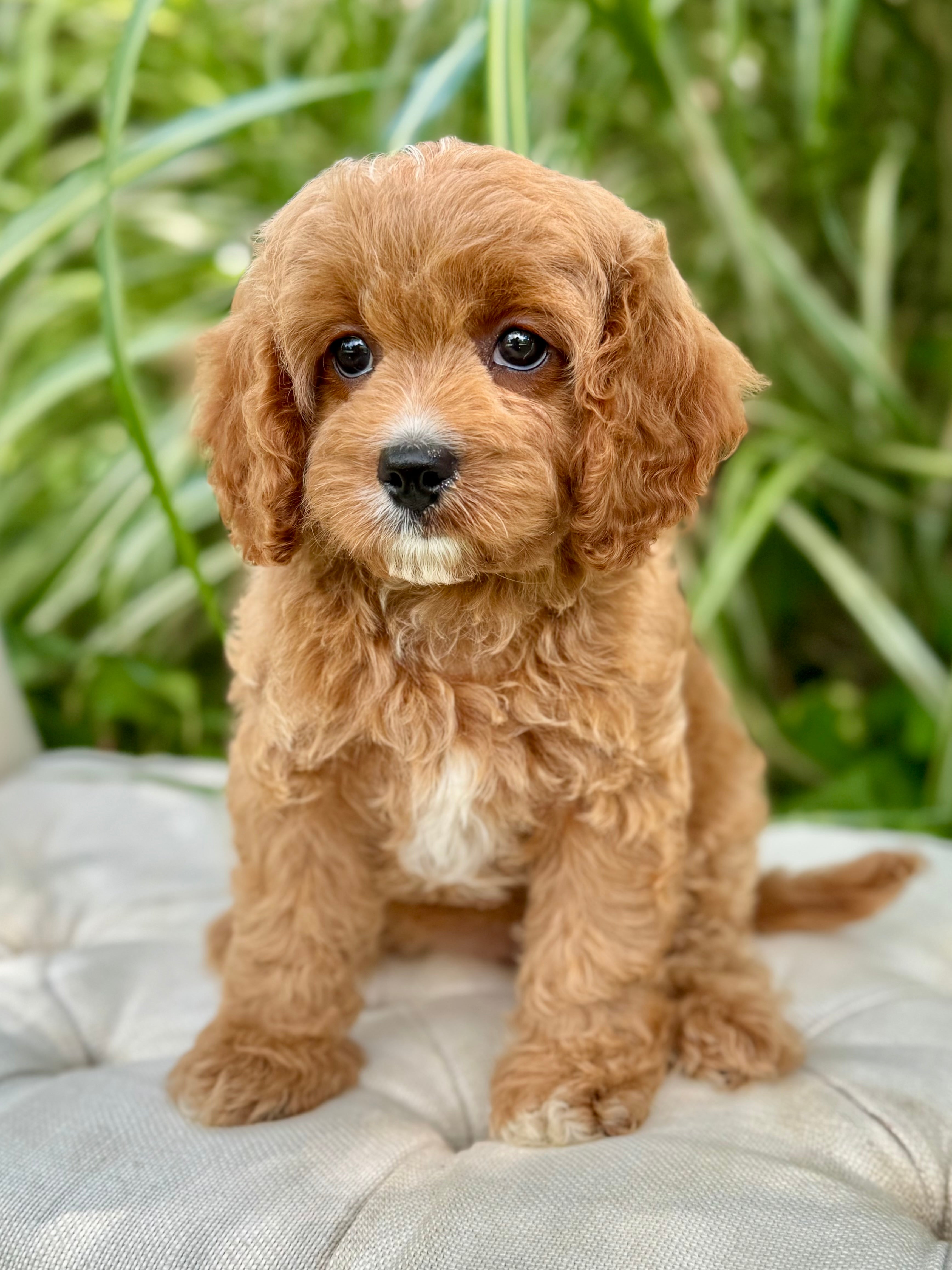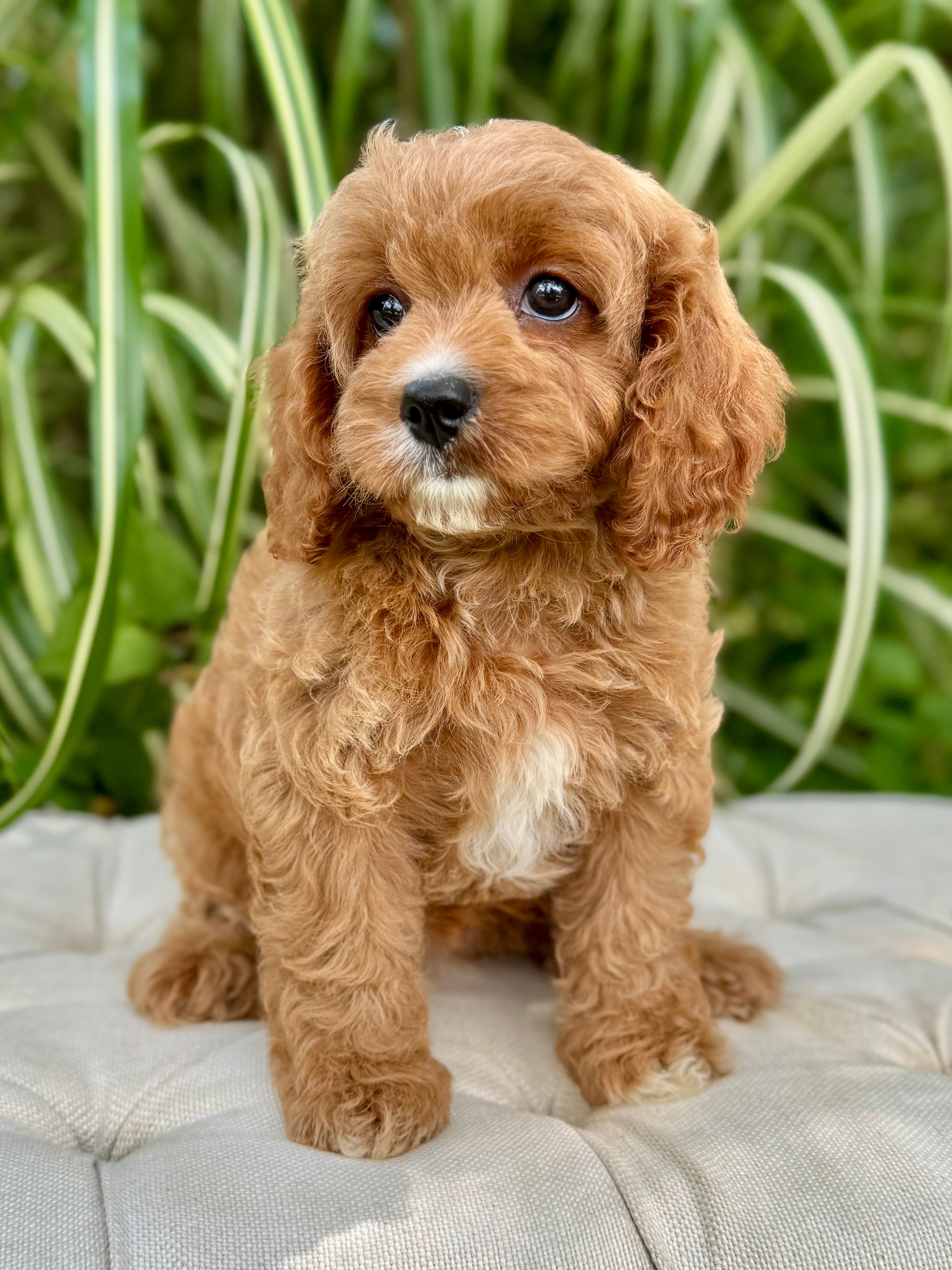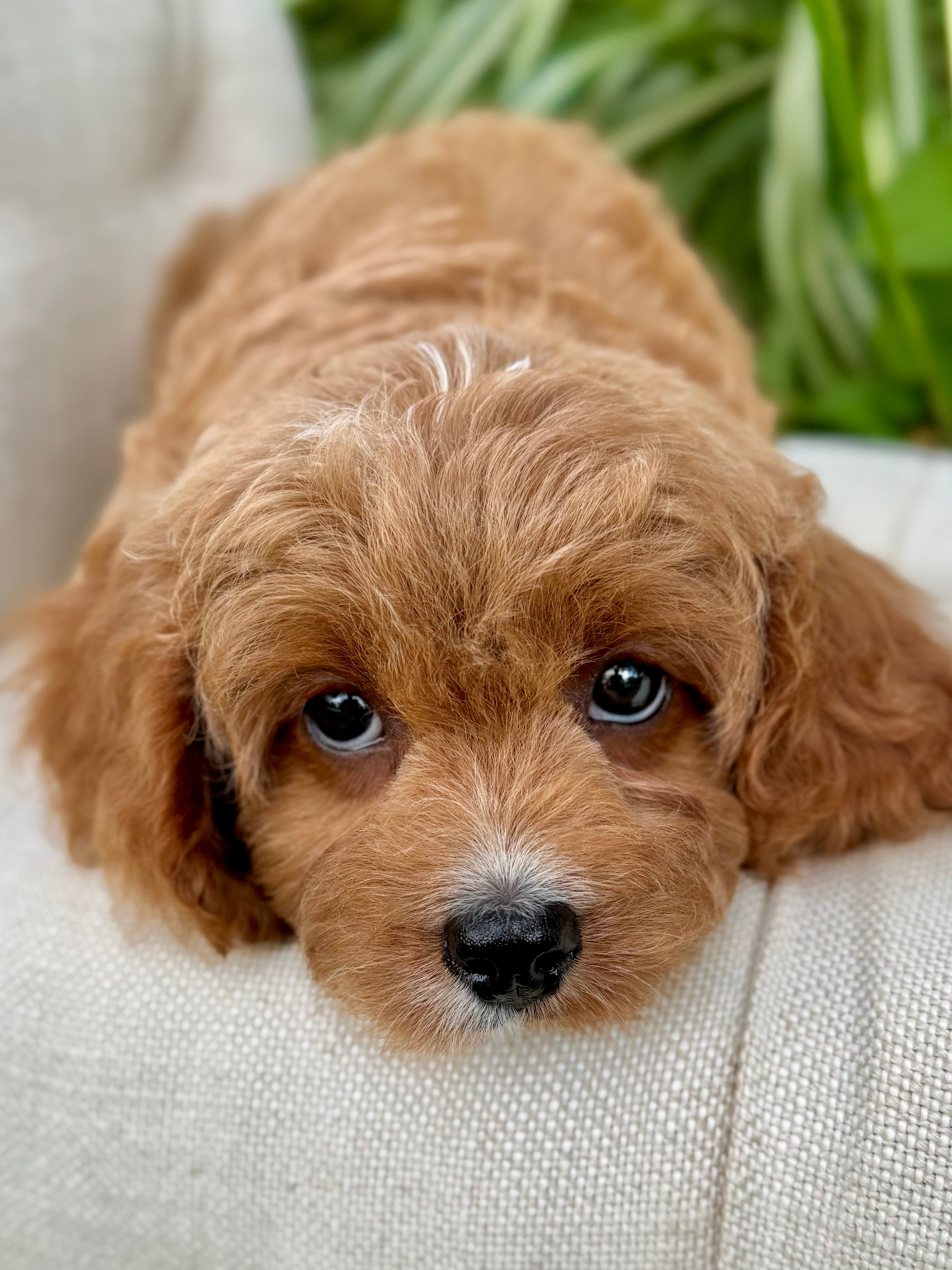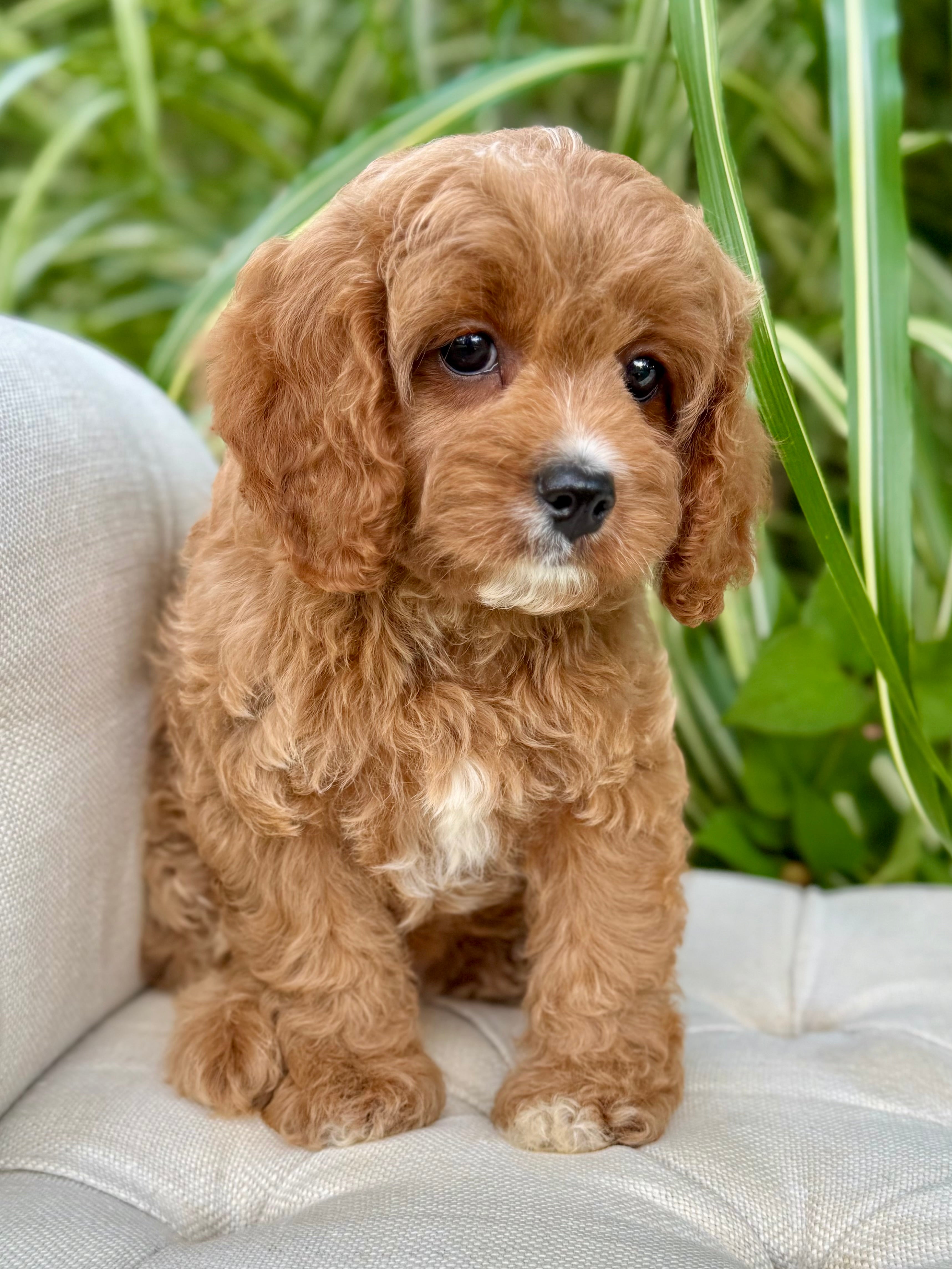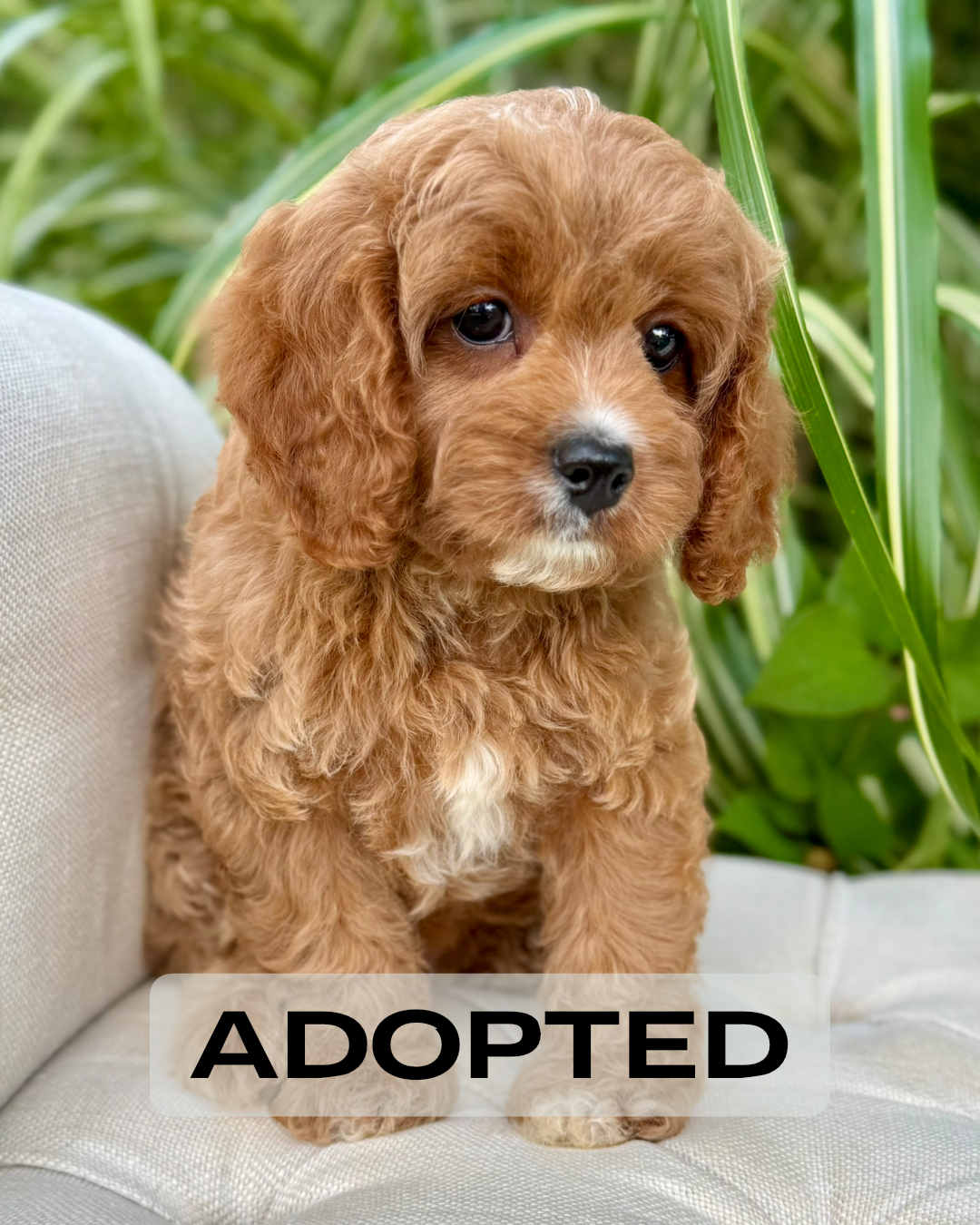 Clio is a 8-week-old F1 Cavapoo with a soft, golden wavy coat and a calm, affectionate personality. She’s a happy little girl who enjoys exploring her surroundings but is always content to settle in for cuddles. Born on June 15th and currently weighing 5 lbs, Clio is expected to be 14–18 lbs full grown. Her mom, Ruth, is a 10 lb red Poodle, and her dad, Snickers, is a 16 lb Blenheim Cavalier—both genetically health tested to ensure strong, healthy puppies.