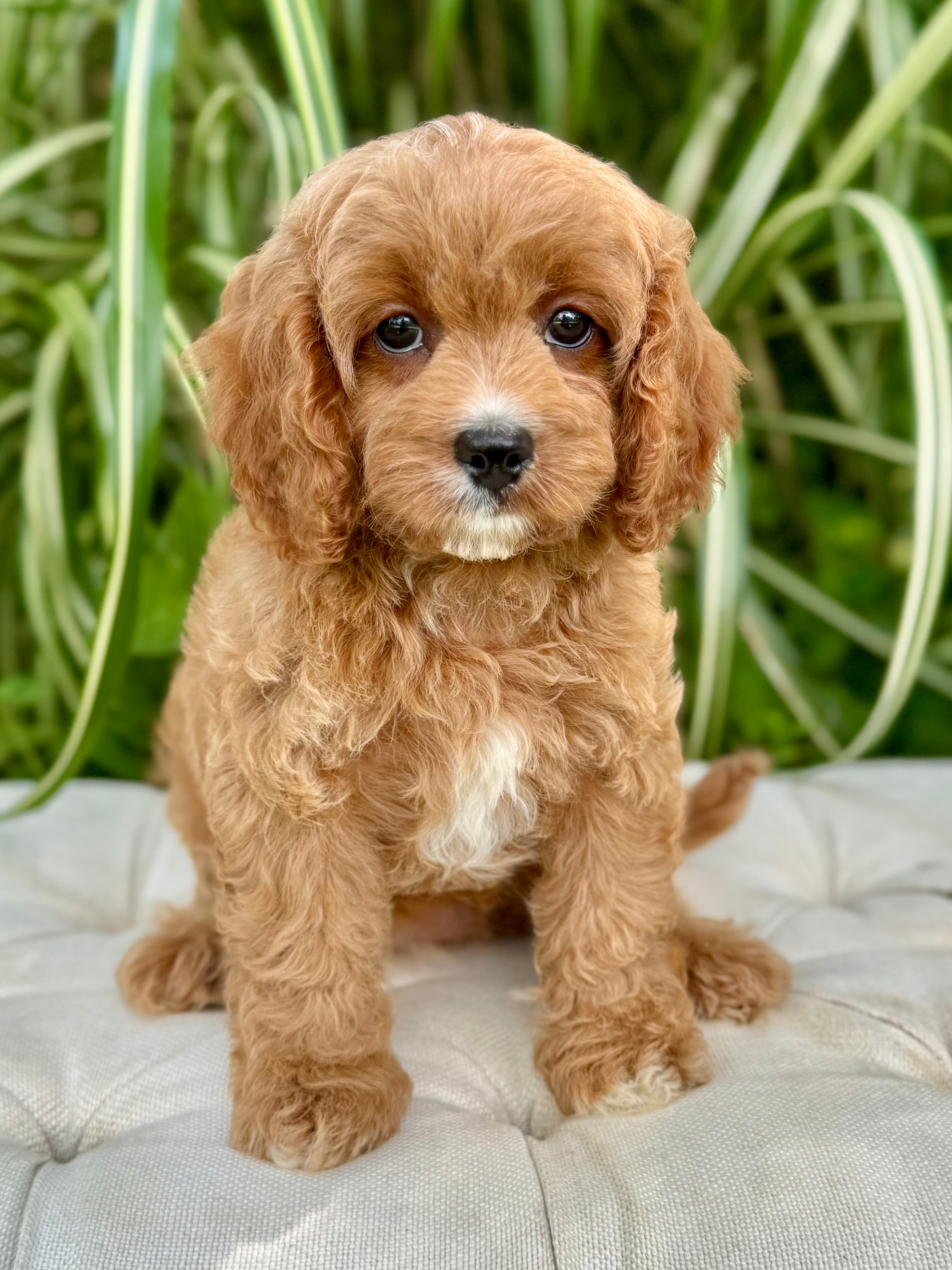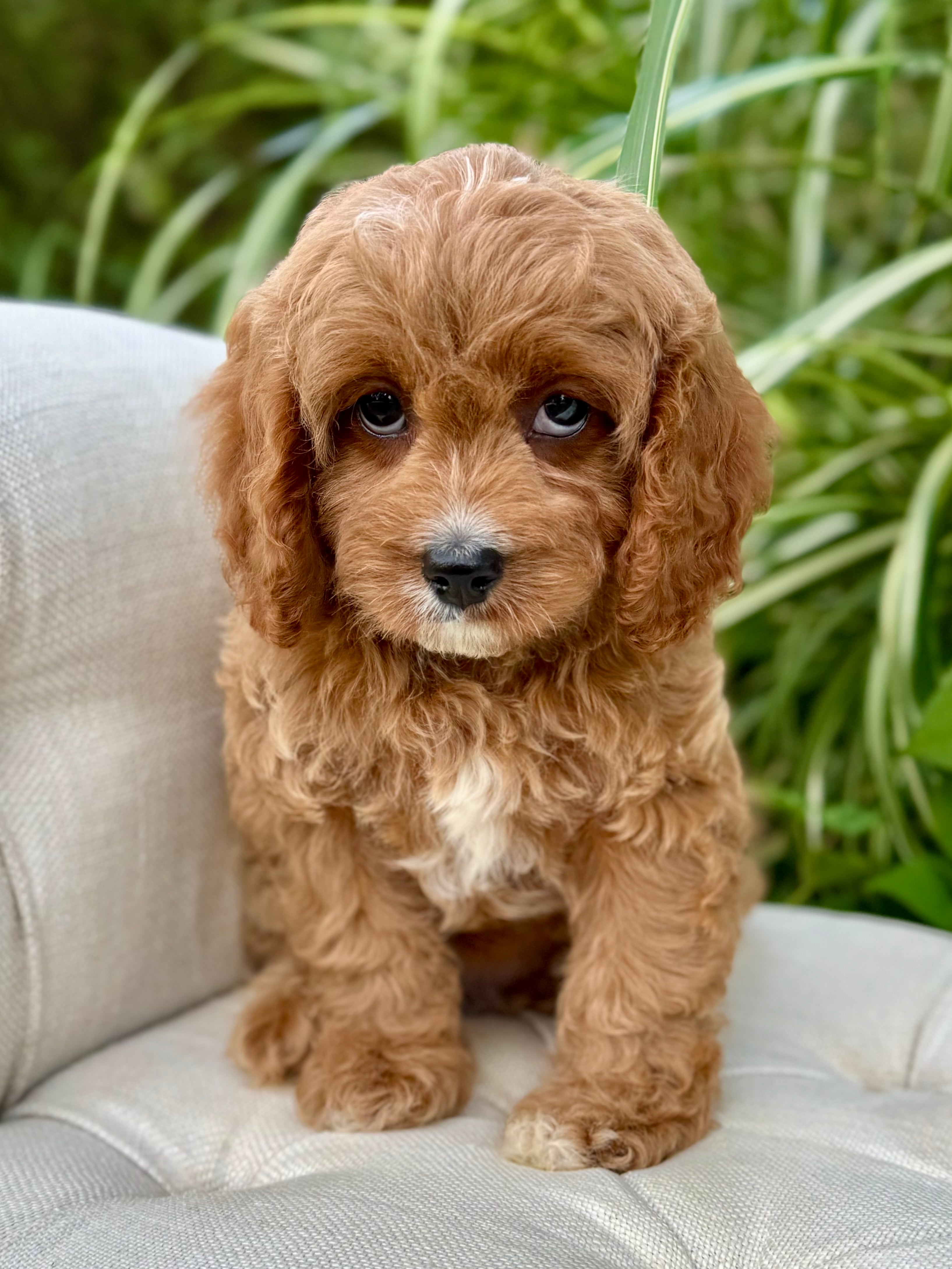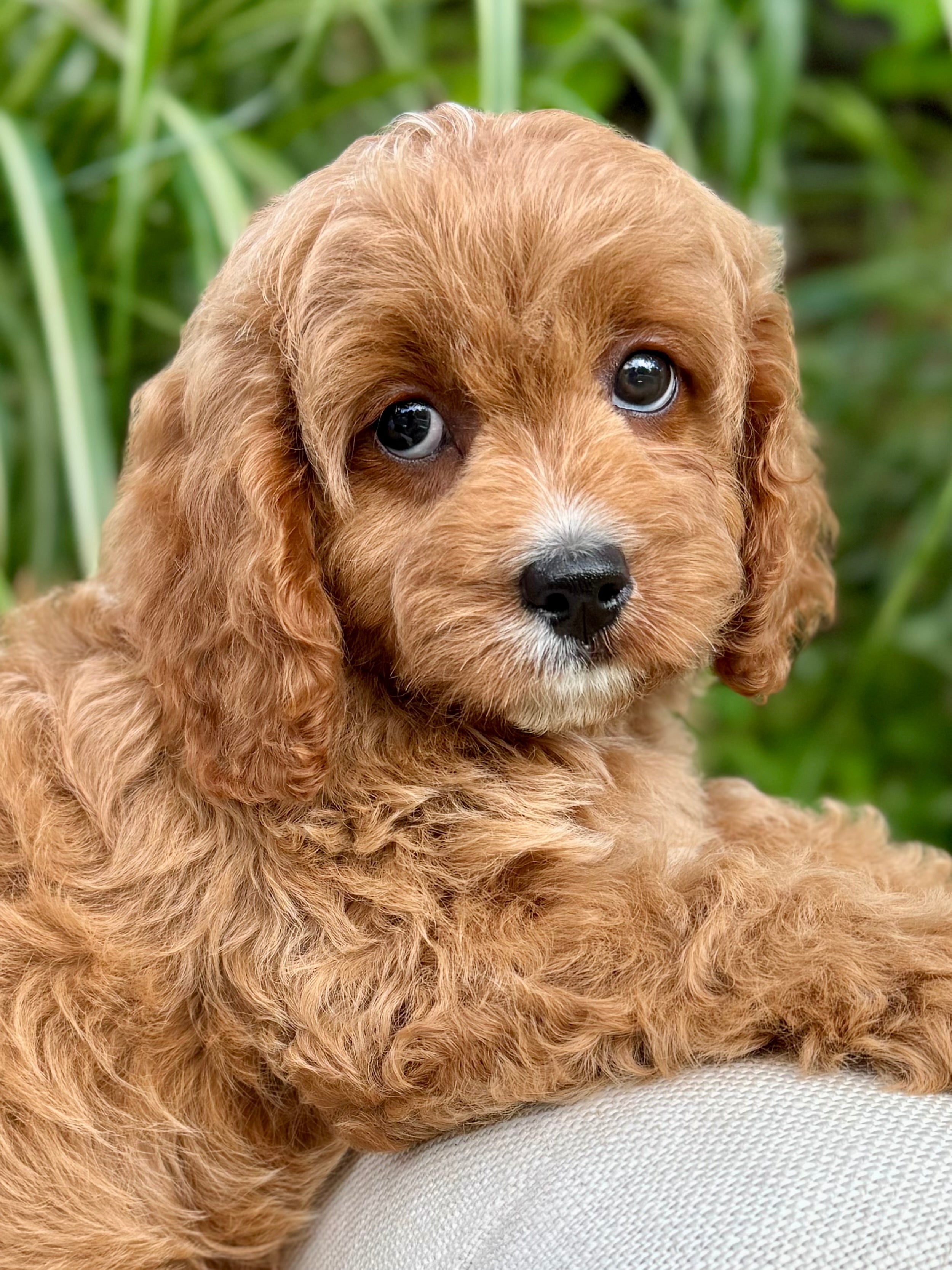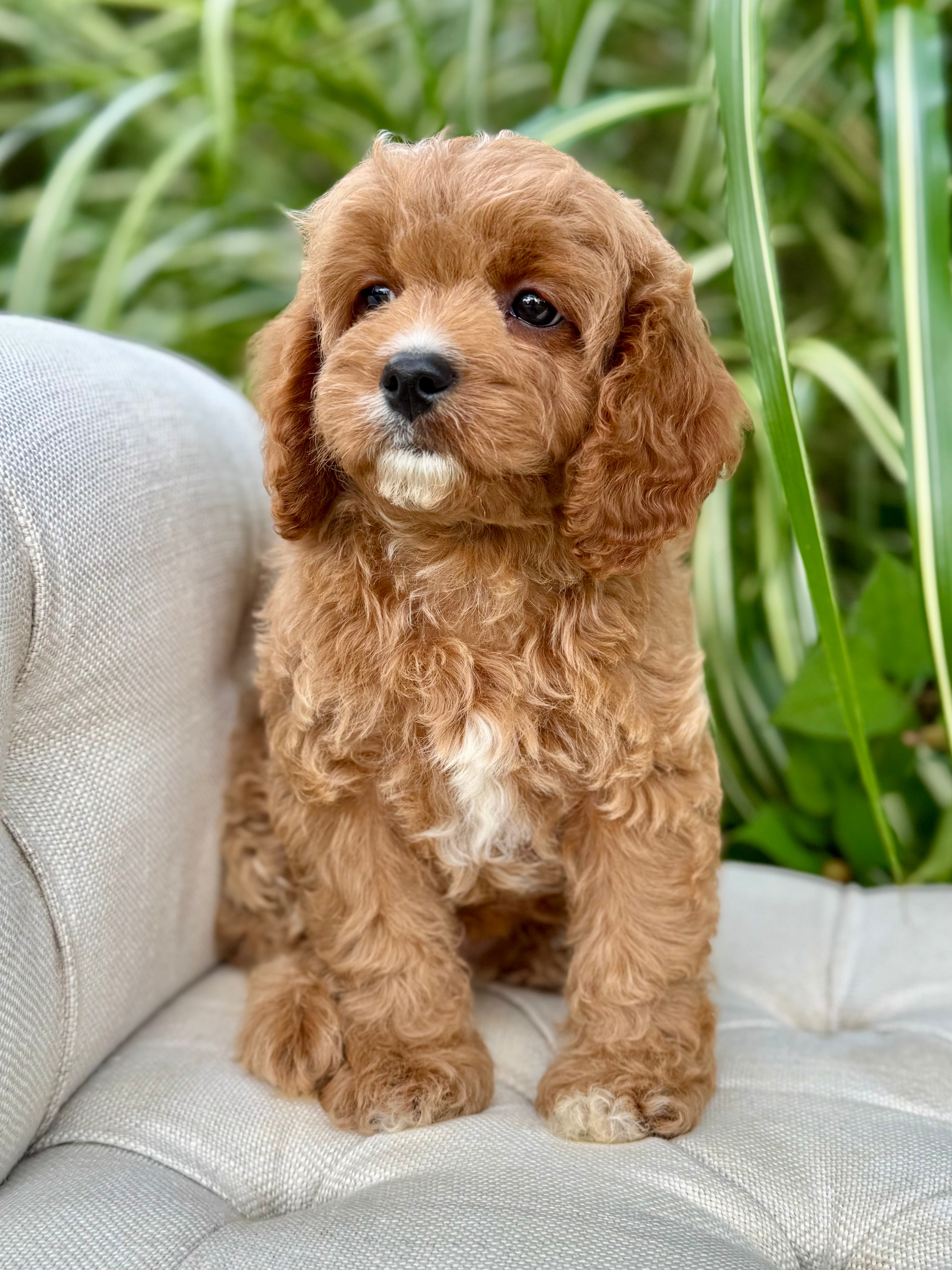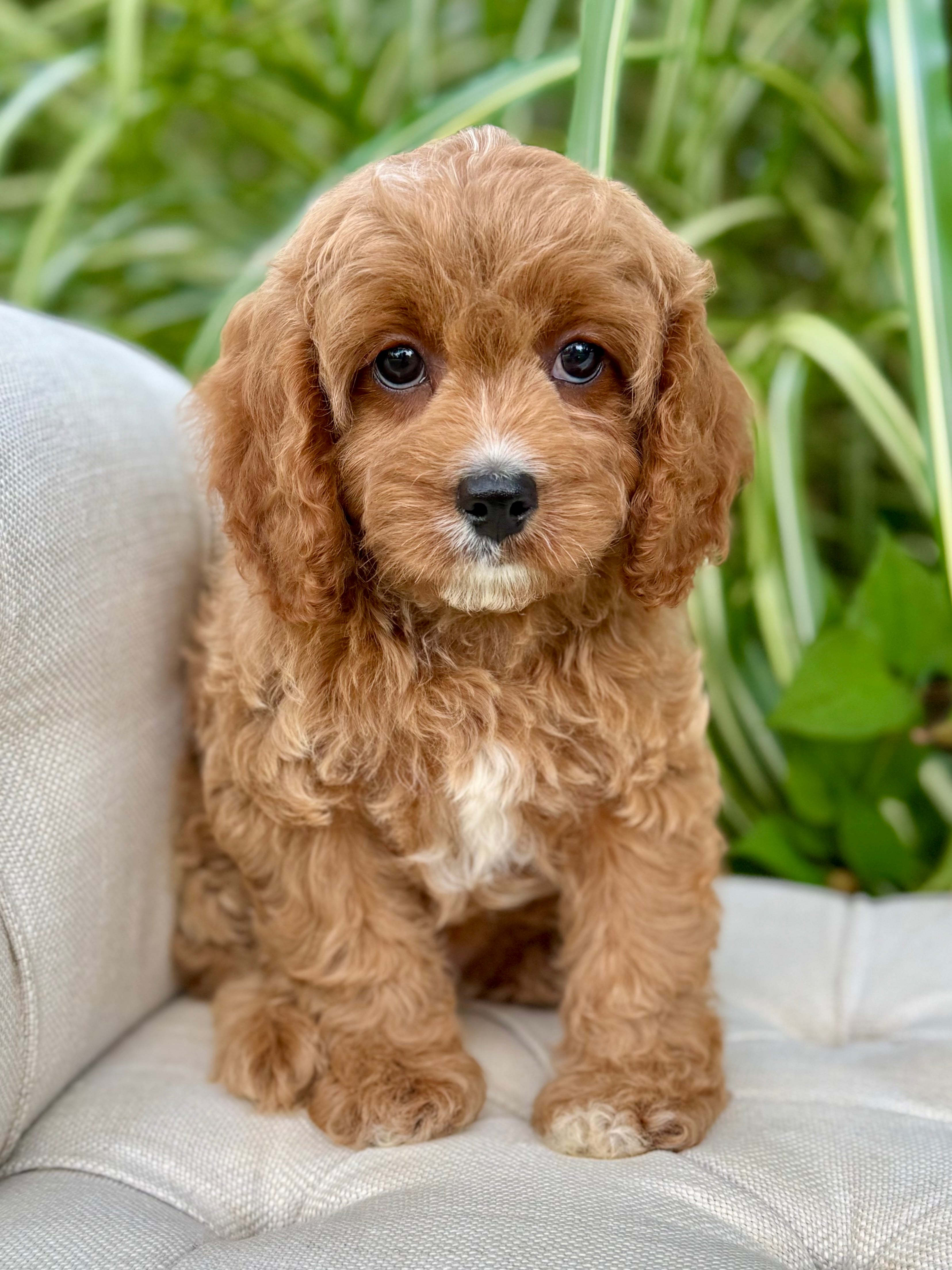 Clio is a 8-week-old F1 Cavapoo with a soft, golden wavy coat and a calm, affectionate personality. She’s a happy little girl who enjoys exploring her surroundings but is always content to settle in for cuddles. Born on June 15th and currently weighing 5 lbs, Clio is expected to be 14–18 lbs full grown. Her mom, Ruth, is a 10 lb red Poodle, and her dad, Snickers, is a 16 lb Blenheim Cavalier—both genetically health tested to ensure strong, healthy puppies.