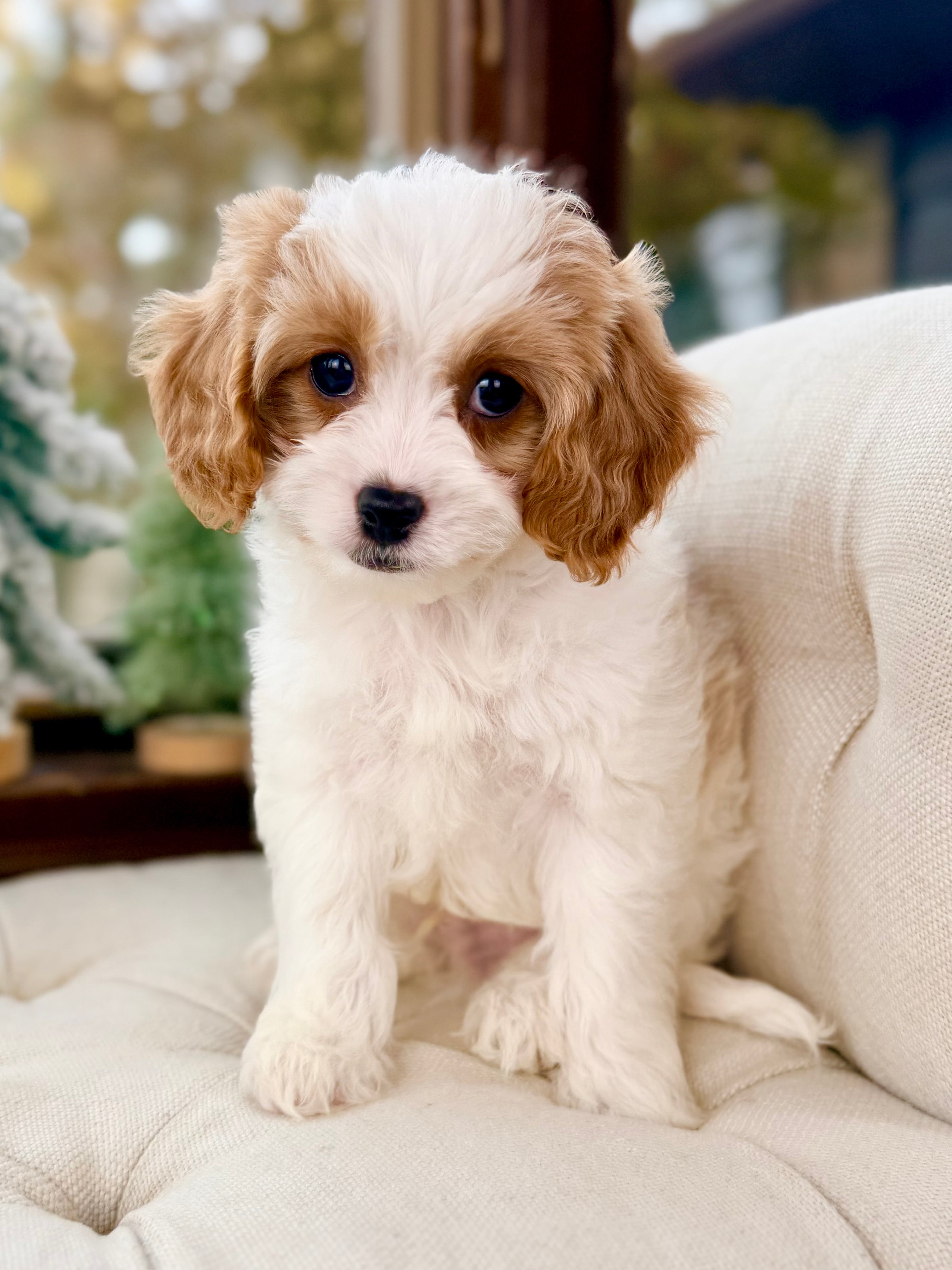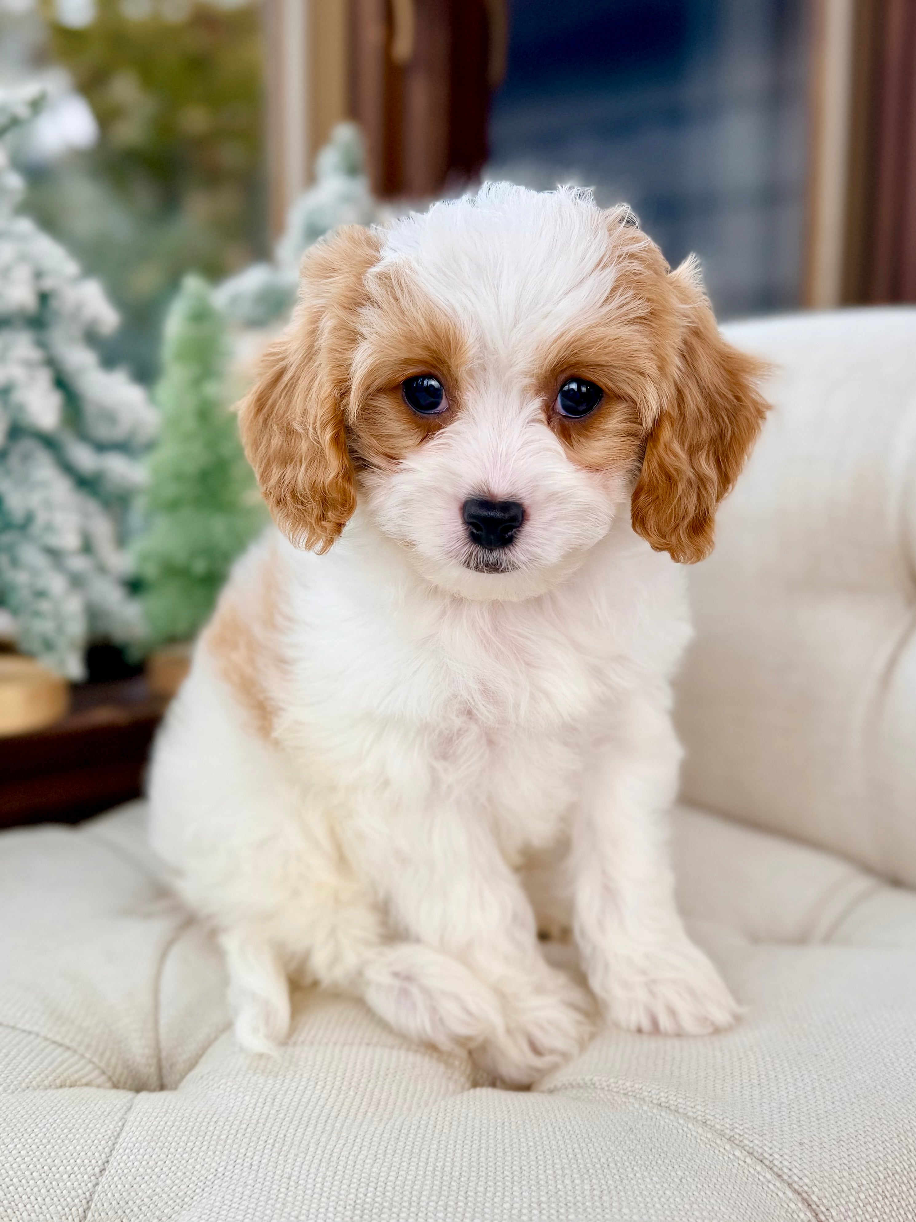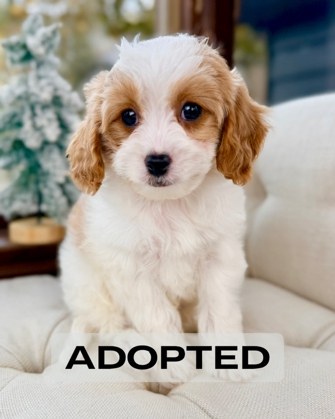 George is 9 weeks old and 3.4 lbs, with a soft wavy Blenheim coat and an affectionate, gentle nature. He’s social, playful, and loves being around people.