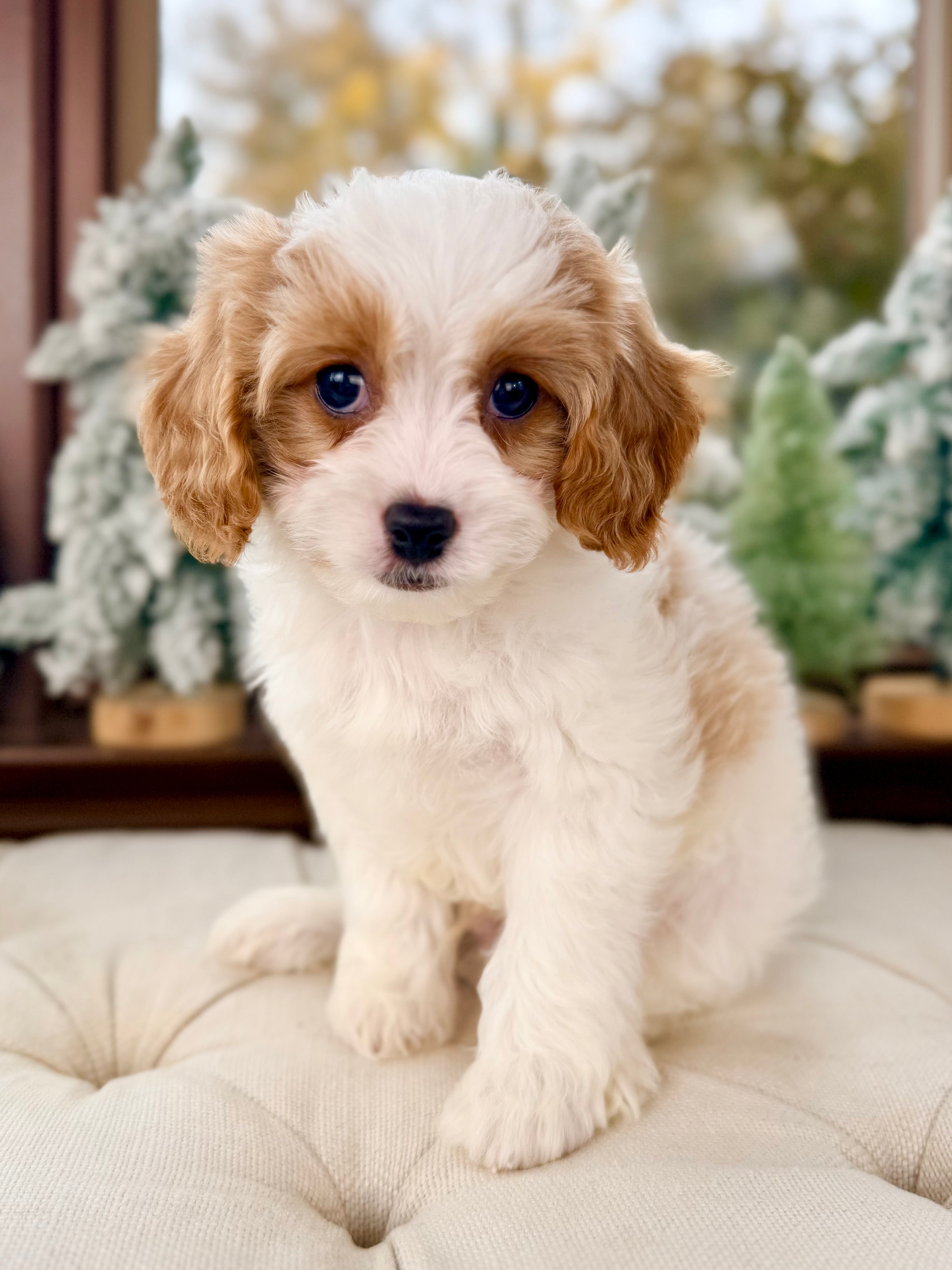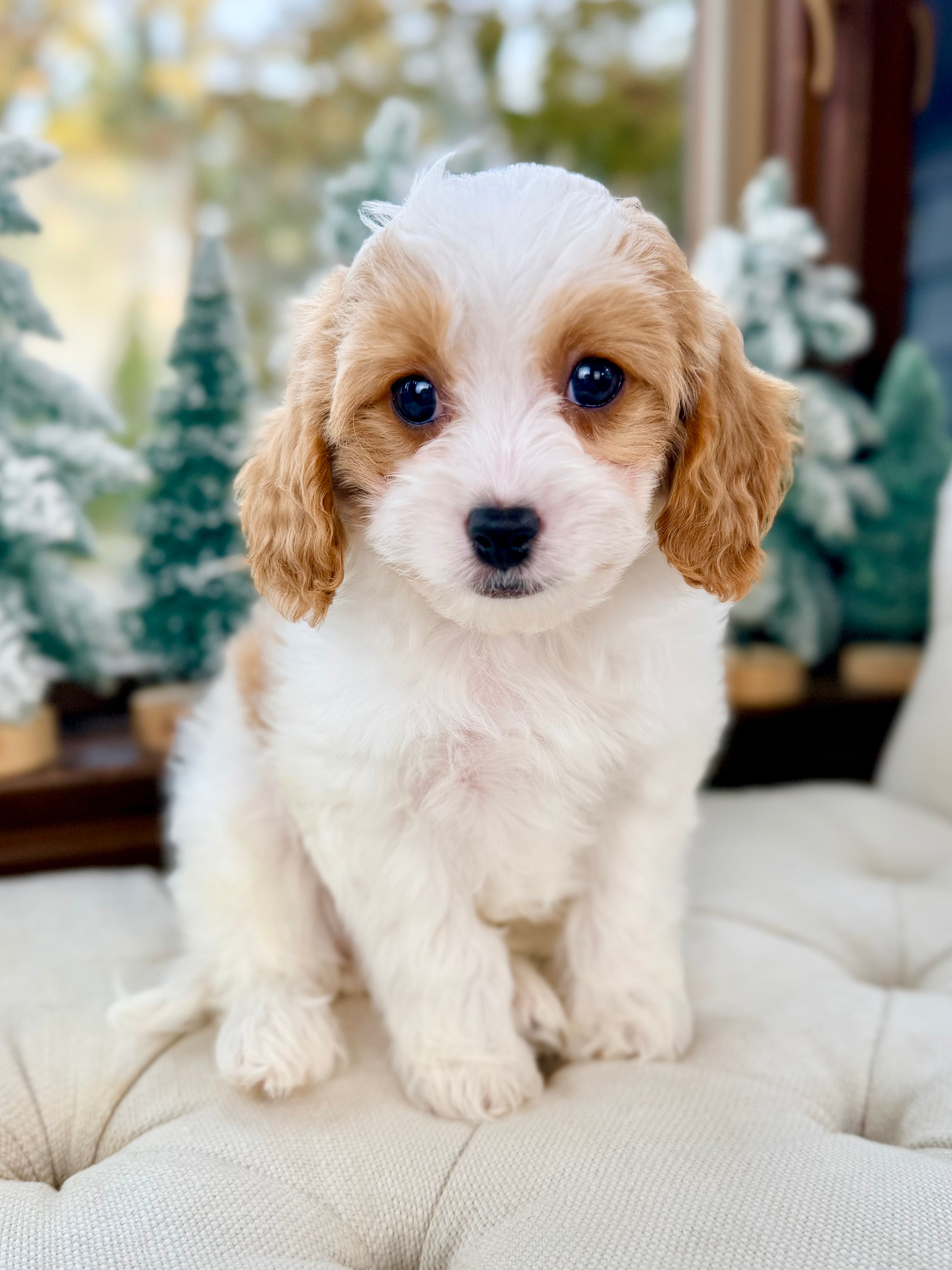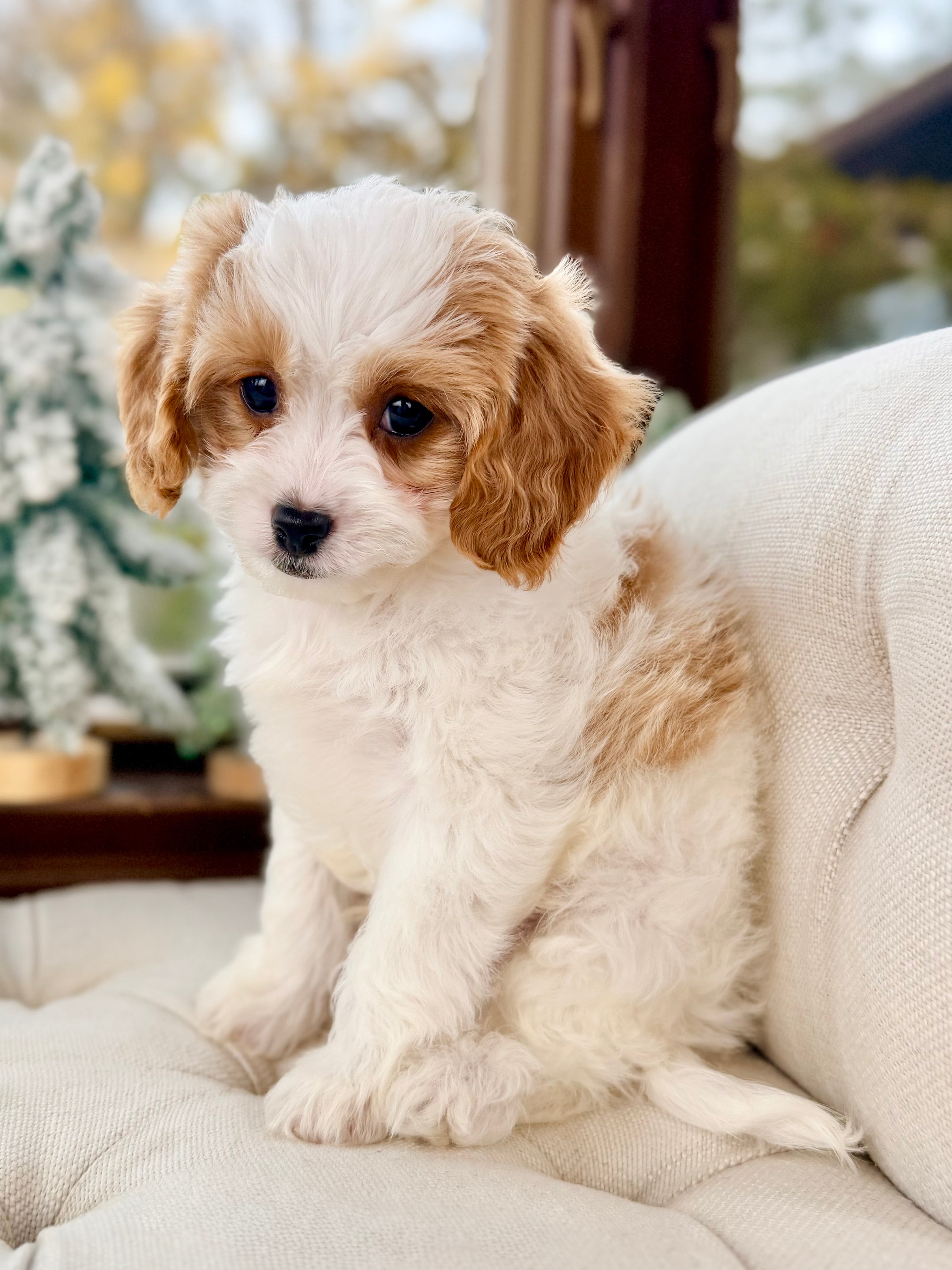 George is 9 weeks old and 3.4 lbs, with a soft wavy Blenheim coat and an affectionate, gentle nature. He’s social, playful, and loves being around people.