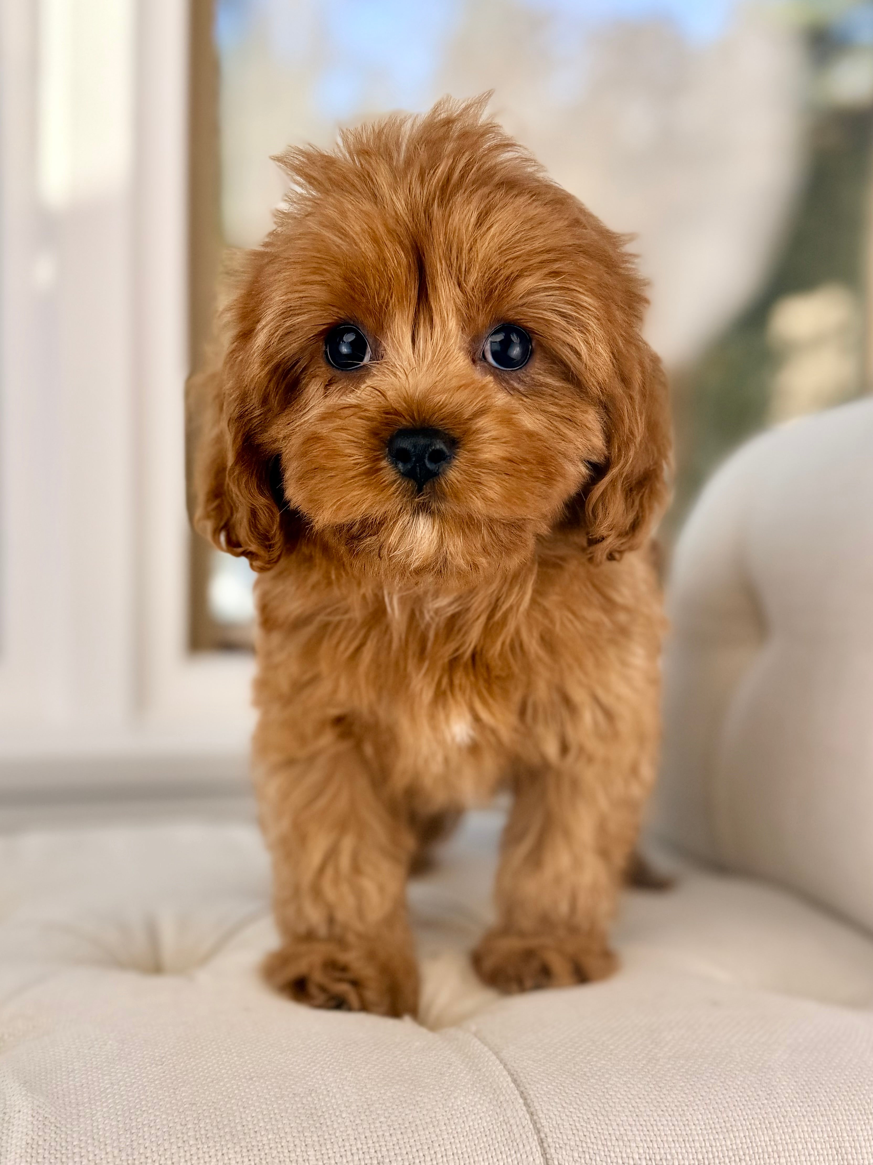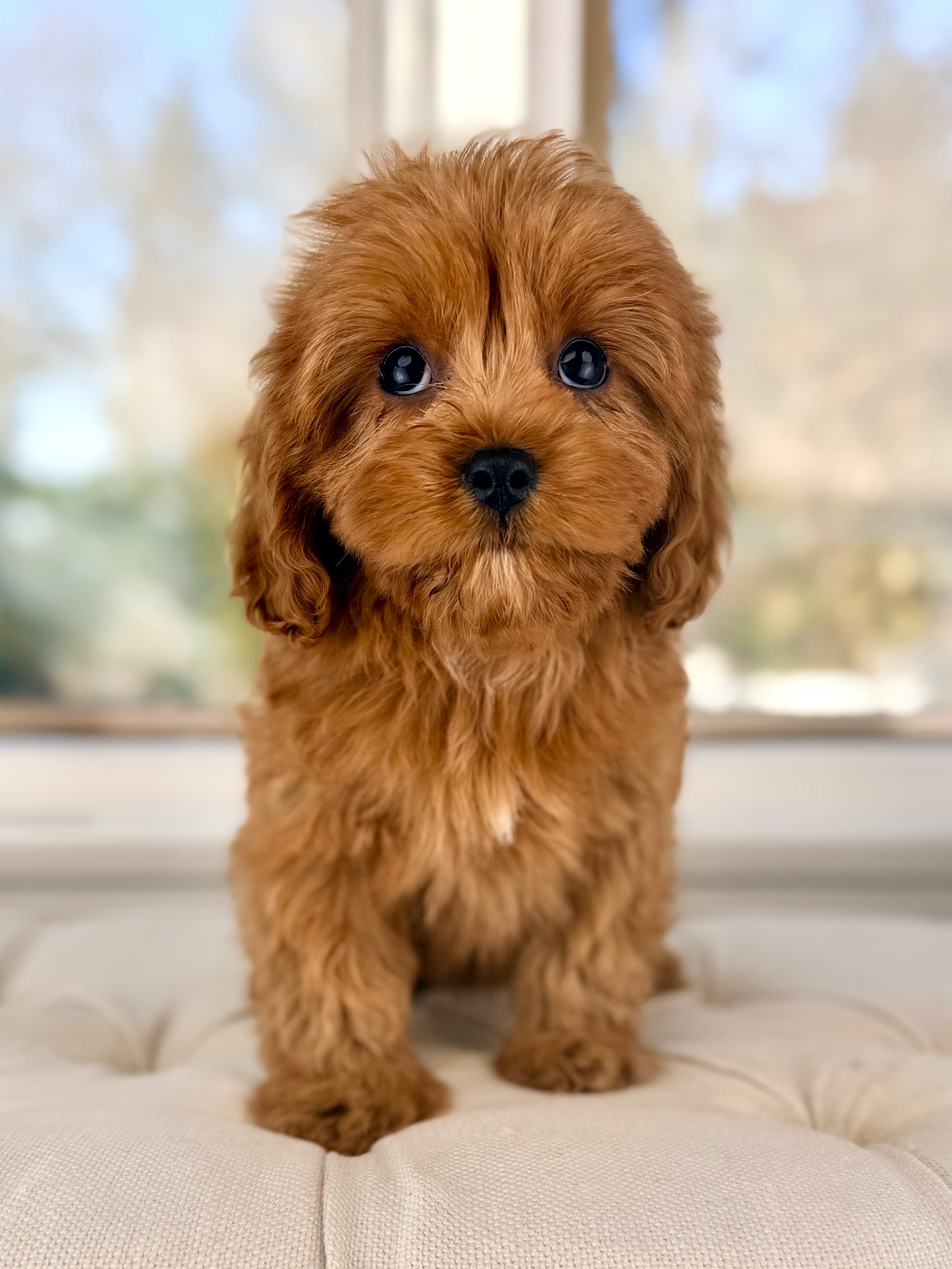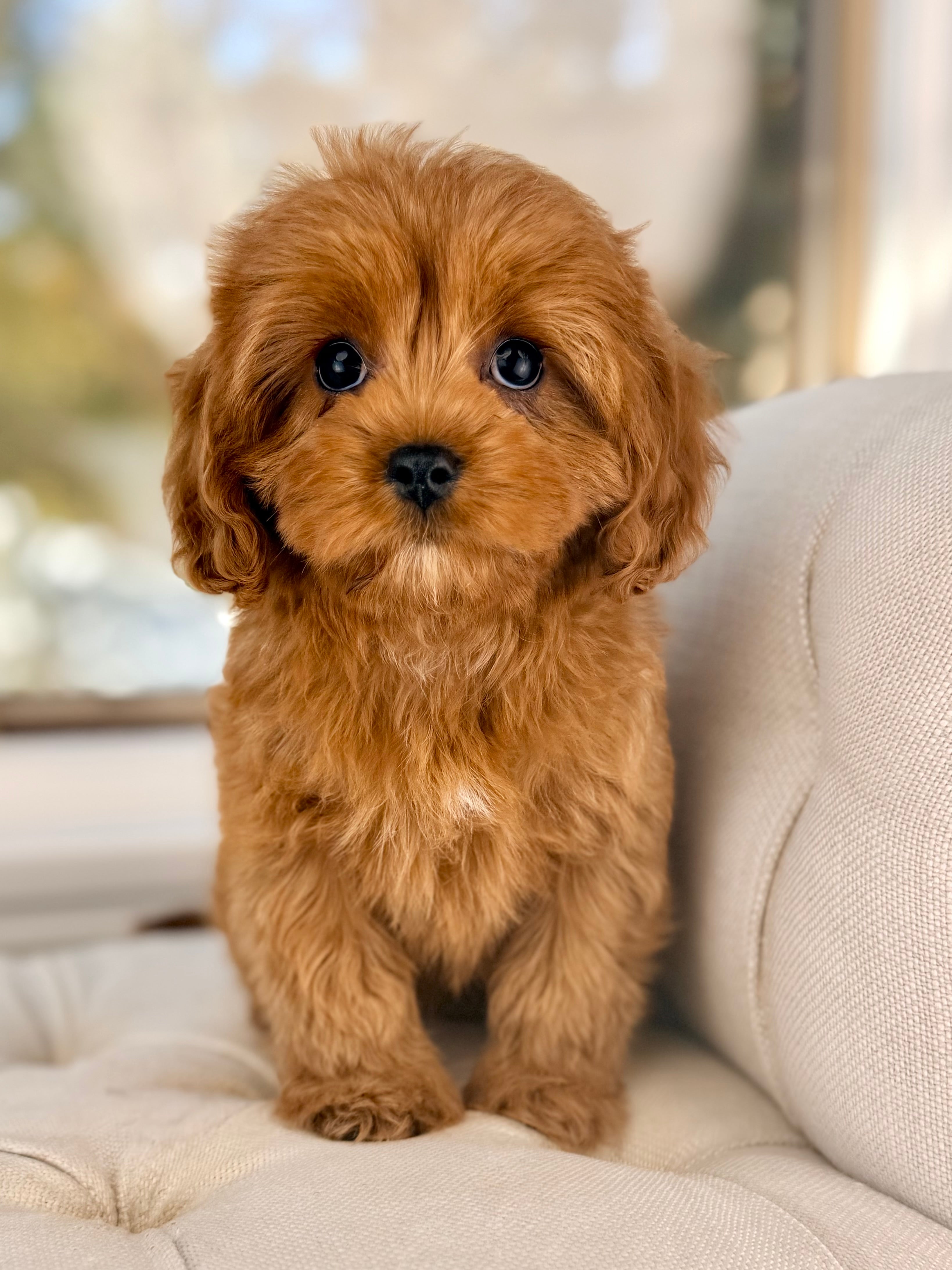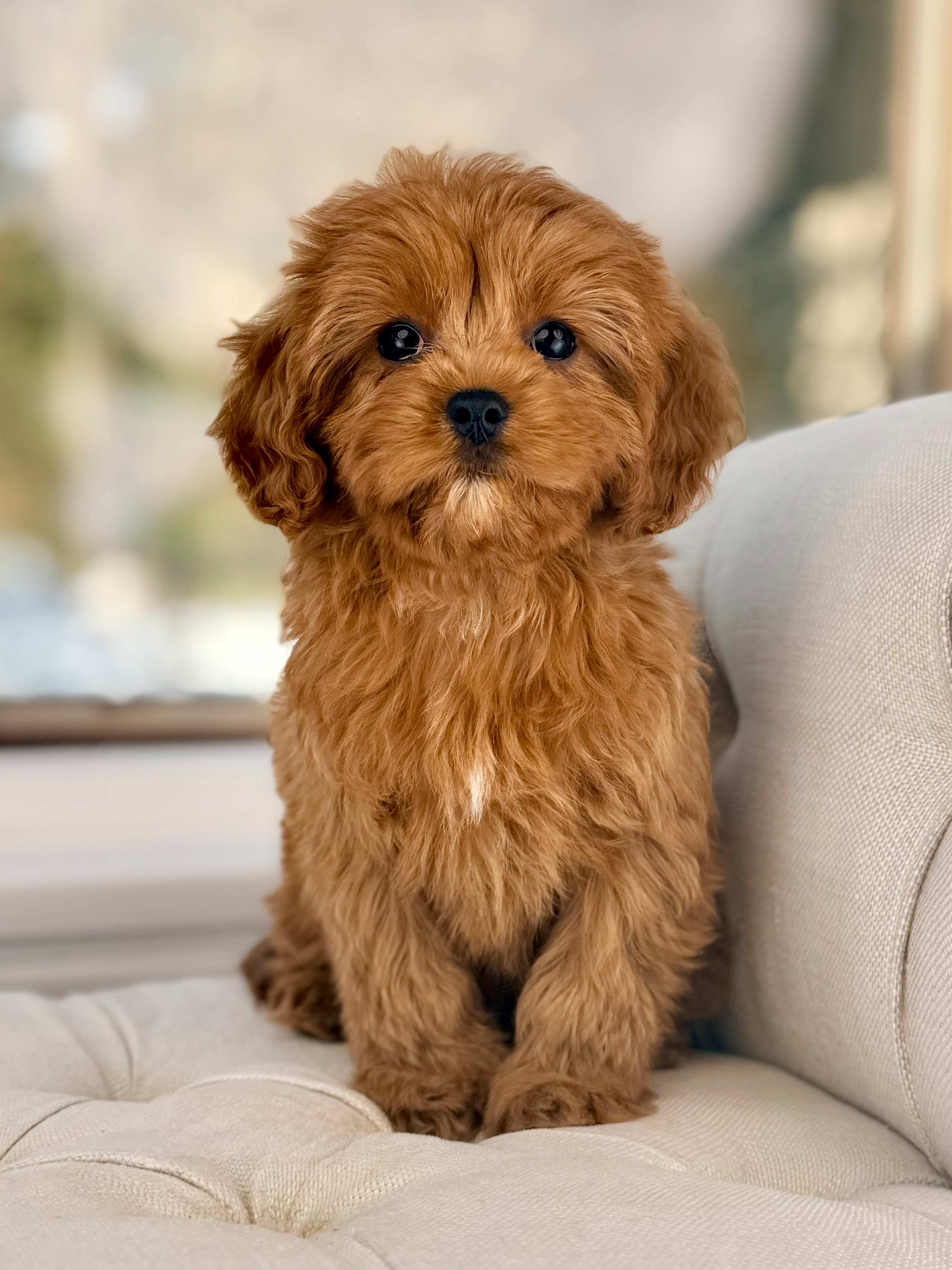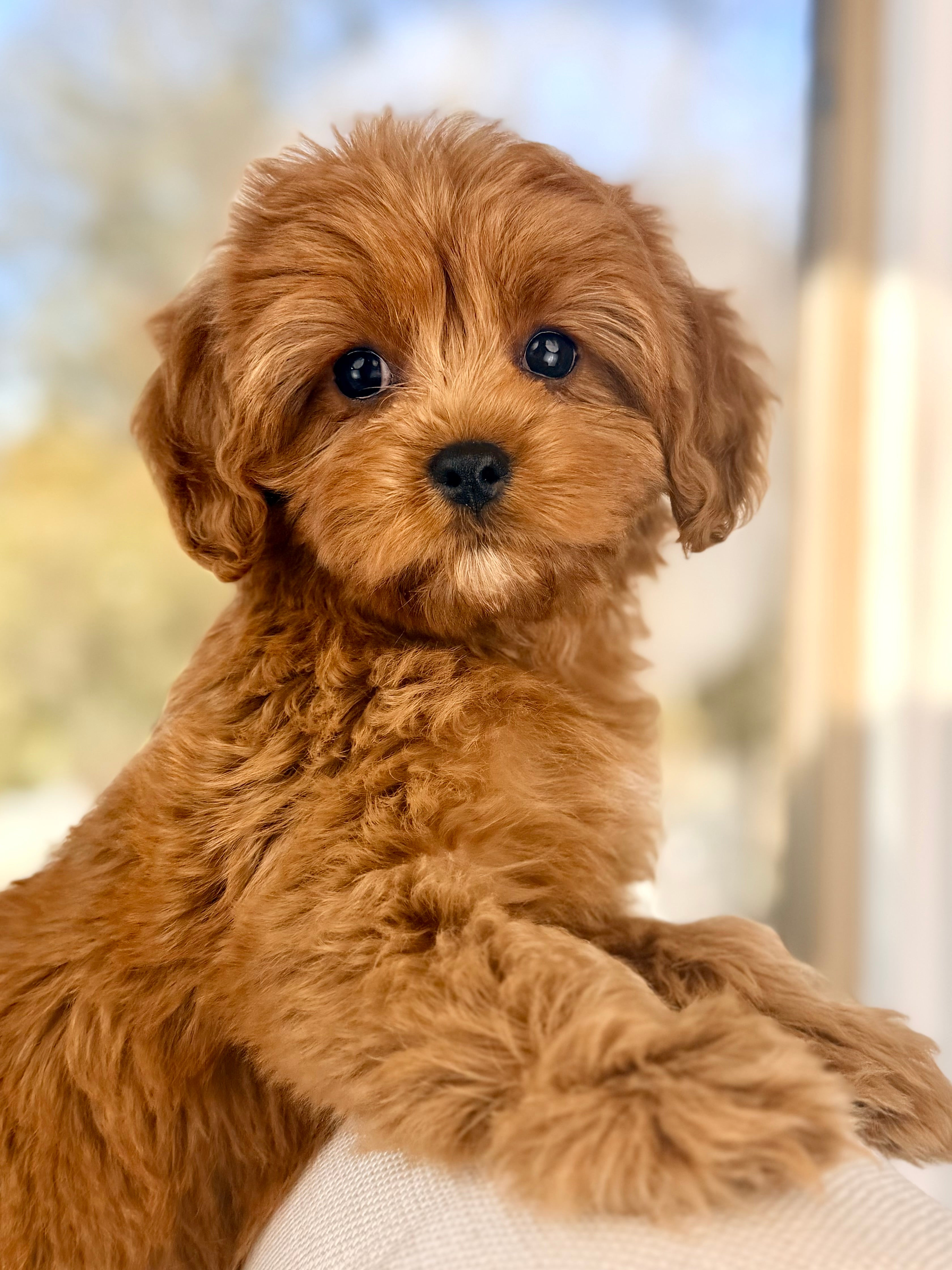 Harlow is currently 10 weeks old and weighs 3.5 lbs. She has a beautiful red coat with a soft, wavy, non-shedding texture and a sweet, affectionate personality. Harlow is gentle, people-oriented, and enjoys playful moments while also loving quiet cuddle time.