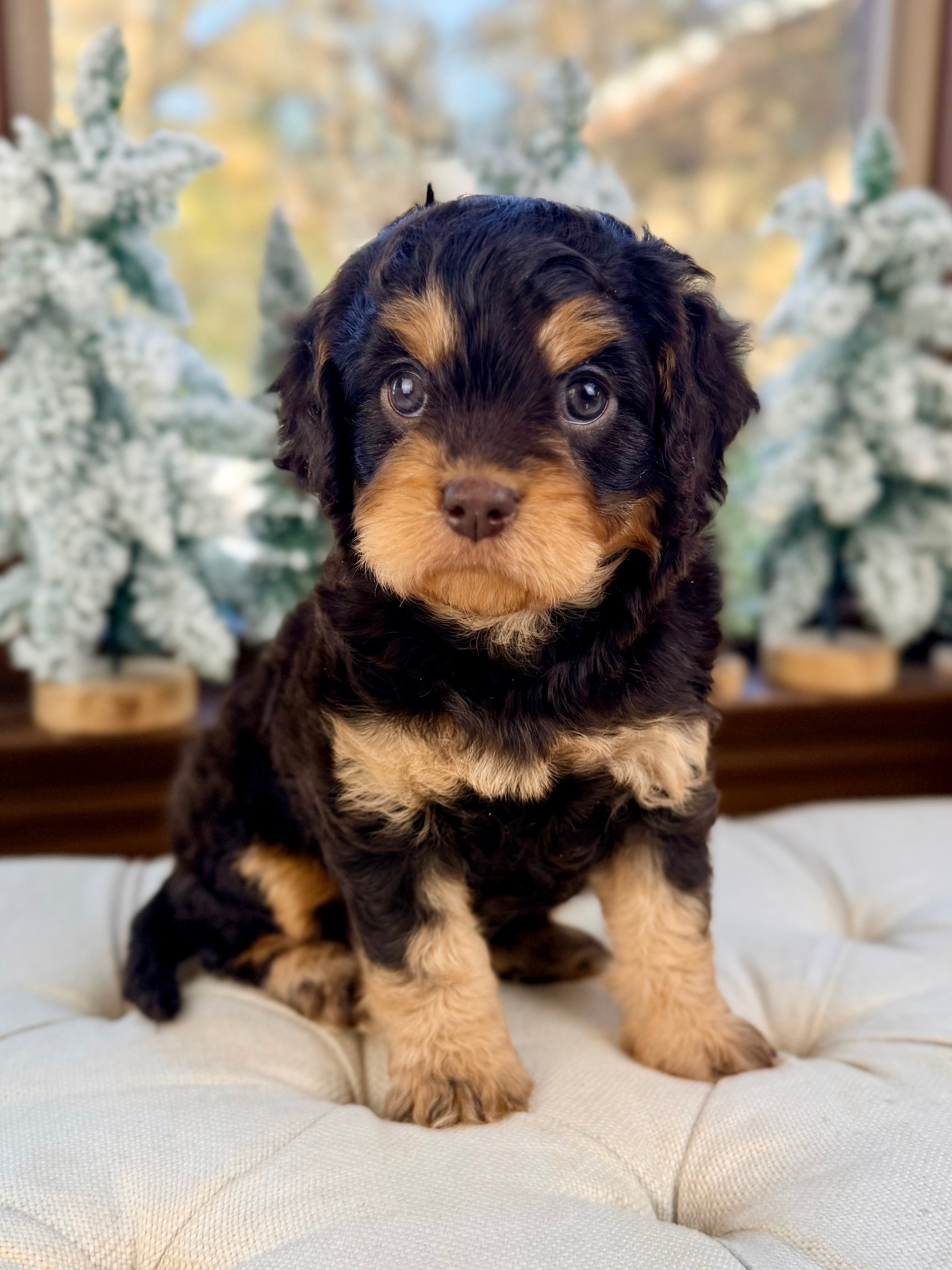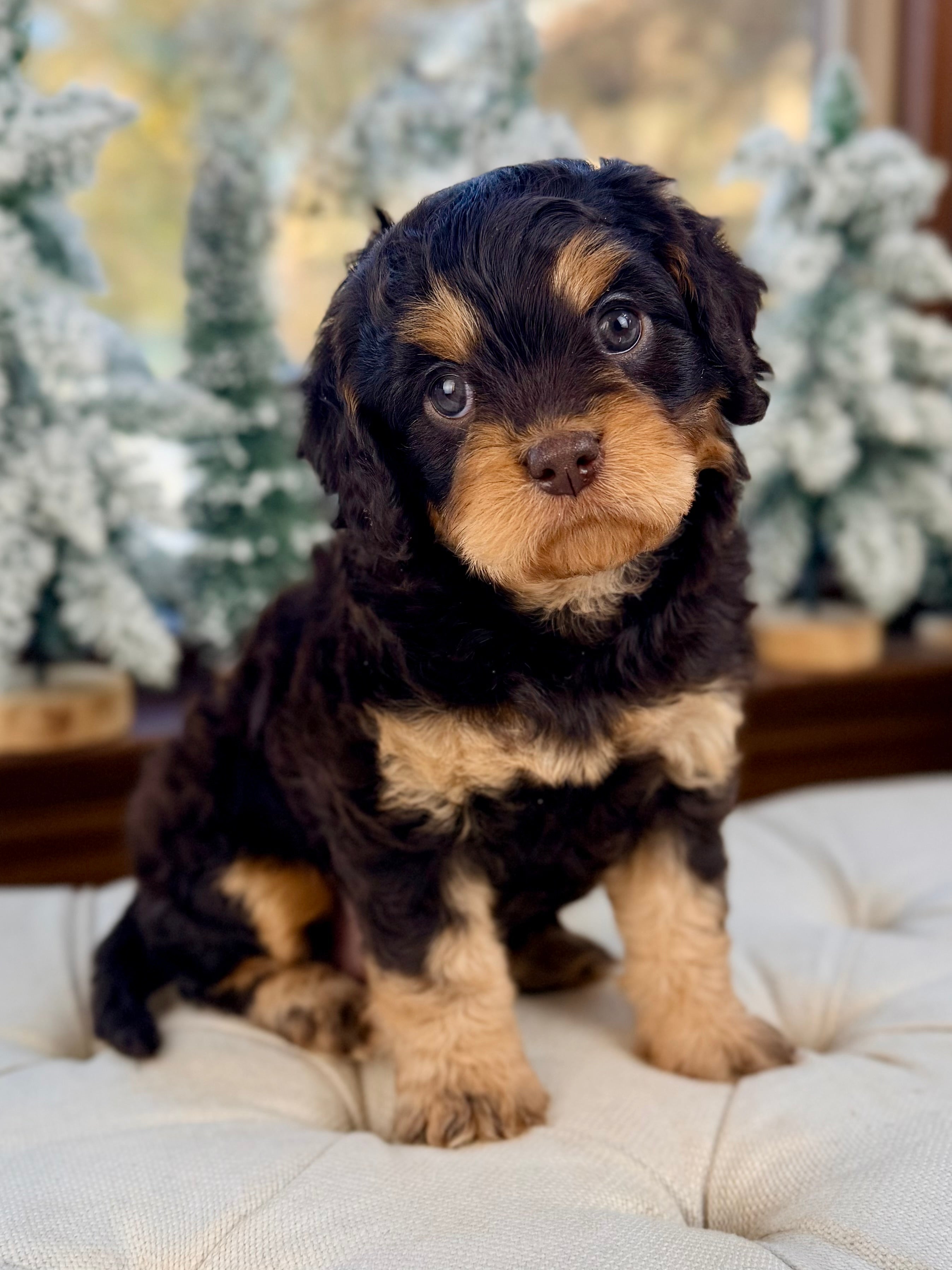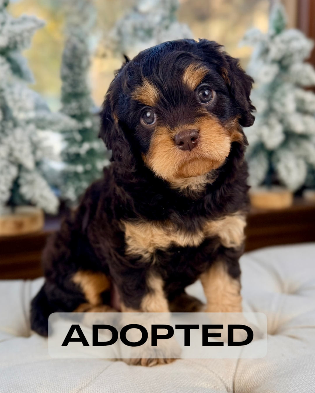 Holly is currently 7 weeks old and 4.1 lbs. She has a beautiful chocolate phantom wavy, non-shedding coat and a sweet, gentle personality. Holly is affectionate, people-oriented, and enjoys both playful moments and quiet cuddles.