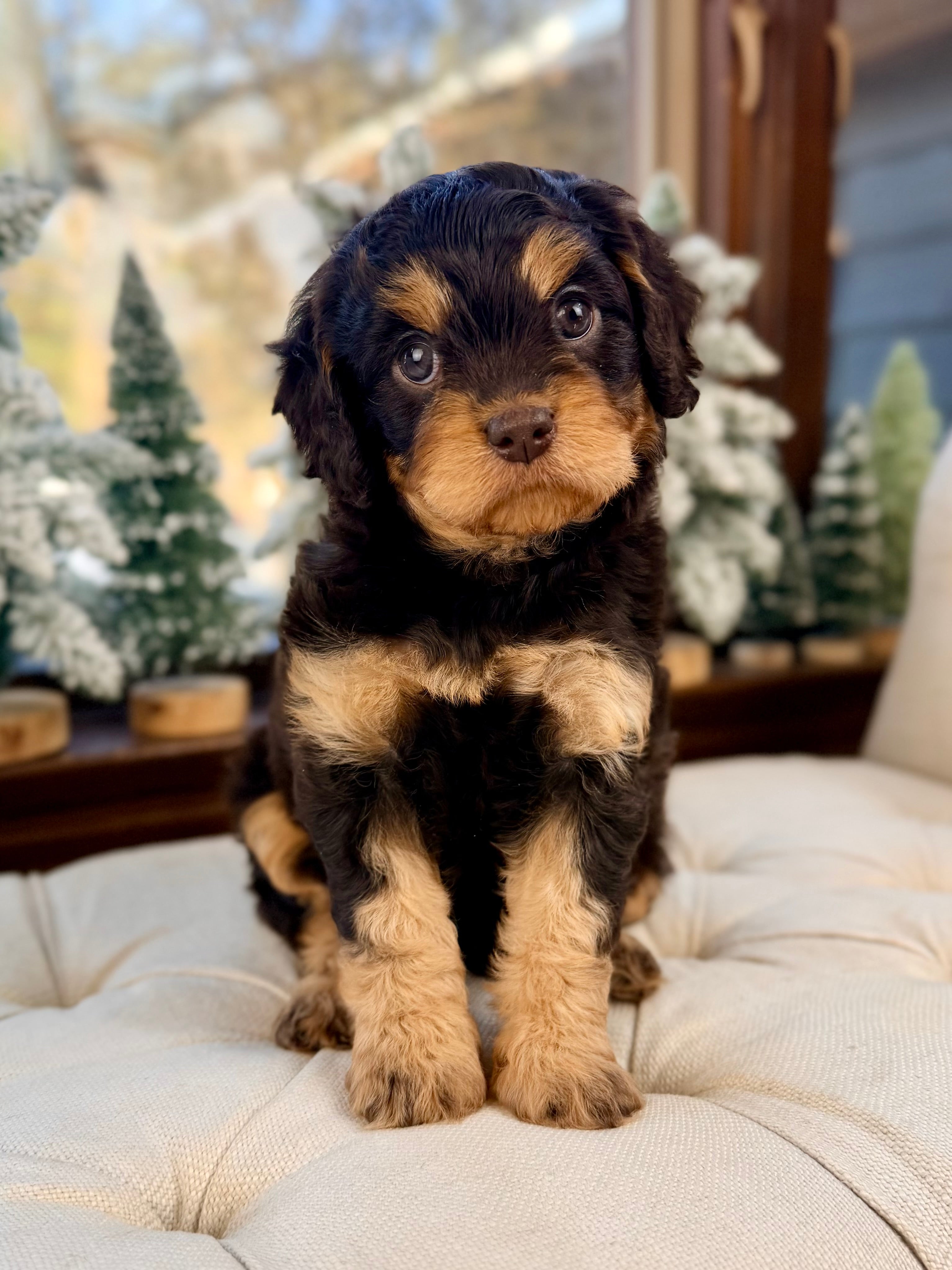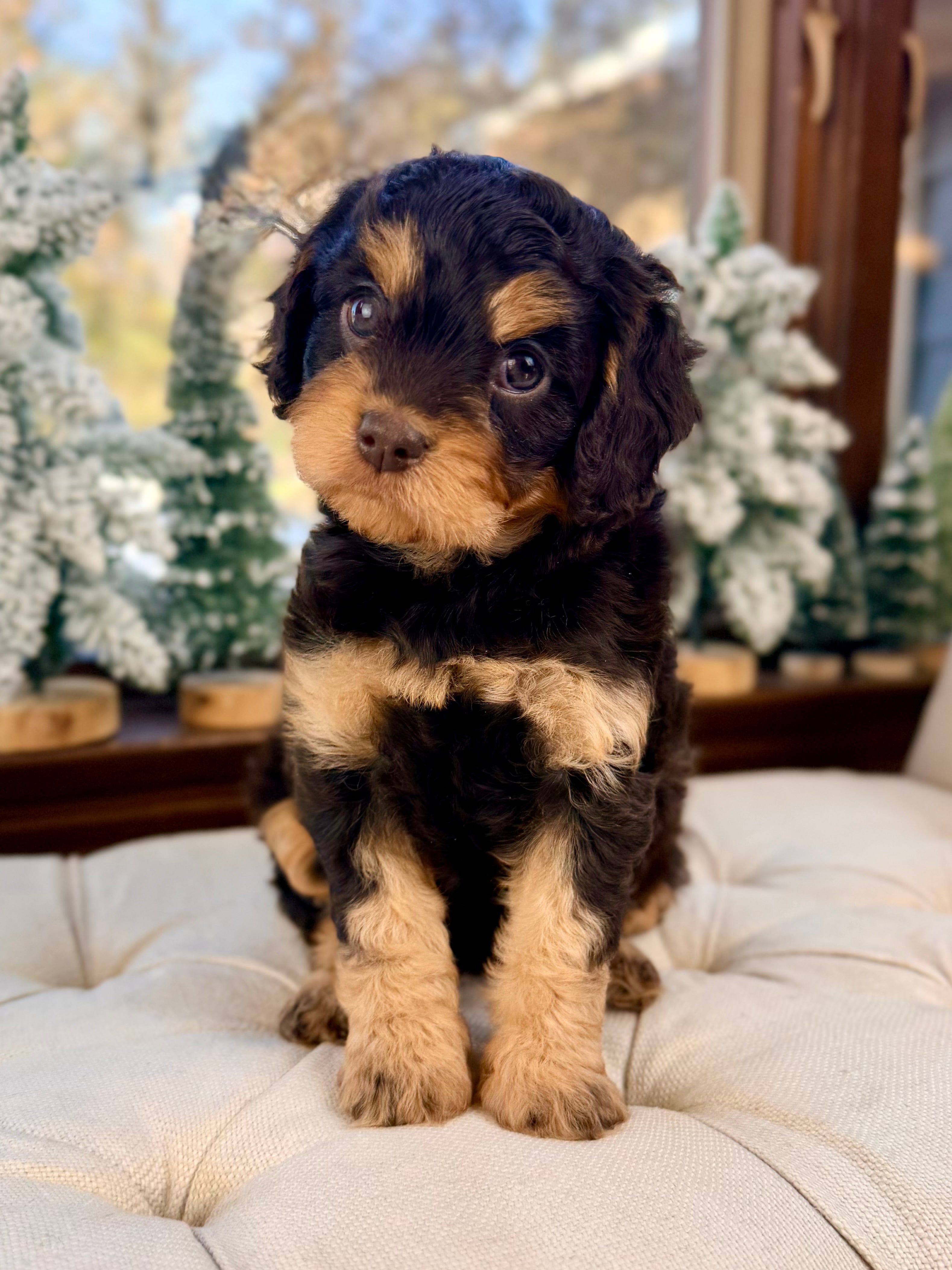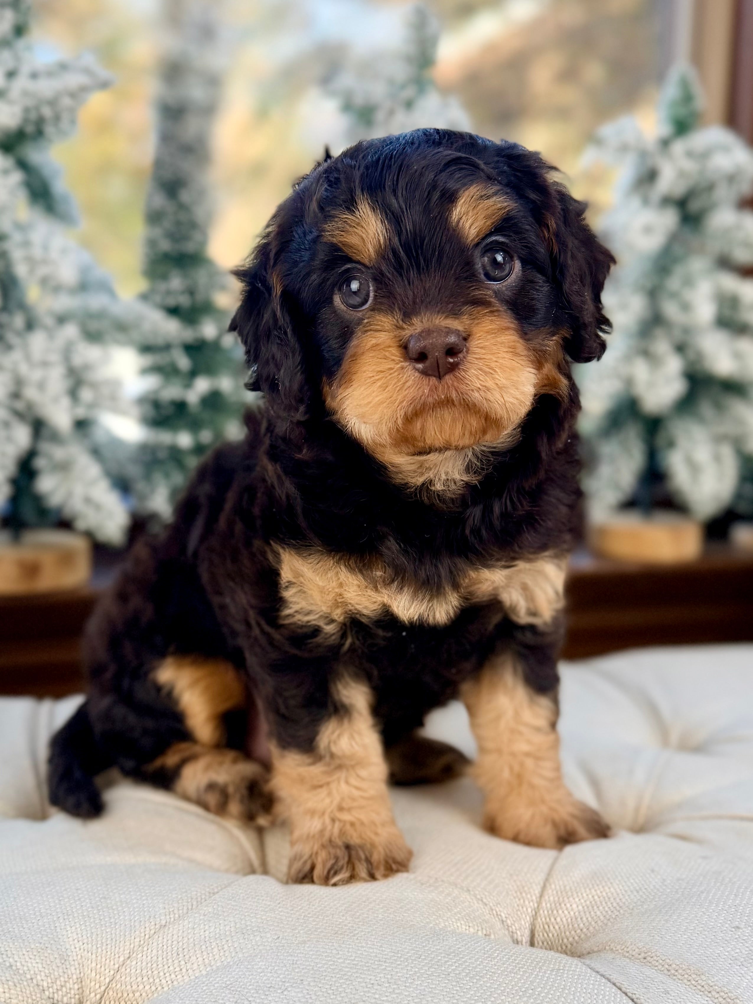 Holly is currently 7 weeks old and 4.1 lbs. She has a beautiful chocolate phantom wavy, non-shedding coat and a sweet, gentle personality. Holly is affectionate, people-oriented, and enjoys both playful moments and quiet cuddles.