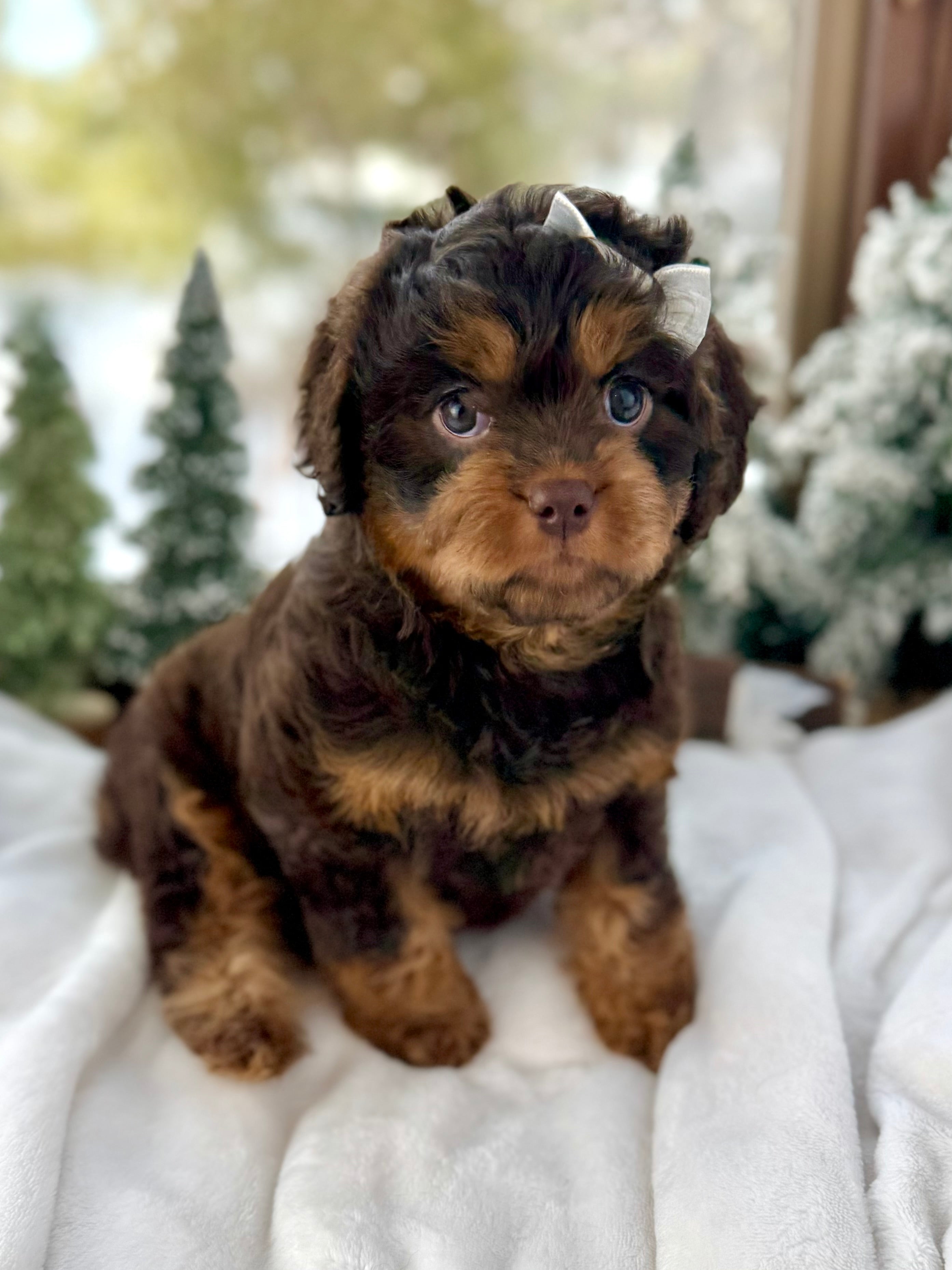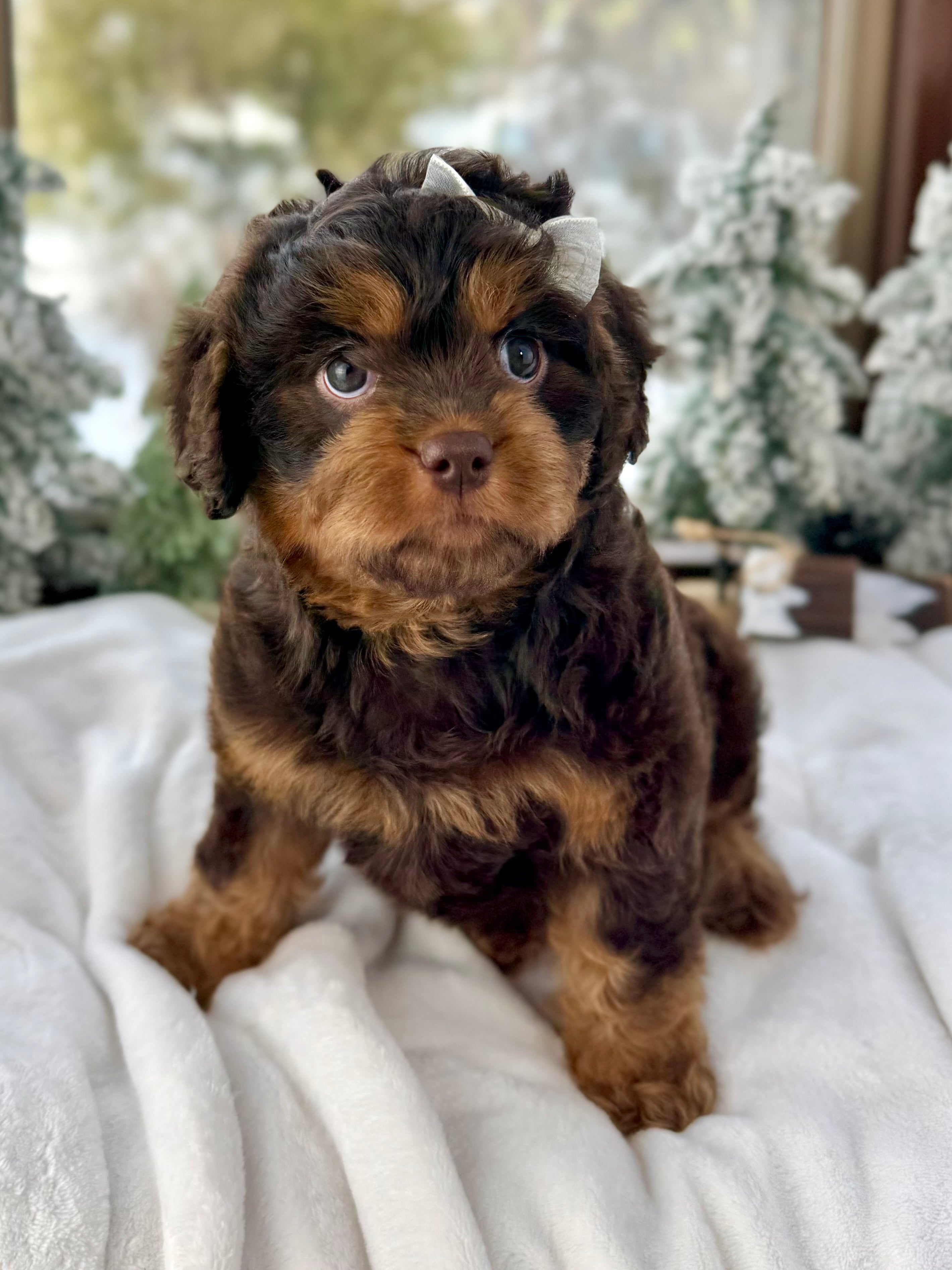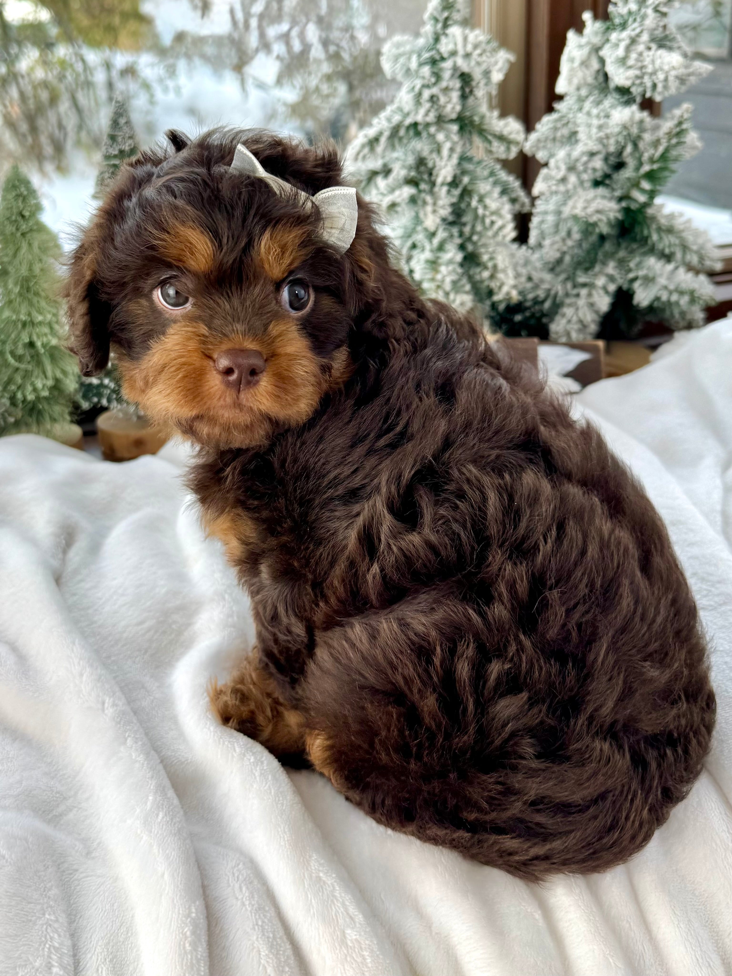 Joy is currently 7 weeks old and 4.3 lbs. She has a stunning wavy chocolate phantom coat and a calm, affectionate nature. Joy is playful yet gentle, loves cuddling, and enjoys being close to her people.