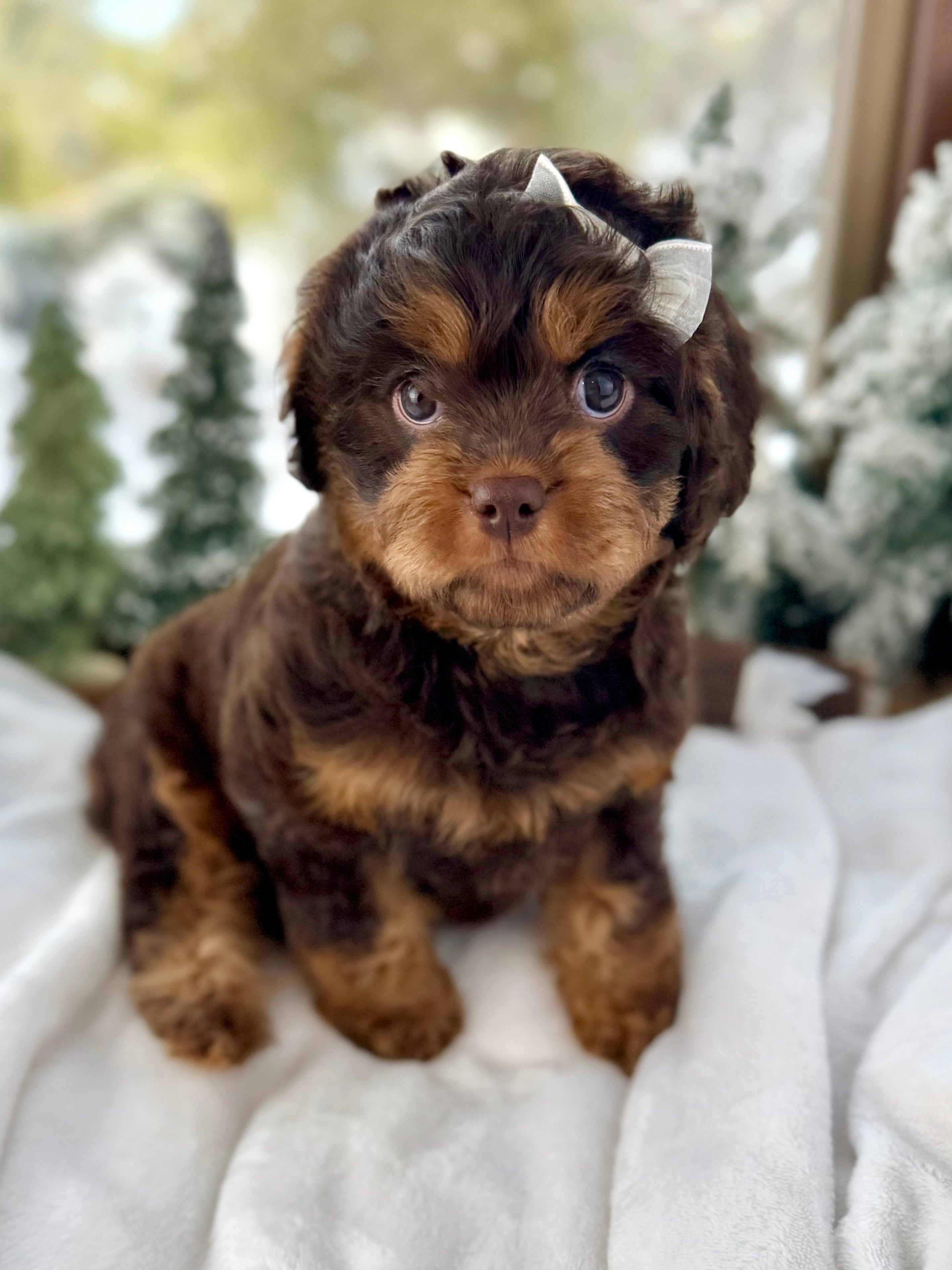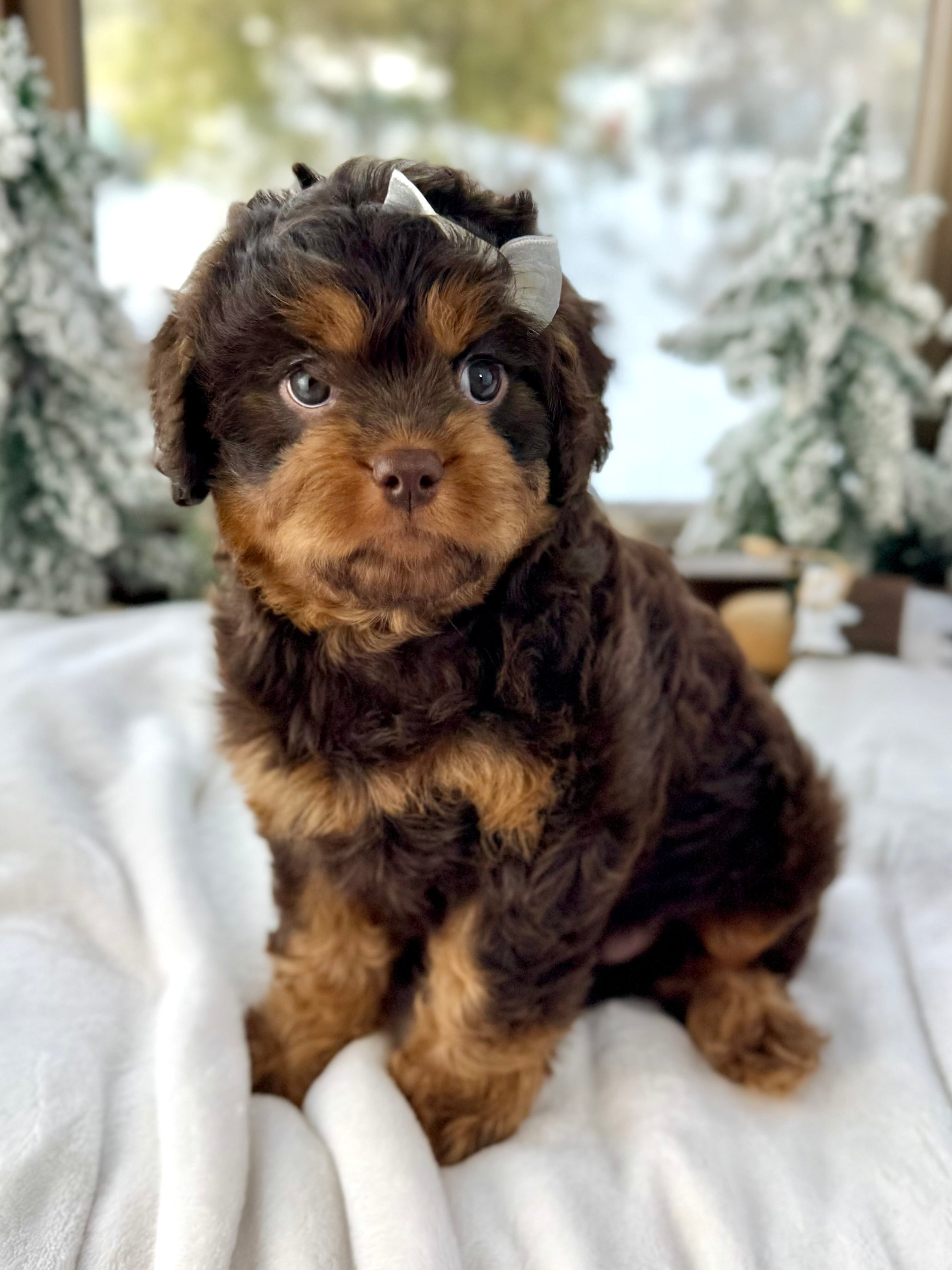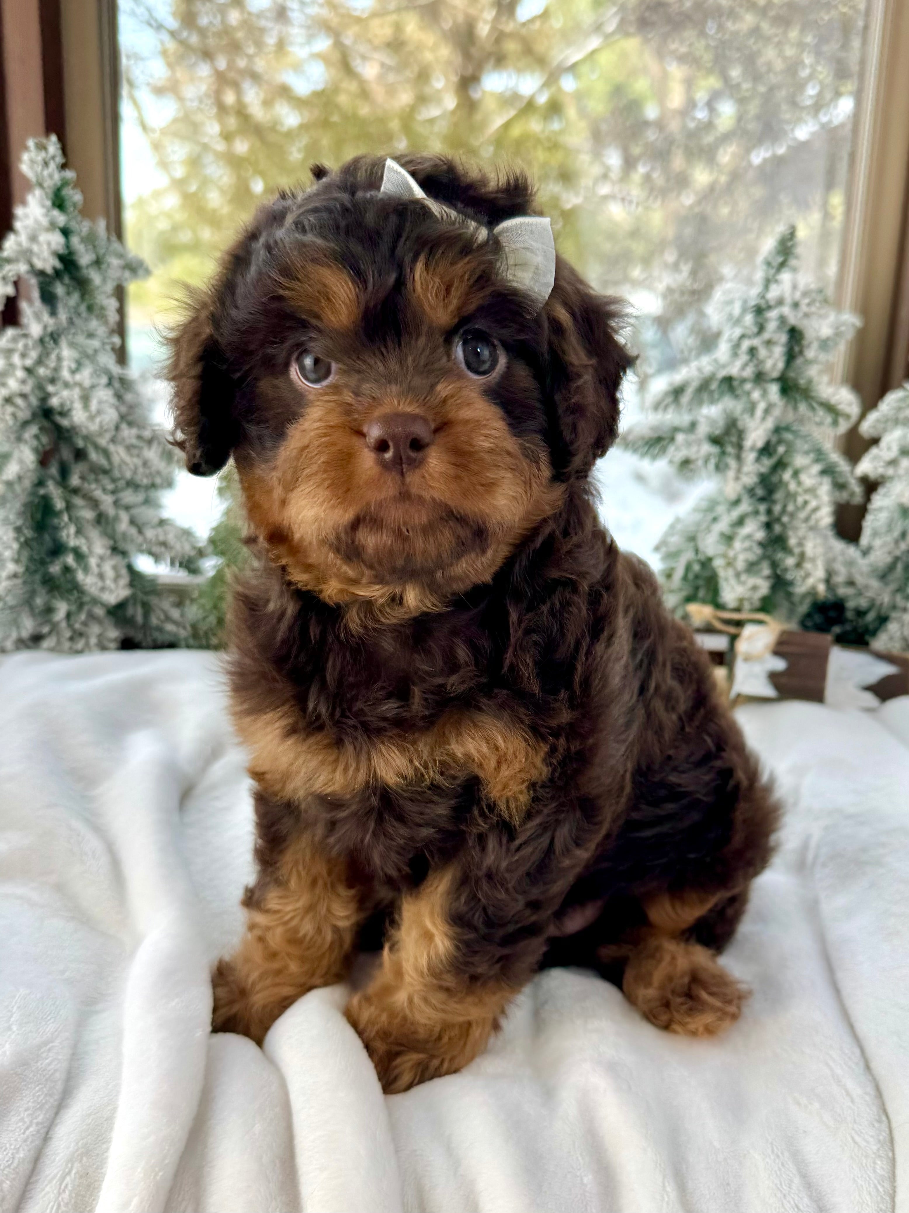 Joy is currently 7 weeks old and 4.3 lbs. She has a stunning wavy chocolate phantom coat and a calm, affectionate nature. Joy is playful yet gentle, loves cuddling, and enjoys being close to her people.