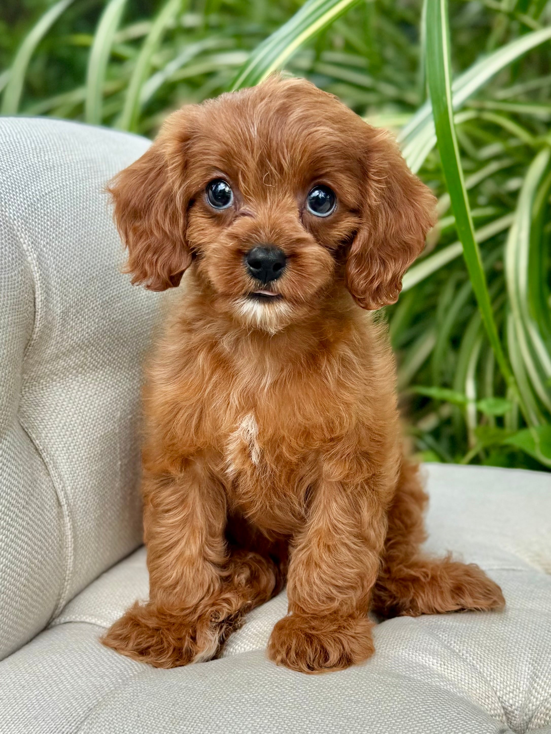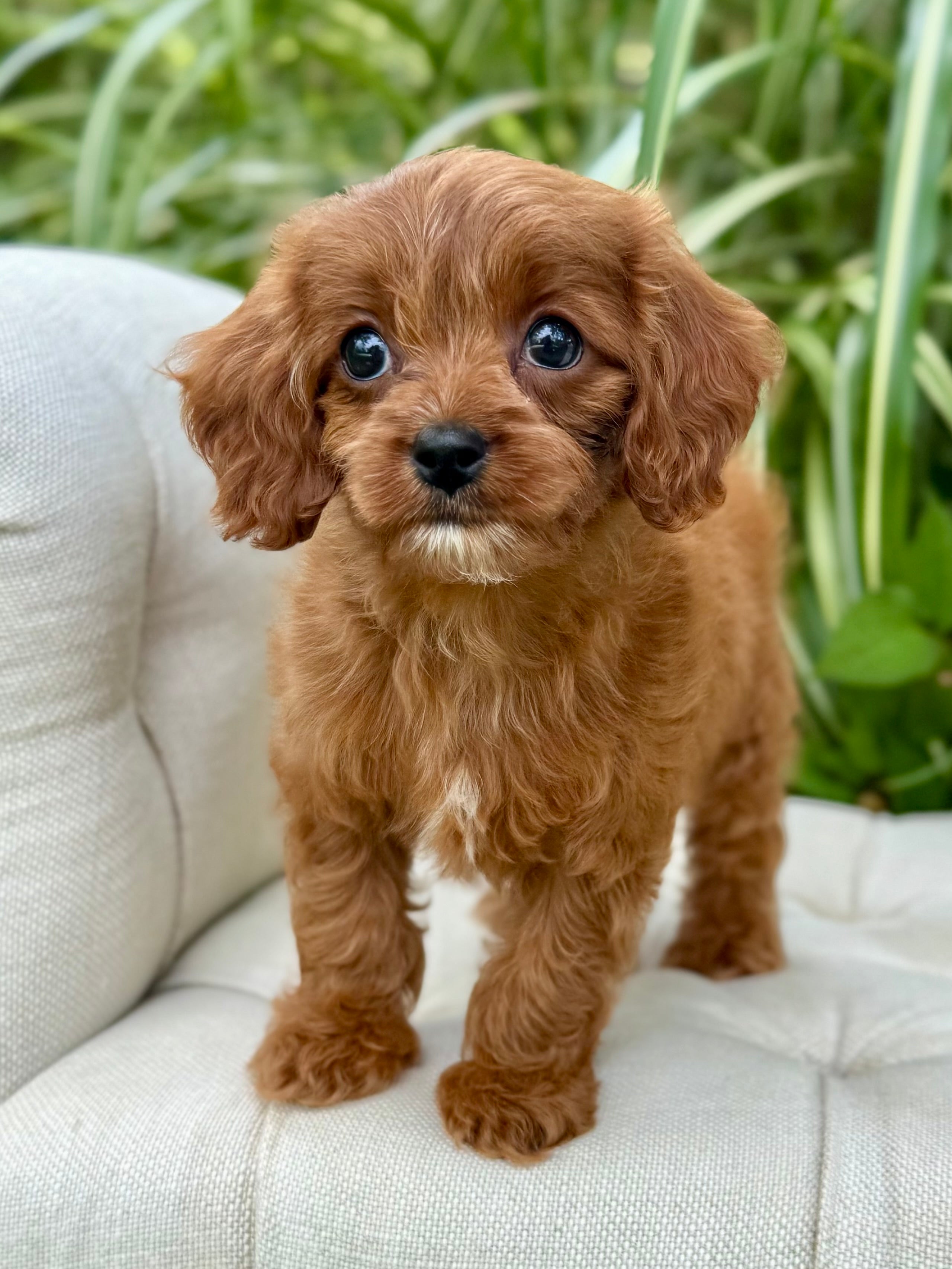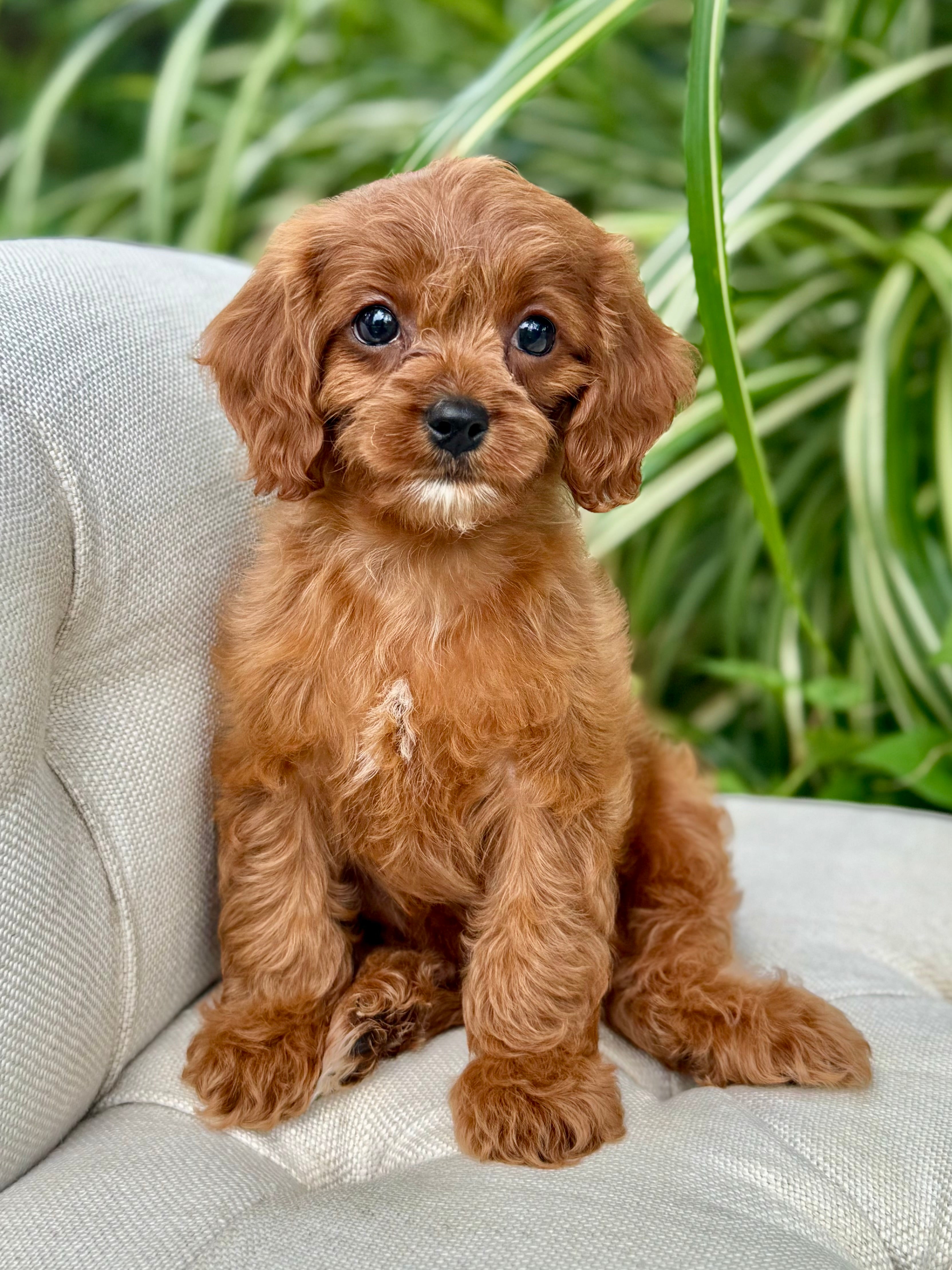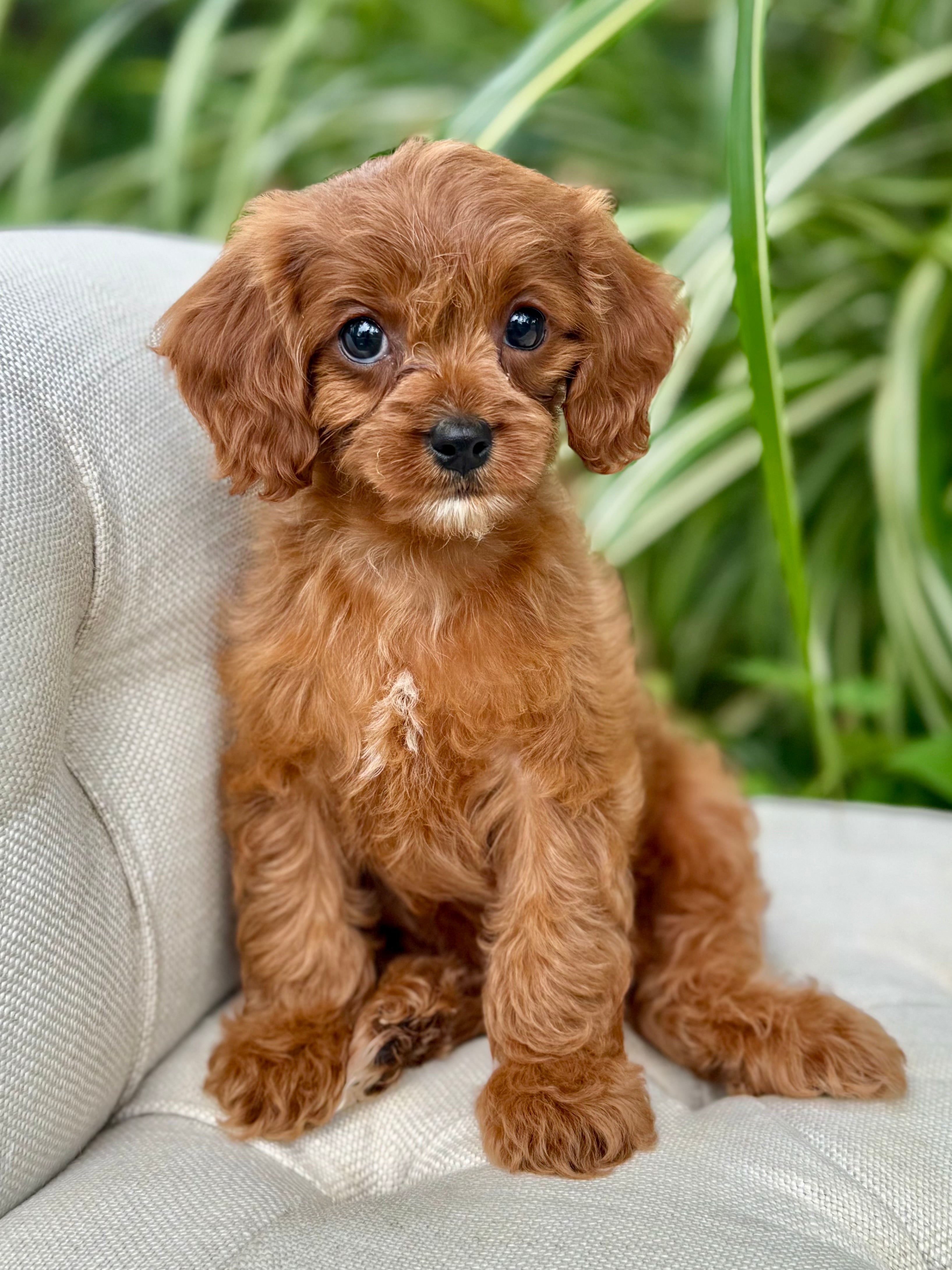 Juna is a 8-week-old F1 Cavapoo with a soft, dark, red wavy coat and a calm, affectionate personality. She’s a happy little girl who enjoys exploring her surroundings but is always content to settle in for cuddles. Born on June 15th and currently weighing 2.7 lbs, Juna is expected to be 8–12 lbs full grown. Her mom, Ruth, is a 10 lb red Poodle, and her dad, Snickers, is a 16 lb Blenheim Cavalier—both genetically health tested to ensure strong, healthy puppies.