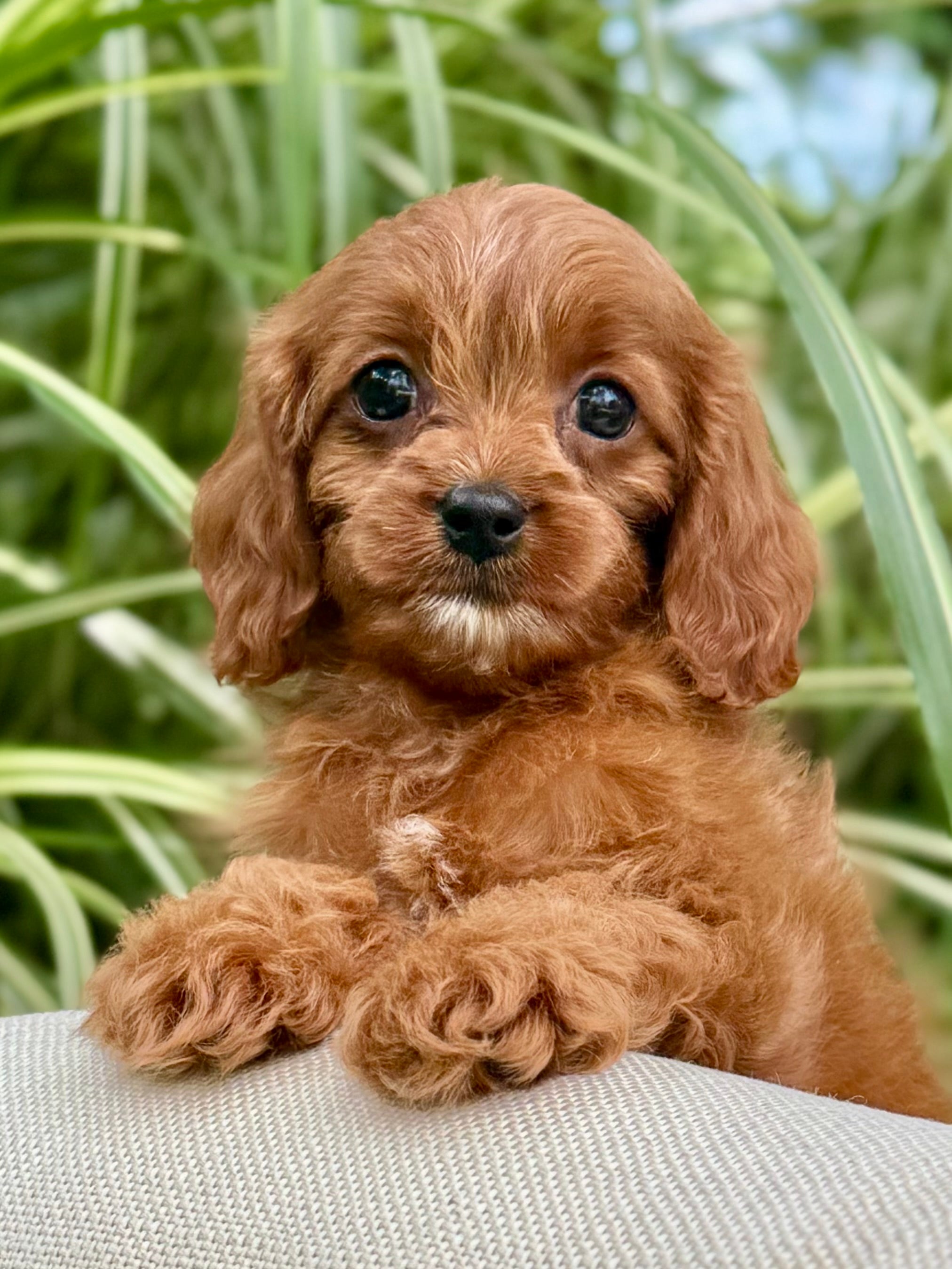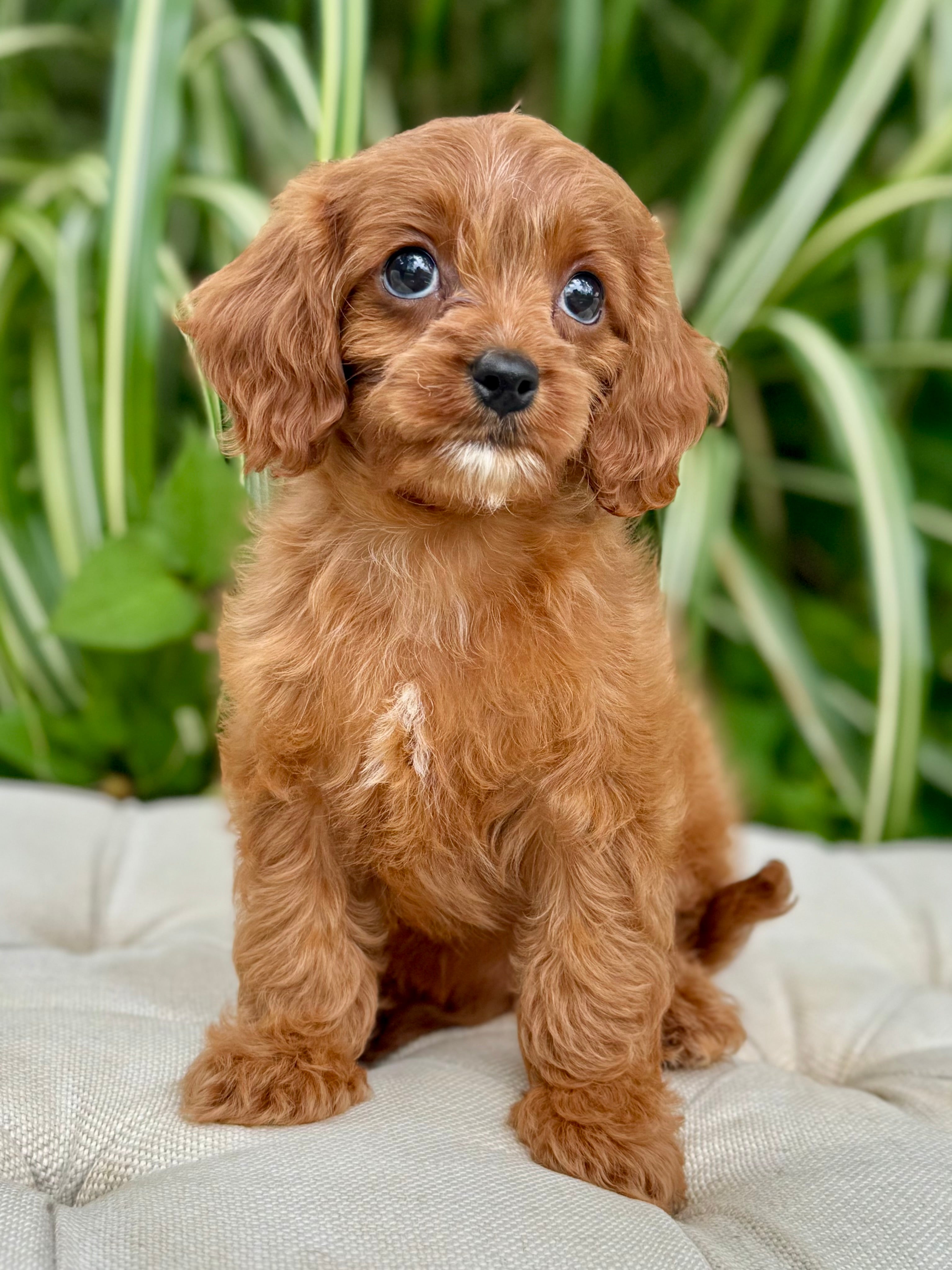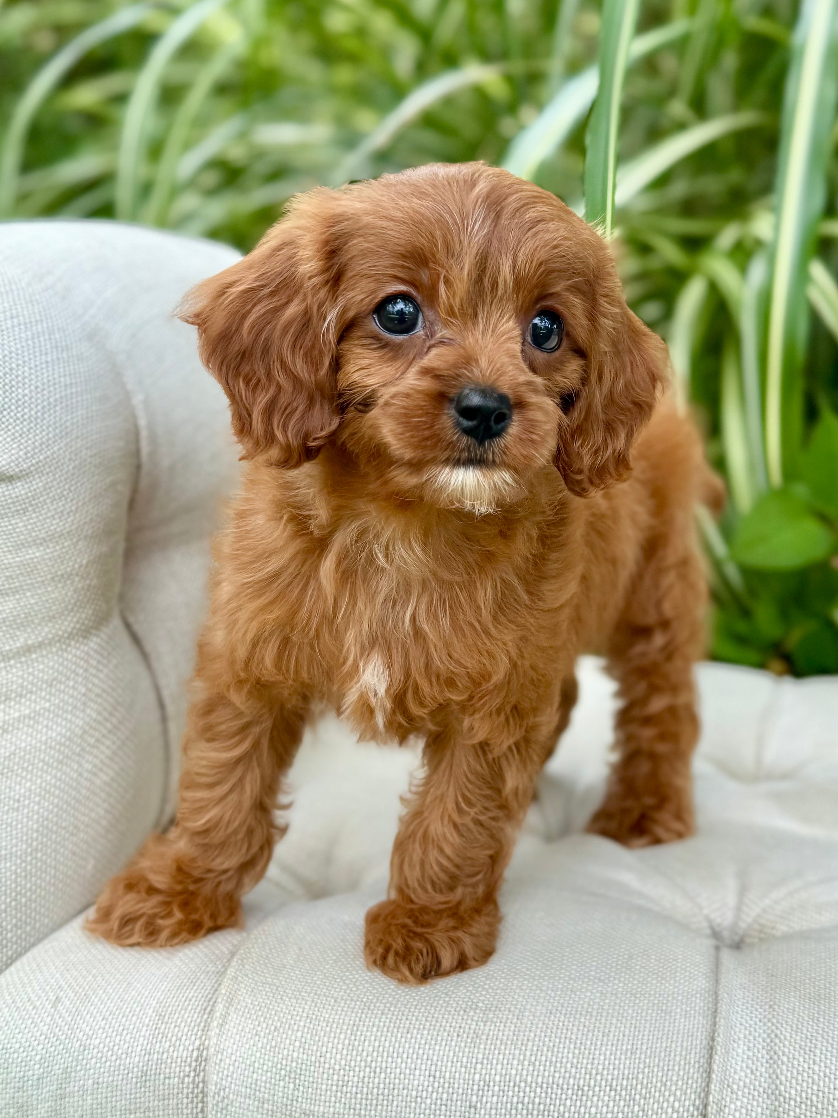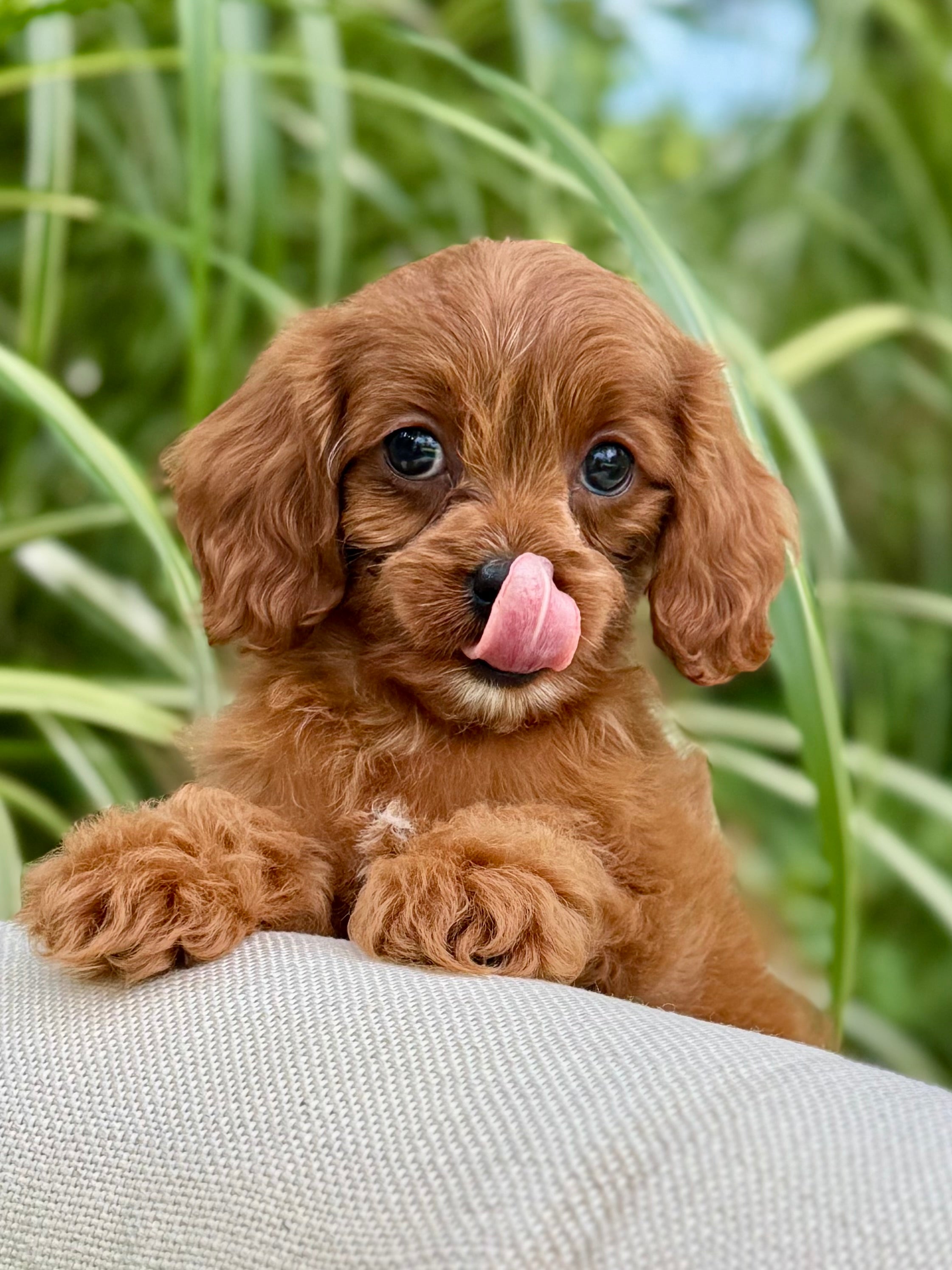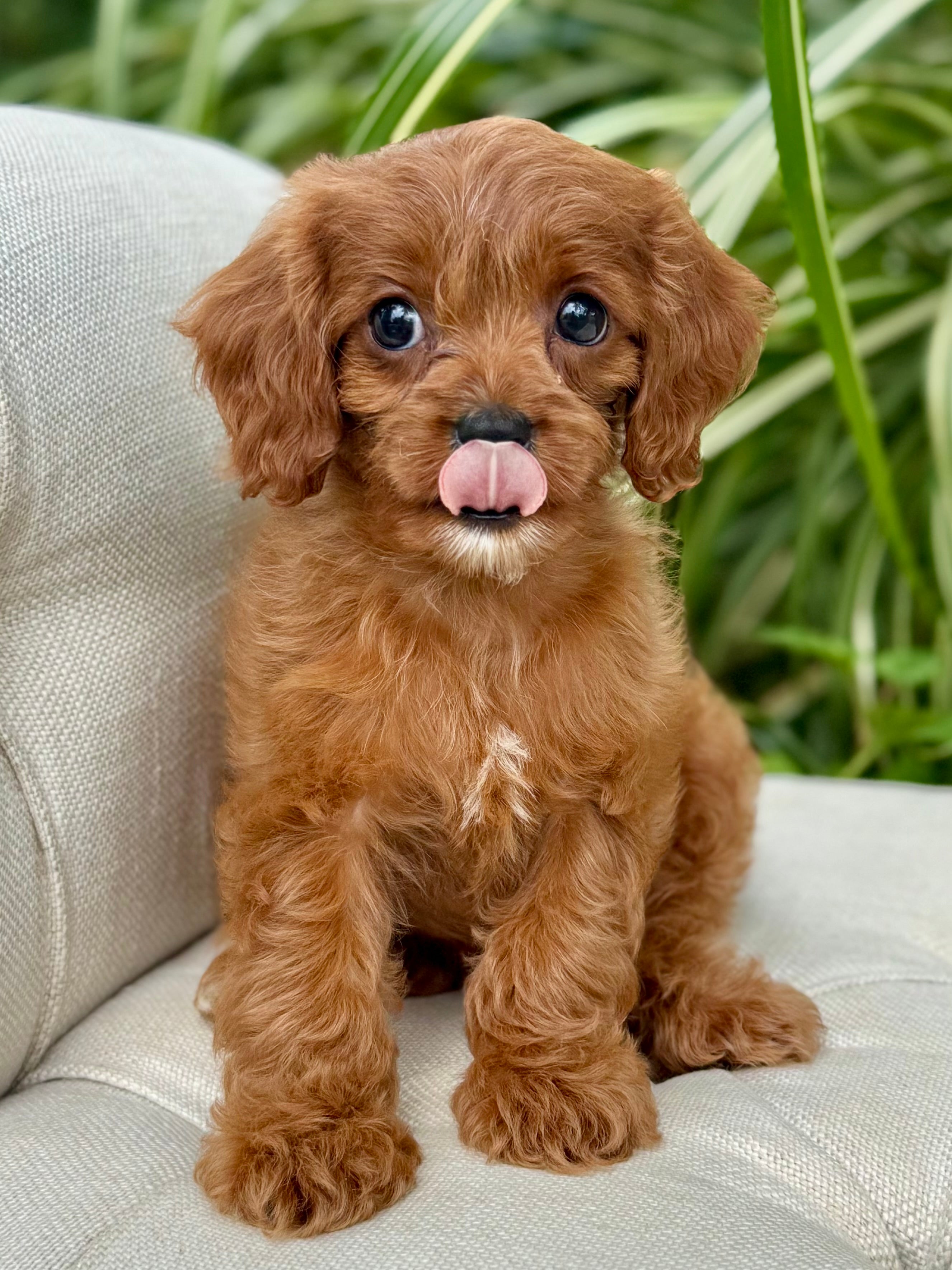 Juna is a 8-week-old F1 Cavapoo with a soft, dark, red wavy coat and a calm, affectionate personality. She’s a happy little girl who enjoys exploring her surroundings but is always content to settle in for cuddles. Born on June 15th and currently weighing 2.7 lbs, Juna is expected to be 8–12 lbs full grown. Her mom, Ruth, is a 10 lb red Poodle, and her dad, Snickers, is a 16 lb Blenheim Cavalier—both genetically health tested to ensure strong, healthy puppies.