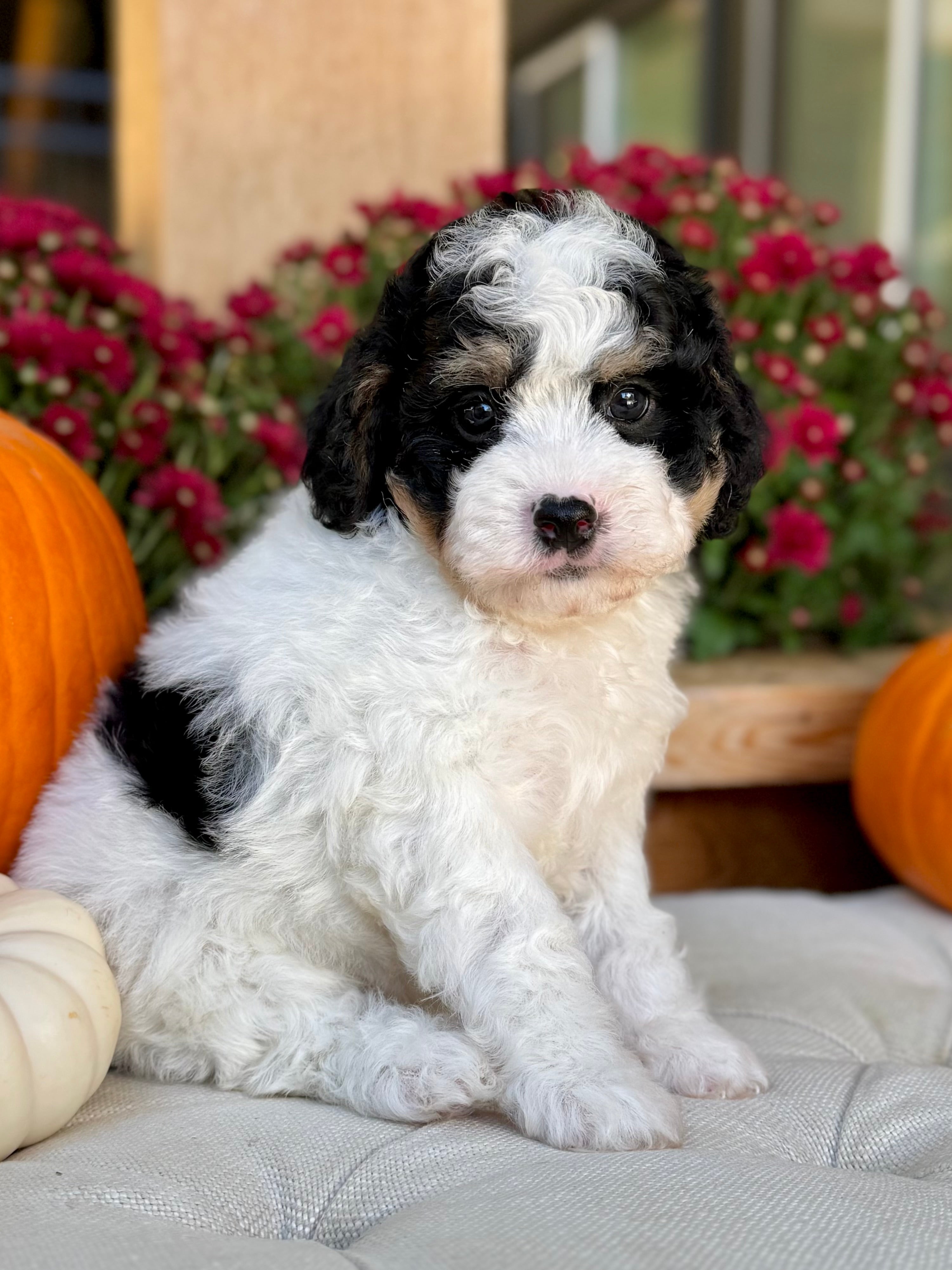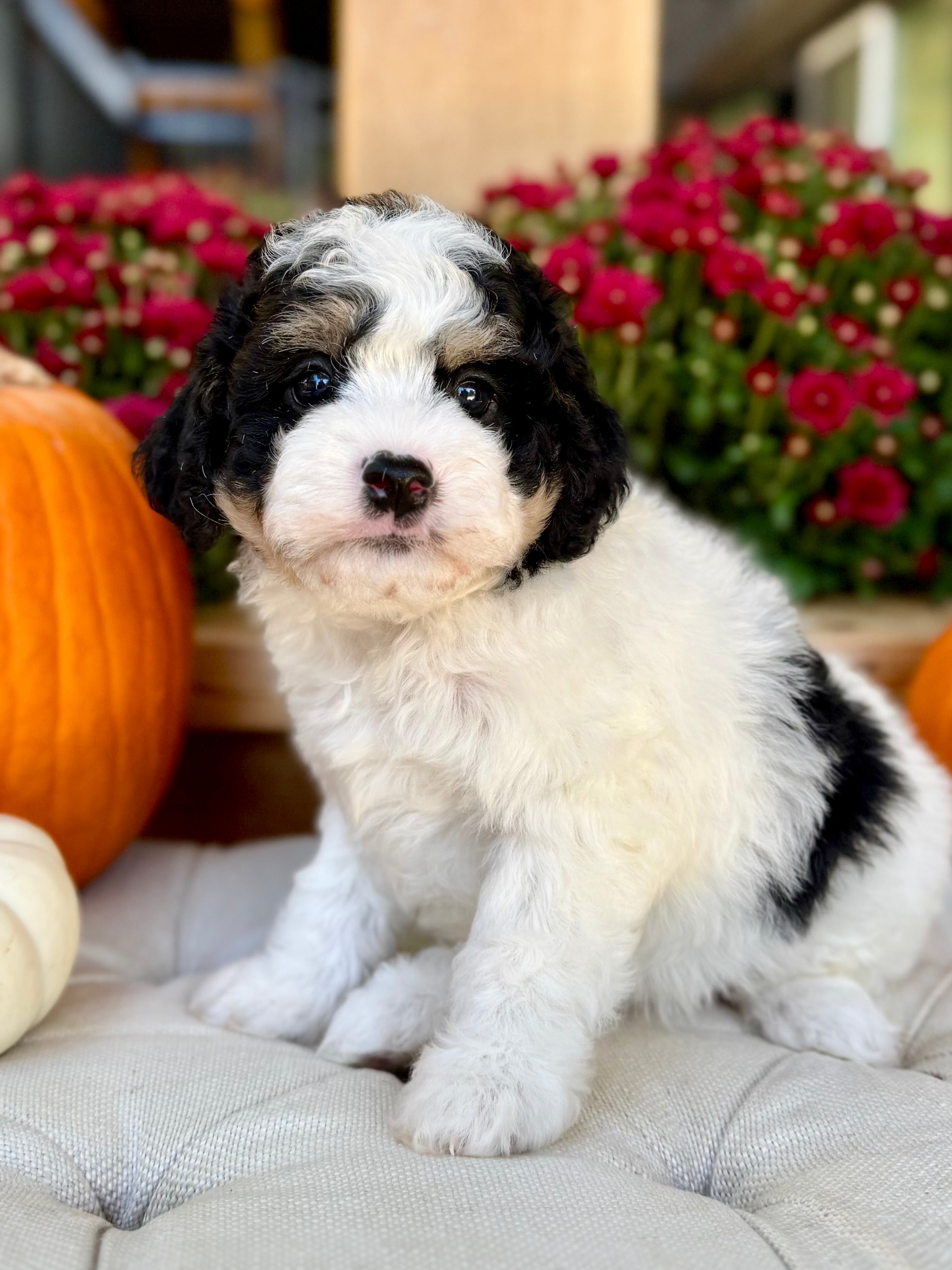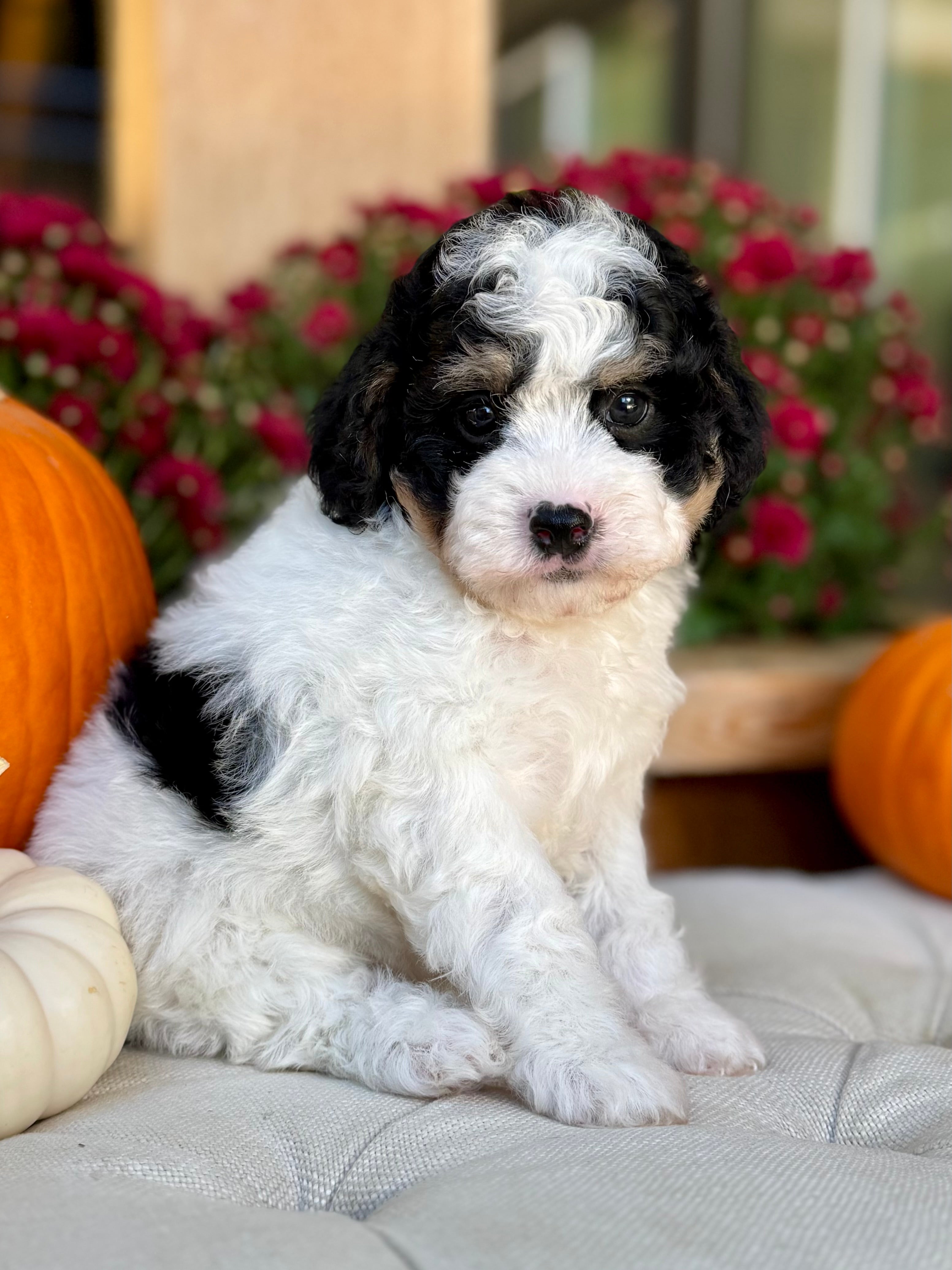 Koa is a 7-week-old F1b Cavapoo with a soft, Black & Tan Tri curly coat and a calm, affectionate personality. He’s a happy little boy who enjoys exploring his surroundings but is always content to settle in for cuddles. Born on August 19th and currently weighing 4 lbs, Koa is expected to be 8–14 lbs full grown. His mom, Tulip, is a 10 lb Poodle and his dad, Theodore, is a 18 lb Cavapoo—both genetically health tested to ensure strong, healthy puppies.