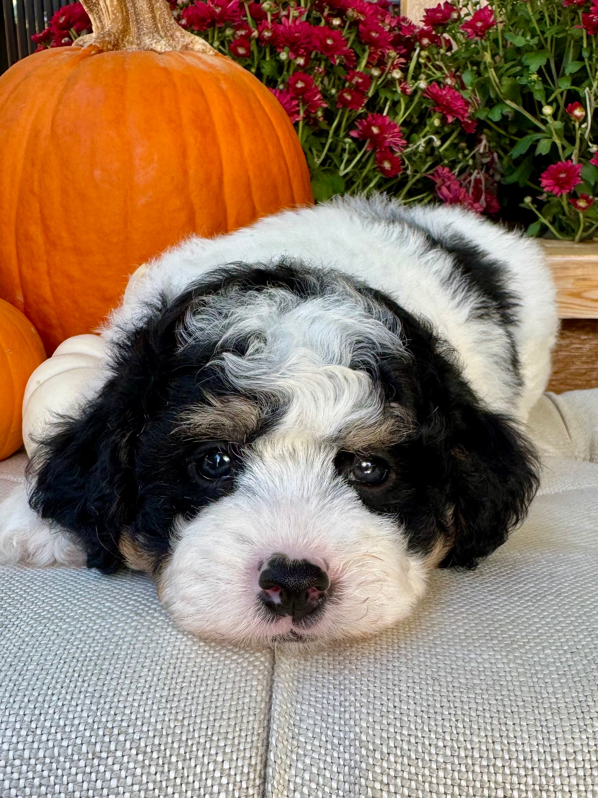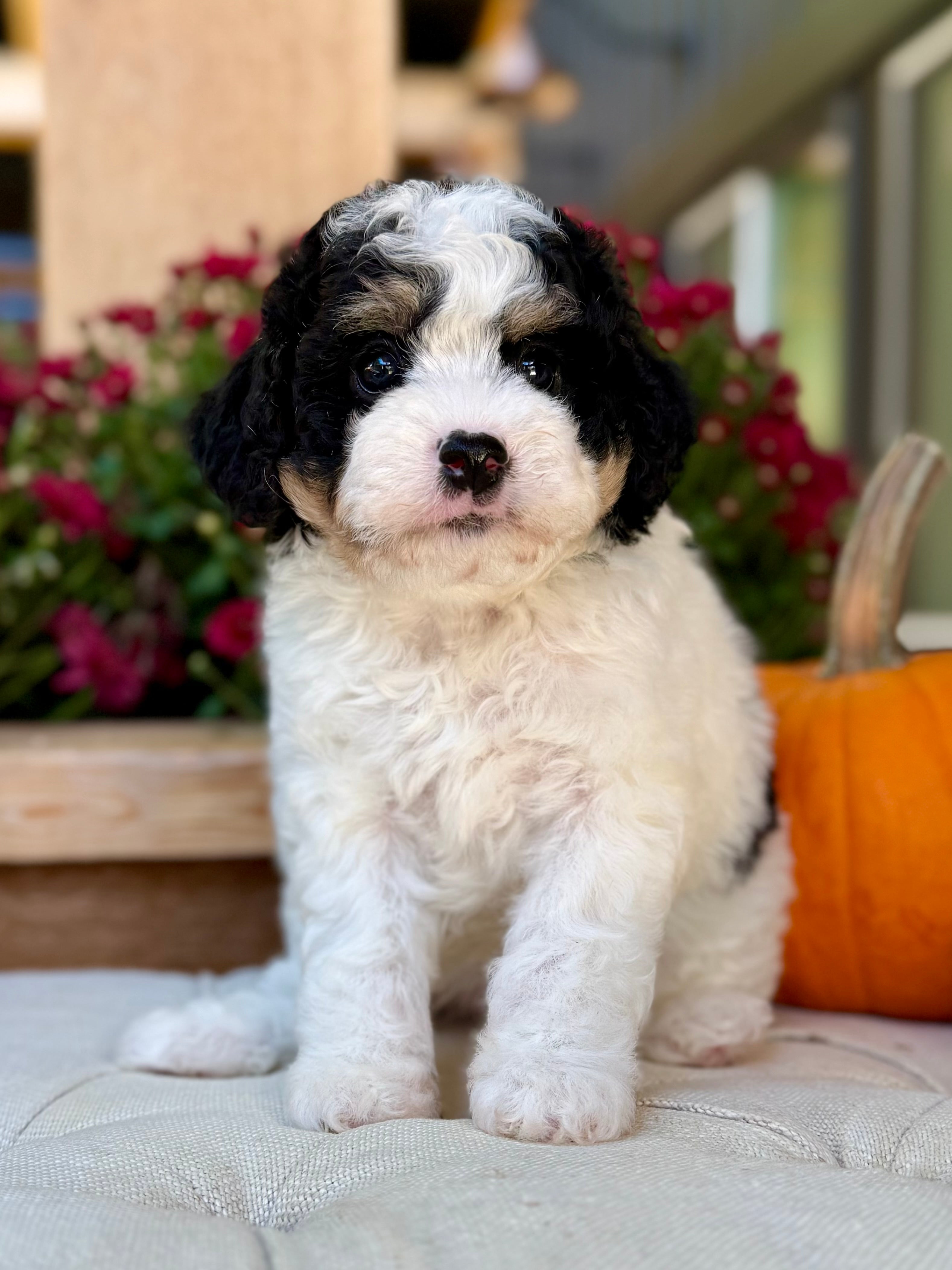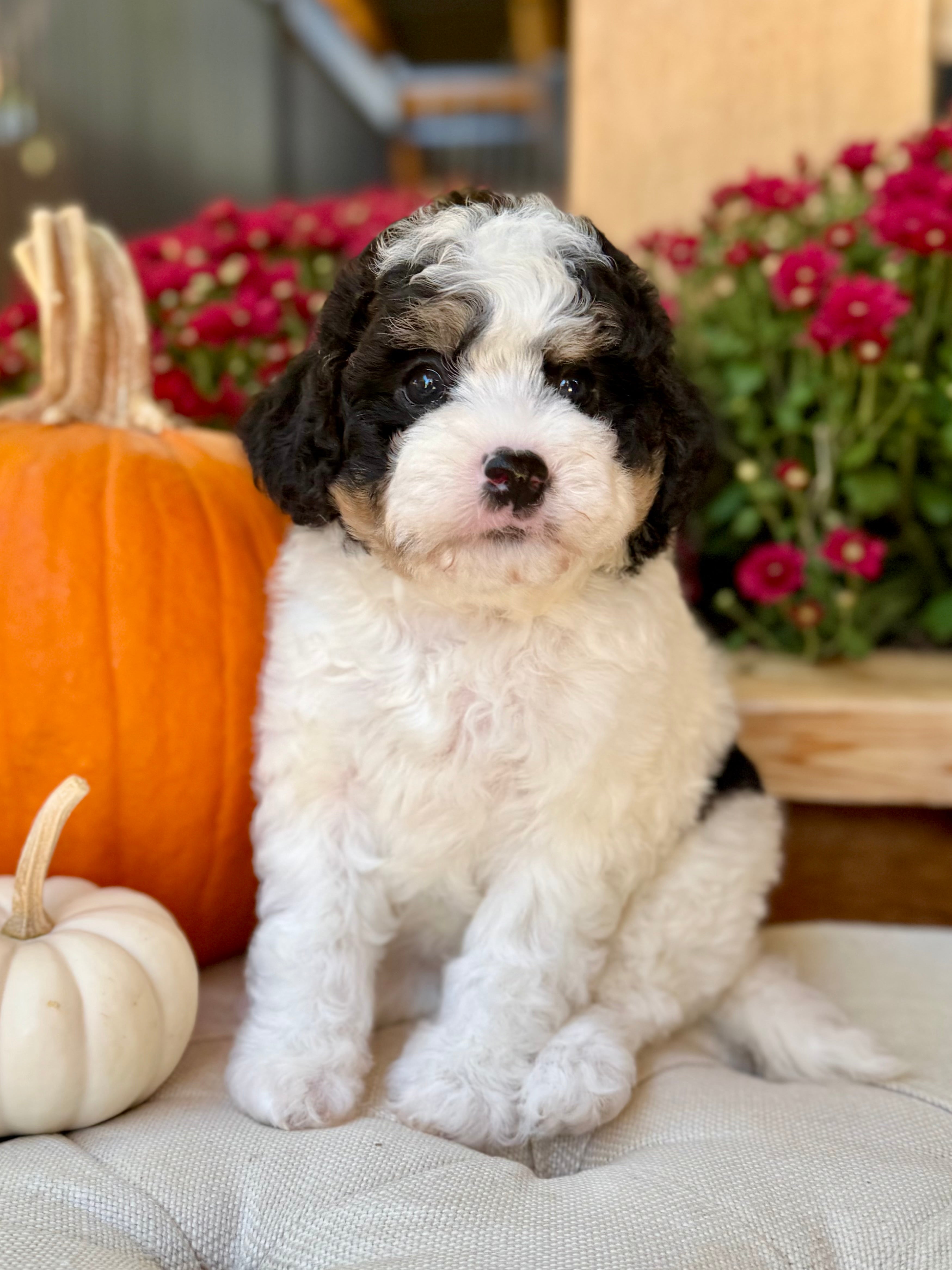 Koa is a 7-week-old F1b Cavapoo with a soft, Black & Tan Tri curly coat and a calm, affectionate personality. He’s a happy little boy who enjoys exploring his surroundings but is always content to settle in for cuddles. Born on August 19th and currently weighing 4 lbs, Koa is expected to be 8–14 lbs full grown. His mom, Tulip, is a 10 lb Poodle and his dad, Theodore, is a 18 lb Cavapoo—both genetically health tested to ensure strong, healthy puppies.