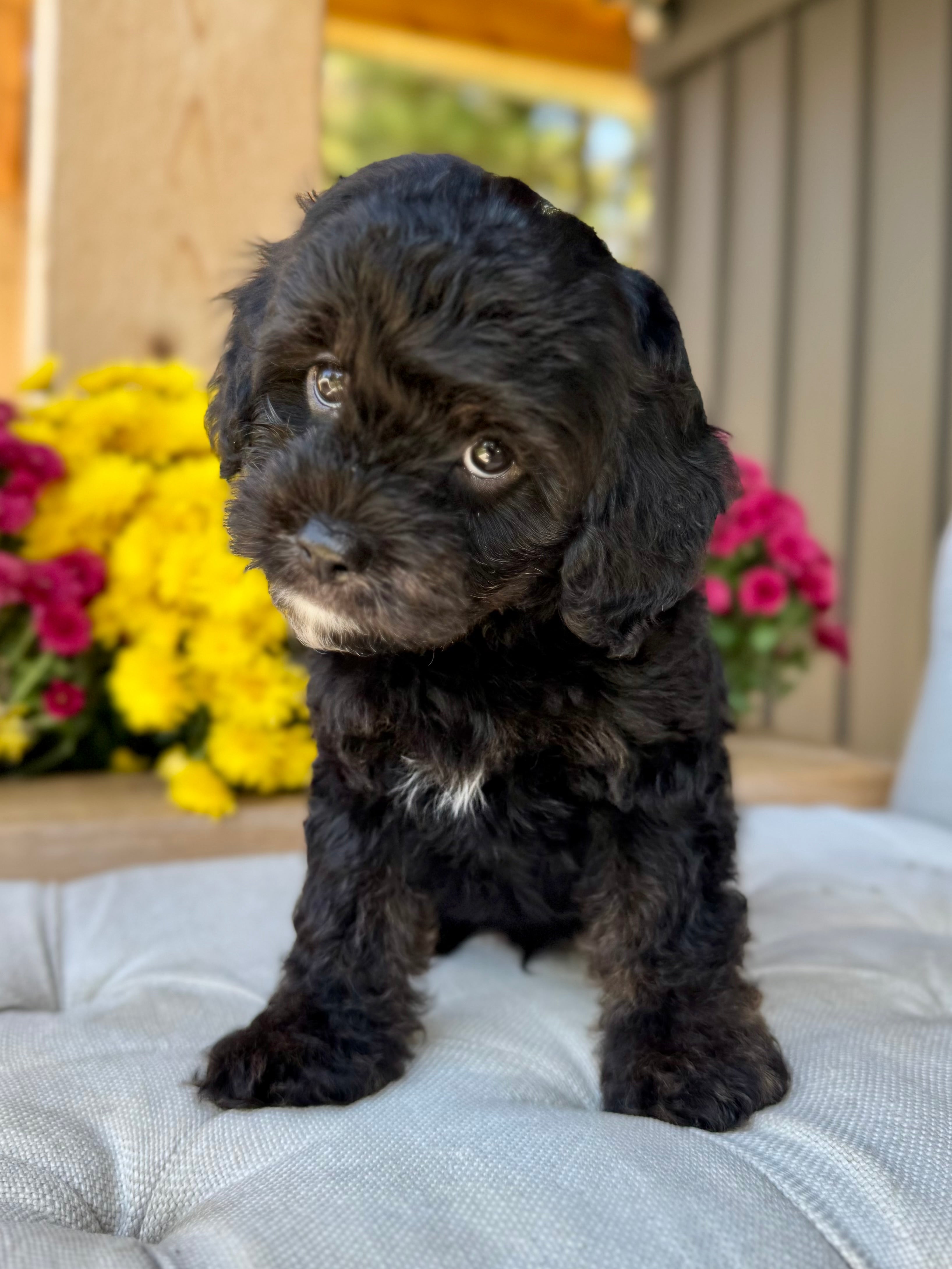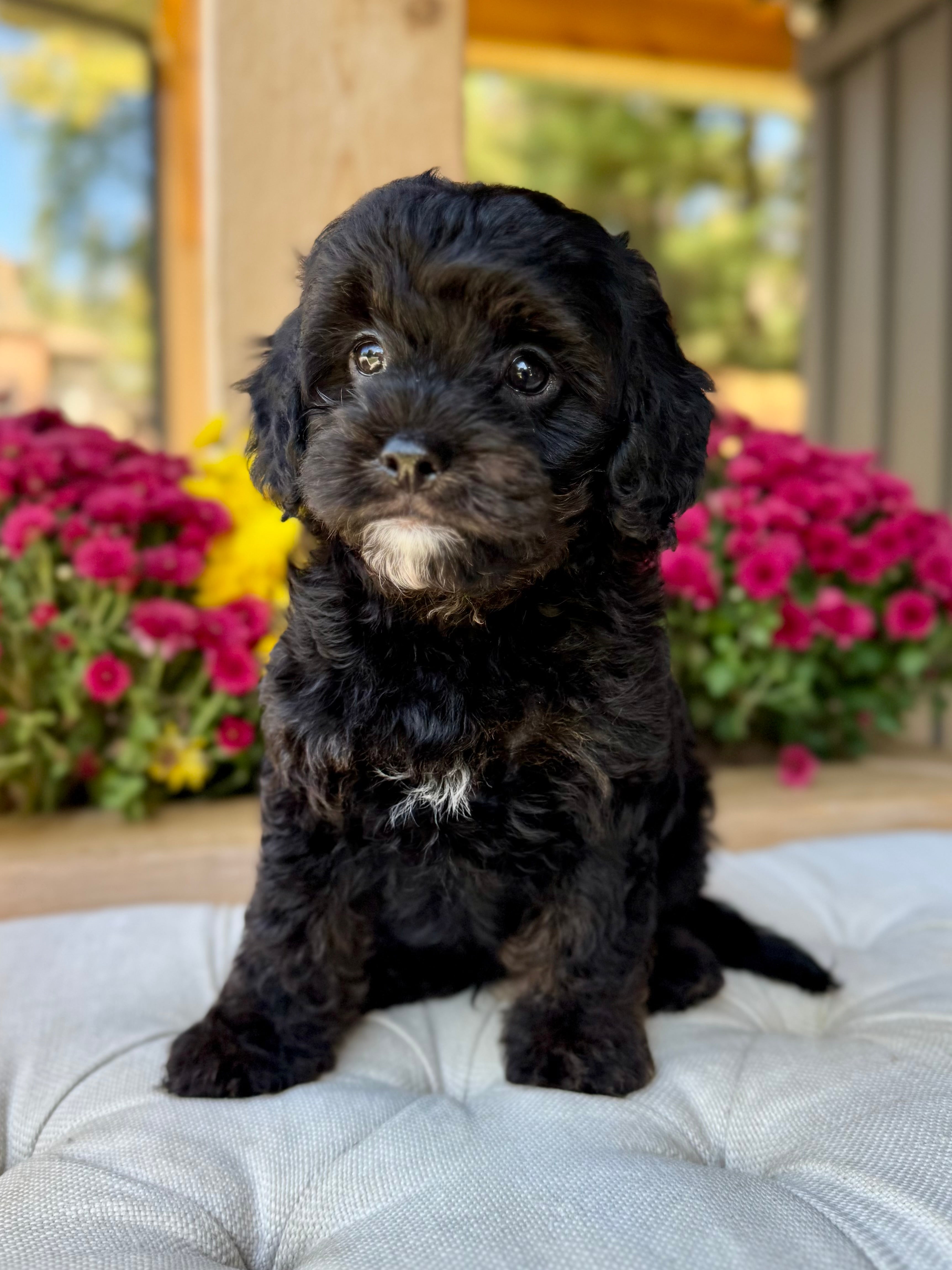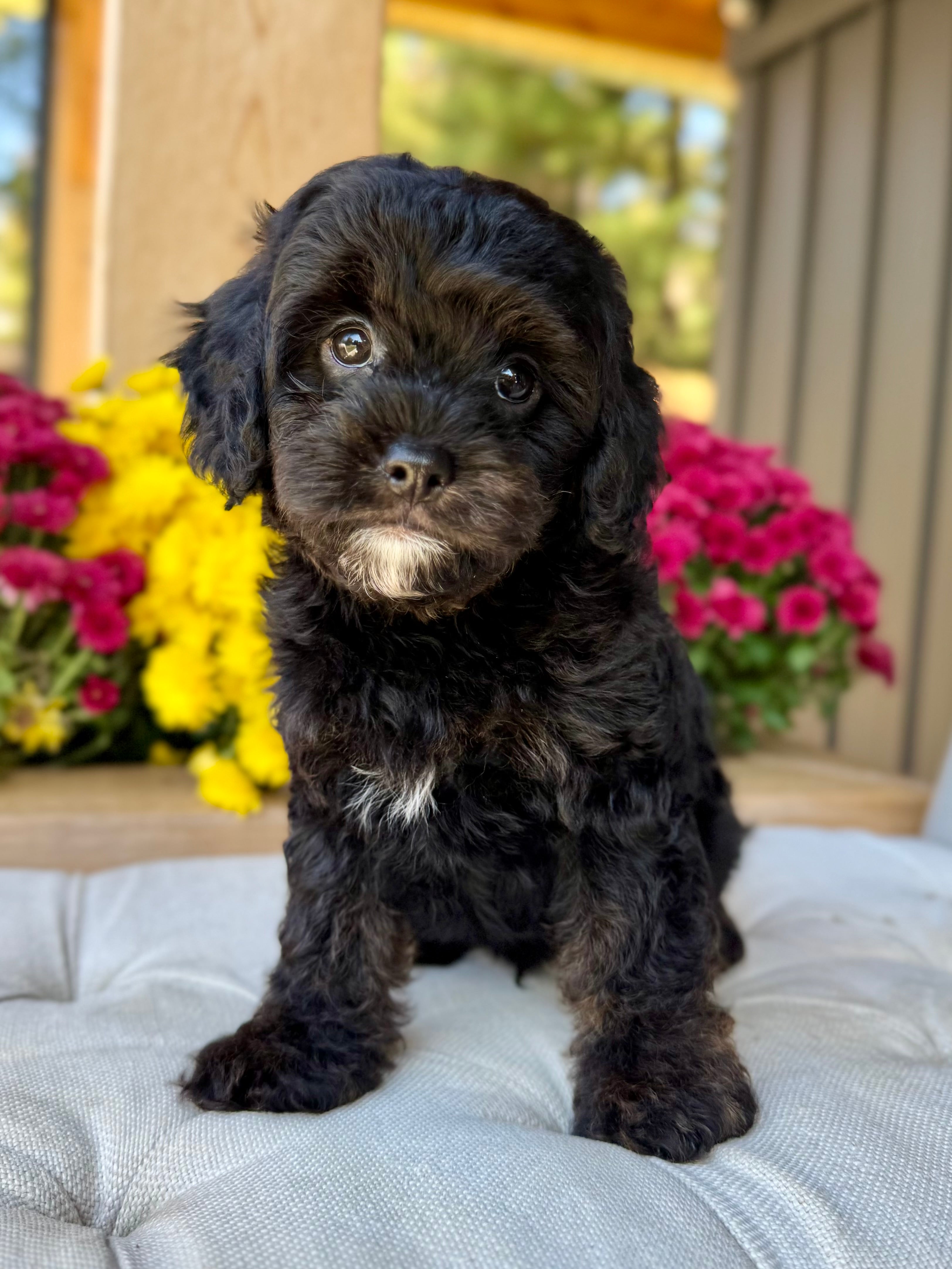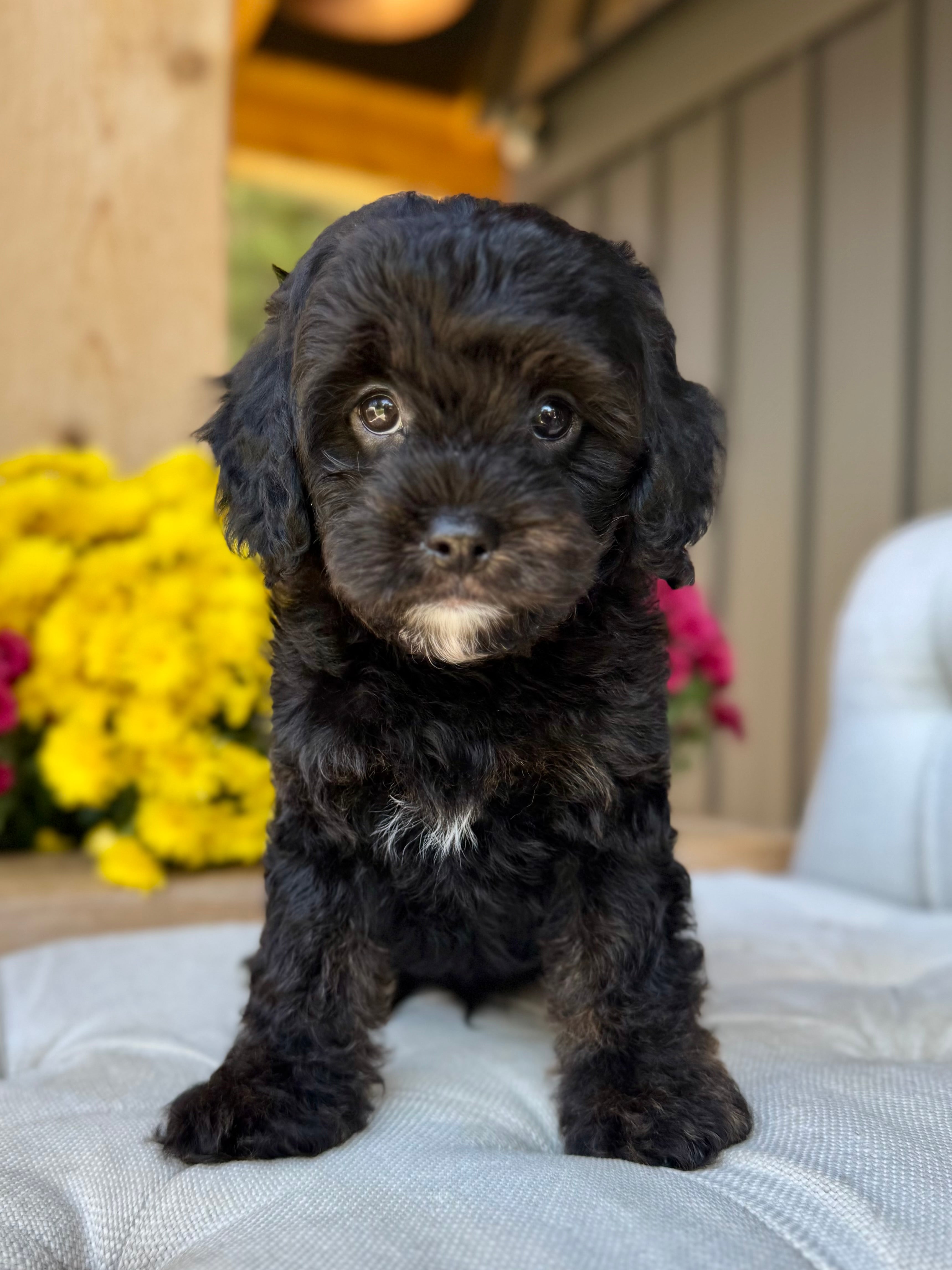 Koda is an 8-week-old F1 Cavapoo with a soft, black wavy coat and a calm, affectionate personality. He’s a happy little boy who enjoys exploring his surroundings but is always content to settle in for cuddles. Born on August 15th and currently weighing 4.5 lbs, Koda is expected to be 12–17 lbs full grown. His mom, Mira, is a 11 lb red Poodle, and his dad, Rio, is a 16 lb Blenheim Cavalier—both genetically health tested to ensure strong, healthy puppies.