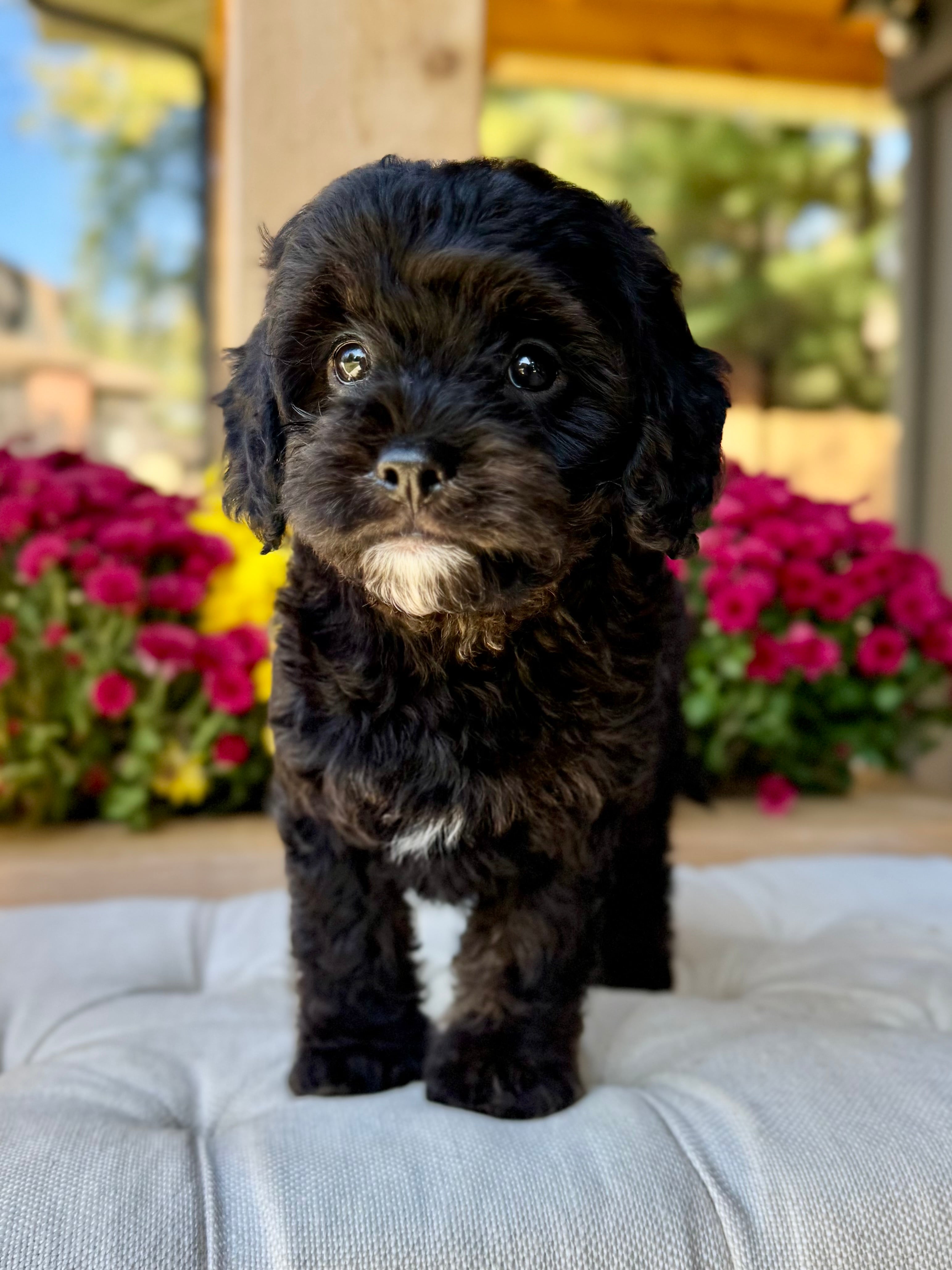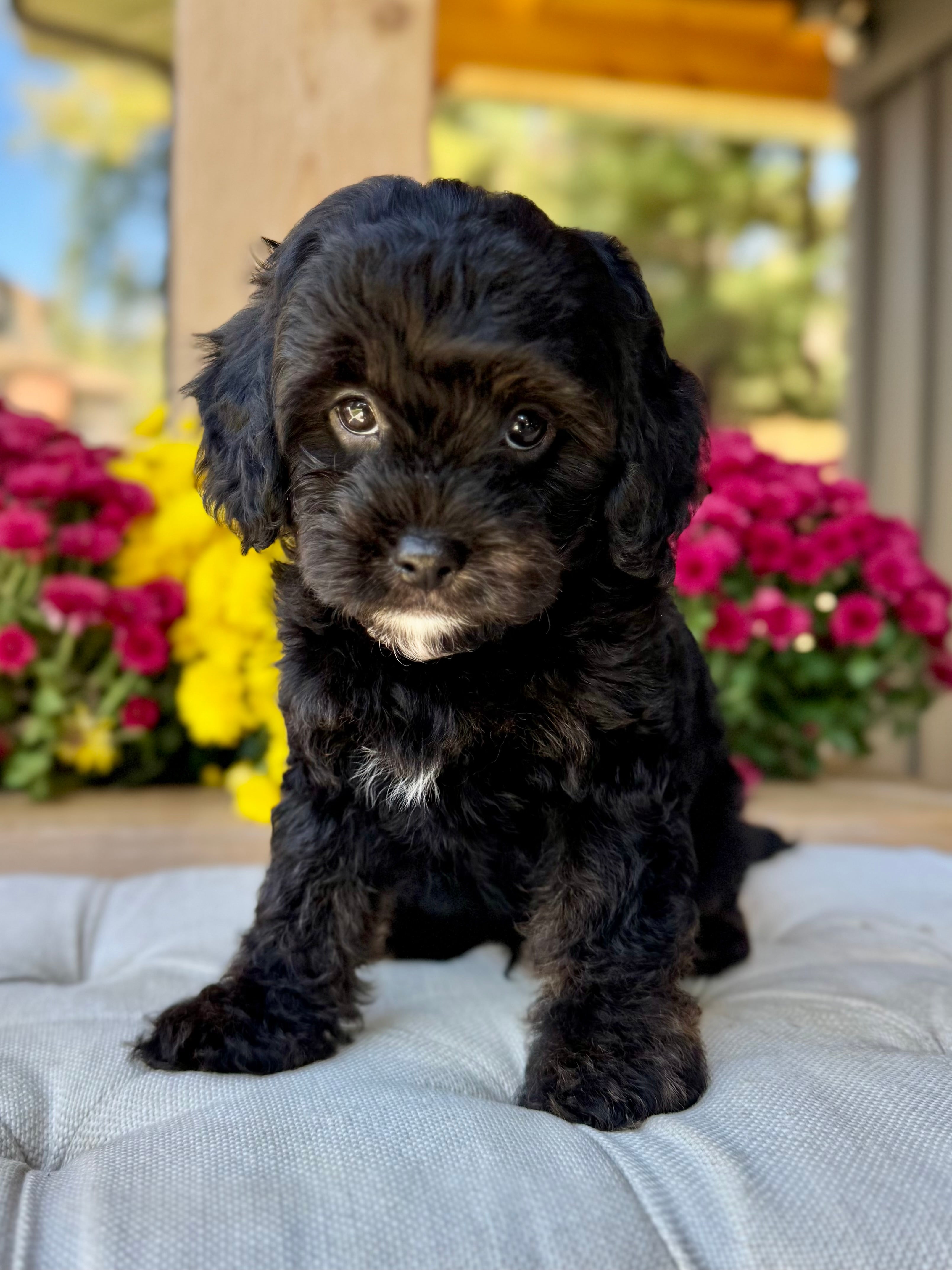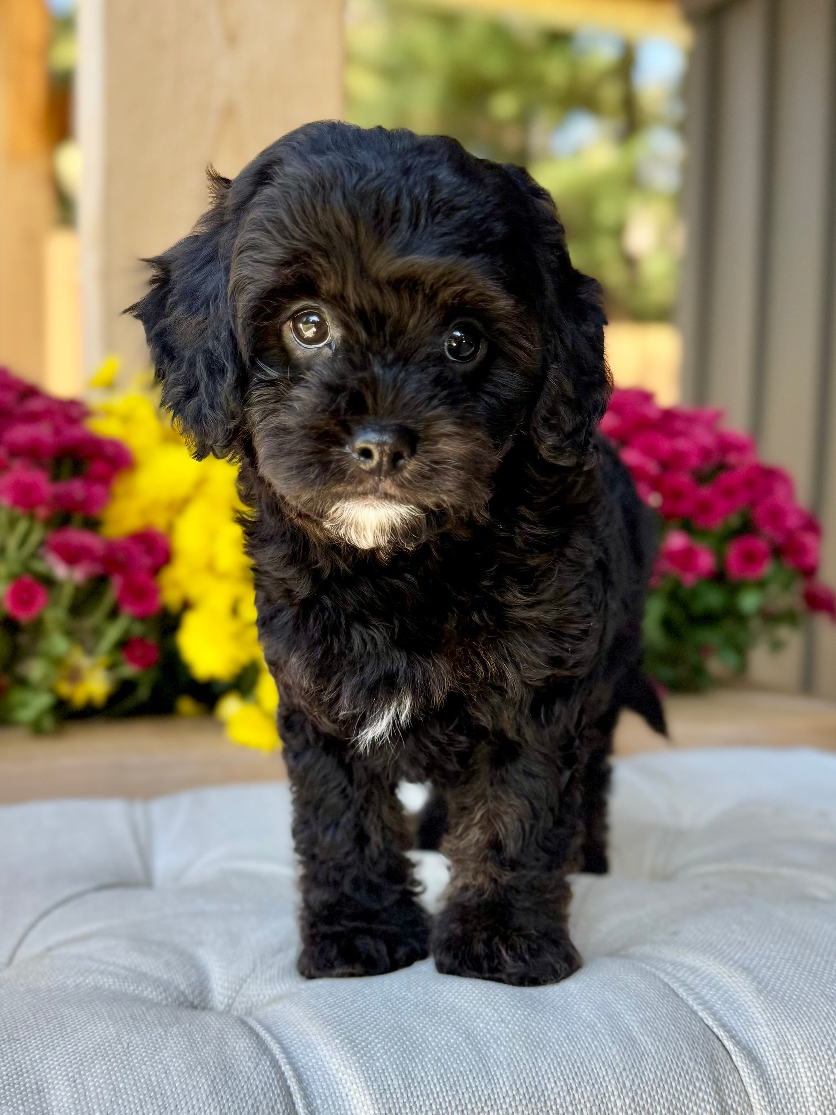 Koda is an 8-week-old F1 Cavapoo with a soft, black wavy coat and a calm, affectionate personality. He’s a happy little boy who enjoys exploring his surroundings but is always content to settle in for cuddles. Born on August 15th and currently weighing 4.5 lbs, Koda is expected to be 12–17 lbs full grown. His mom, Mira, is a 11 lb red Poodle, and his dad, Rio, is a 16 lb Blenheim Cavalier—both genetically health tested to ensure strong, healthy puppies.