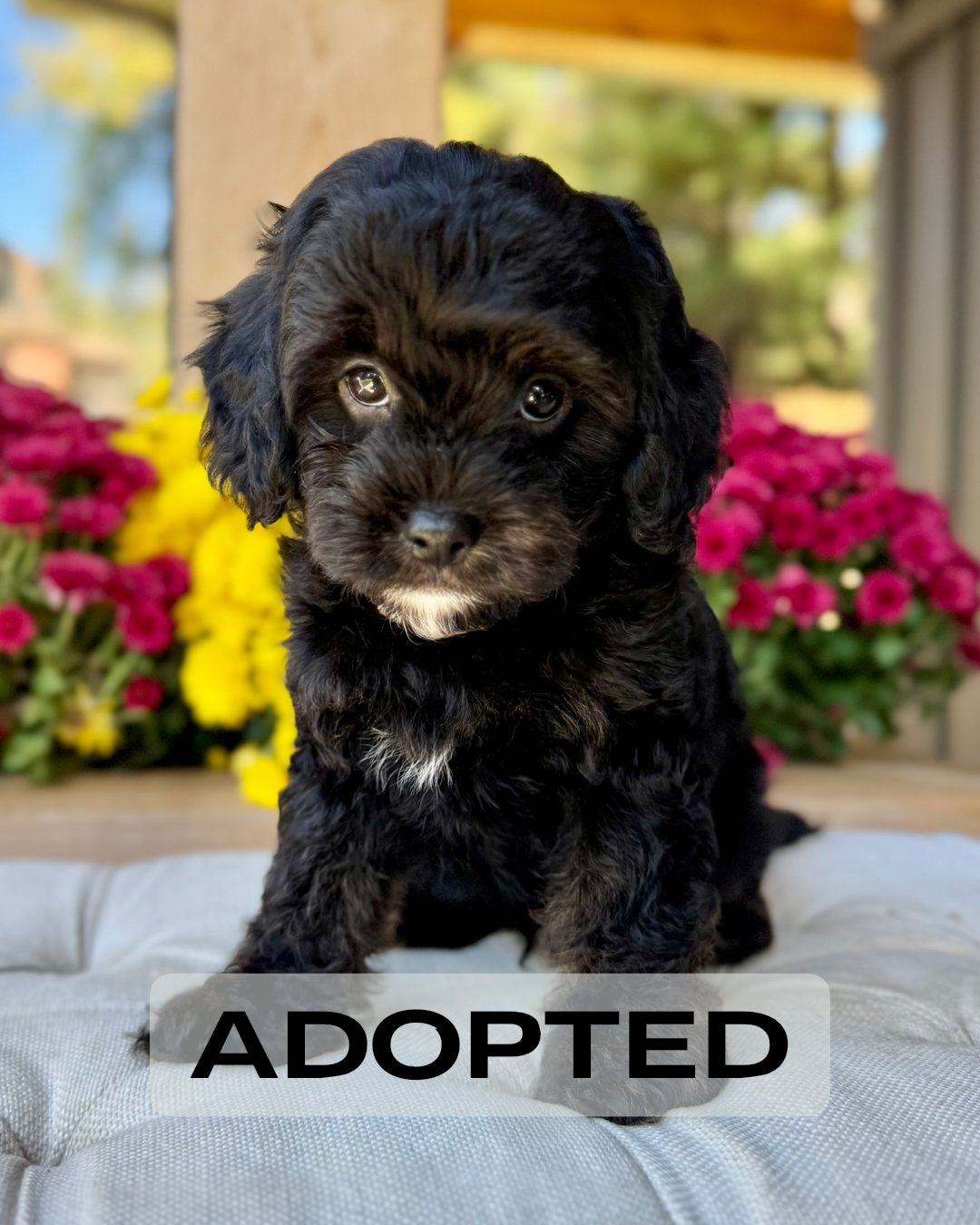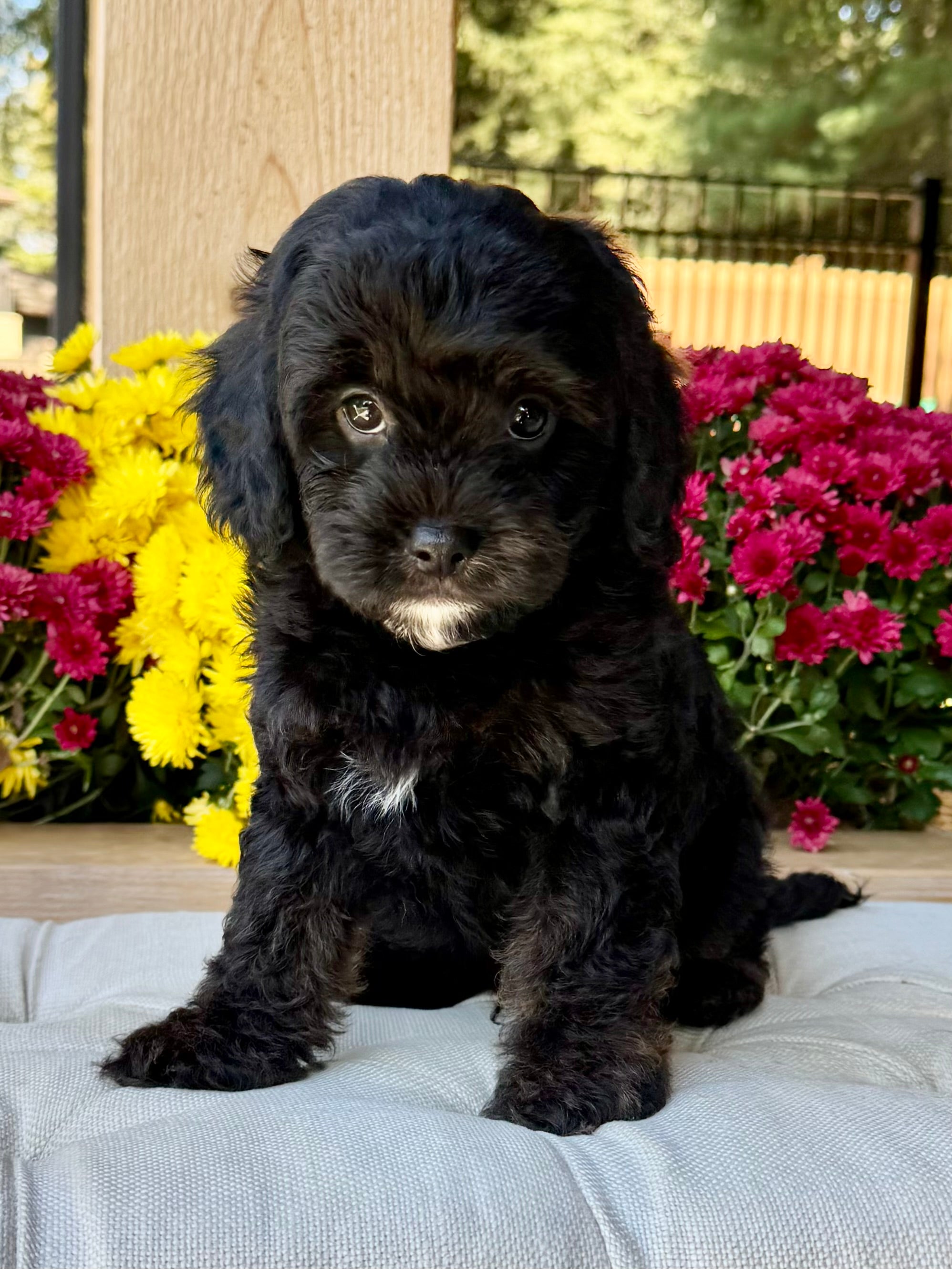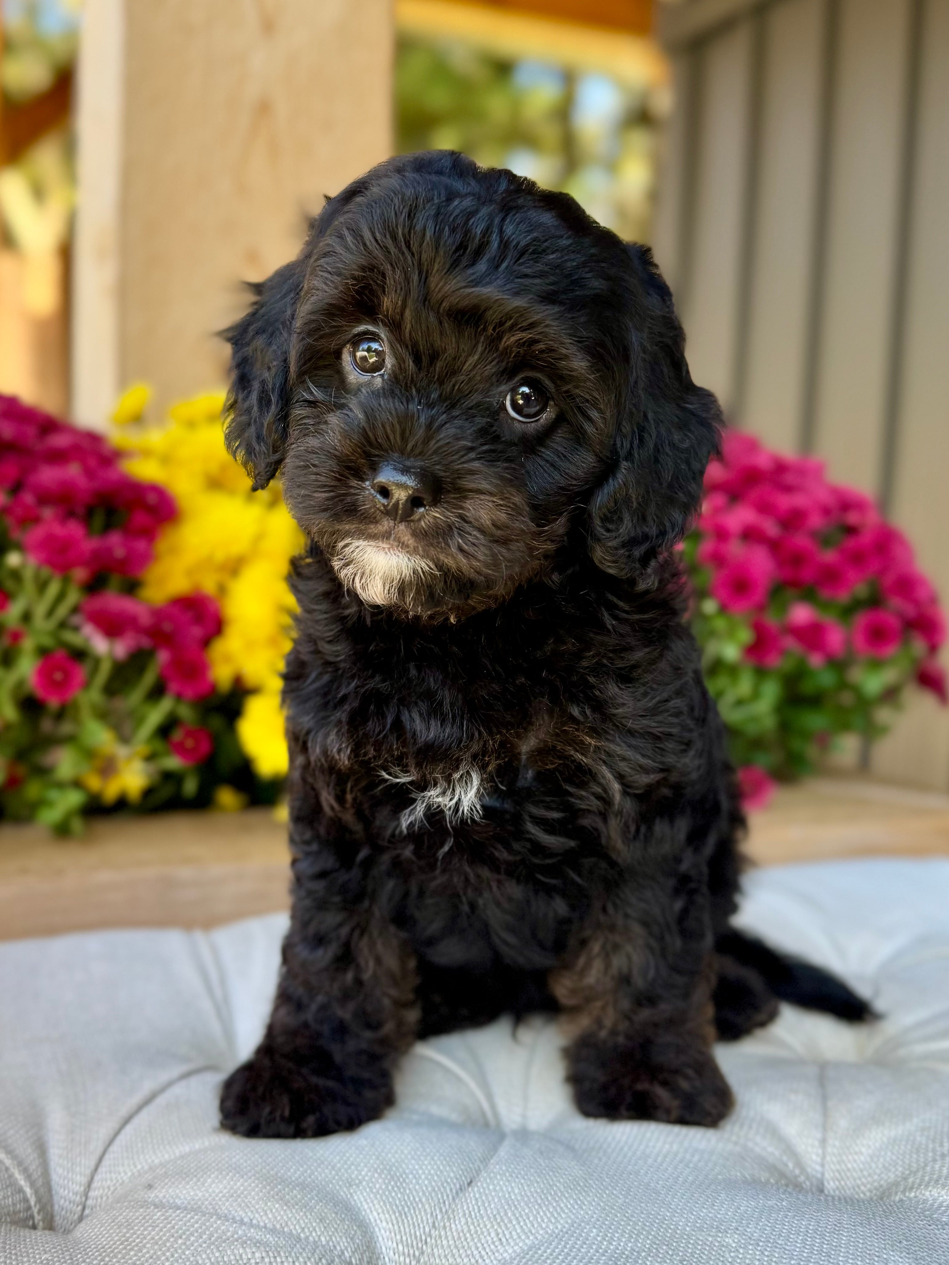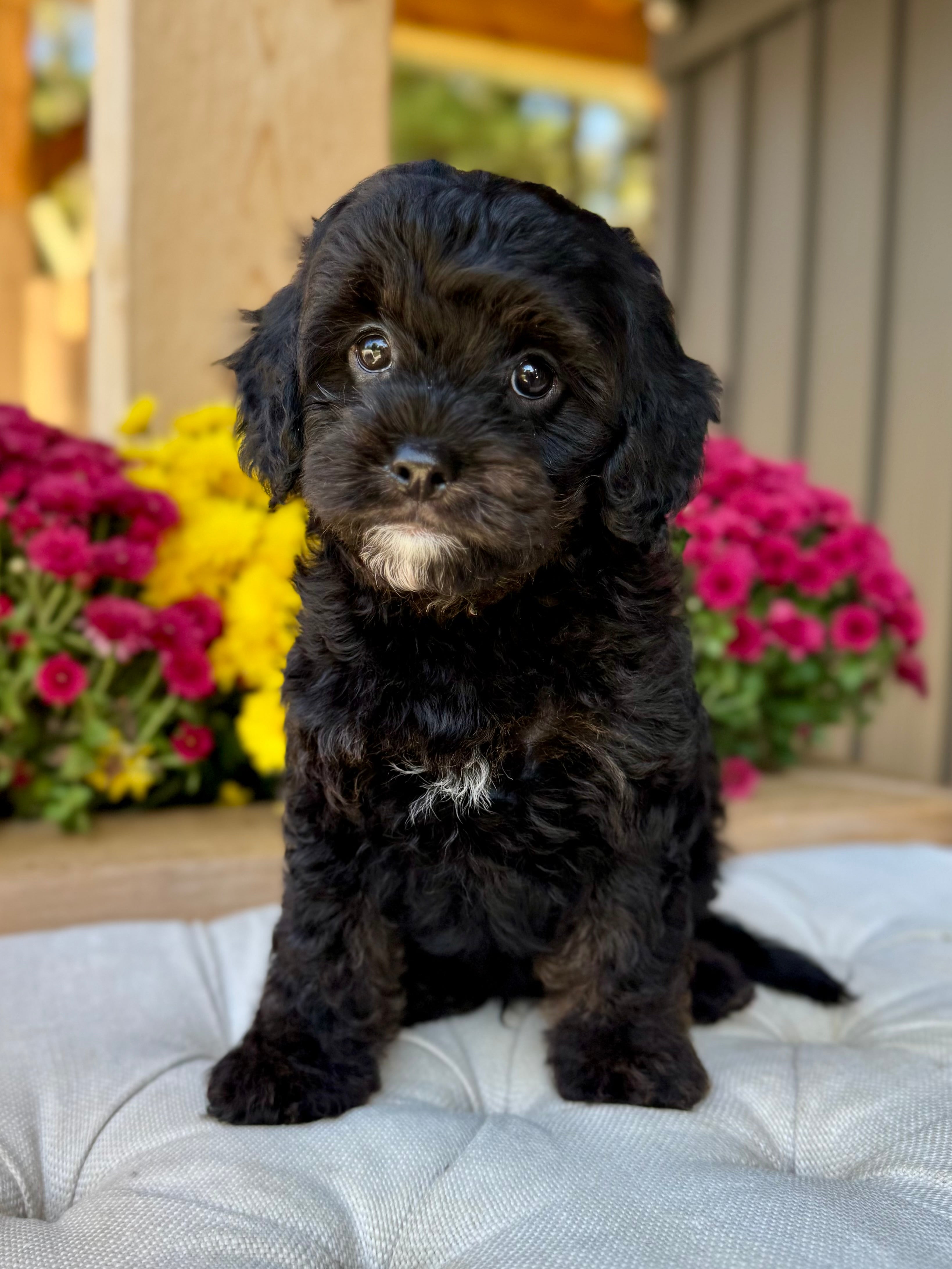 Koda is an 8-week-old F1 Cavapoo with a soft, black wavy coat and a calm, affectionate personality. He’s a happy little boy who enjoys exploring his surroundings but is always content to settle in for cuddles. Born on August 15th and currently weighing 4.5 lbs, Koda is expected to be 12–17 lbs full grown. His mom, Mira, is a 11 lb red Poodle, and his dad, Rio, is a 16 lb Blenheim Cavalier—both genetically health tested to ensure strong, healthy puppies.