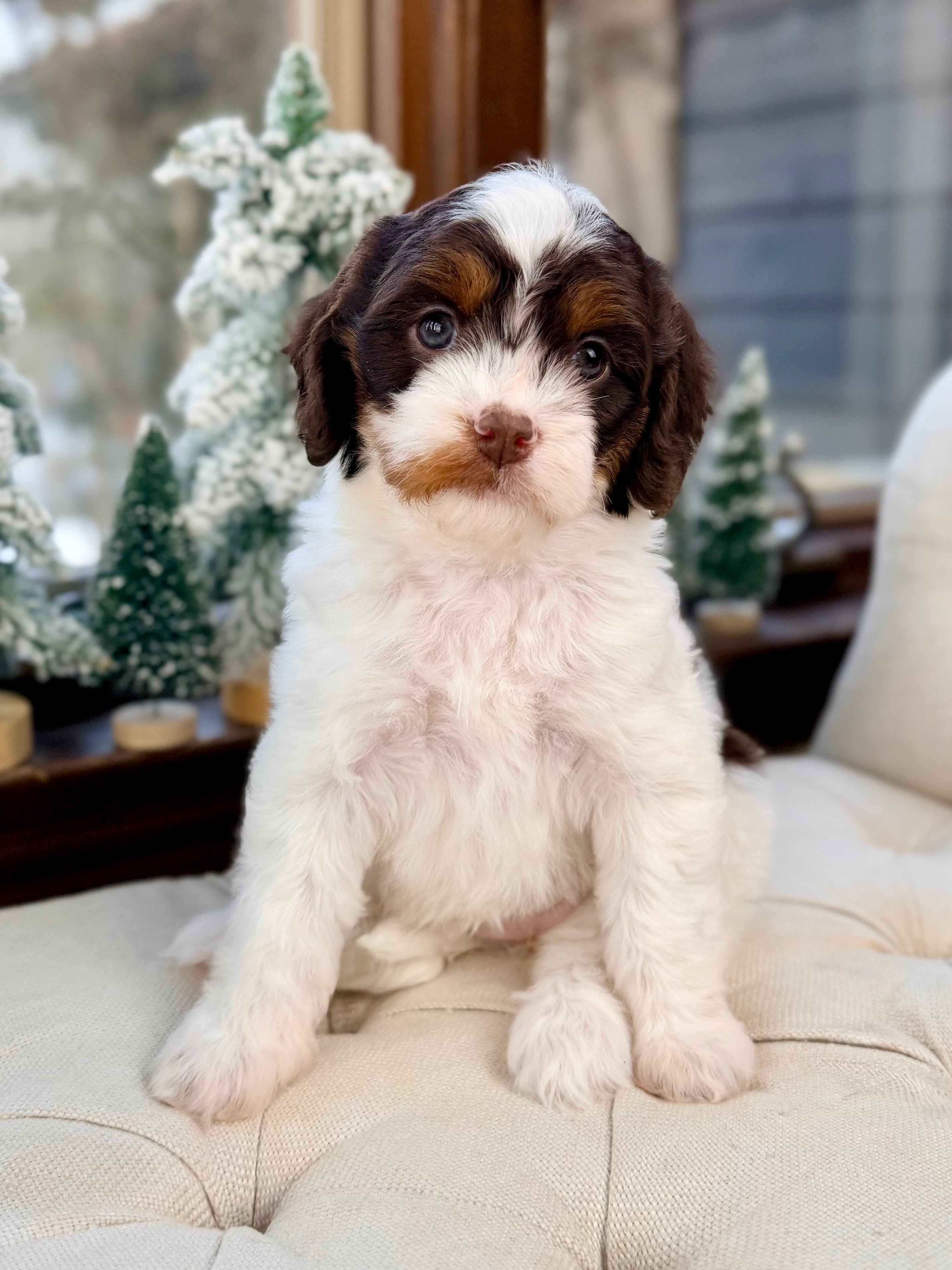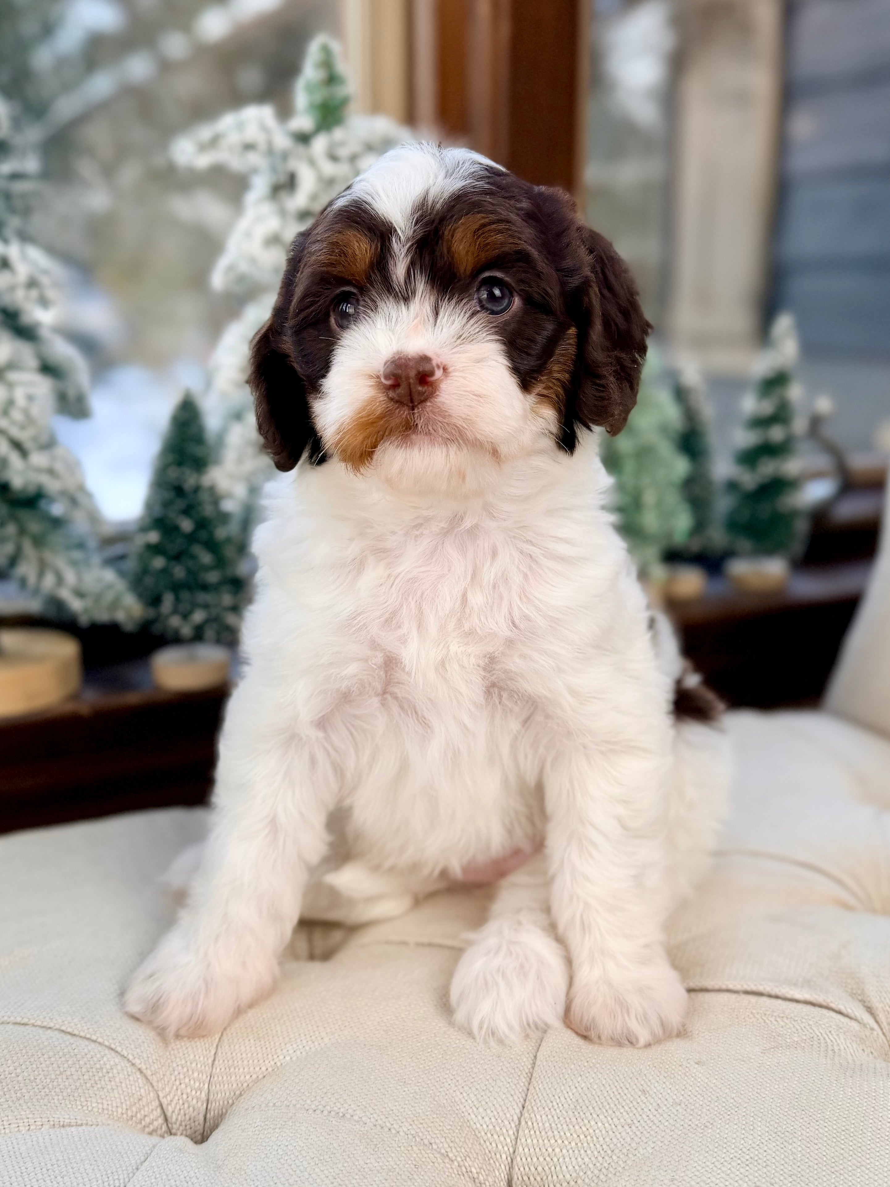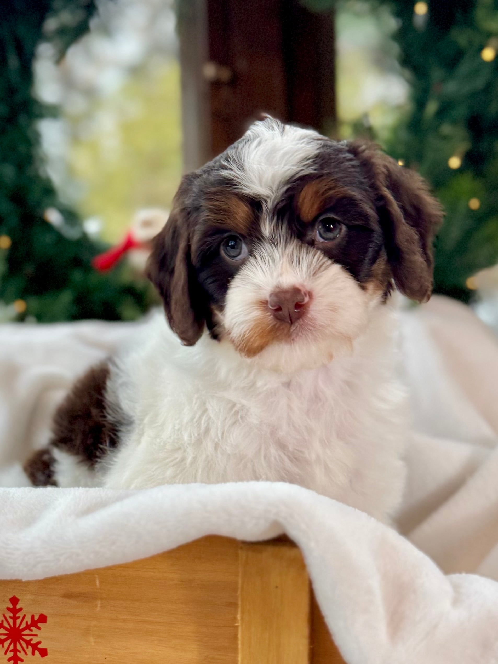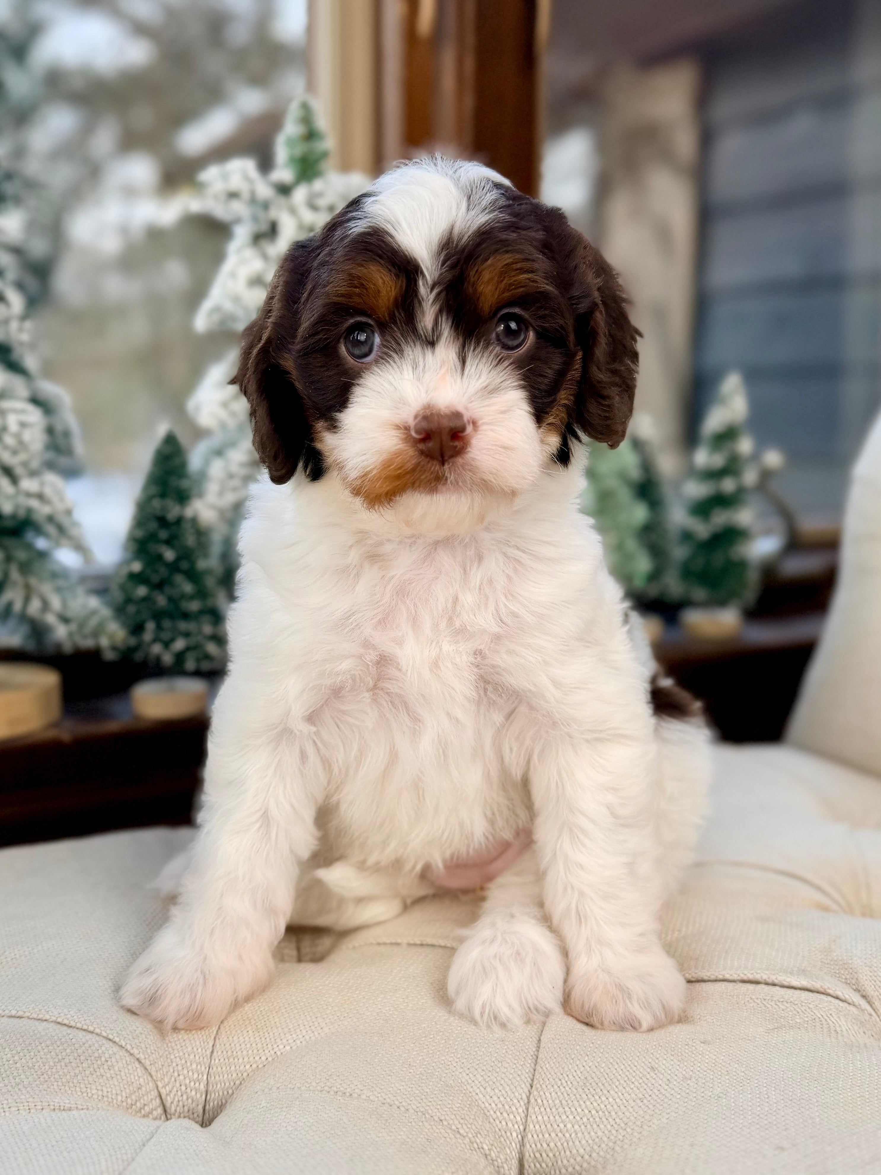 Latte is currently 6 weeks old and 2.8 lbs. She has a beautiful chocolate phantom parti pattern with a soft wavy non-shedding coat. Latte is sweet, observant, and loves exploring while staying close and cuddly.