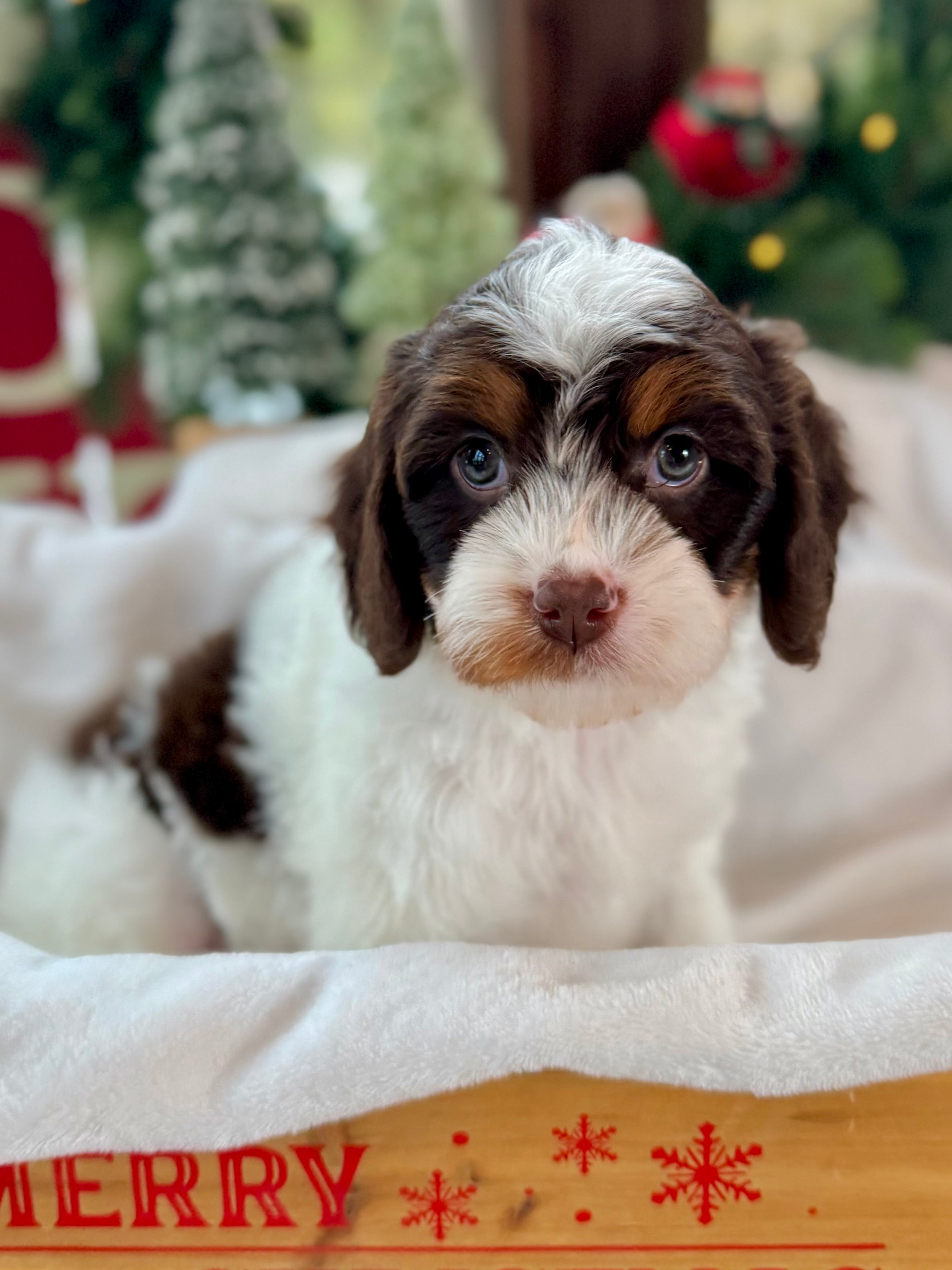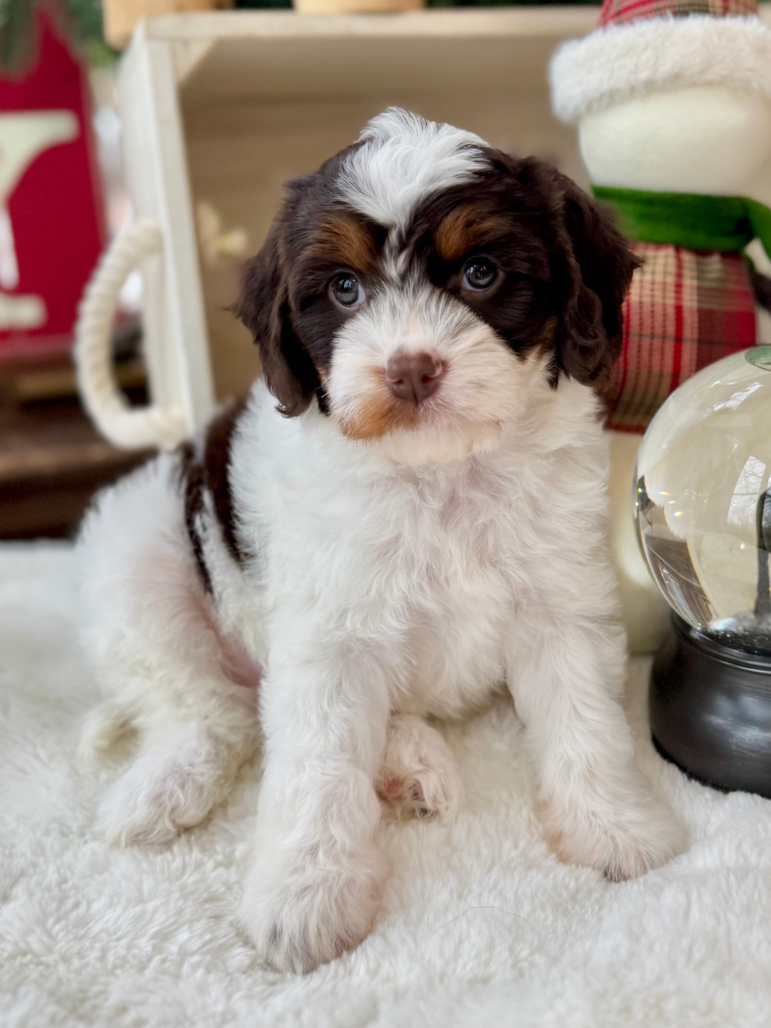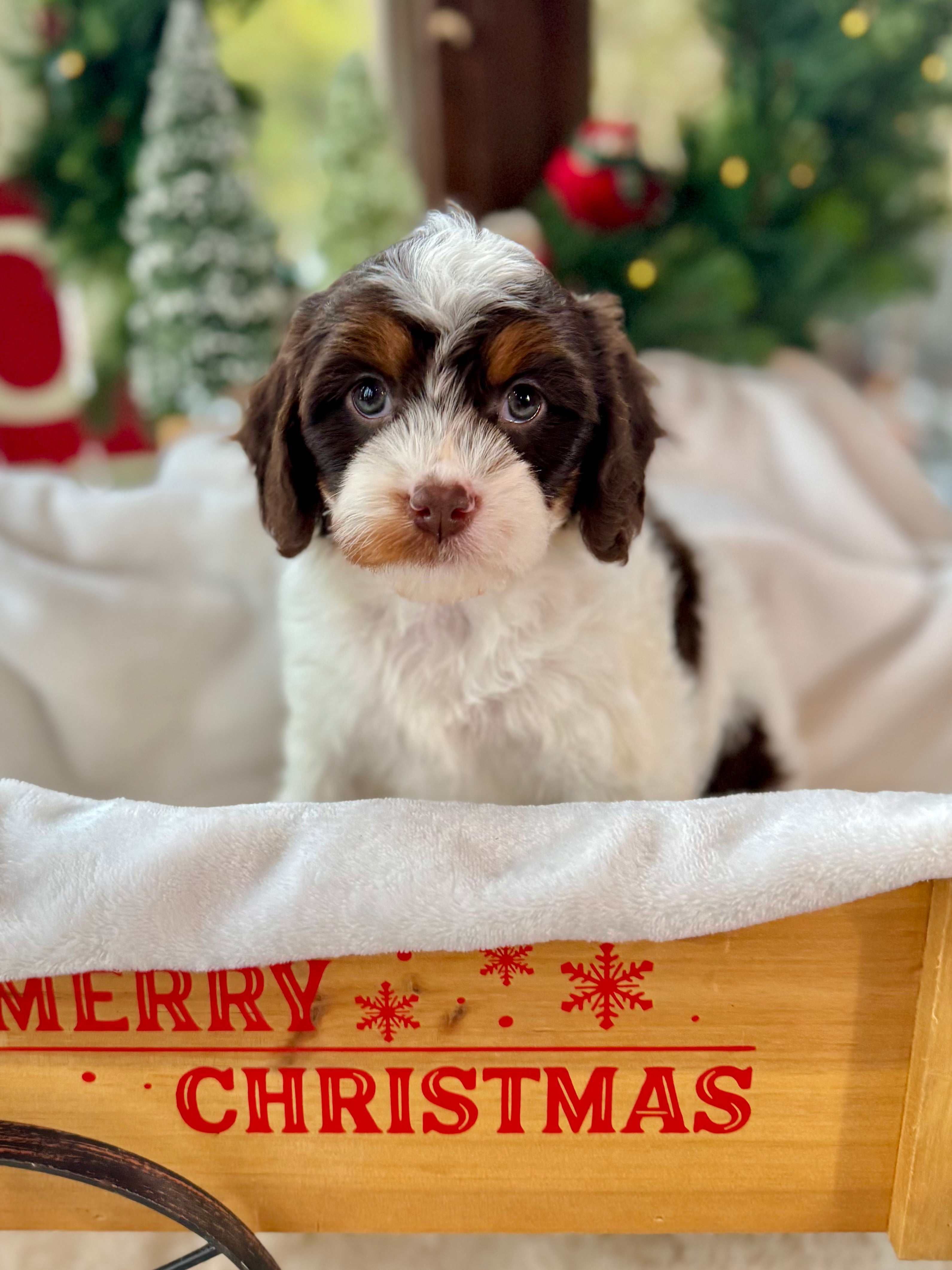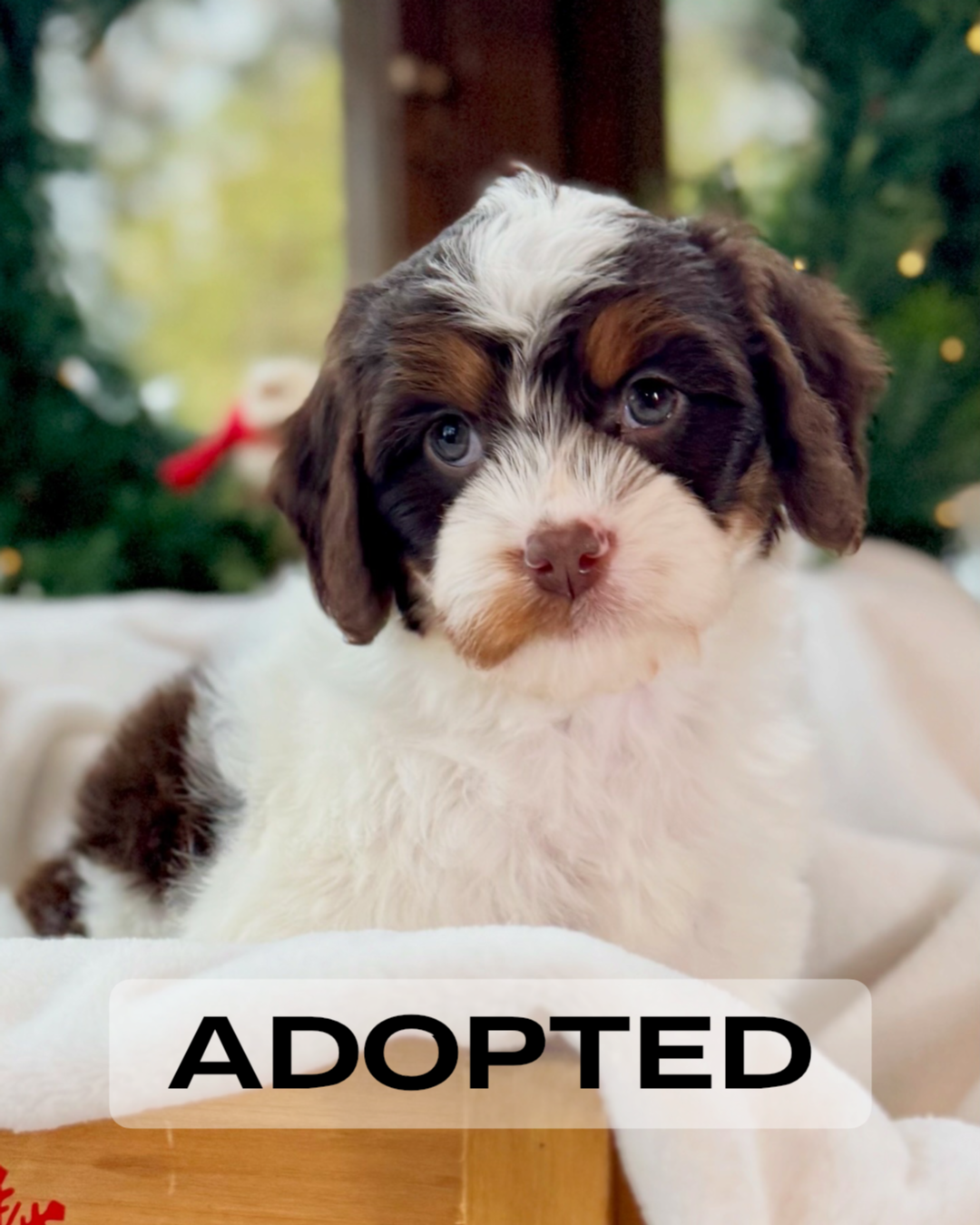 Latte is currently 6 weeks old and 2.8 lbs. She has a beautiful chocolate phantom parti pattern with a soft wavy non-shedding coat. Latte is sweet, observant, and loves exploring while staying close and cuddly.