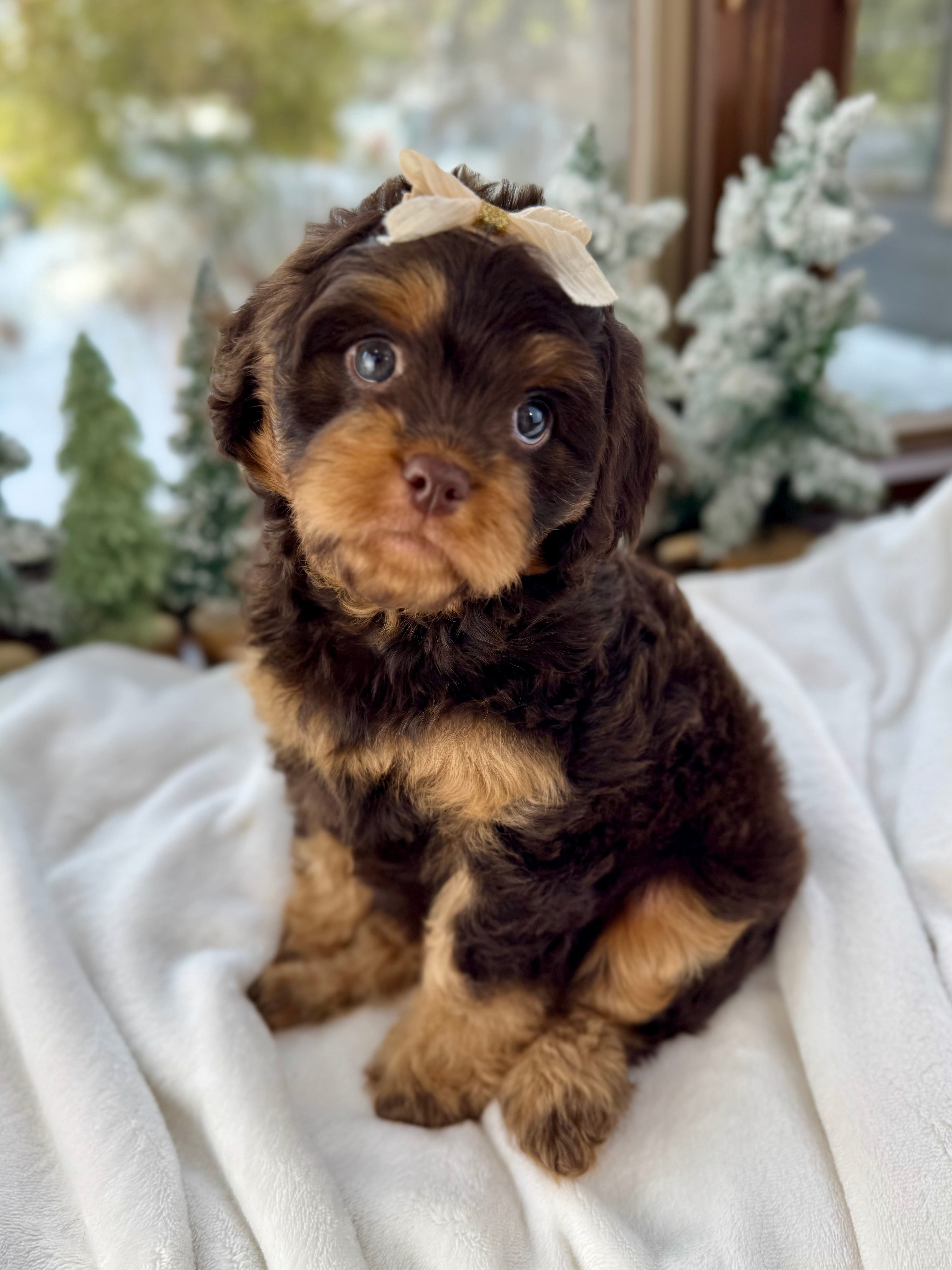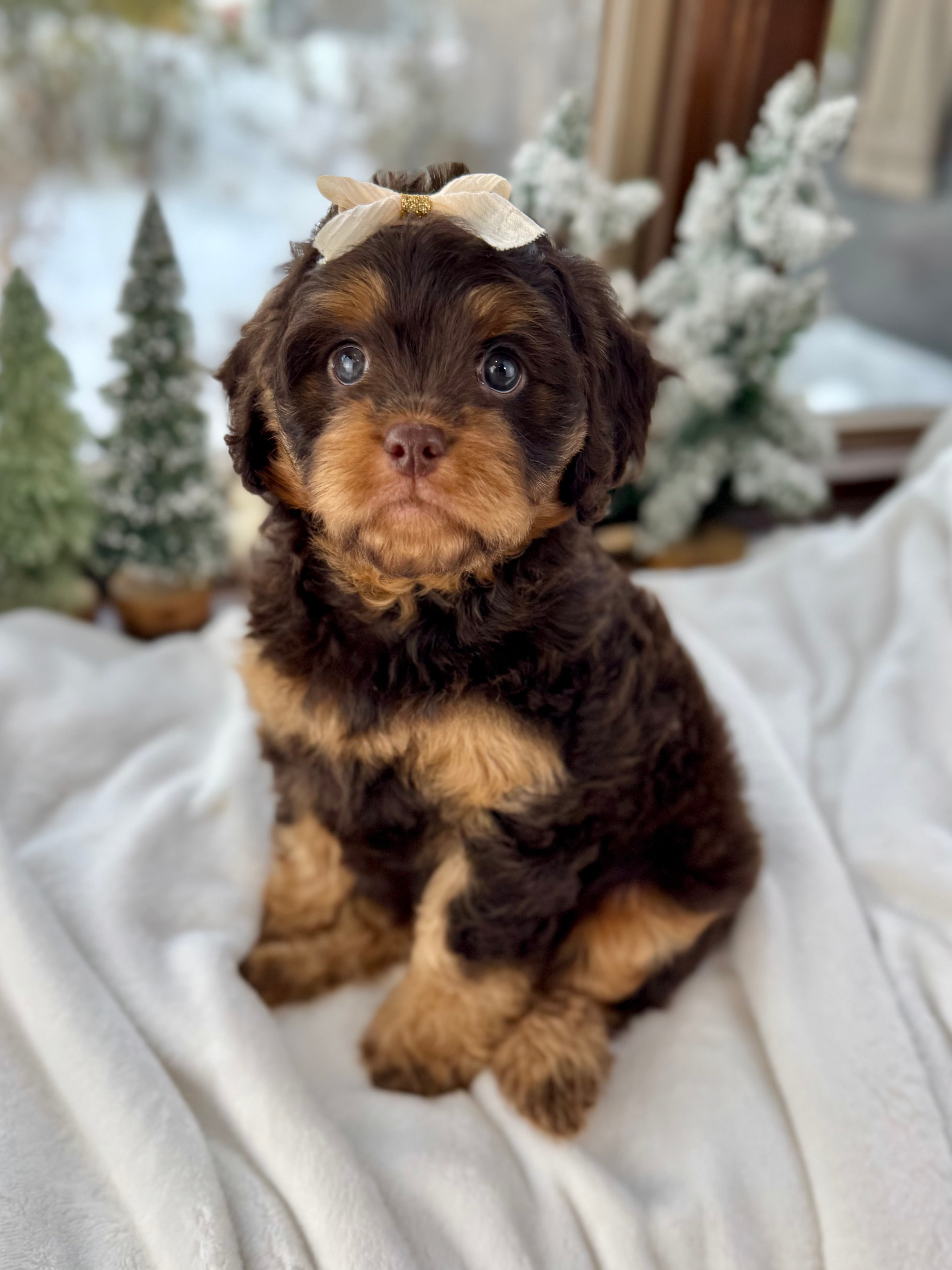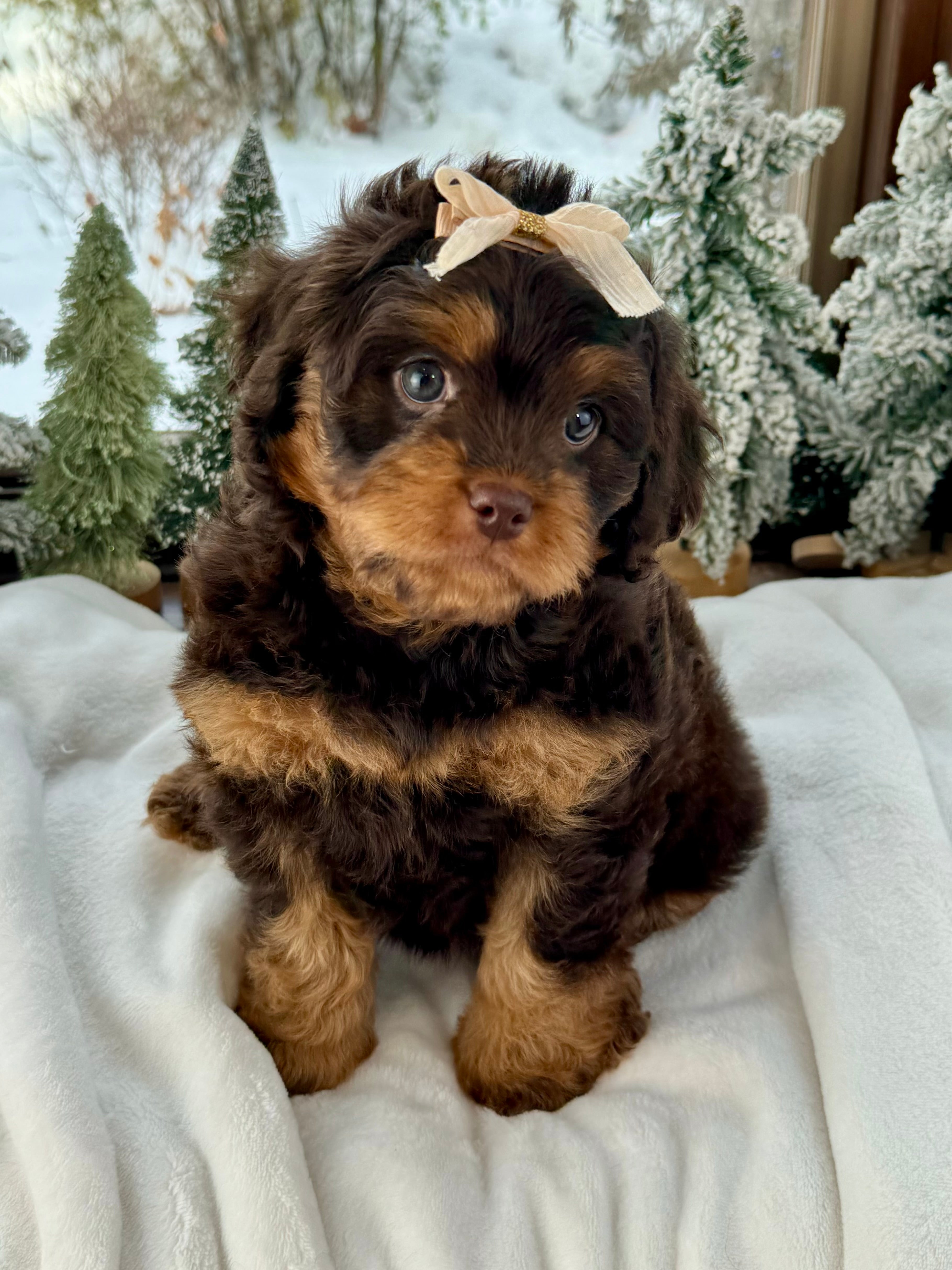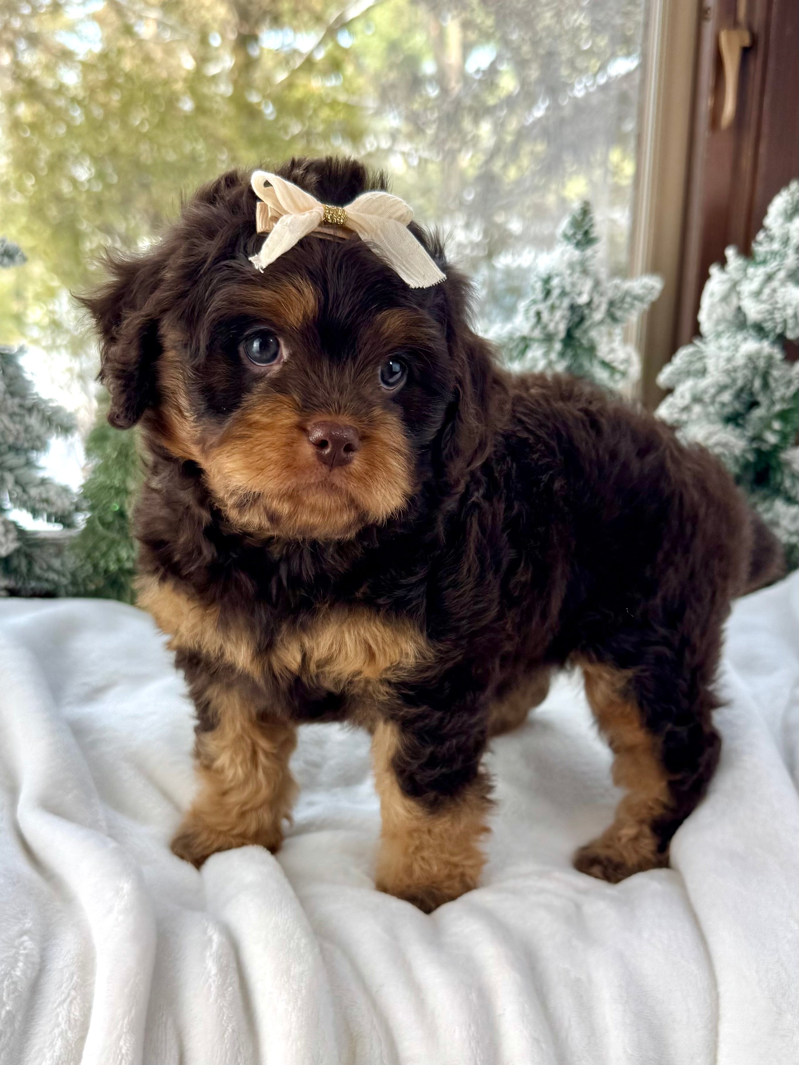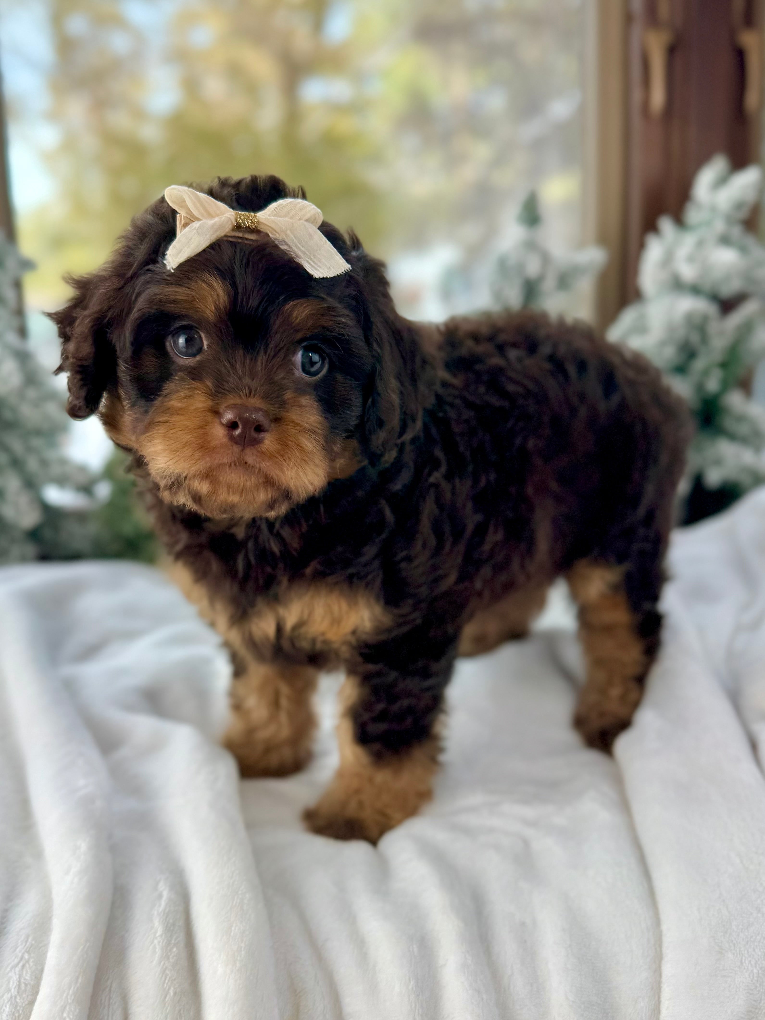 Merry is currently 7 weeks old and 4.6 lbs. She has a beautiful wavy chocolate phantom coat and a gentle-natured, playful personality. Merry is very human-focused, loves being near people, and enjoys both playtime and snuggles.