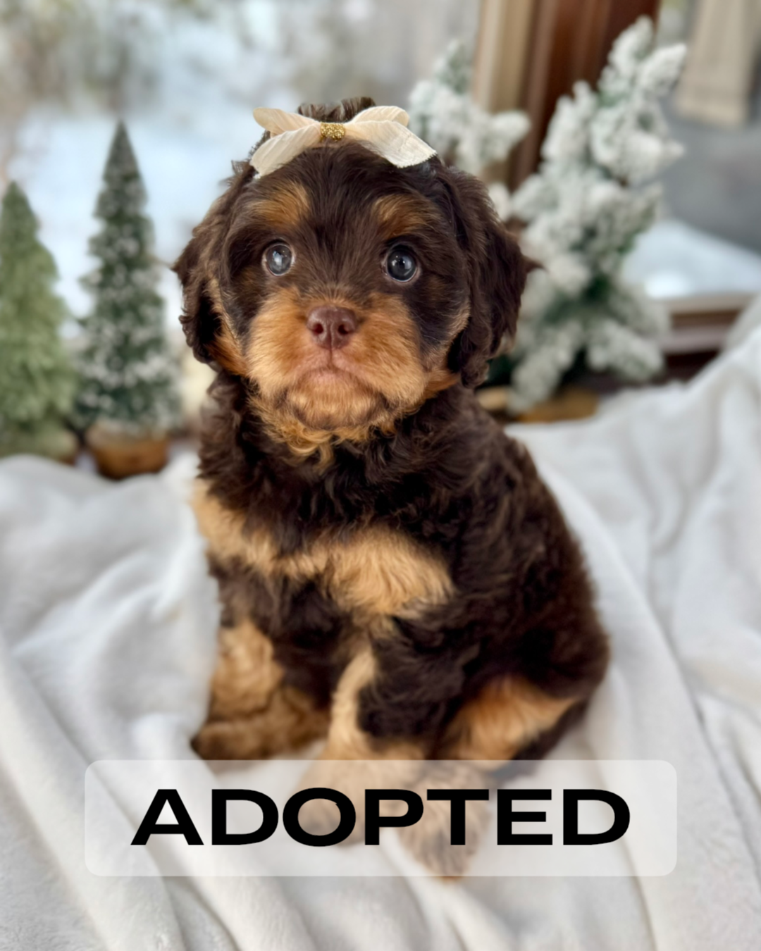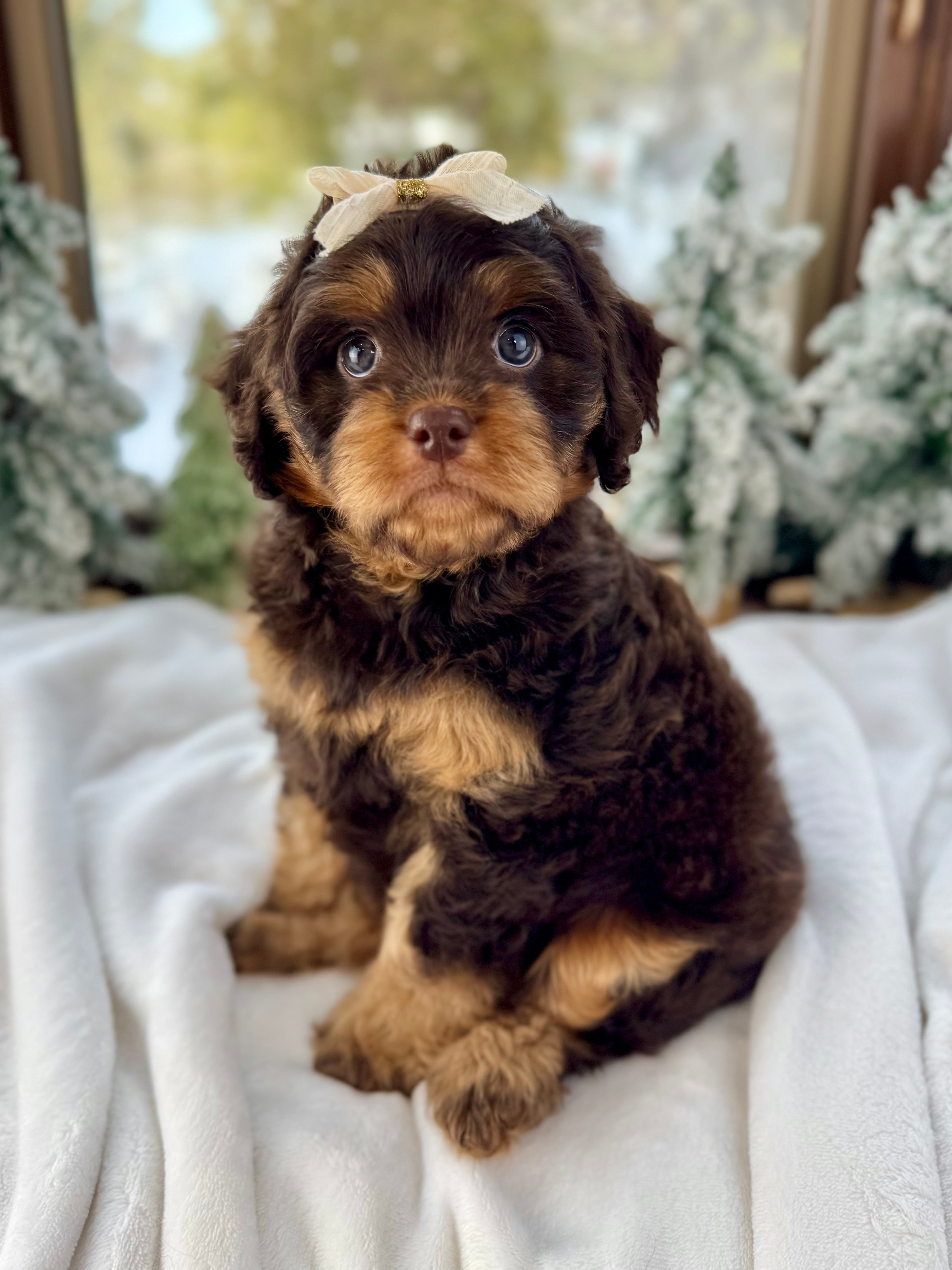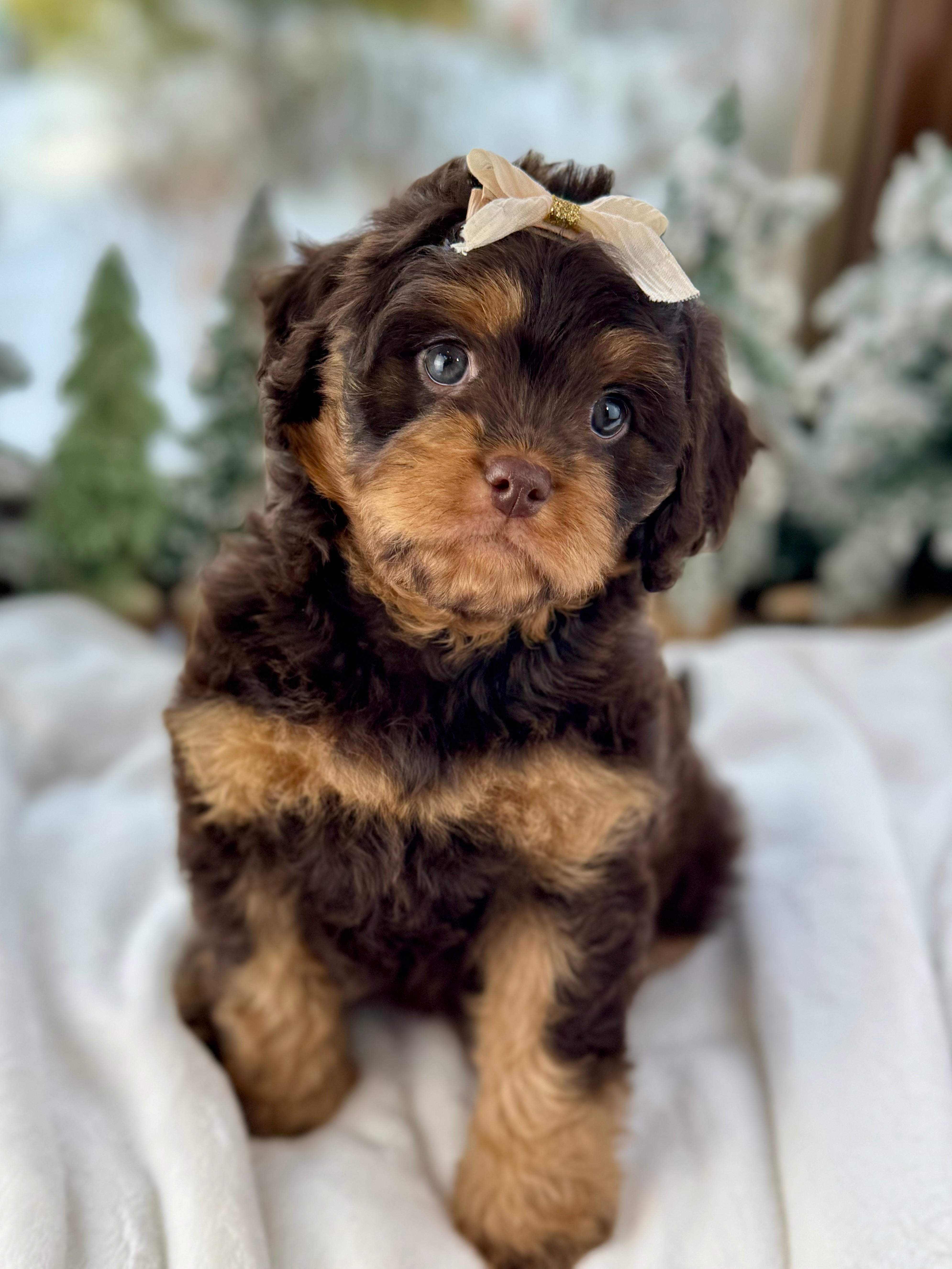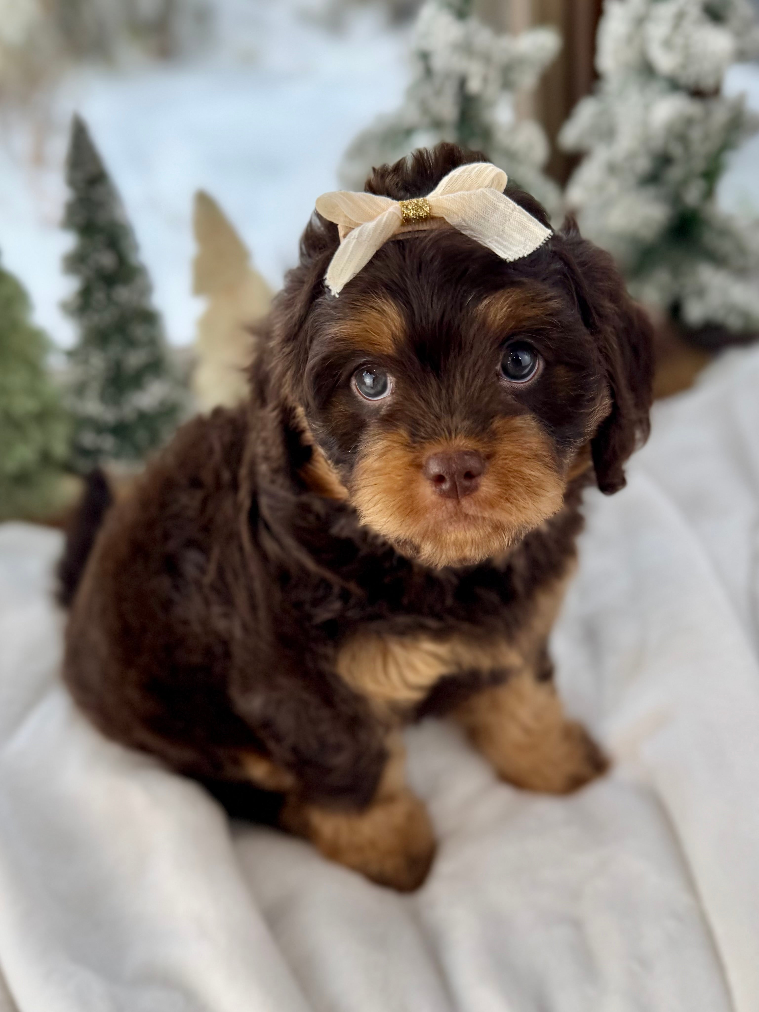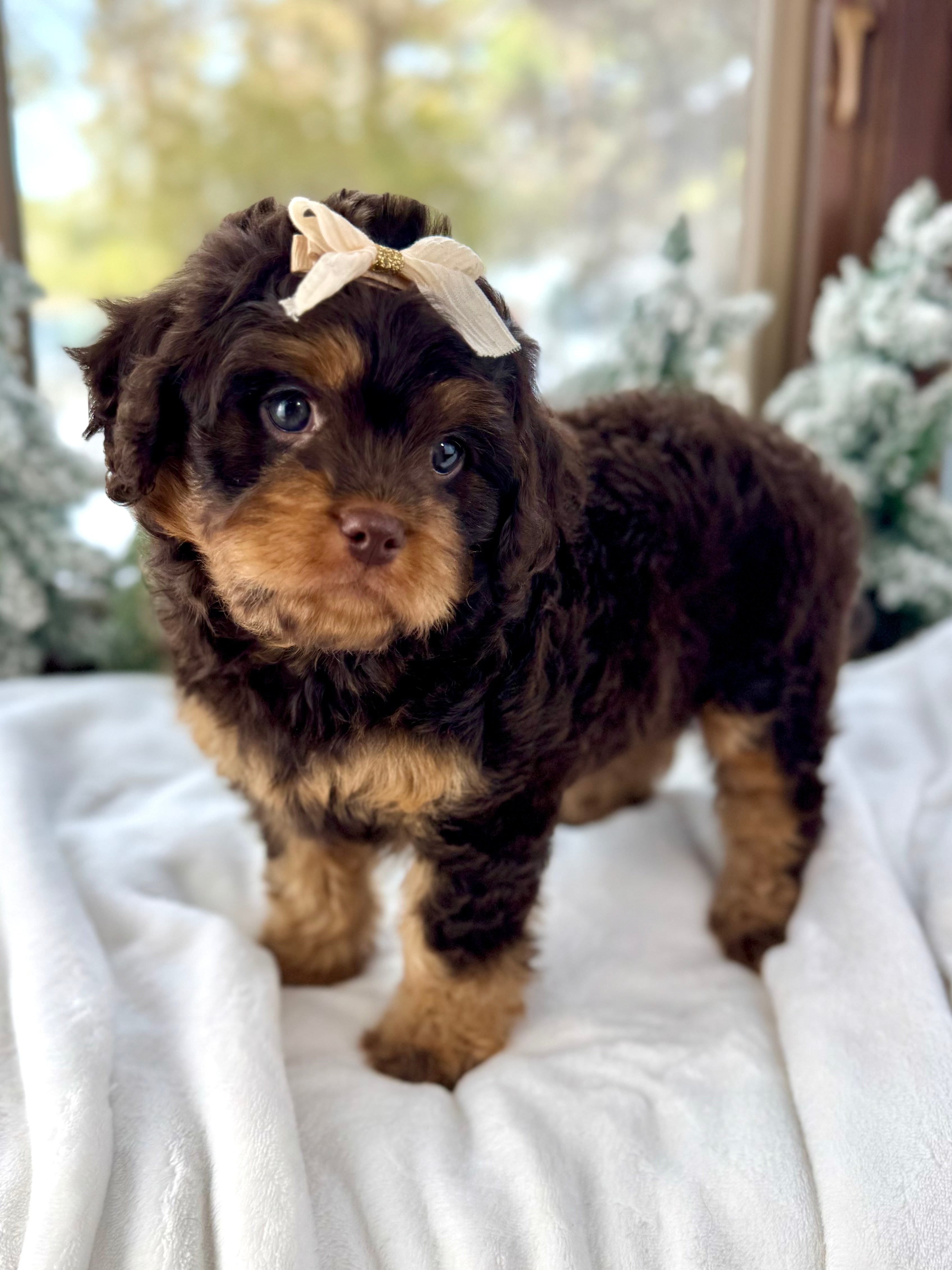 Merry is currently 7 weeks old and 4.6 lbs. She has a beautiful wavy chocolate phantom coat and a gentle-natured, playful personality. Merry is very human-focused, loves being near people, and enjoys both playtime and snuggles.
