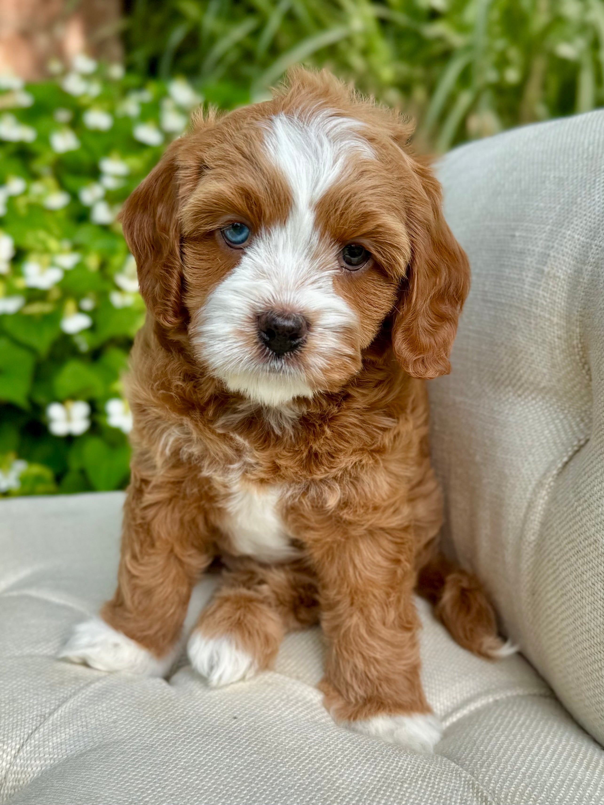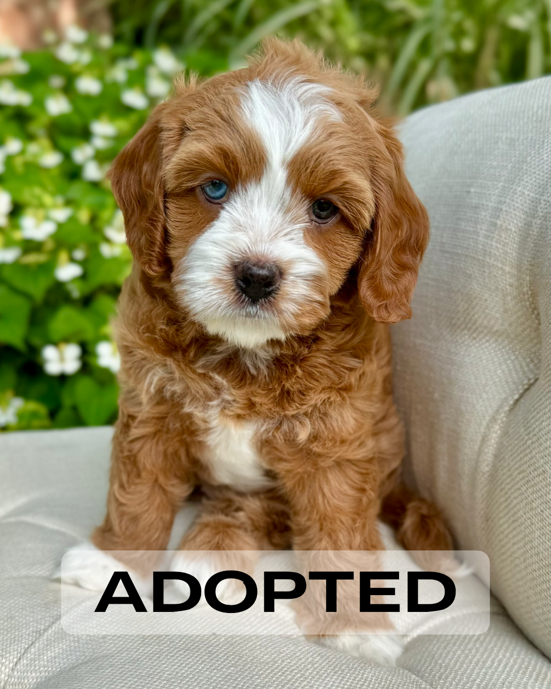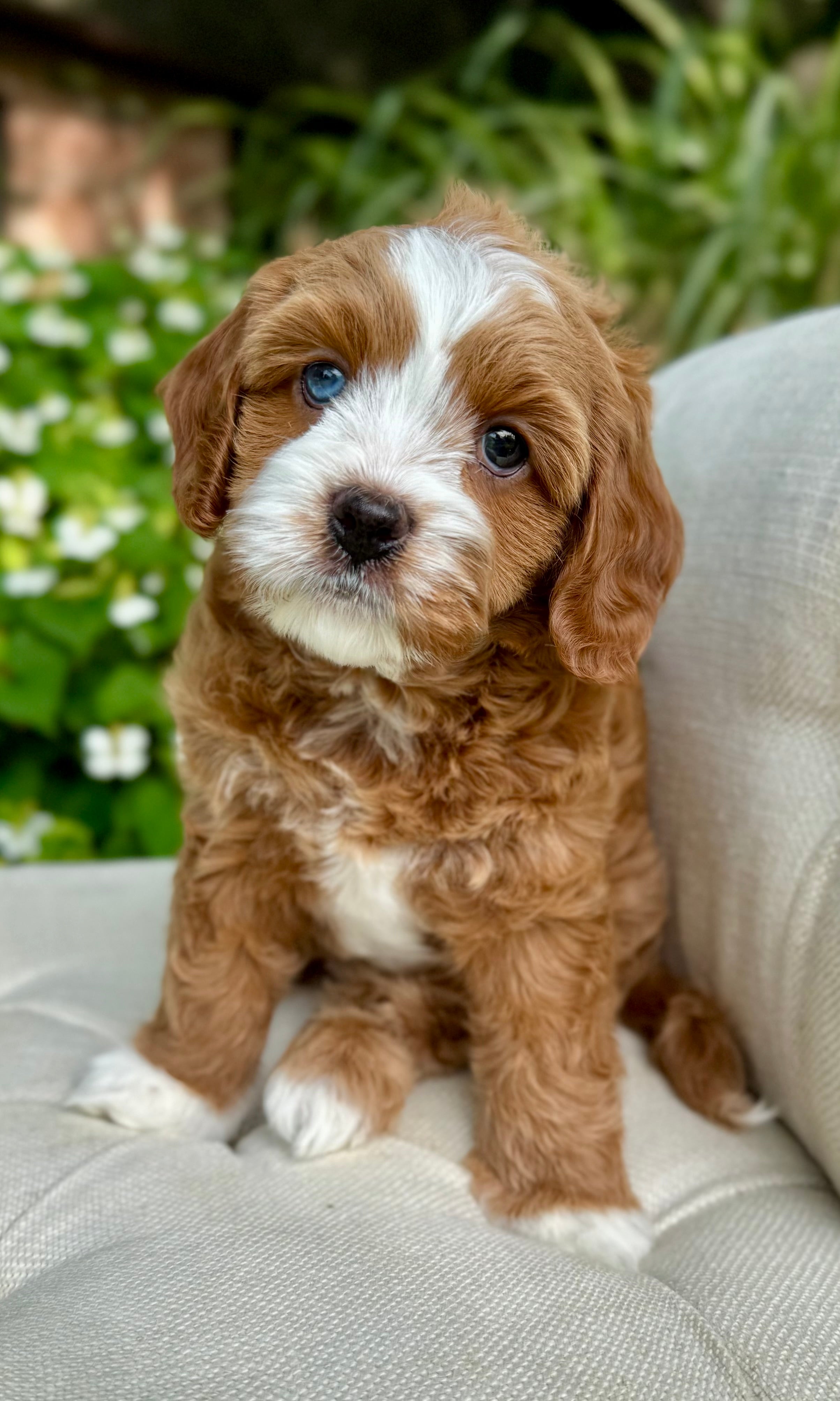 Meet Lizzie! This adorable red tuxedo Cavapoo puppy was born on May 12th and is looking for a loving Guardian Home! At 7 weeks old and 2.4 lbs, she is expected to weigh 10-15 lbs full-grown. Lizzie is affectionate, playful, and full of charm, making her the perfect addition to a caring home.