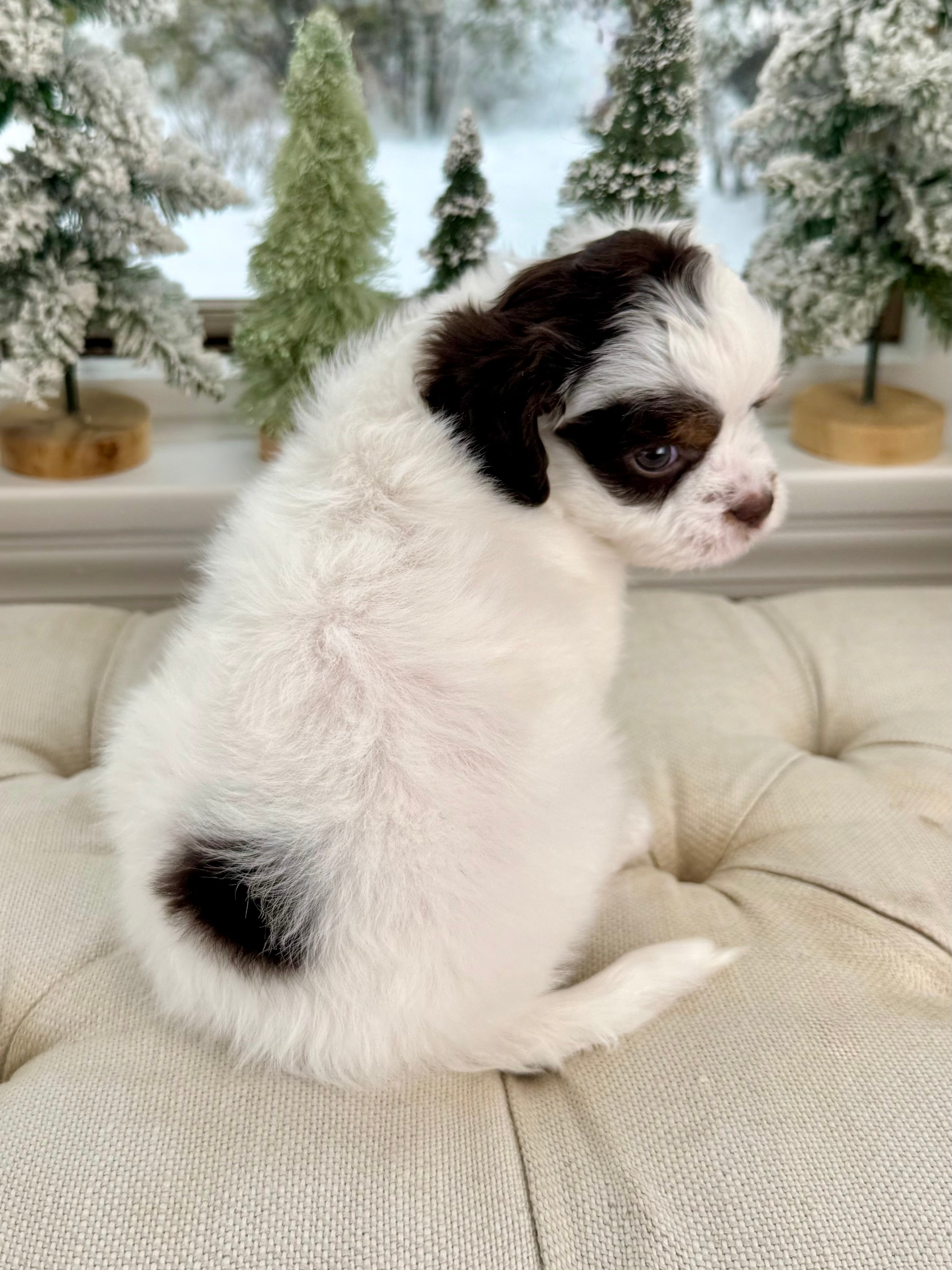 Moose is currently 8 weeks old and weighs 2.6 lbs. He has a beautiful chocolate parti coat with a soft, wavy, non-shedding texture and a gentle, affectionate personality. Moose is observant and sweet, already showing a calm, people-focused nature with playful curiosity.