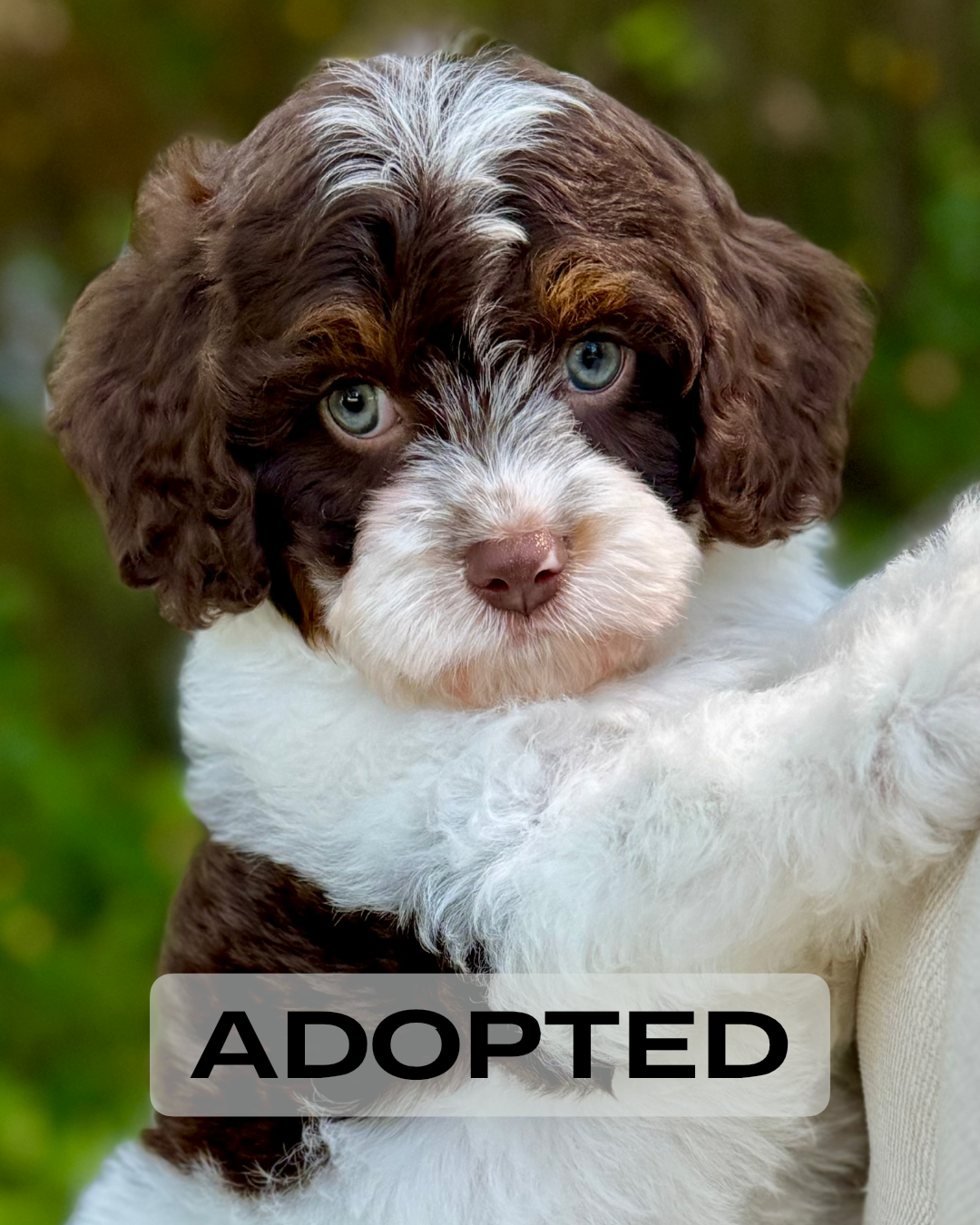 Niblet is 10 weeks, 6.4 lbs and growing. He was born July 15th and will be ready to go home September 9thβ13th. Niblet is an F1 Cavapoo with a handsome chocolate phantom parti wavy, non-shedding coat and warm hazel eyes. Heβs a playful, confident little guy who loves to exploreβand happily settles in for a snuggle when itβs time to rest. Expected adult weight is 15β20 lbs full grown.