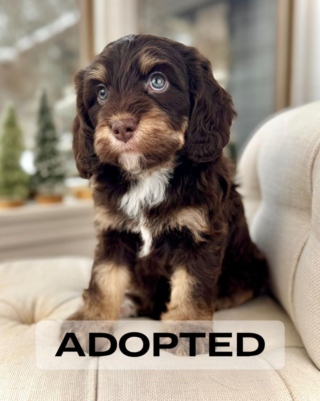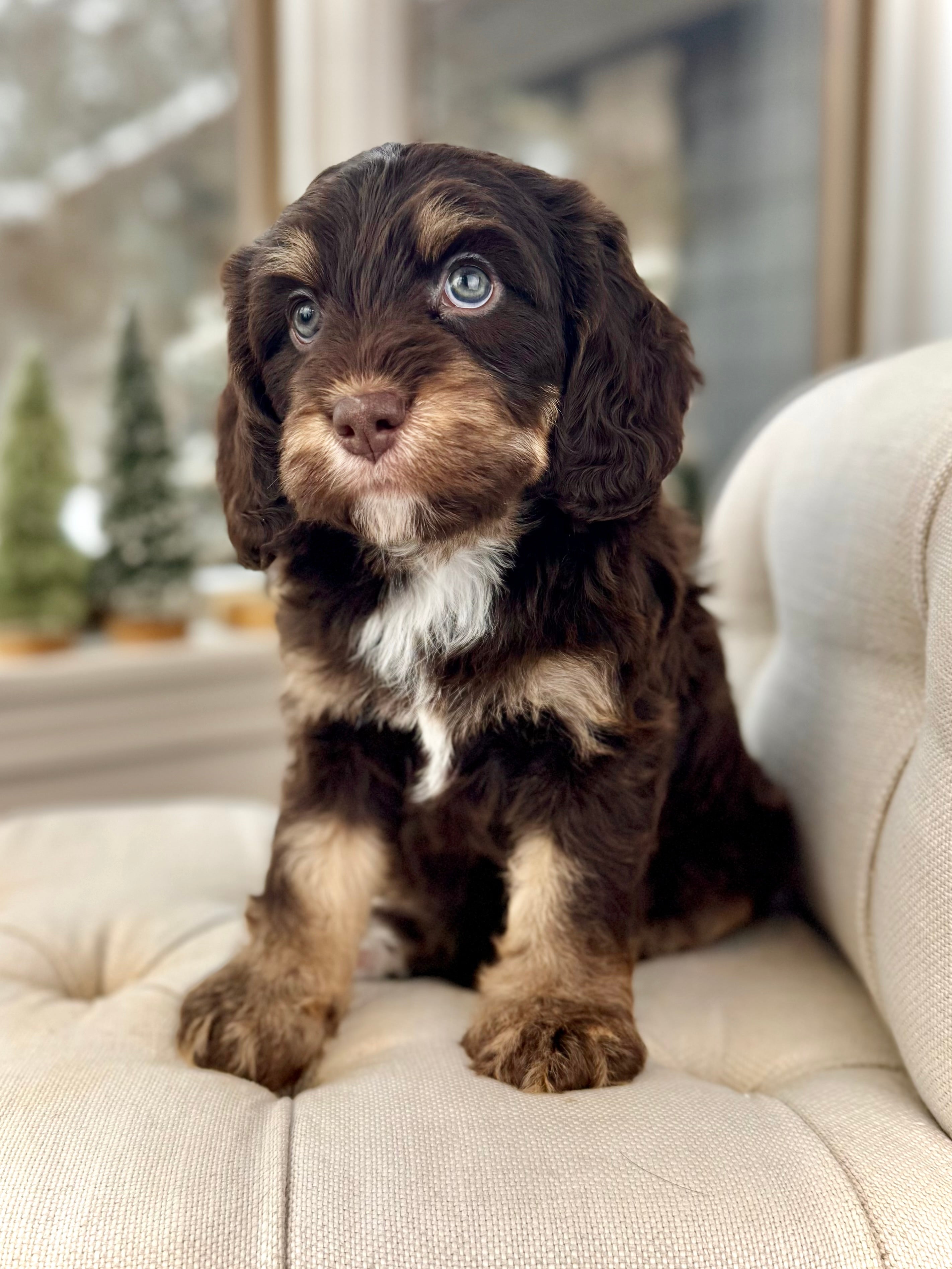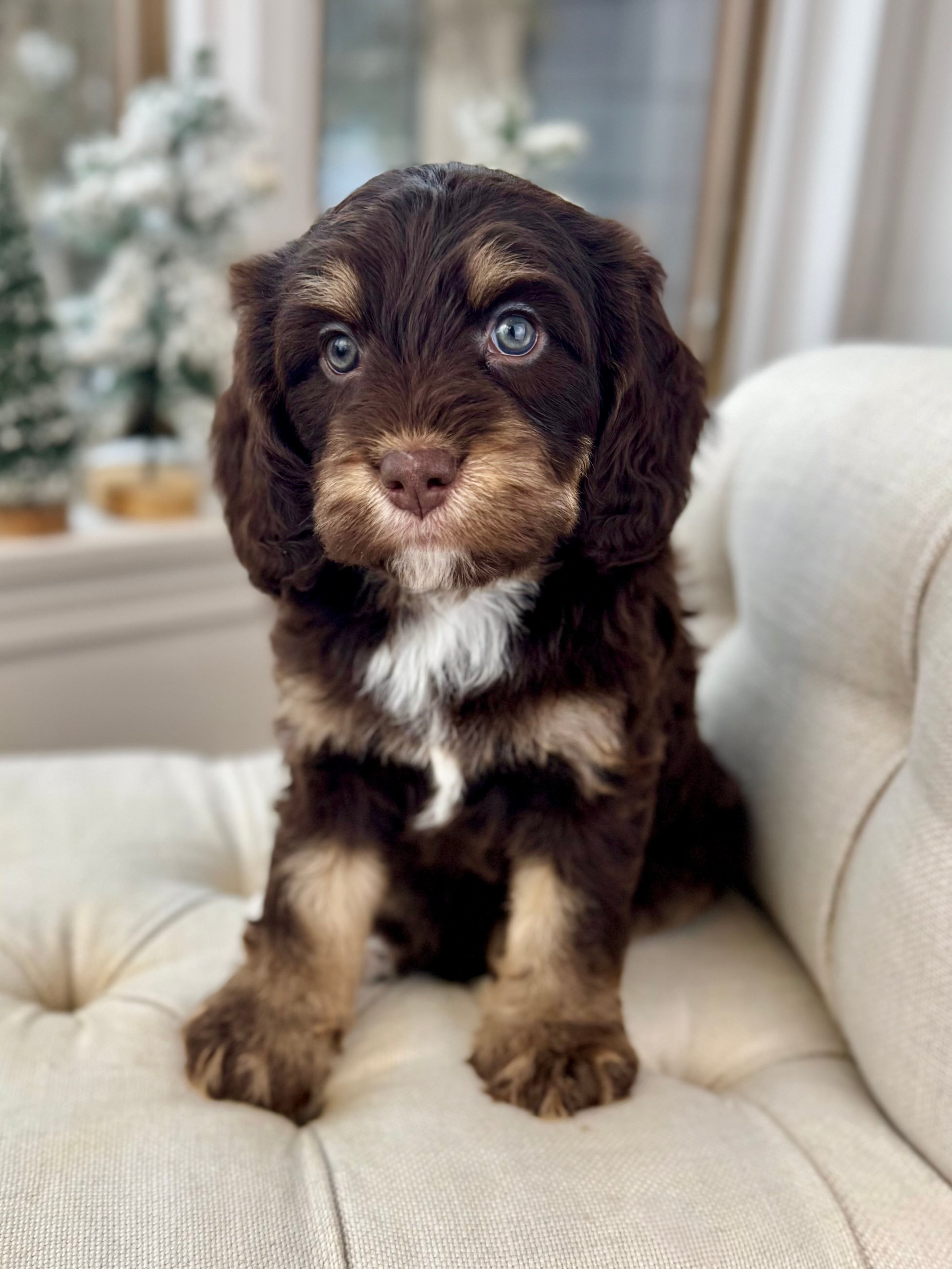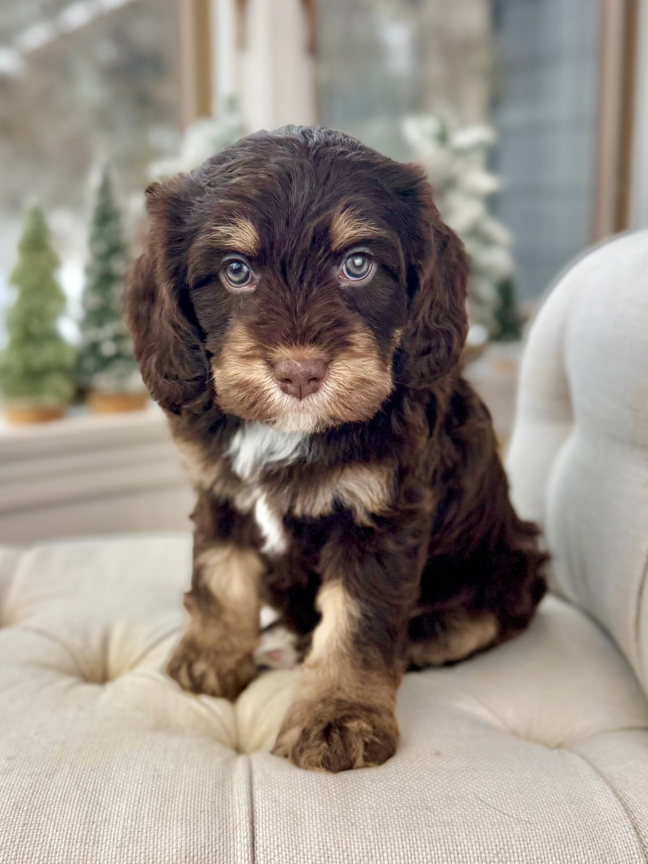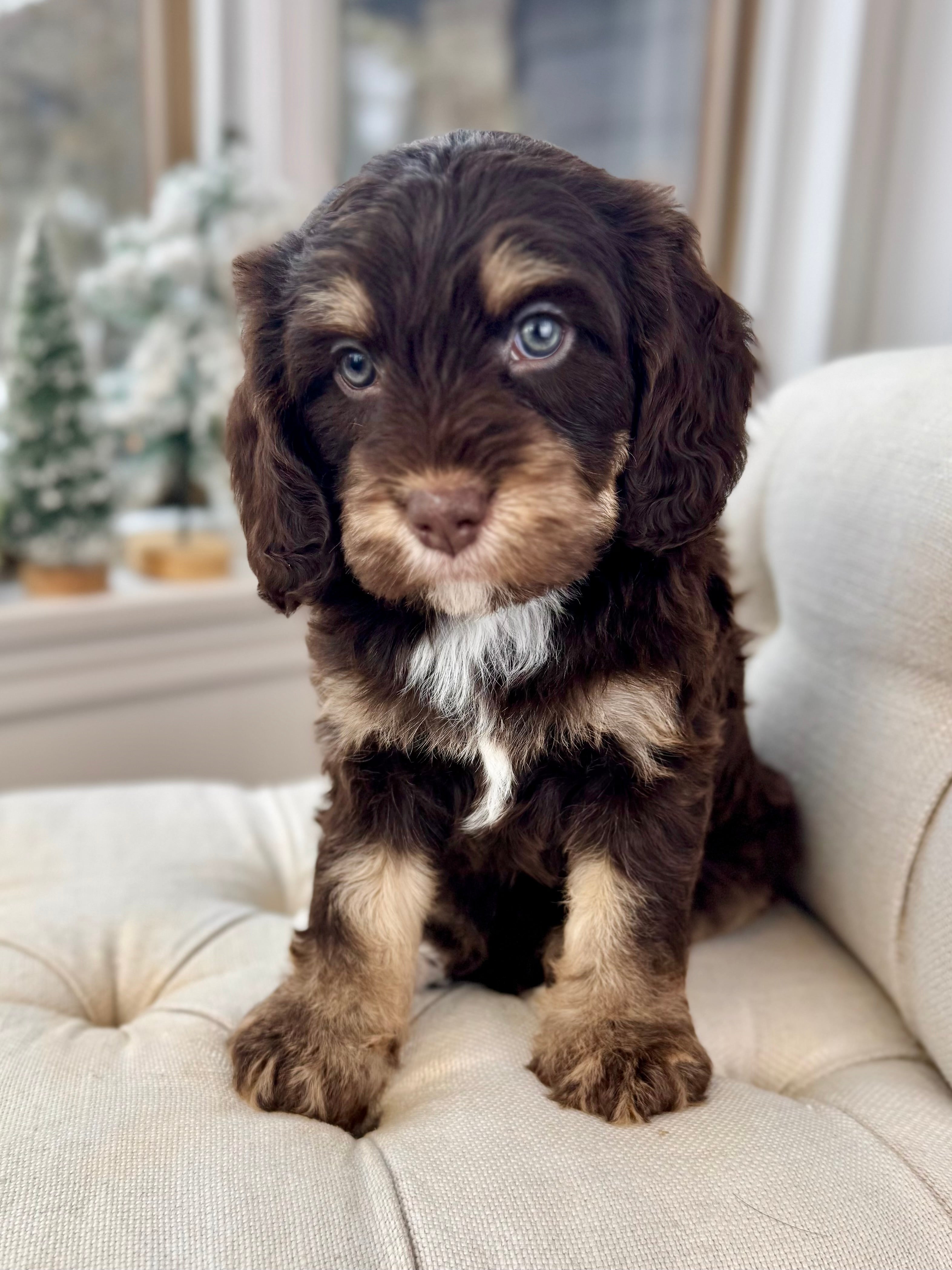 Opie is currently 6 weeks old and weighs 5.1 lbs. He has a striking chocolate merle phantom coat with a soft, wavy, non-shedding texture and the sweetest, easygoing personality. Opie is affectionate, people-focused, and already showing a wonderful balance of playful curiosity and calm cuddle time.