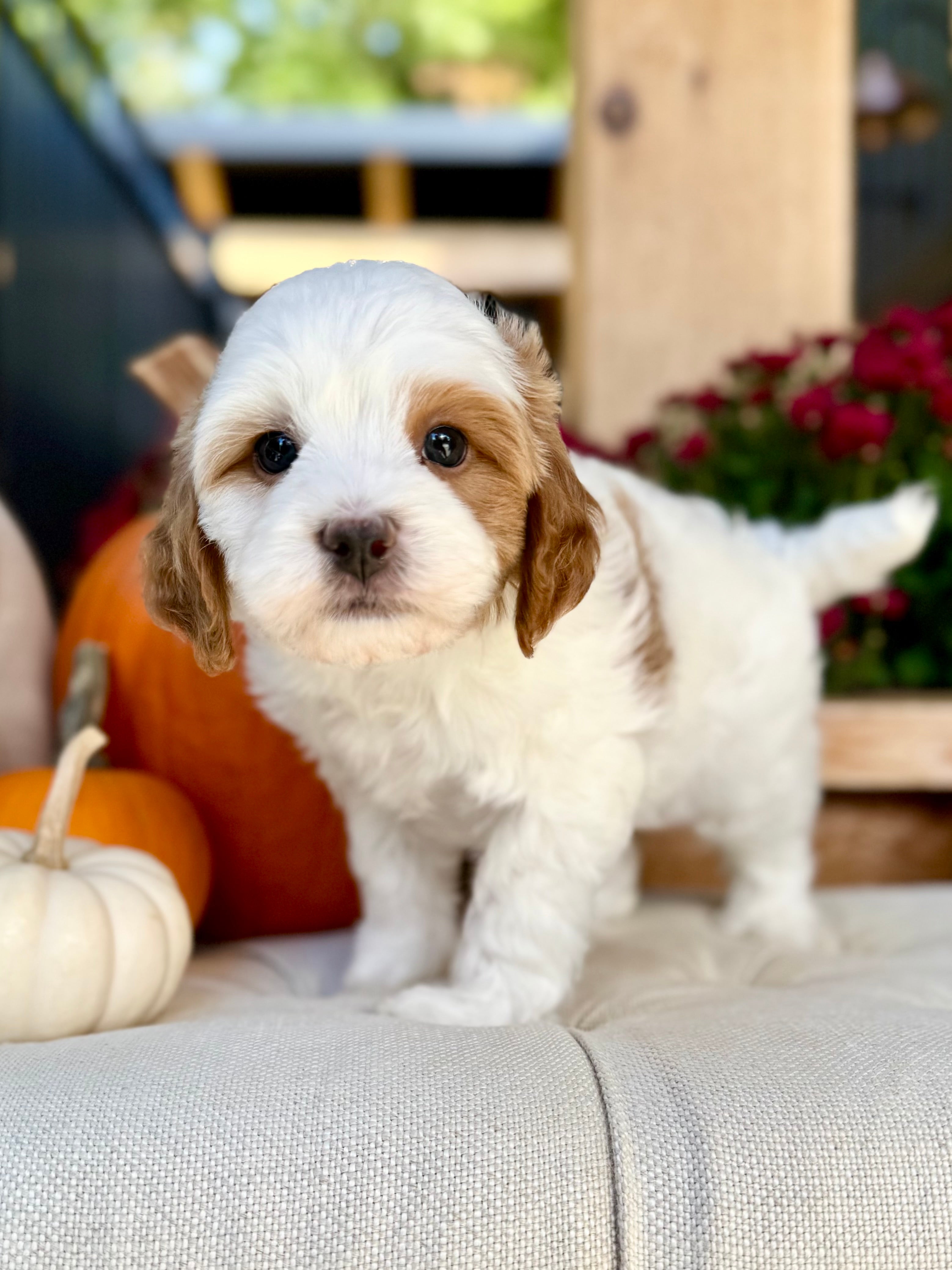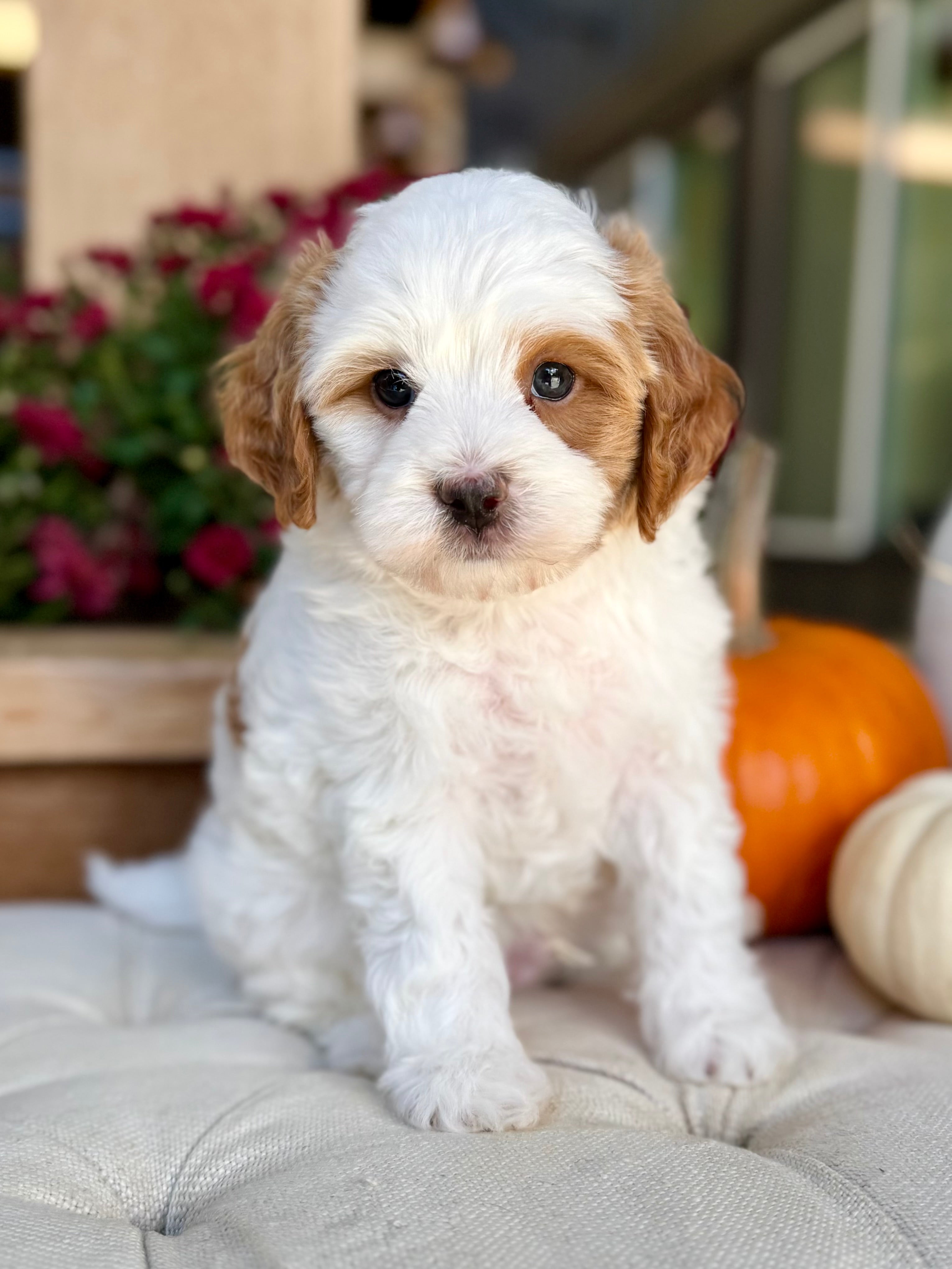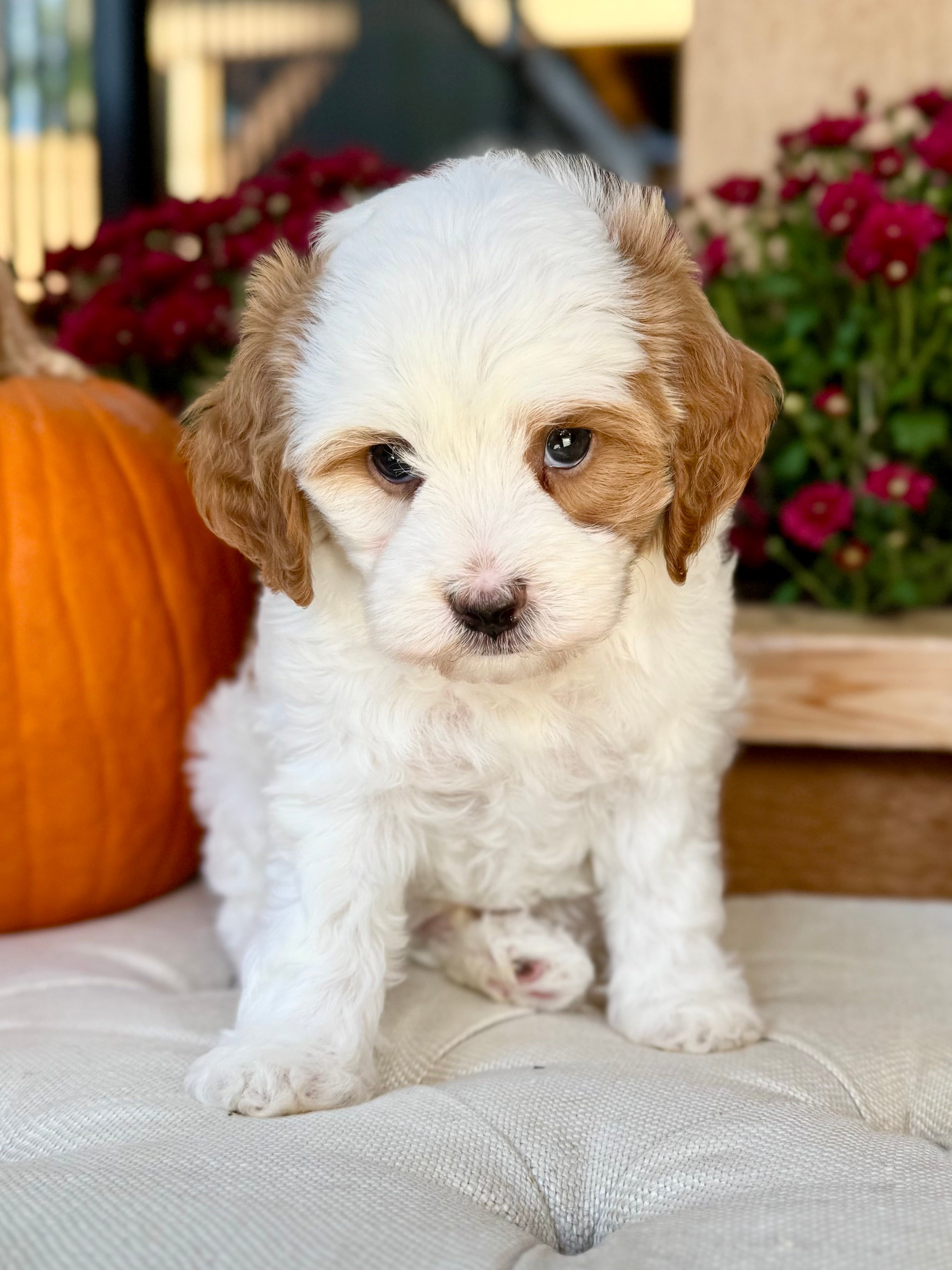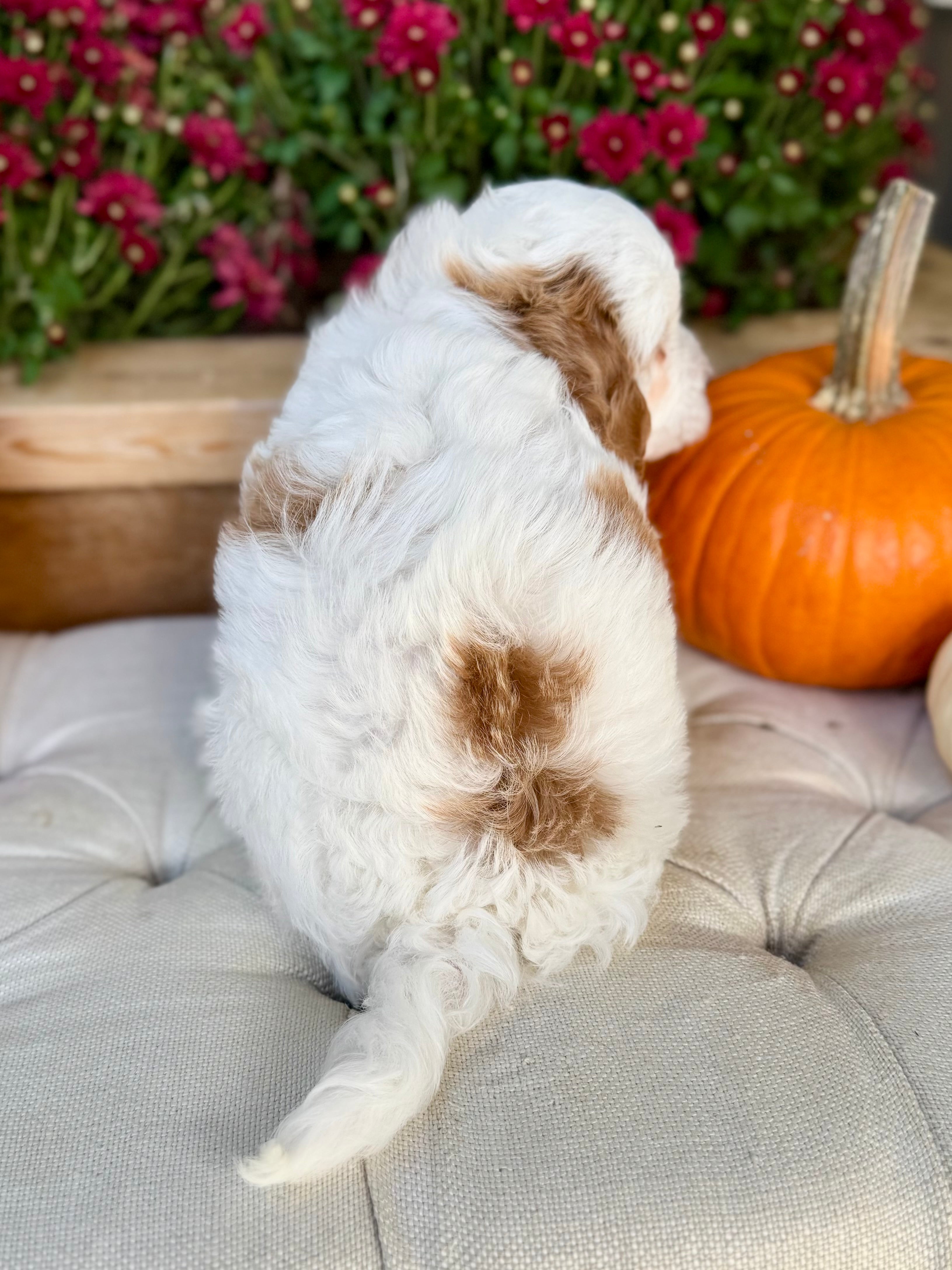 Otis is a 7-week-old F1b Cavapoo with a soft, Blenheim wavy coat and a calm, affectionate personality. He’s a happy little boy who enjoys exploring his surroundings but is always content to settle in for cuddles. Born on August 19th and currently weighing 3.4 lbs, Otis is expected to be 8–14 lbs full grown. His mom, Mya, is a 14 lb Poodle and his dad, Theodore, is a 18 lb Cavapoo—both genetically health tested to ensure strong, healthy puppies.