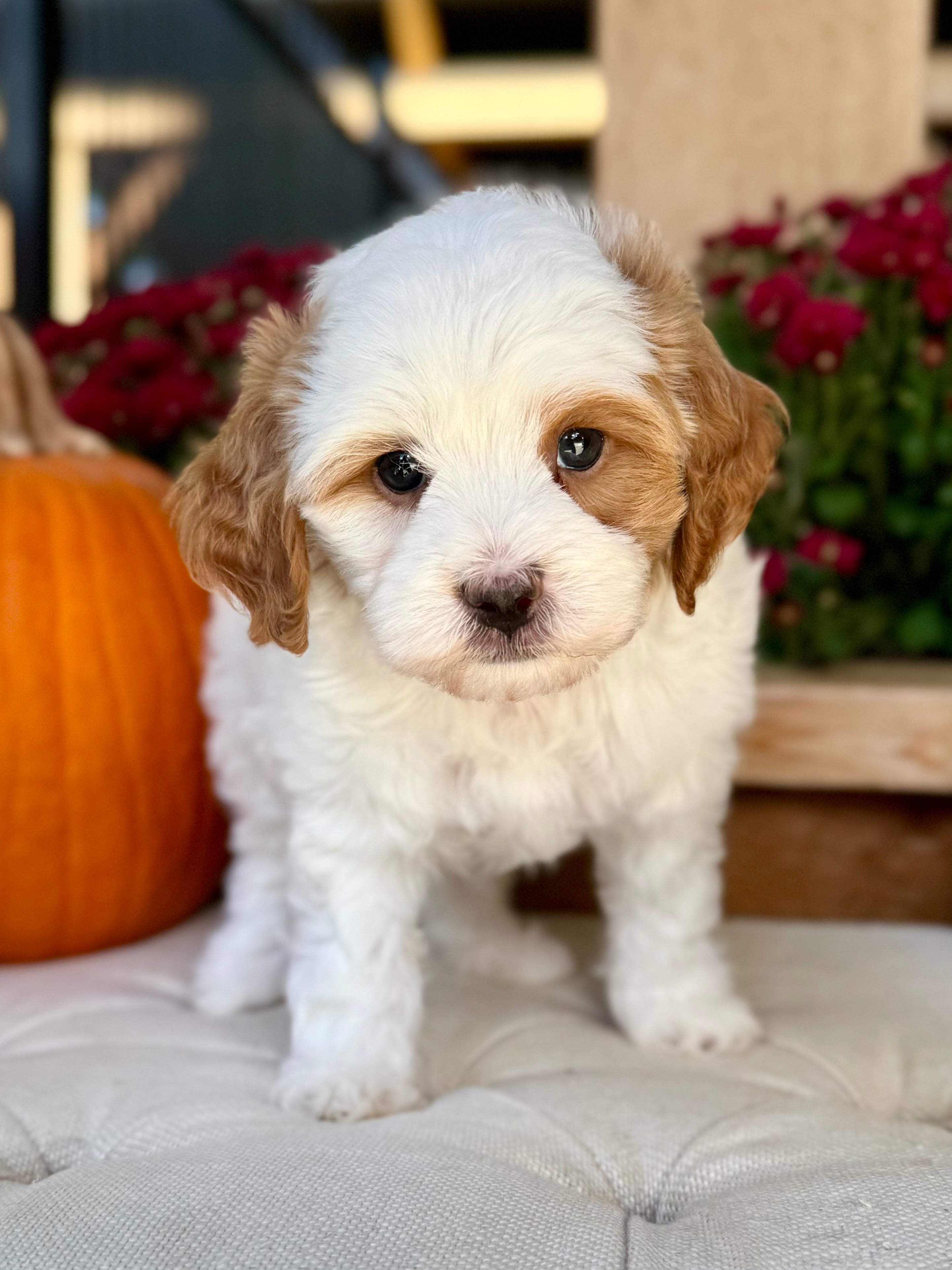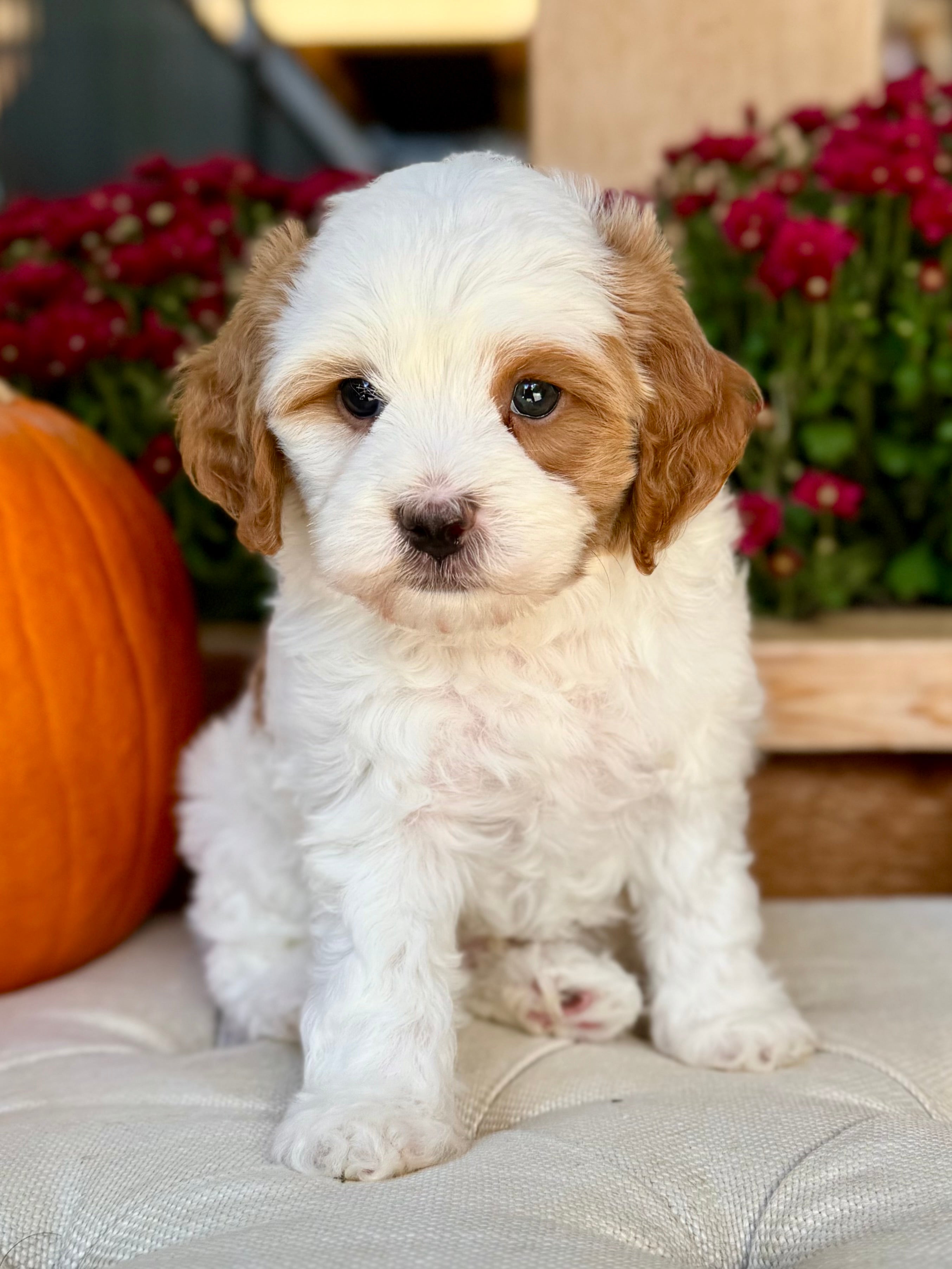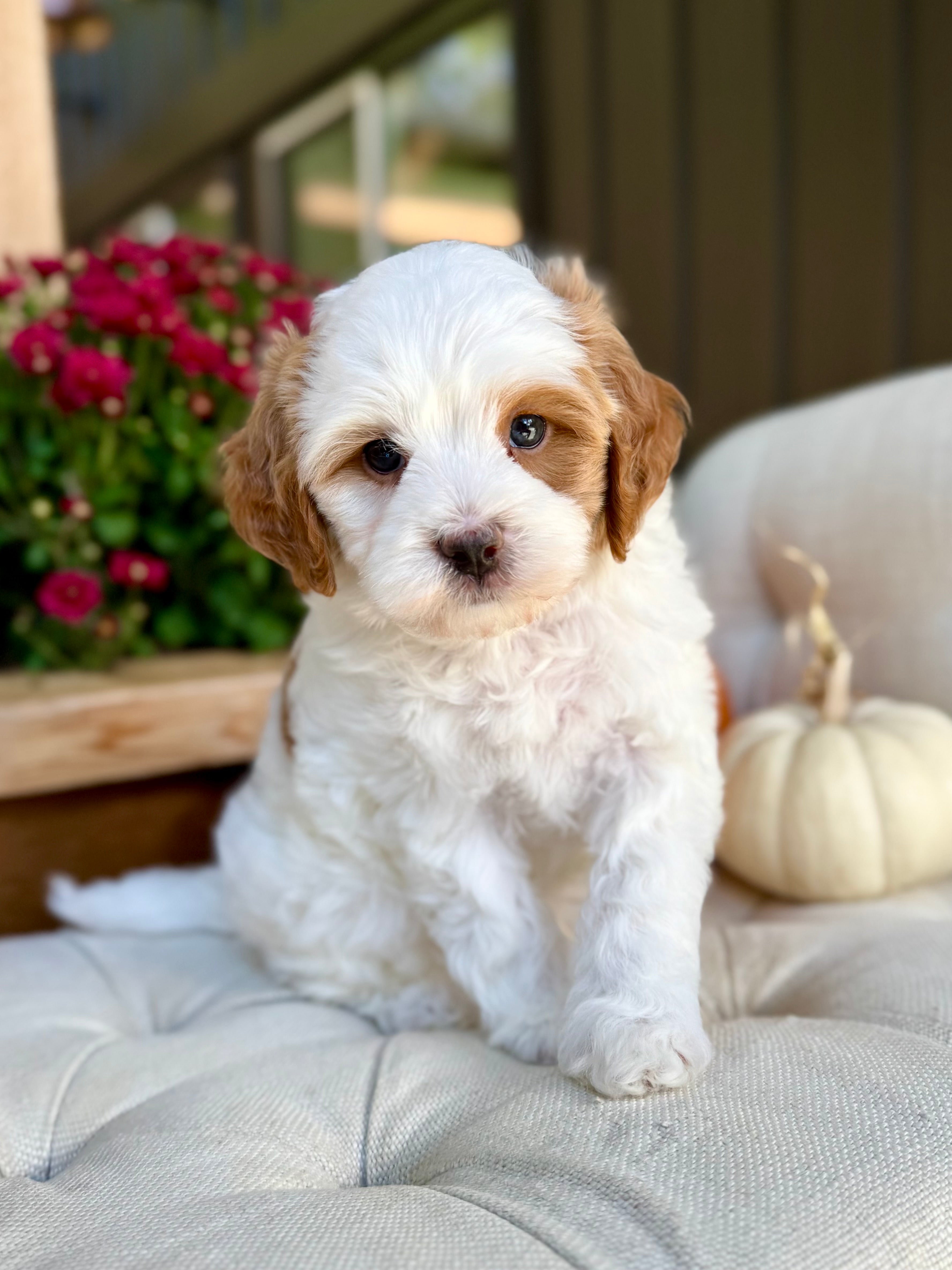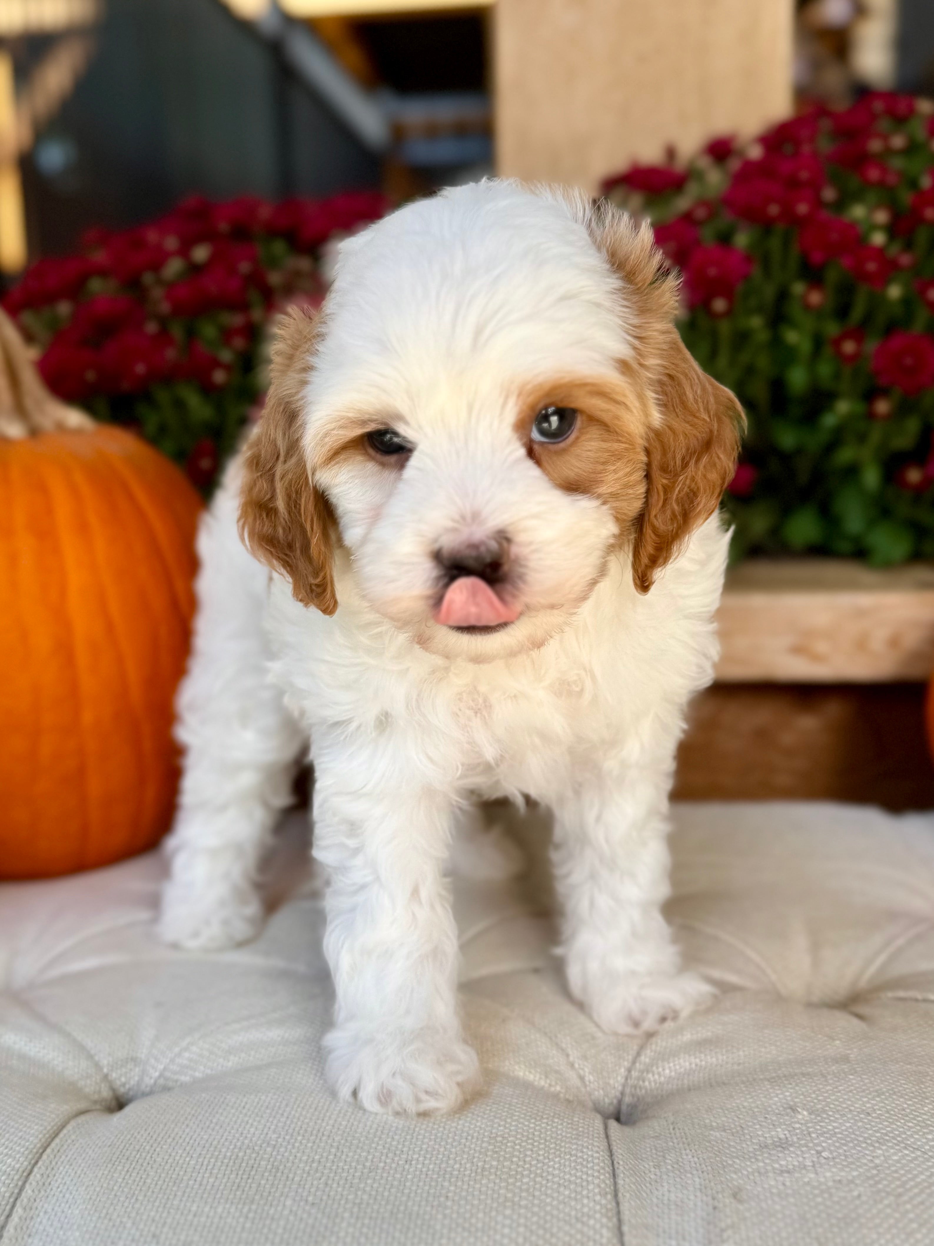 Otis is a 7-week-old F1b Cavapoo with a soft, Blenheim wavy coat and a calm, affectionate personality. He’s a happy little boy who enjoys exploring his surroundings but is always content to settle in for cuddles. Born on August 19th and currently weighing 3.4 lbs, Otis is expected to be 8–14 lbs full grown. His mom, Mya, is a 14 lb Poodle and his dad, Theodore, is a 18 lb Cavapoo—both genetically health tested to ensure strong, healthy puppies.