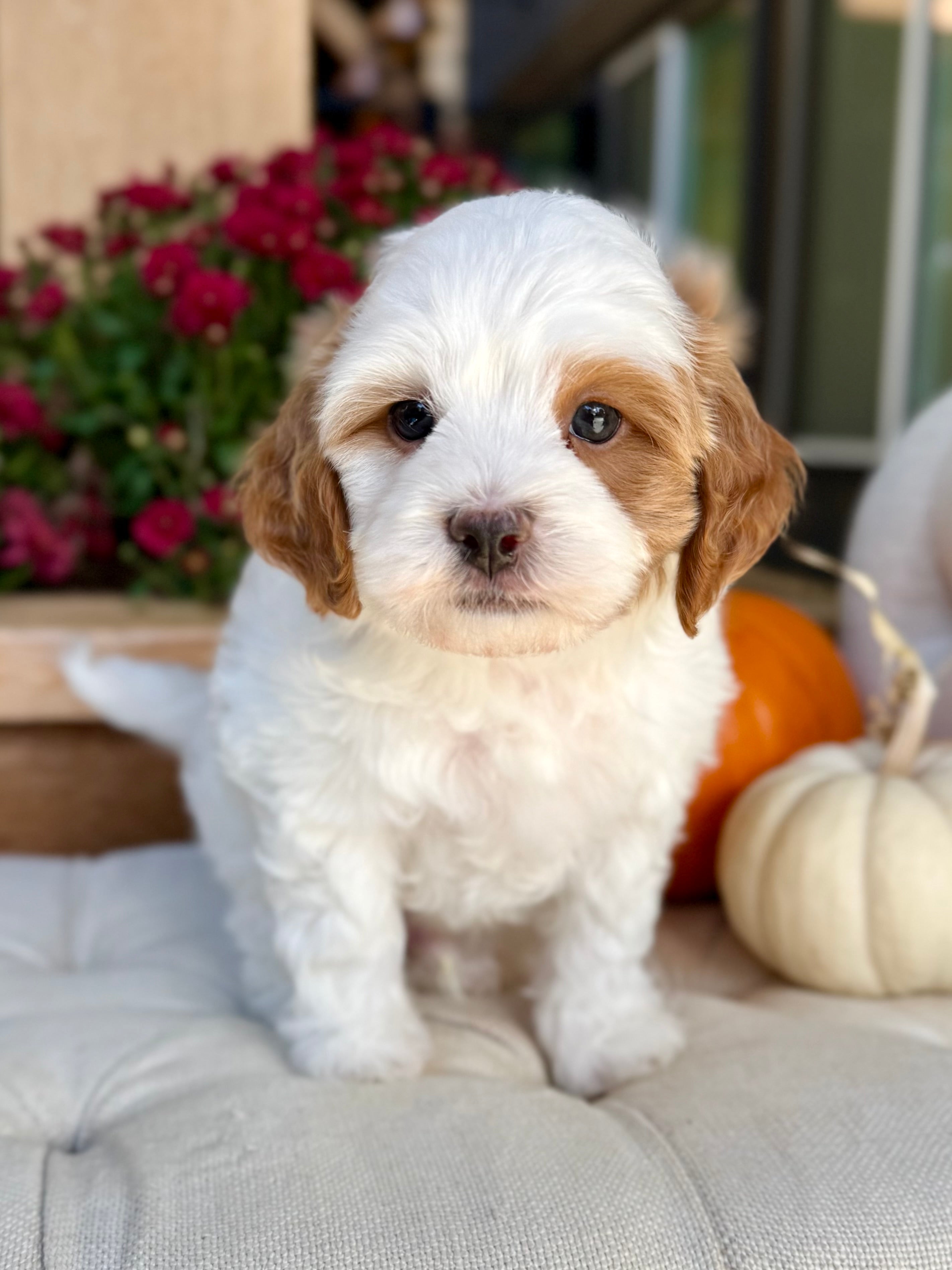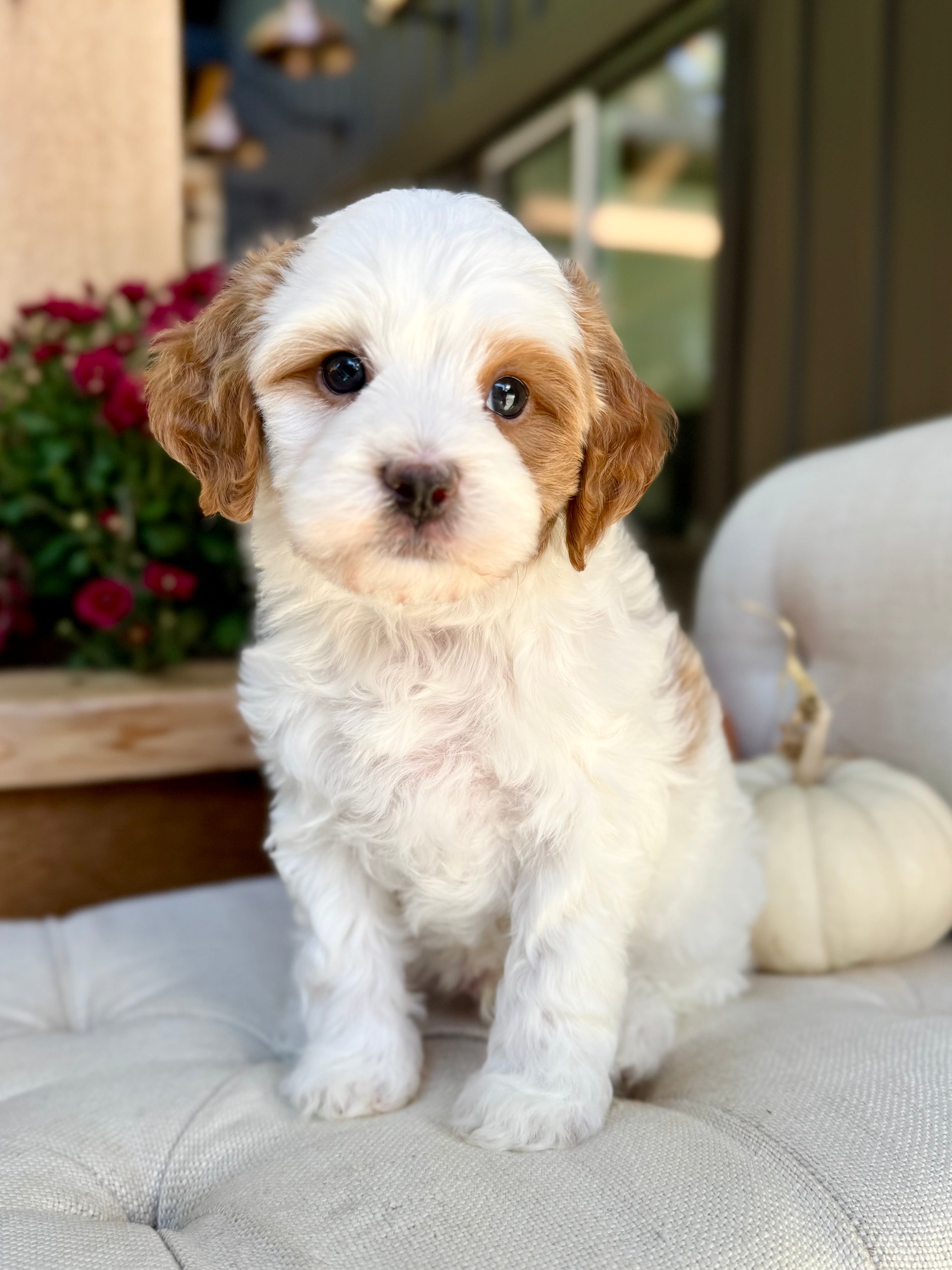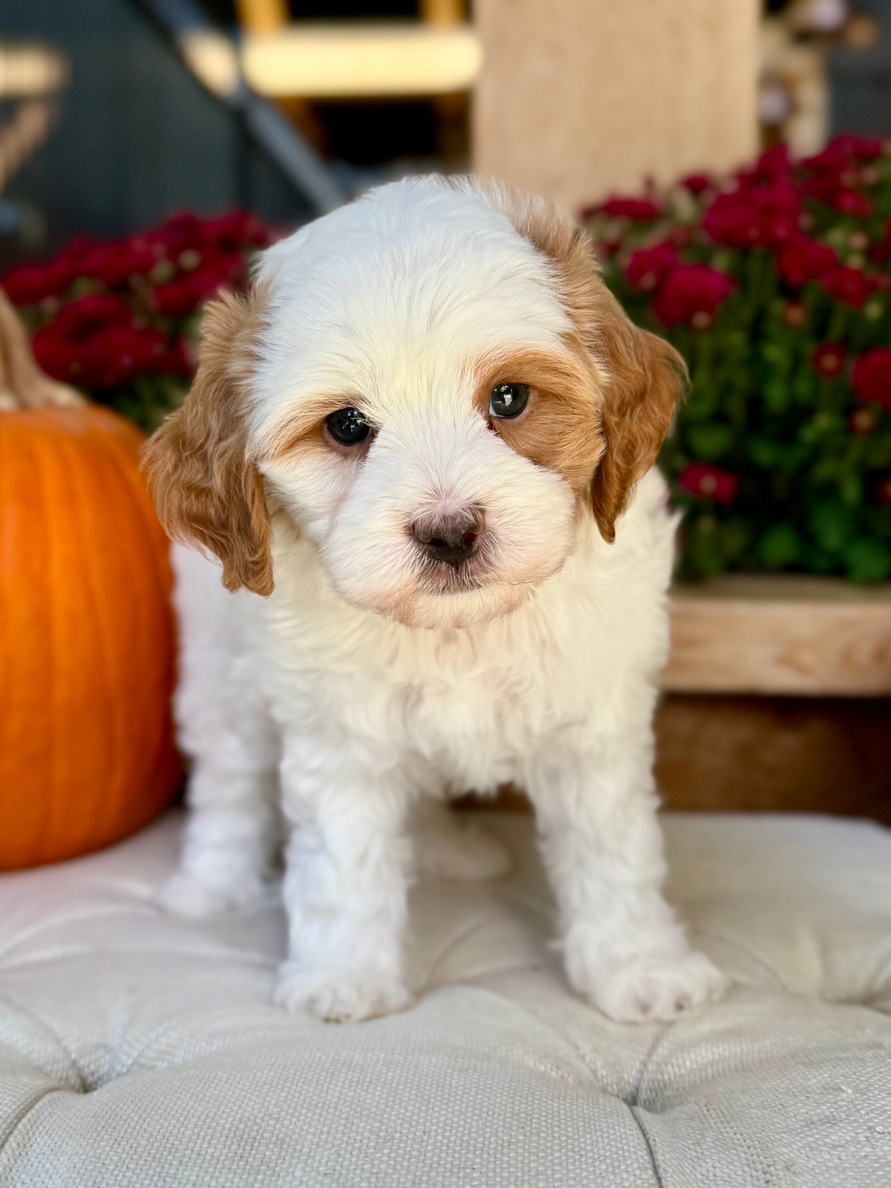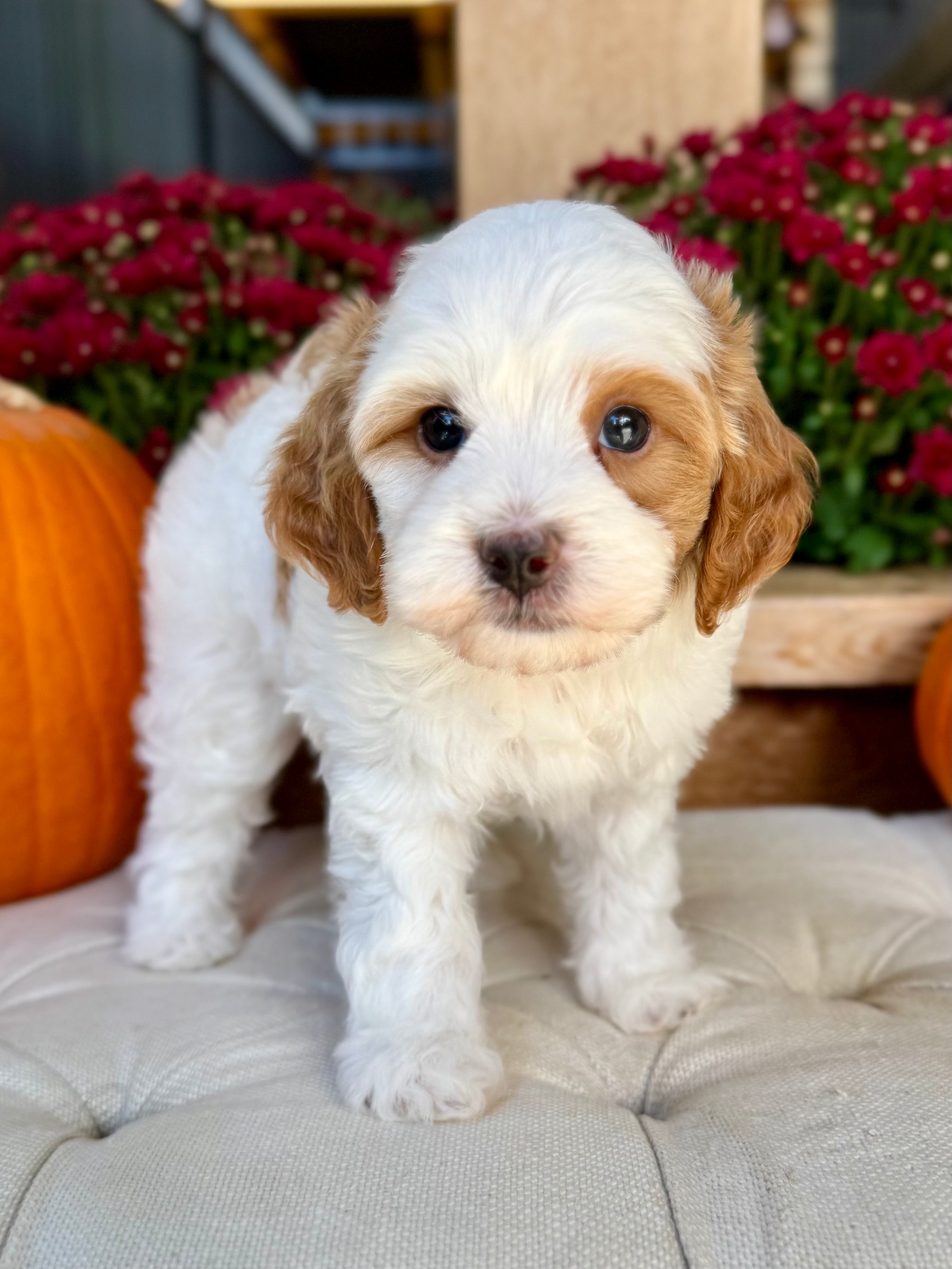 Otis is a 7-week-old F1b Cavapoo with a soft, Blenheim wavy coat and a calm, affectionate personality. He’s a happy little boy who enjoys exploring his surroundings but is always content to settle in for cuddles. Born on August 19th and currently weighing 3.4 lbs, Otis is expected to be 8–14 lbs full grown. His mom, Mya, is a 14 lb Poodle and his dad, Theodore, is a 18 lb Cavapoo—both genetically health tested to ensure strong, healthy puppies.