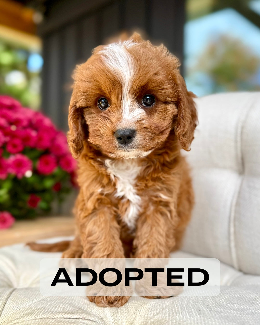 Paco is a 8-week-old F1 Cavapoo with a soft, dark, red wavy coat and a calm, affectionate personality. Heโs a happy little boy who enjoys exploring his surroundings but is always content to settle in for cuddles. Born on August 18th and currently weighing 3.59 lbs, Paco is expected to be 8โ12 lbs full grown. His mom, Rita, is a 10 lb red Poodle, and his dad, Snickers, is a 16 lb Blenheim Cavalierโboth genetically health tested to ensure strong, healthy puppies.ย
