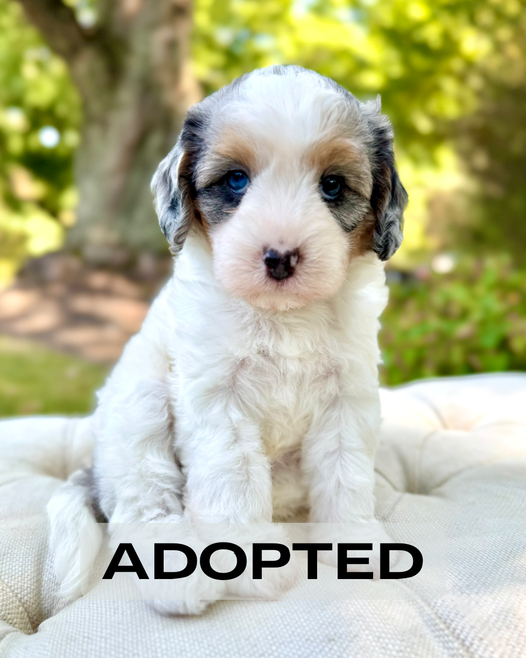 Picasso is 6 weeks, 3.6 lbs and growing. Picasso was born July 31st and is ready to go home September 25th-28th! Β She has a beautiful Blue Merle Parti wavy non-shedding coat and one stunning blue eye. Picasso is a sweet natured little girl who is curious and learning to explore her world. Expected adult weight is 8-12 lbs full grown. The mother, Birdie, is a 12 lb Cavapoo, and the father, Bernard, is a 7.5 lb Merle Parti Poodle. Both parents have undergone genetic health testing to ensure healthy and strong puppies.