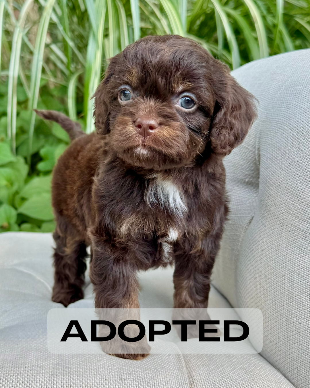 Reese is 6 weeks, 2.0 lbs and growing. Β Reese was born July 1st and is ready to go home August 26th-September 1st!Β She has a beautiful Chocolate/Tri/Phantom wavy non-shedding coat. Reese is a sweet natured little girl who is curious and learning to explore her world. Expected adult weight is 6-11 lbs full grown. The mother, Dottie, is a 10 lb Chocolate/Tri/Phantom Poodle, and the father, Fudge, is a 15 lb Chocolate & Tan Cavalier. Both parents have undergone genetic health testing to ensure healthy and strong puppies.