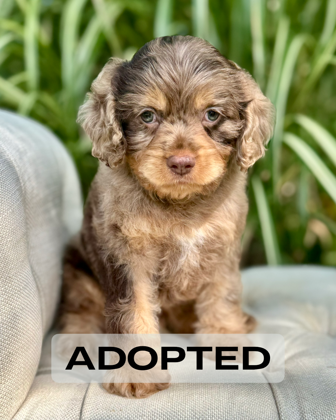 Sequoia is 8 weeks, 5.5 lbs and growing. He was born July 19th and will be ready to go home September 13thβ19th. Sequoia is an F1 Cavapoo with a beautiful Chocolate Merle wavy, non-shedding coat and sweet hazel eyes. Heβs a playful boy with a gentle nature who loves being close and soaking up affection. Expected adult weight is 20β25 lbs full grown.