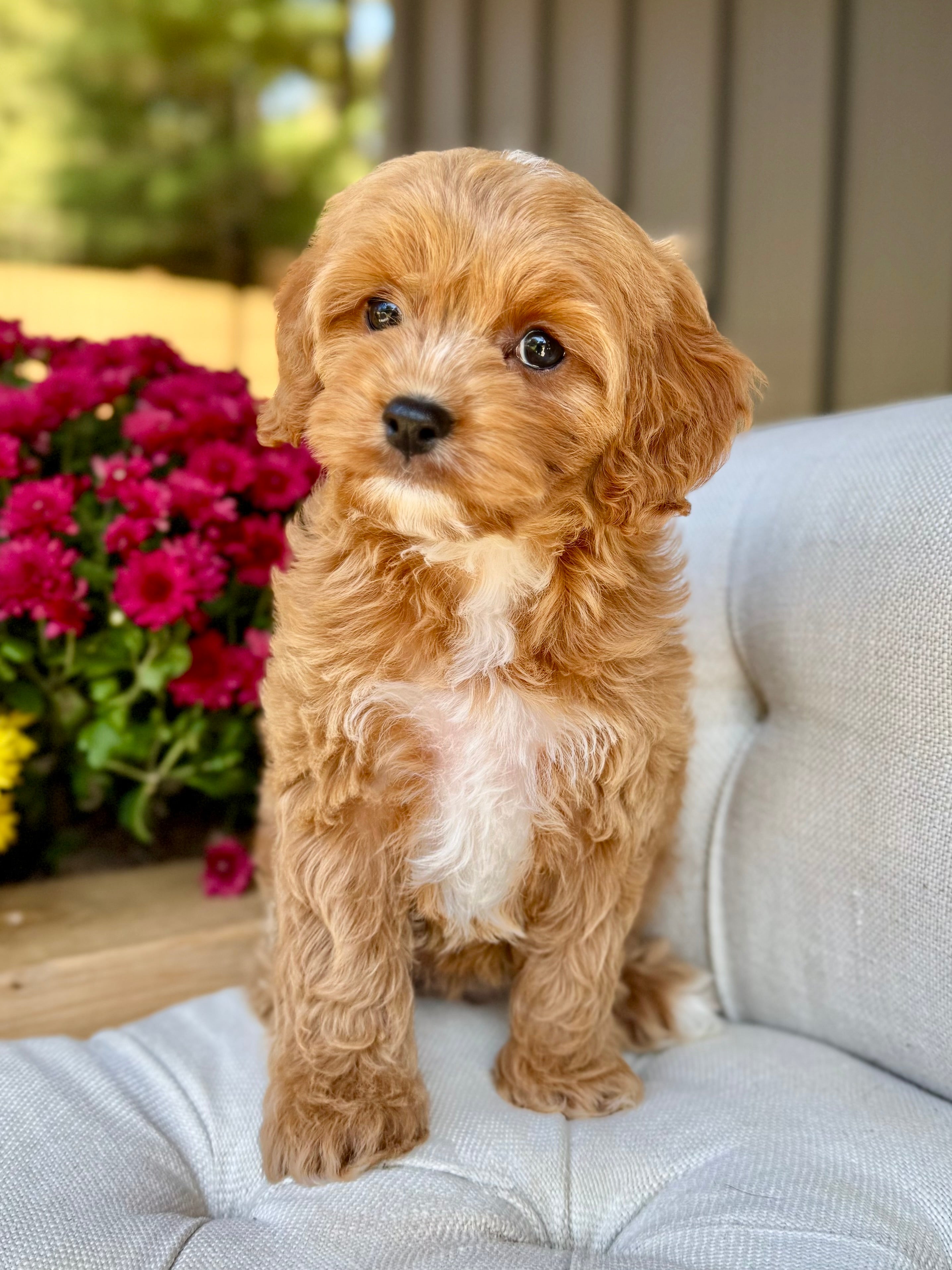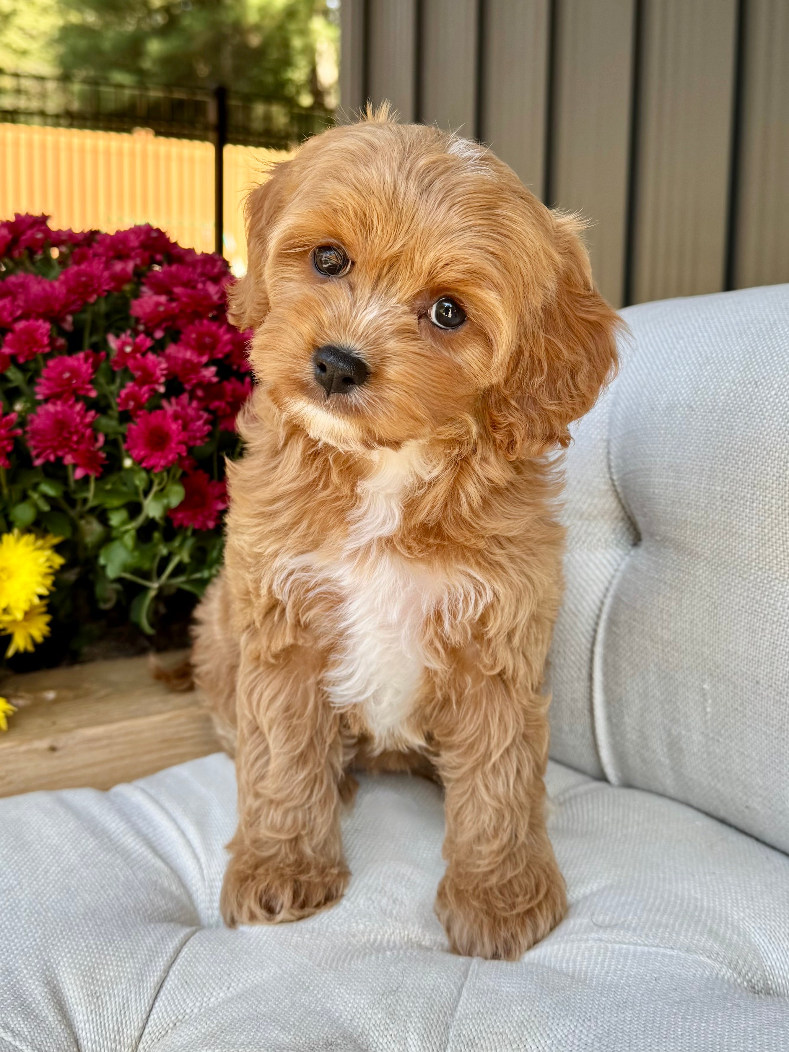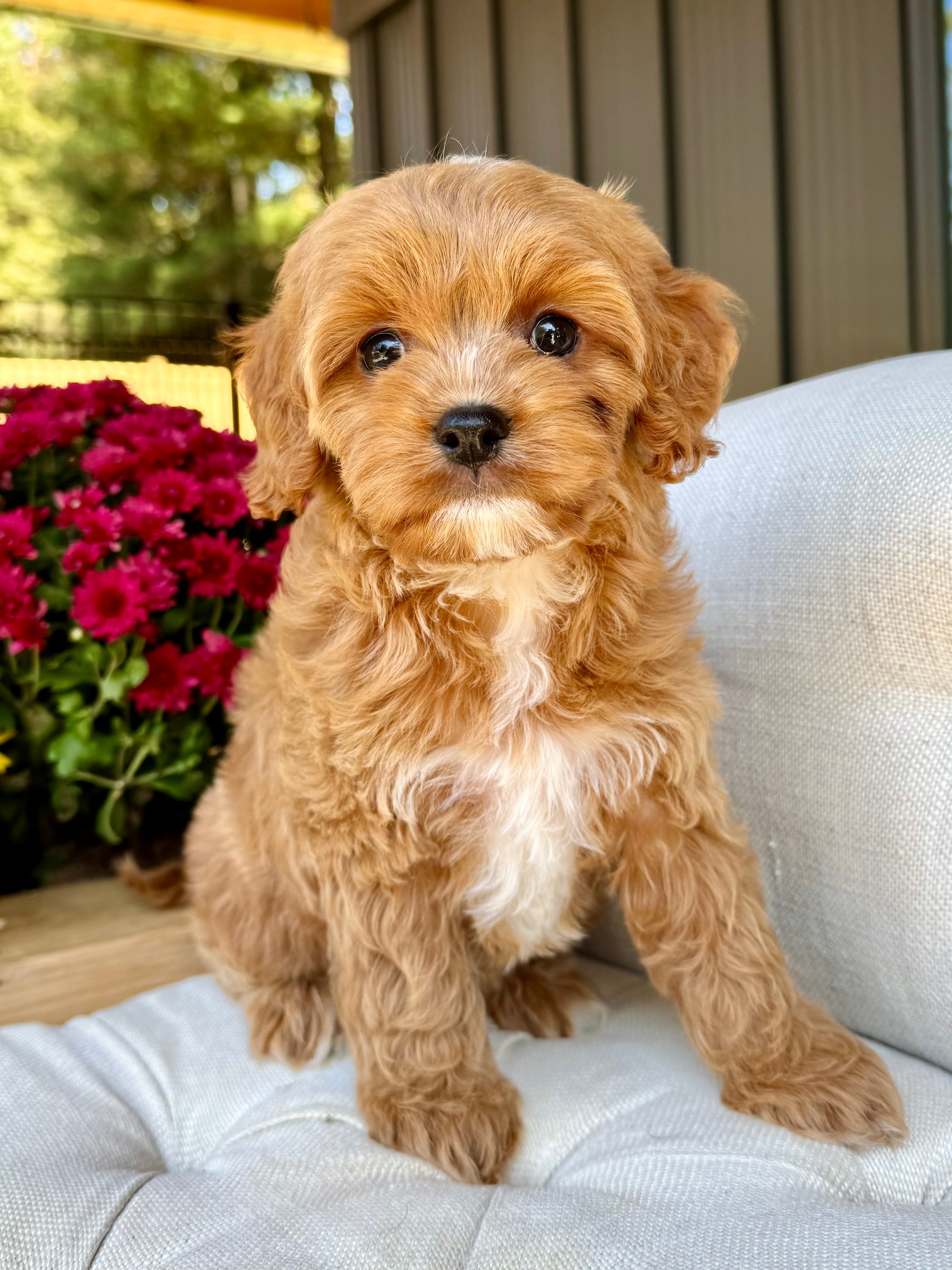 Solia is an 8-week-old F1 Cavapoo with a soft, red abstract wavy coat and a calm, affectionate personality. She’s a happy little girl who enjoys exploring her surroundings but is always content to settle in for cuddles. Born on August 15th and currently weighing 4.1 lbs, Solia is expected to be 12–17 lbs full grown. Her mom, Mira, is a 11 lb red Poodle, and her dad, Rio, is a 16 lb Blenheim Cavalier—both genetically health tested to ensure strong, healthy puppies.