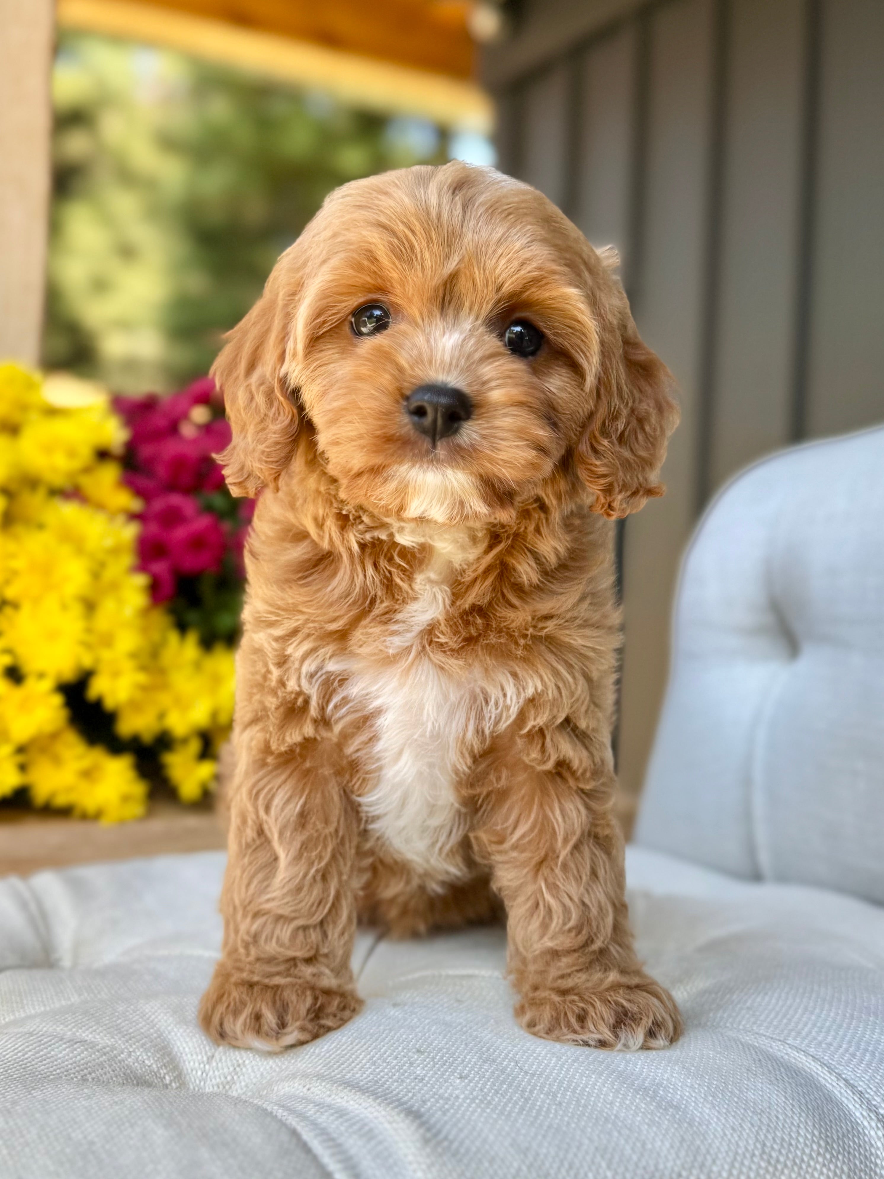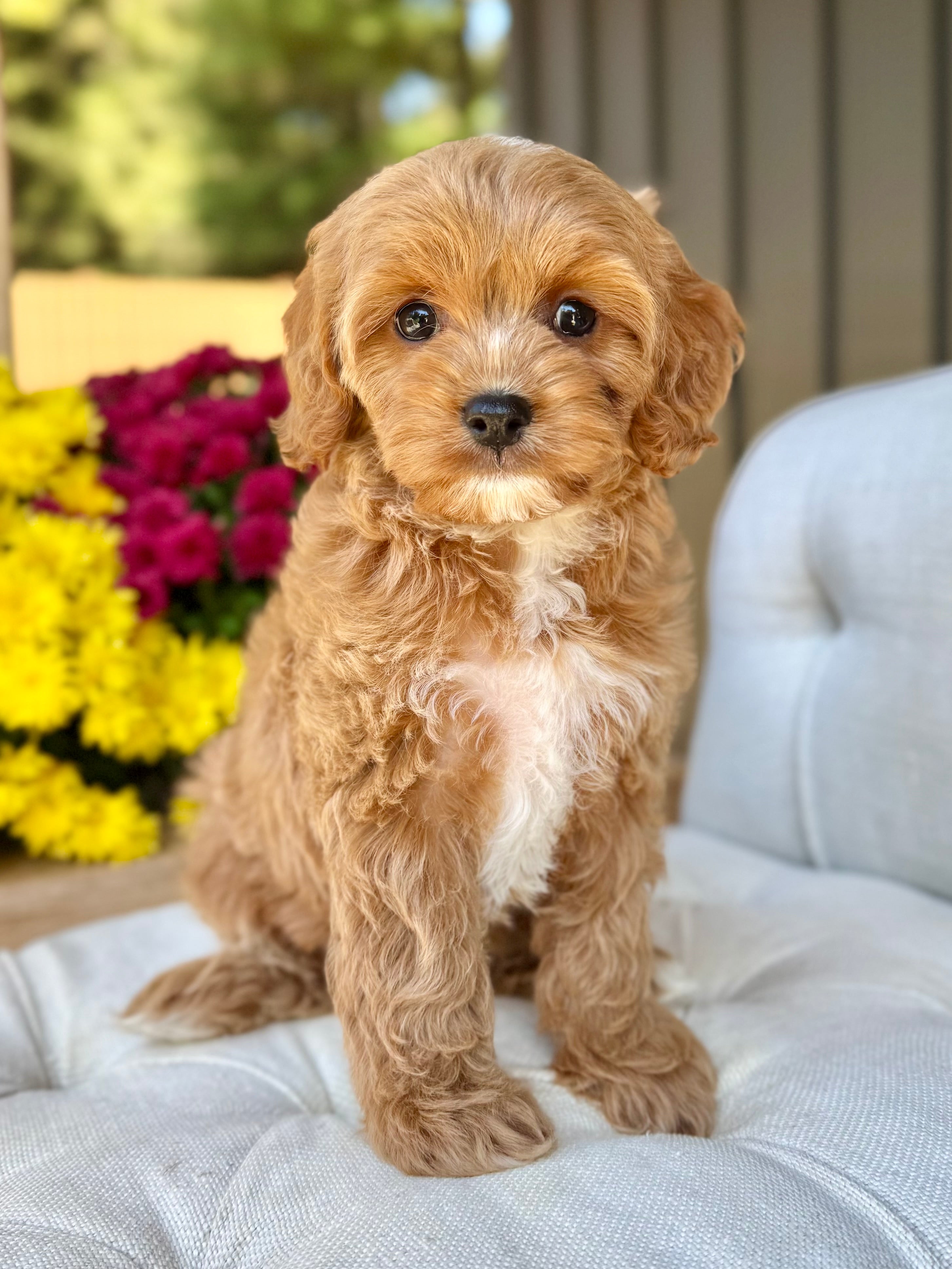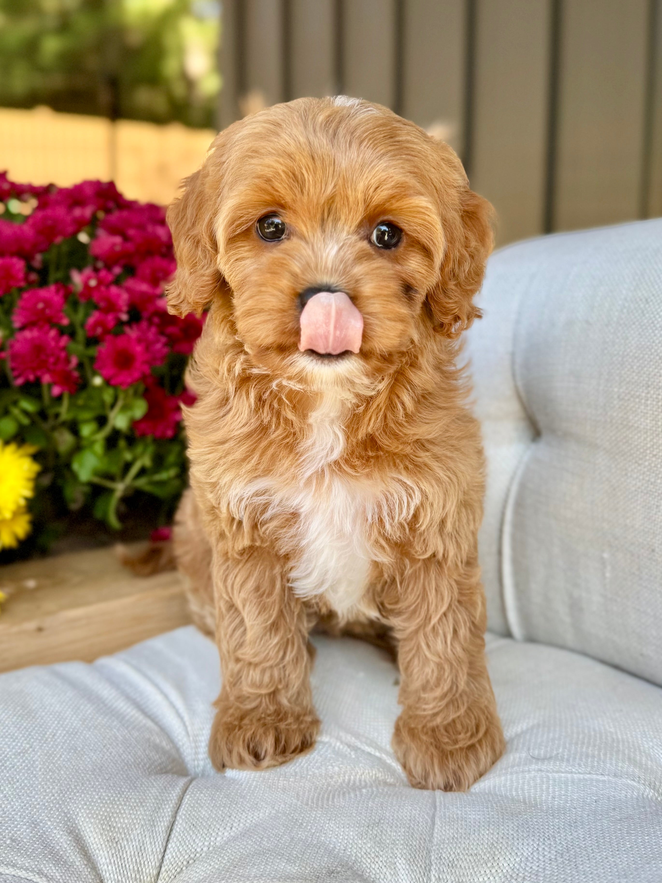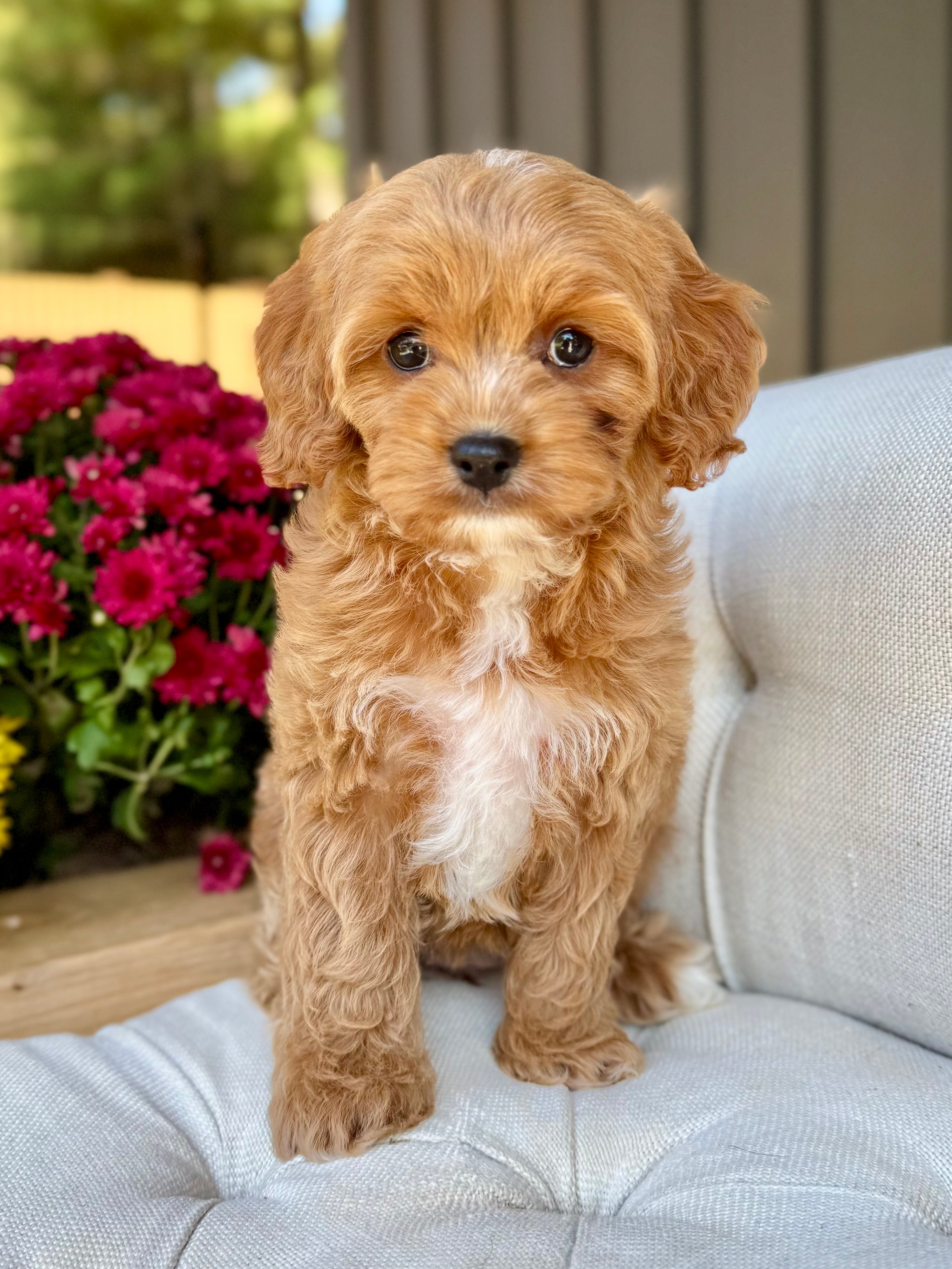 Solia is an 8-week-old F1 Cavapoo with a soft, red abstract wavy coat and a calm, affectionate personality. She’s a happy little girl who enjoys exploring her surroundings but is always content to settle in for cuddles. Born on August 15th and currently weighing 4.1 lbs, Solia is expected to be 12–17 lbs full grown. Her mom, Mira, is a 11 lb red Poodle, and her dad, Rio, is a 16 lb Blenheim Cavalier—both genetically health tested to ensure strong, healthy puppies.
