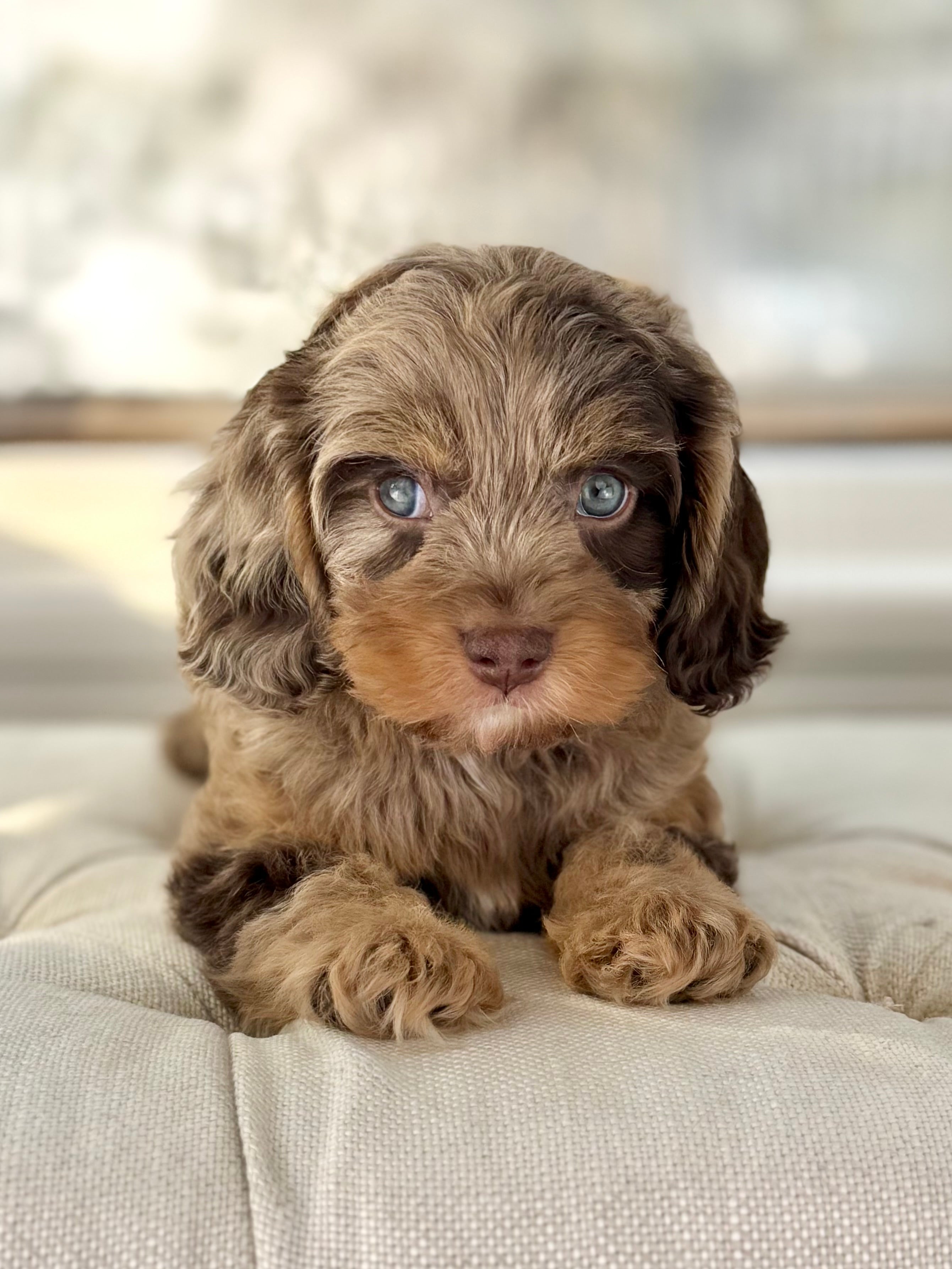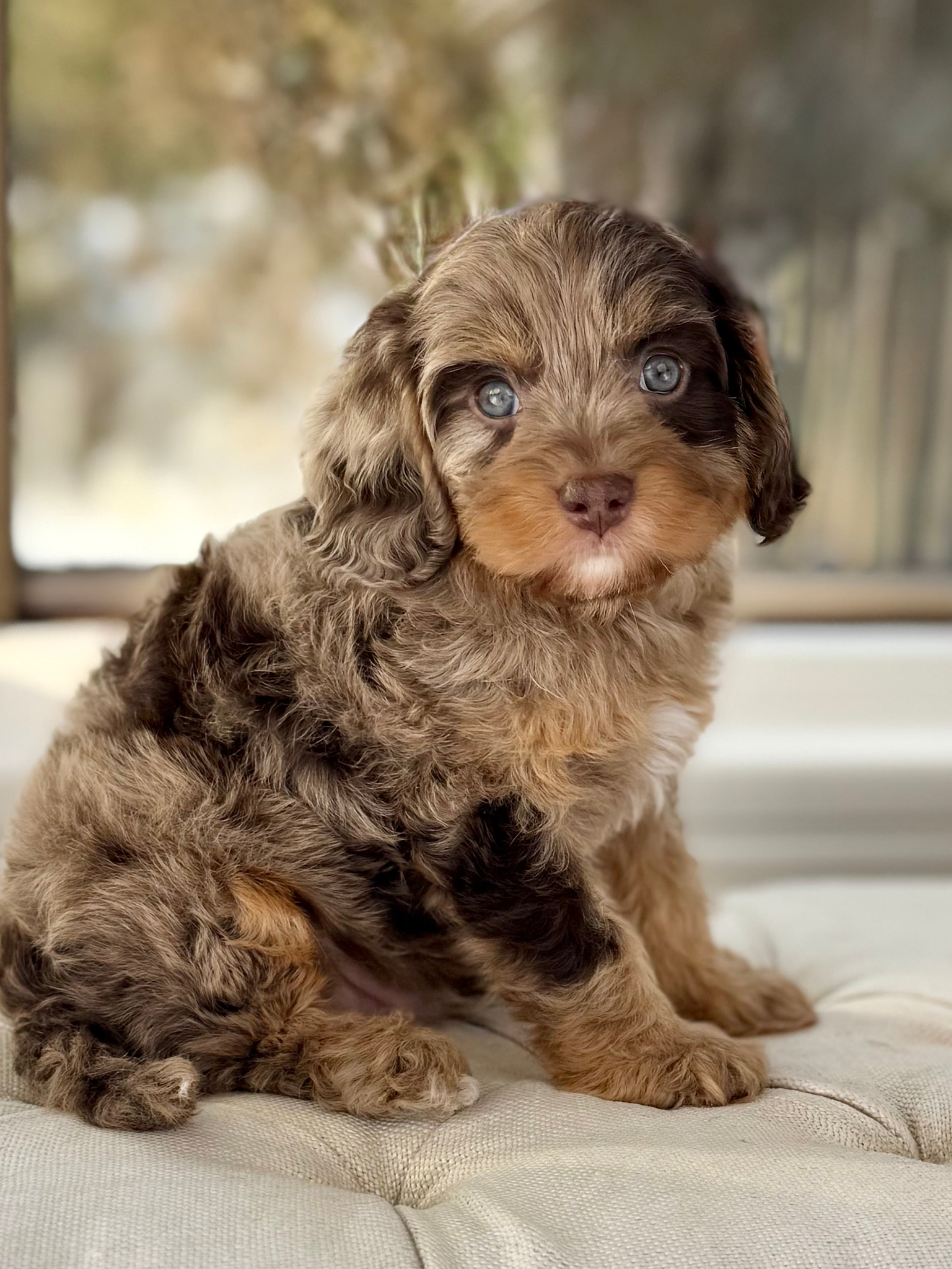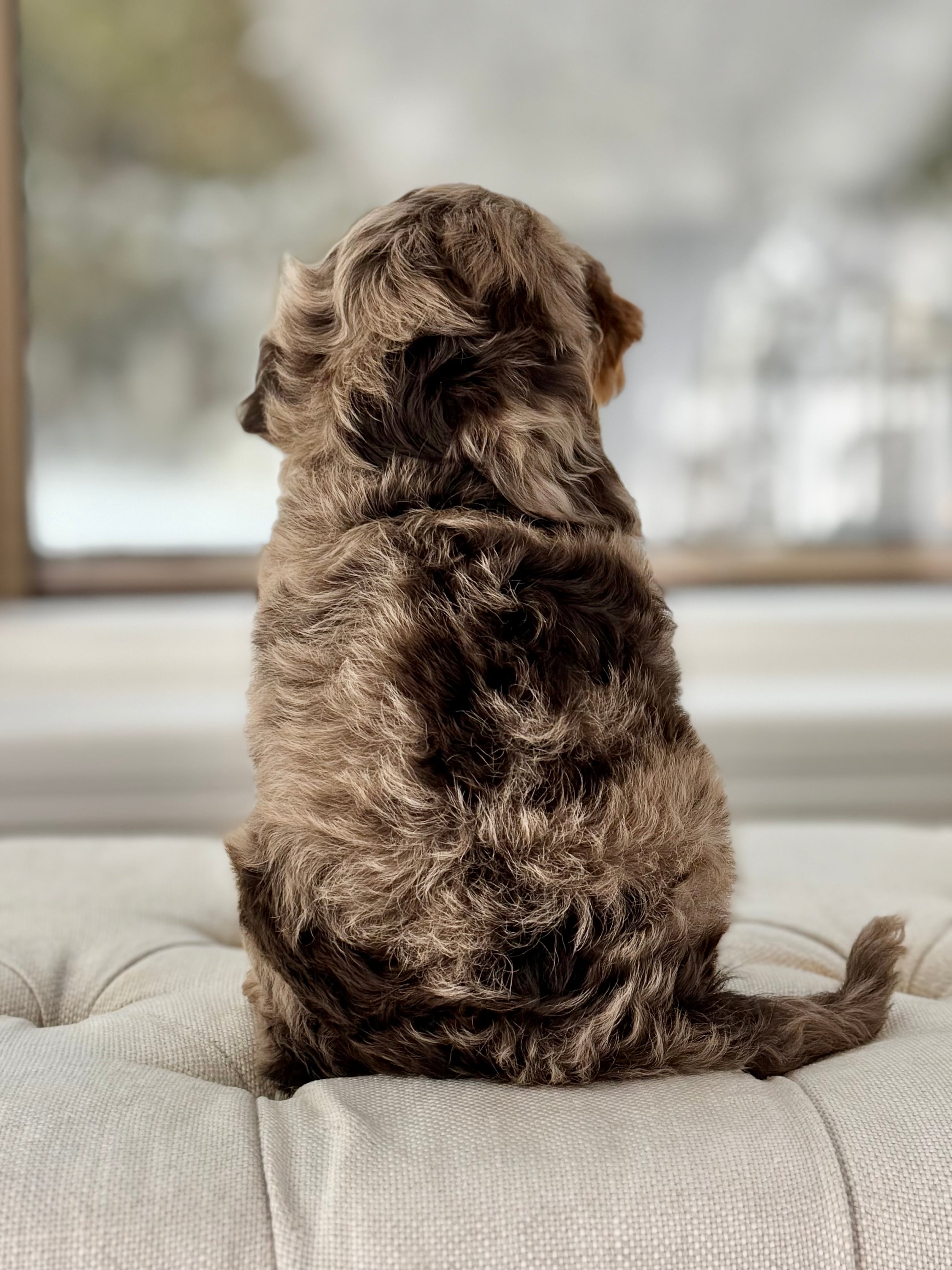 Springsteen is currently 8 weeks old and weighs 3.7 lbs. He has a stunning chocolate merle/tri/phantom coat with a soft, wavy, non-shedding texture and a confident, playful personality. Springsteen is people-oriented, curious, and loves interactive play.
