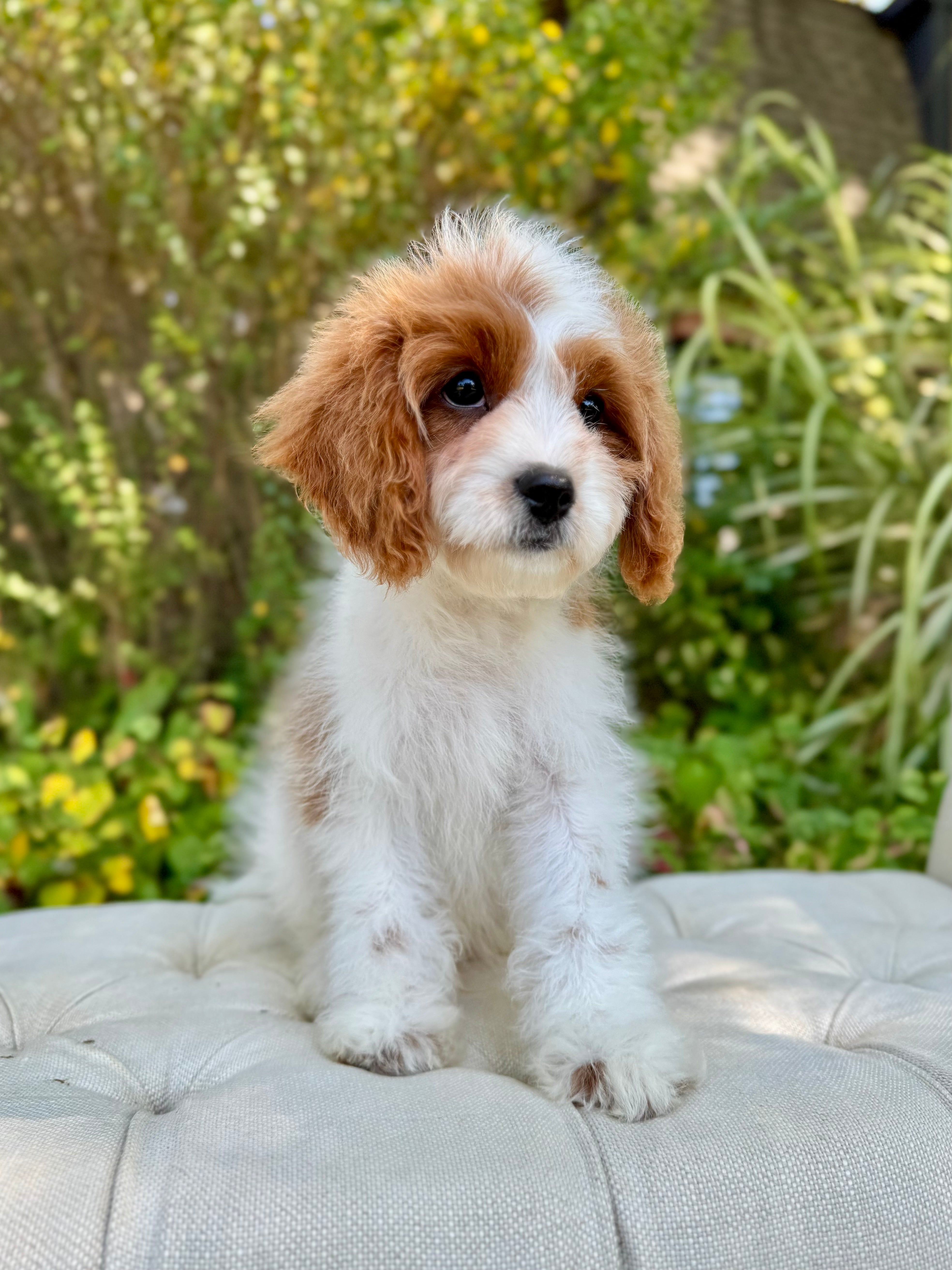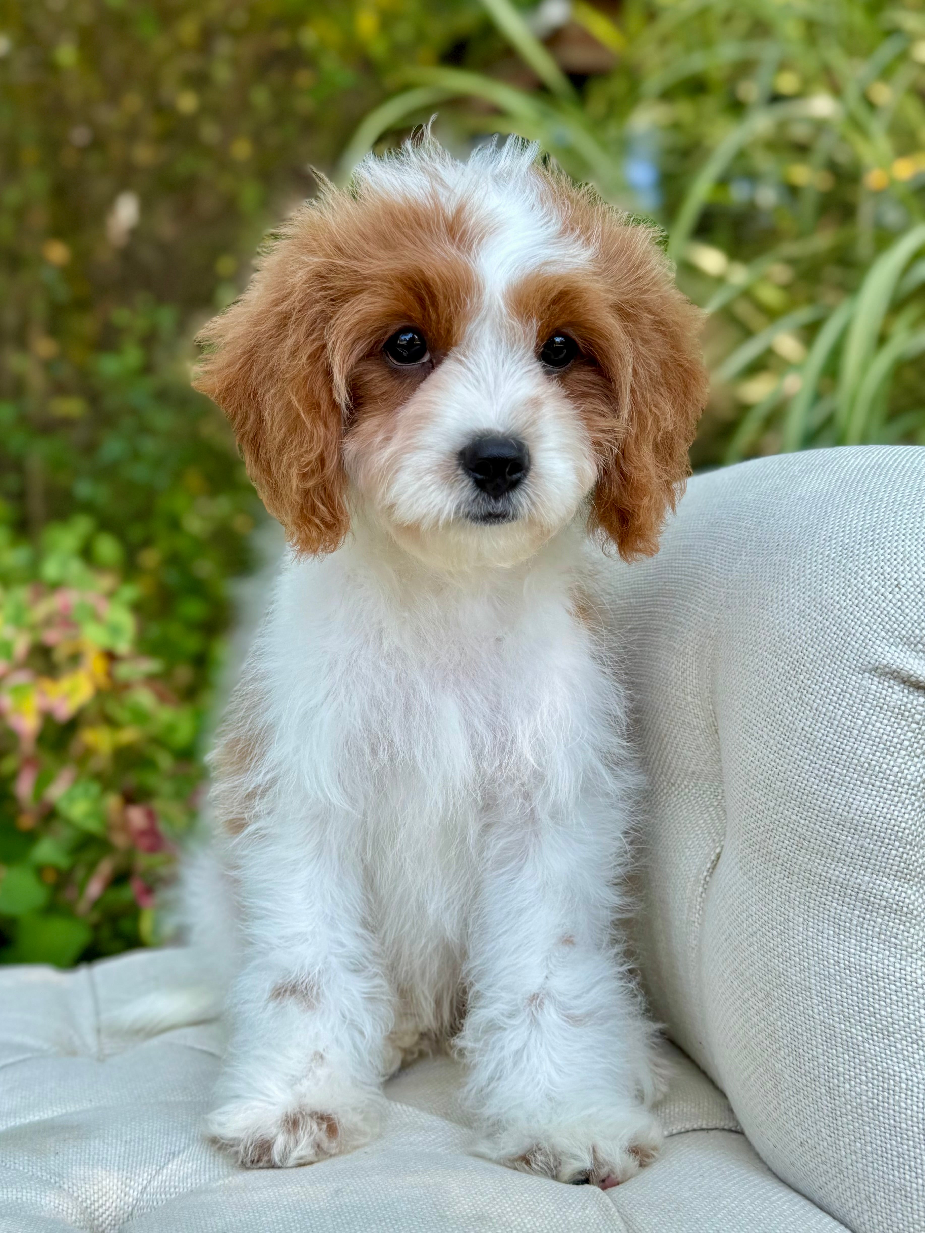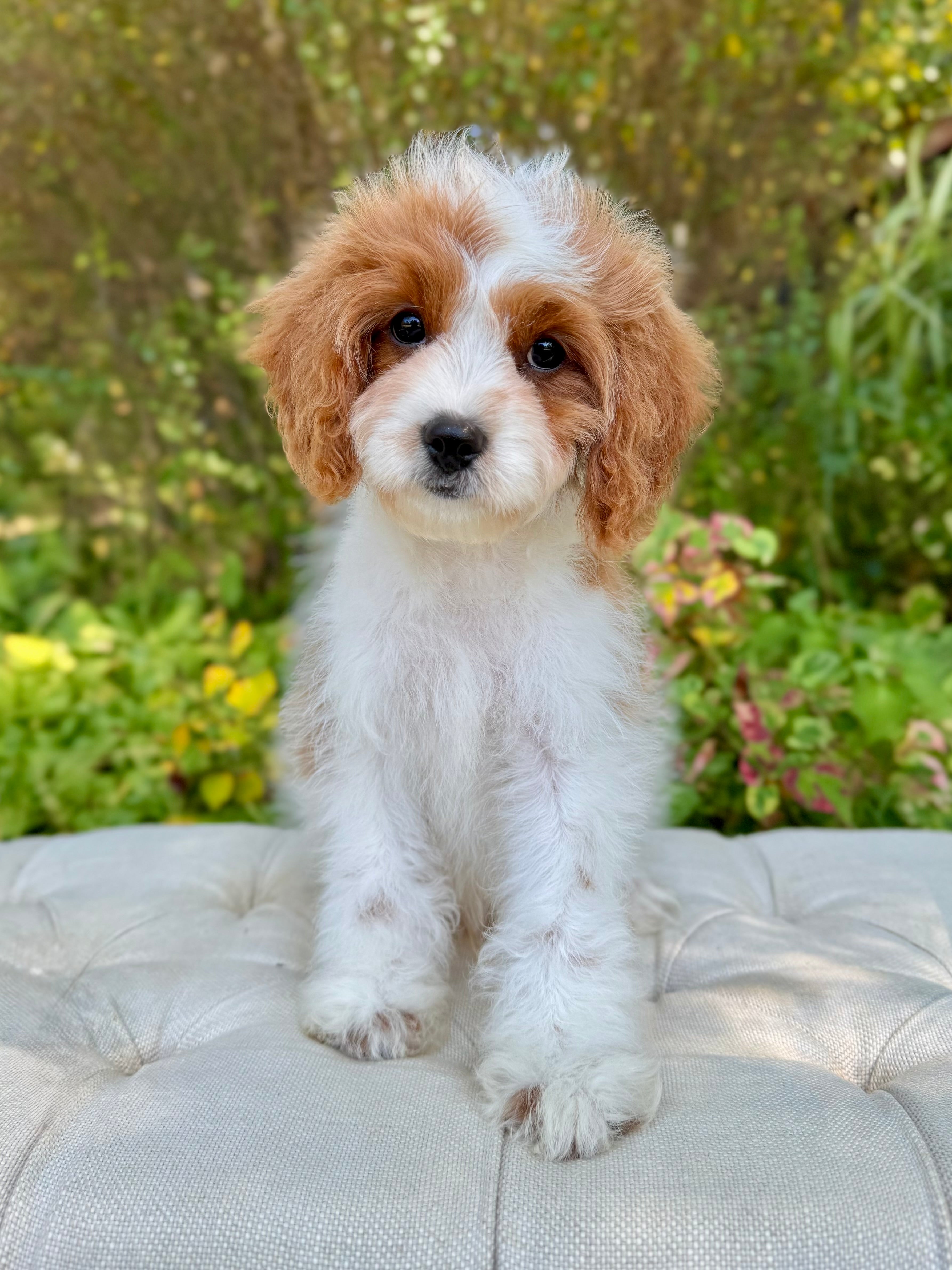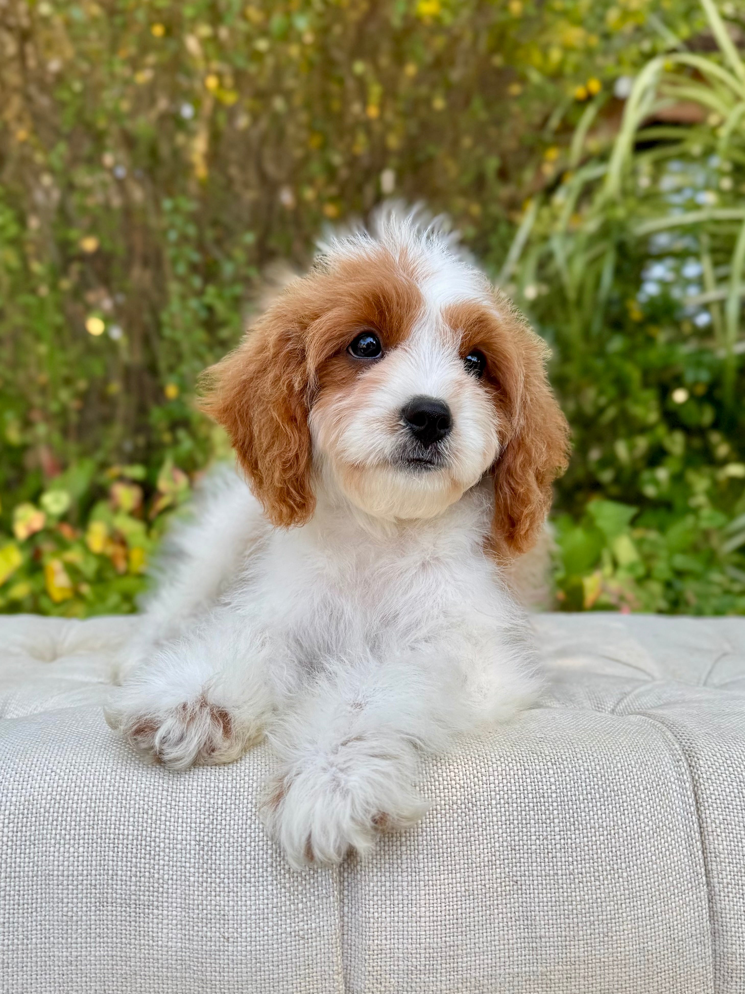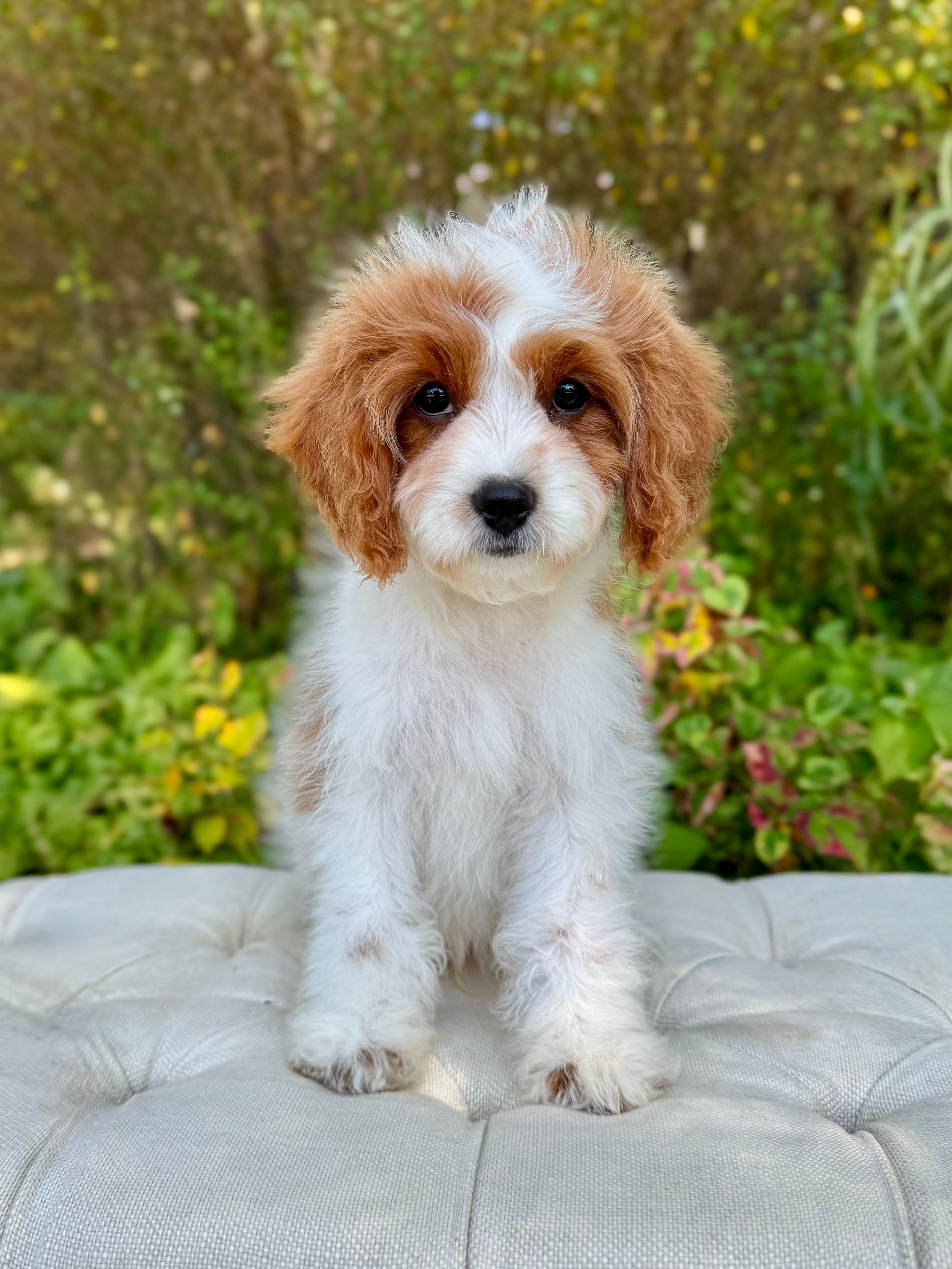 Tobin is an 13-week-old F1 Cavapoo with a soft wavy Blenheim coat and a calm, affectionate personality. He’s a happy little boy who enjoys exploring his surroundings but is always content to settle in for cuddles. Born on June 15th and currently weighing 6.2 lbs, Tobin is expected to be 12–16 lbs full grown. His mom, Ruth, is a 10 lb red Poodle, and his dad, Snickers, is a 16 lb Blenheim Cavalier—both genetically health tested to ensure strong, healthy puppies.
